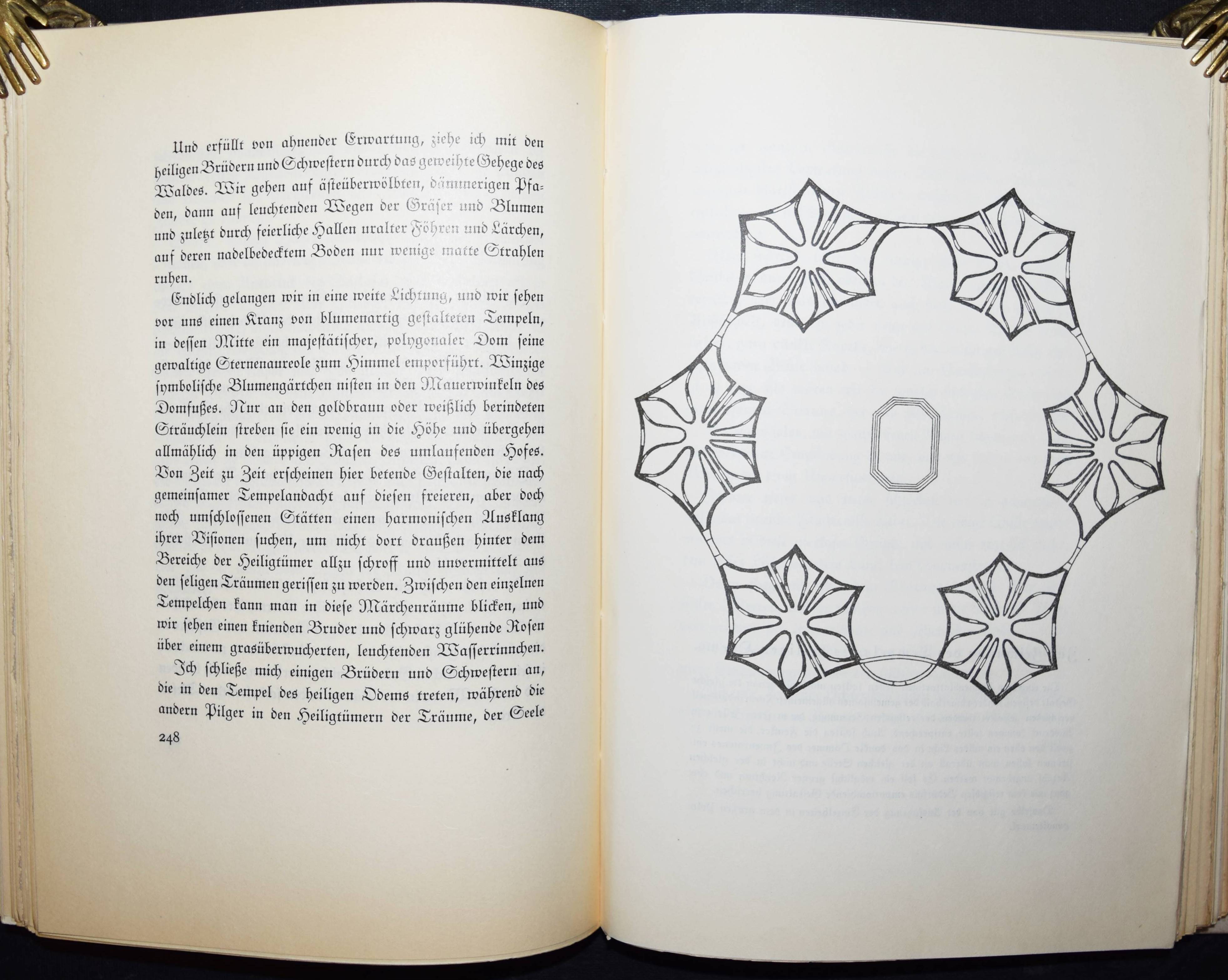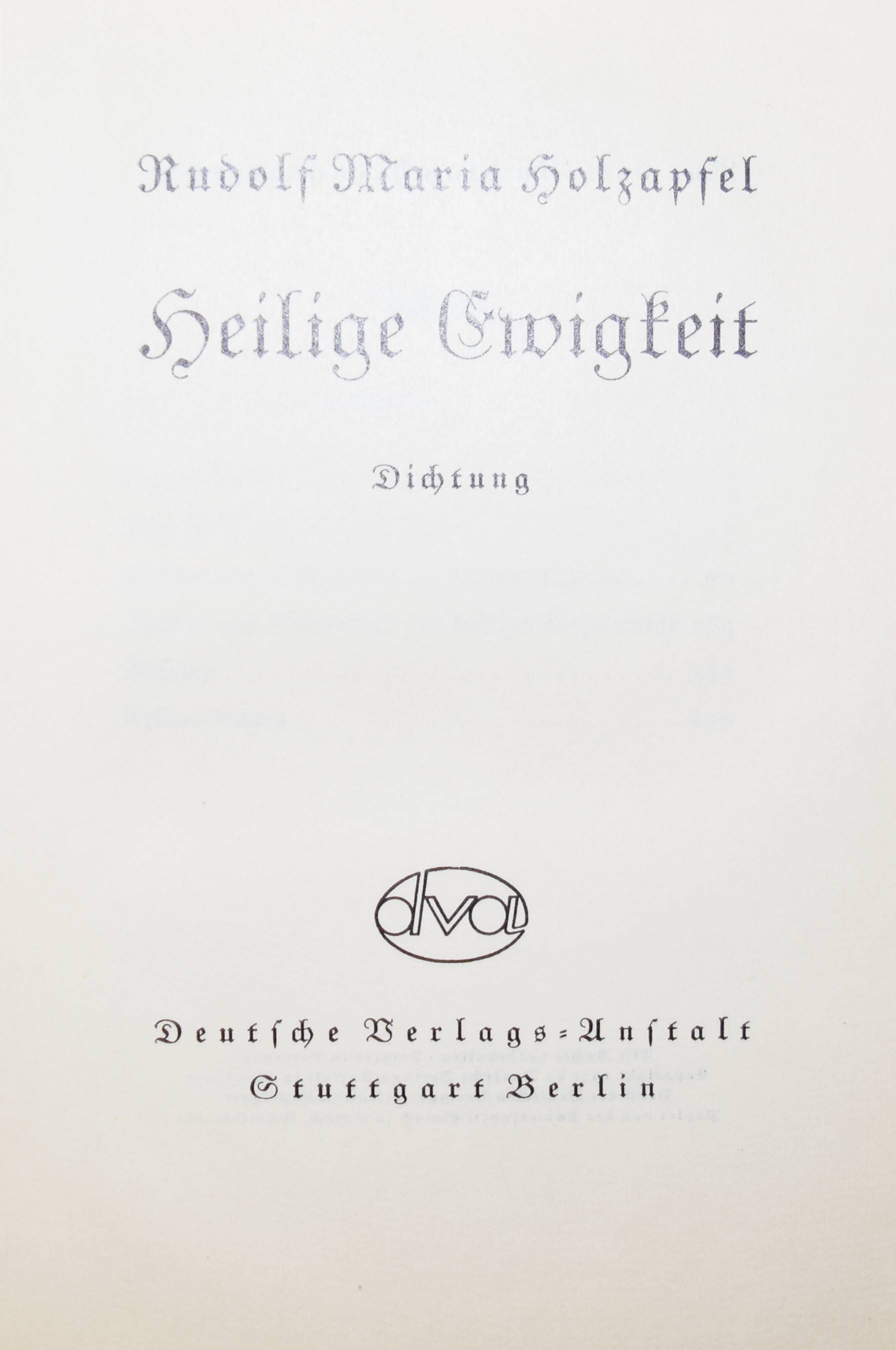 Holzapfel, Rudolf Maria. Heilige Ewigkeit. Dichtung. (Aus dem Nachlass herausgegeben). Stuttgart, Berlin, Deutsche Verlag Anstalt 1932. Gr.-8°. 59 cm x 84 cm. OPrgt. mit goldgepr. Rücken- und Deckeltitel. Sehr seltene Pergamentausgabe. – Erste und einzige Ausgabe. – Sehr gutes Exemplar.