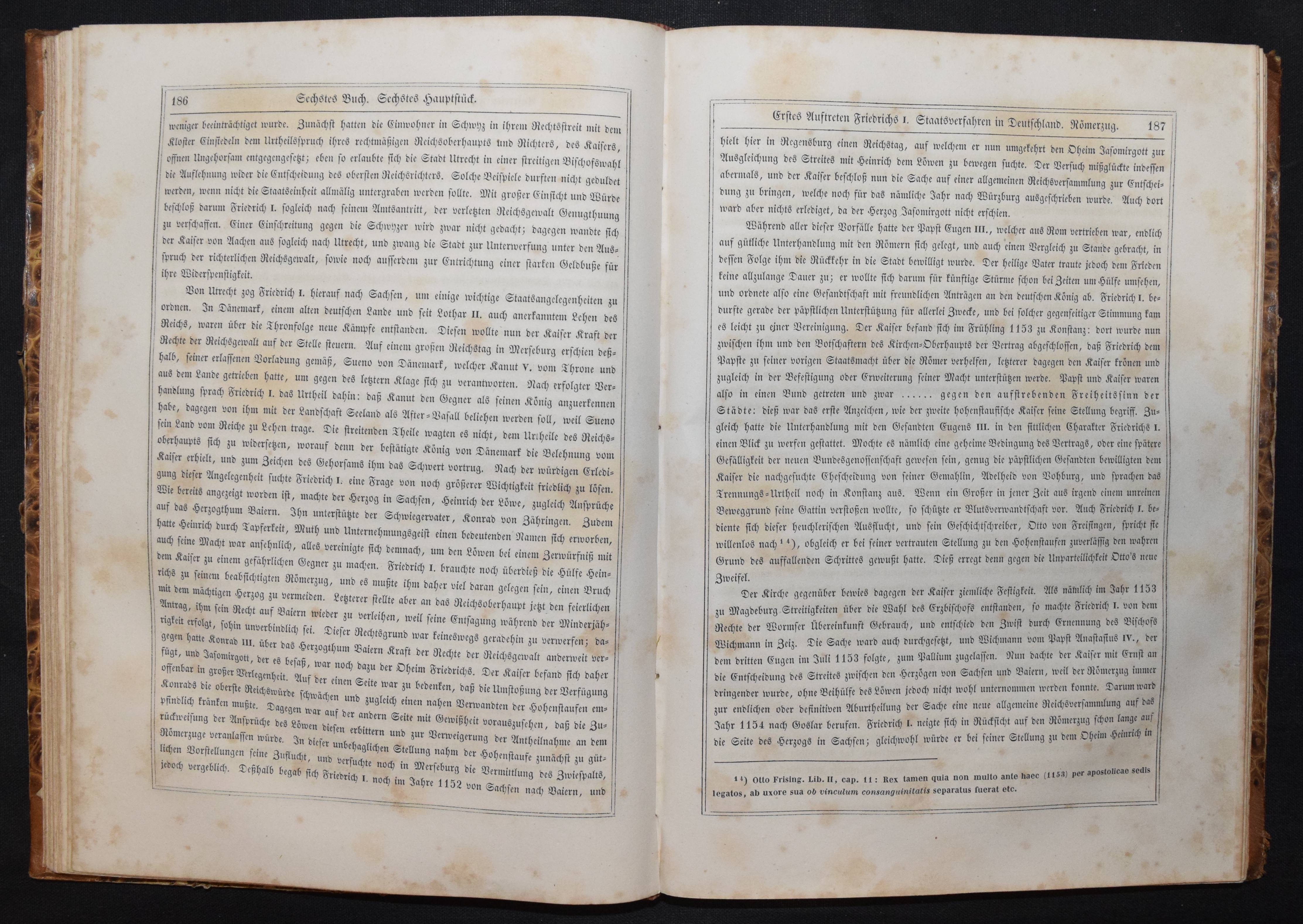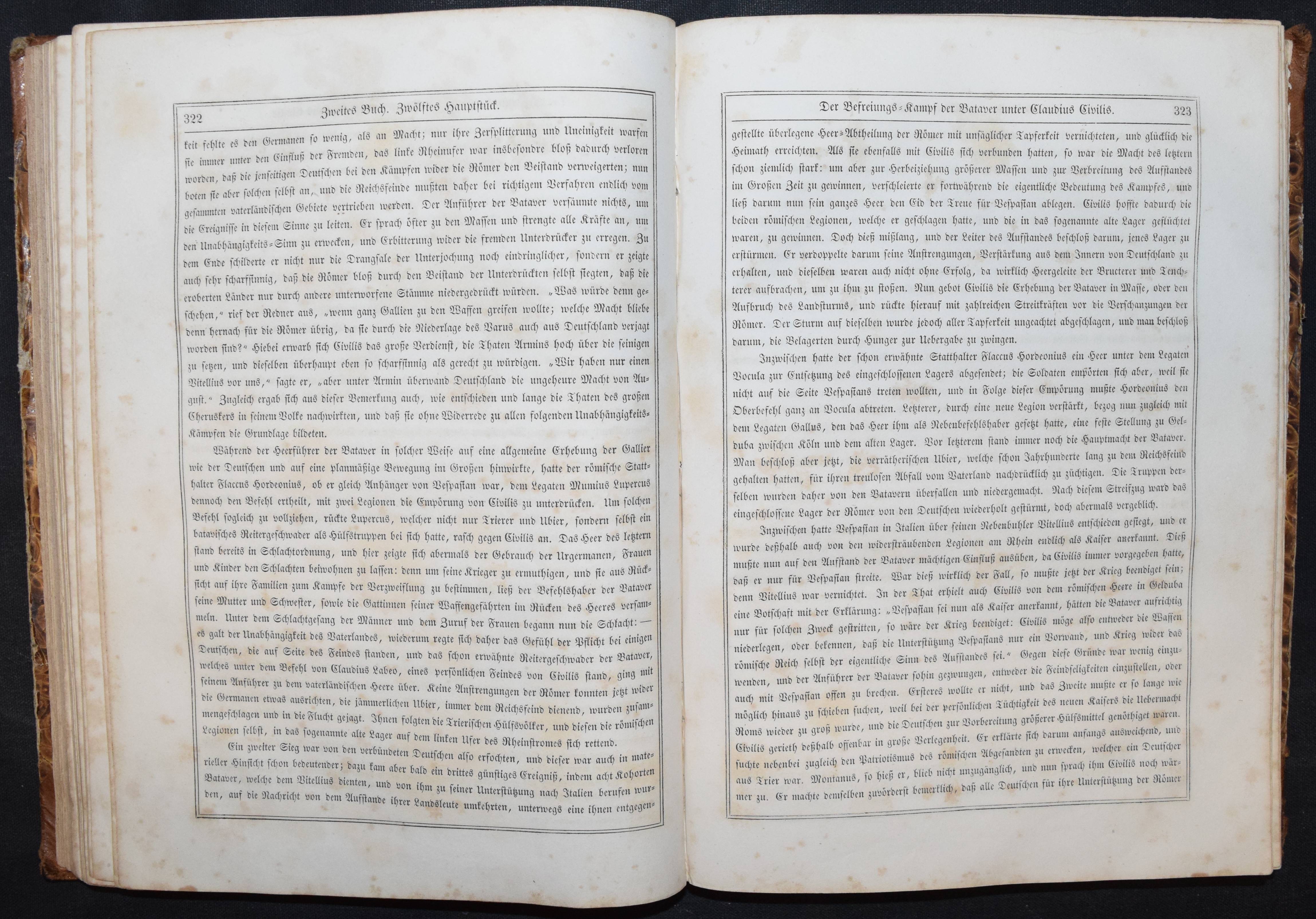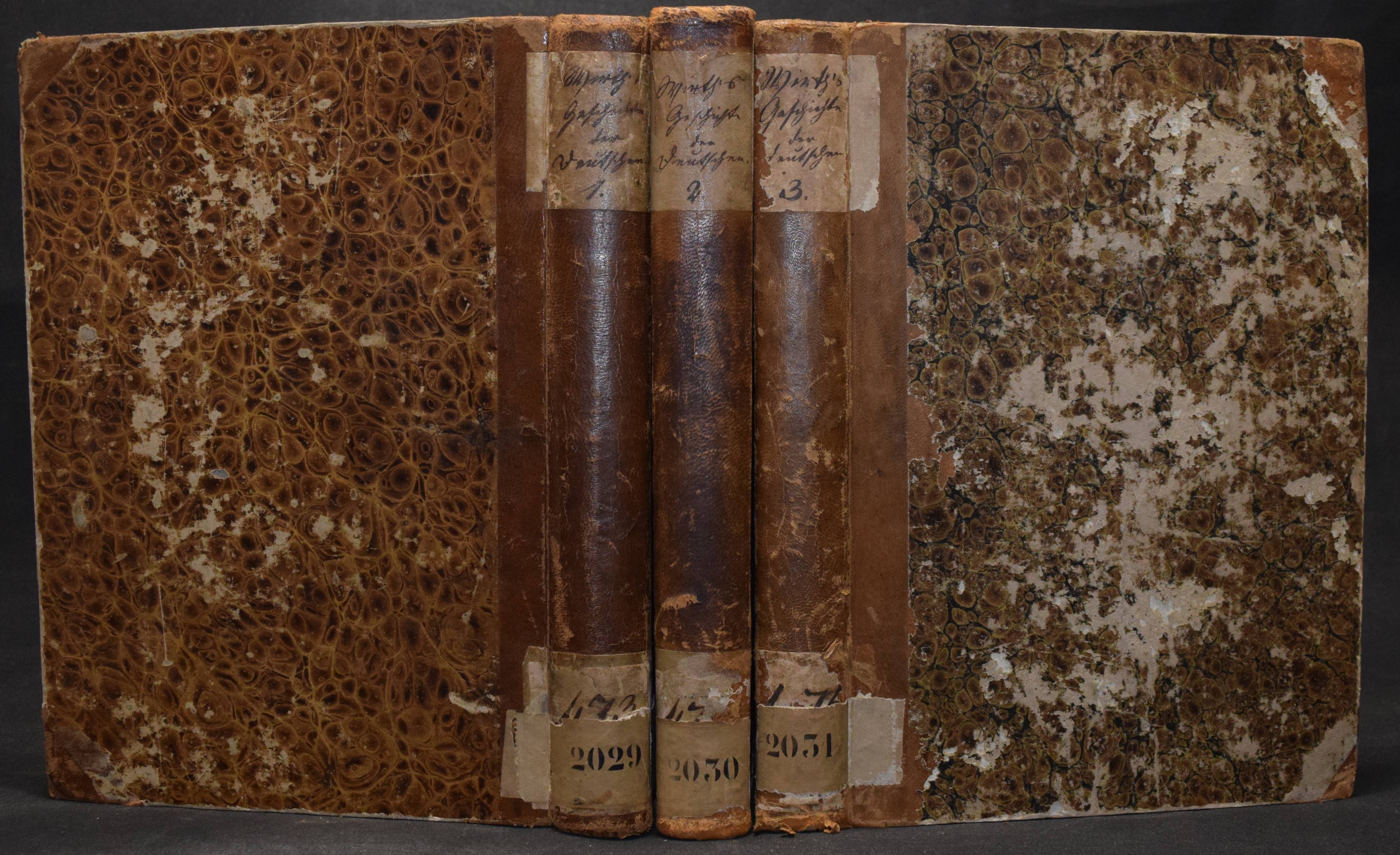Wirth, Johann Georg August. Die Geschichte der Deutschen. 3 Bände. Emmishofen bei Konstanz am Bodensee, im Verlage des Verfassers 1842-1844. Gr.-8°. 522 S.; 512 S.; 440 S. Hldr. der Zeit. mit handschr Rückensch. Einbände berieben, Ecken u. Kanten etwas best., Rücken u. V. mit Bibliothekssignaturen, teils stärker braunfl.