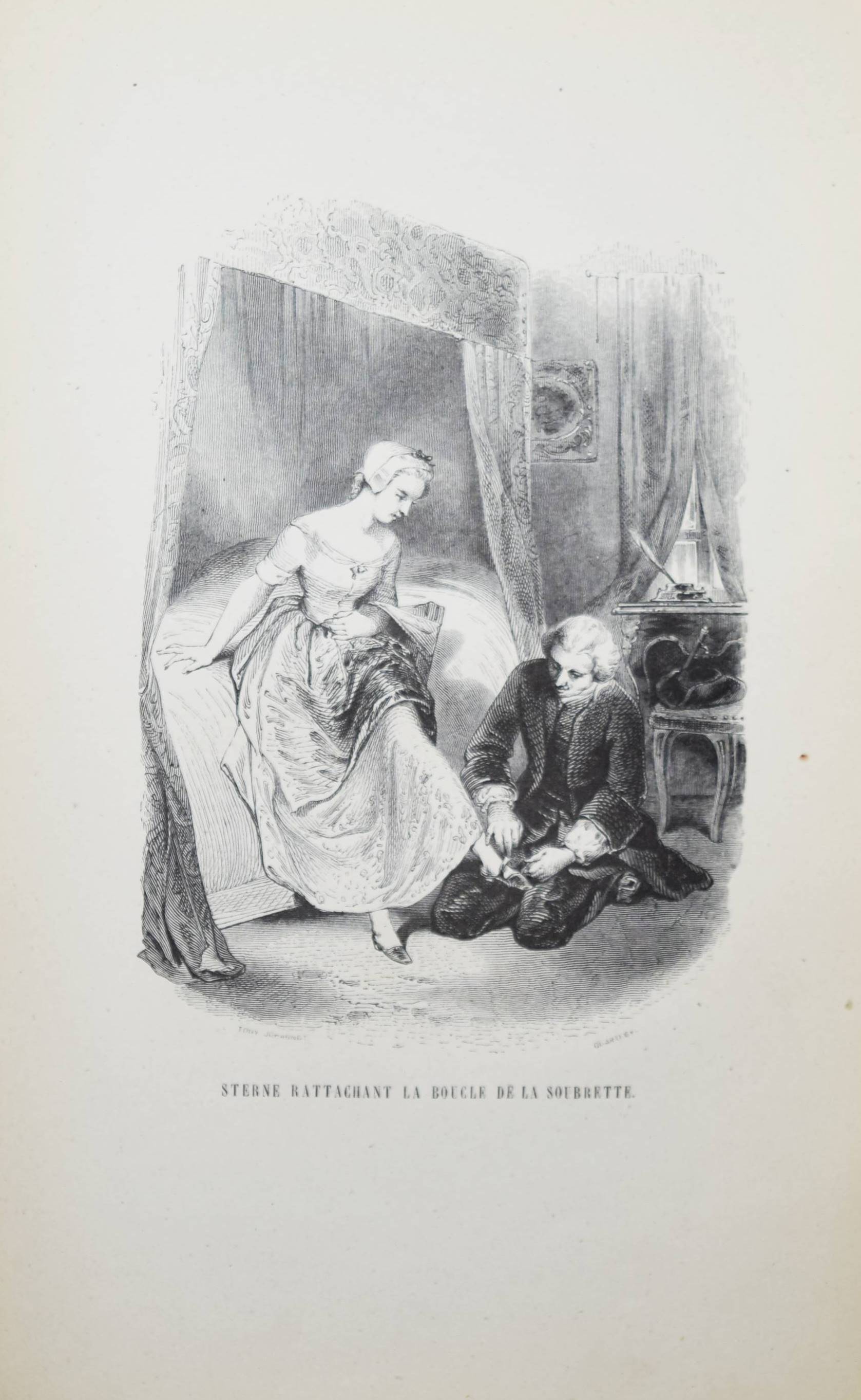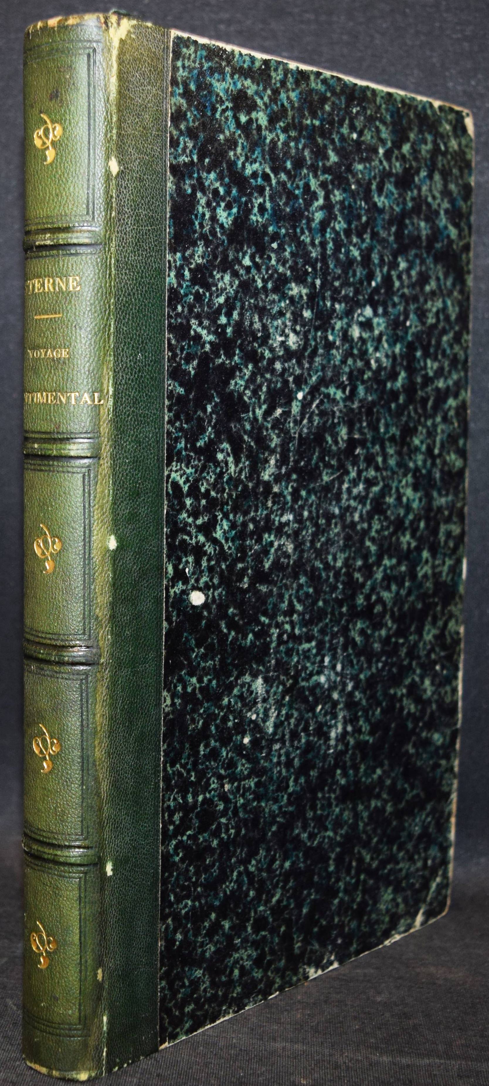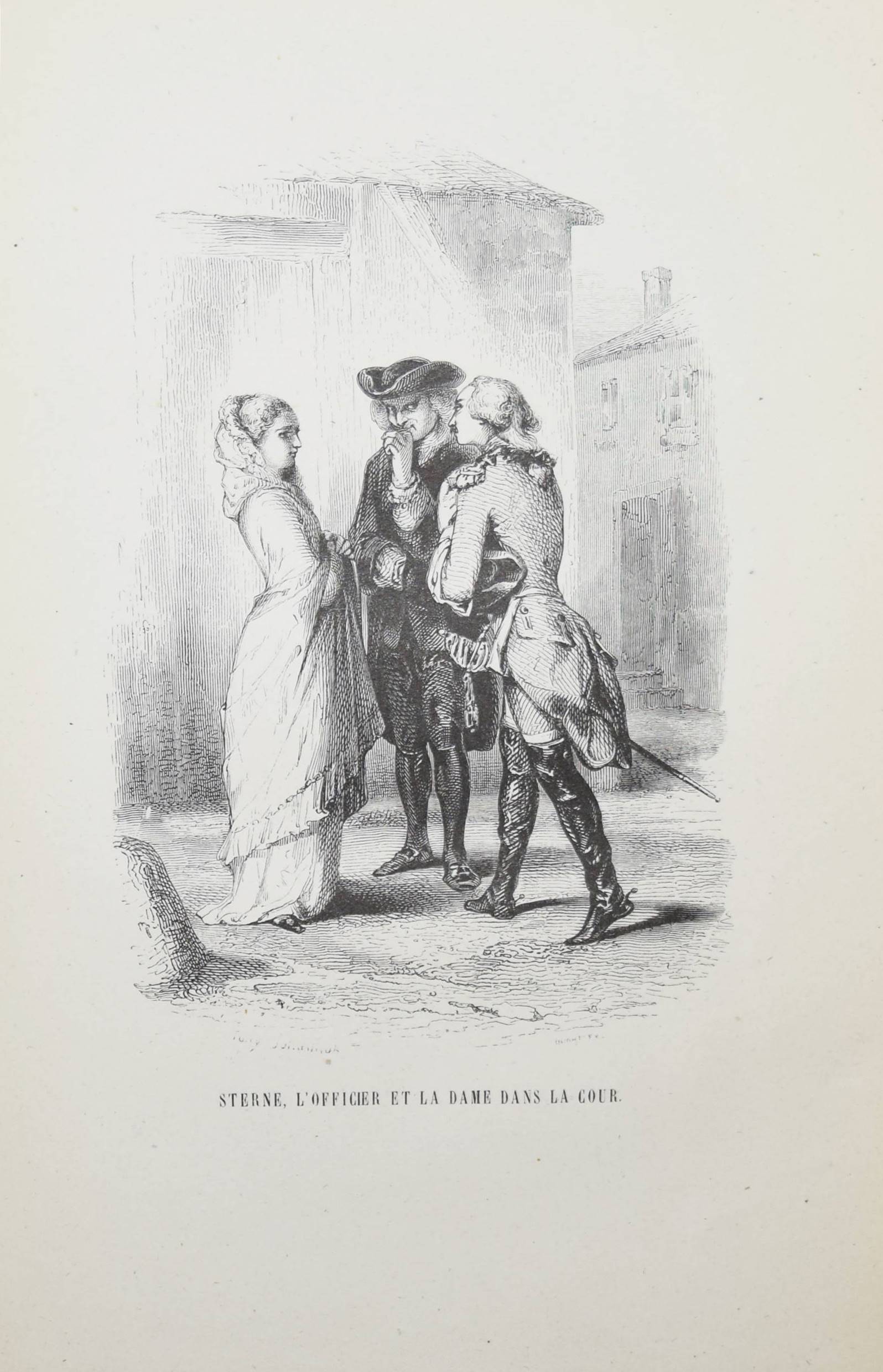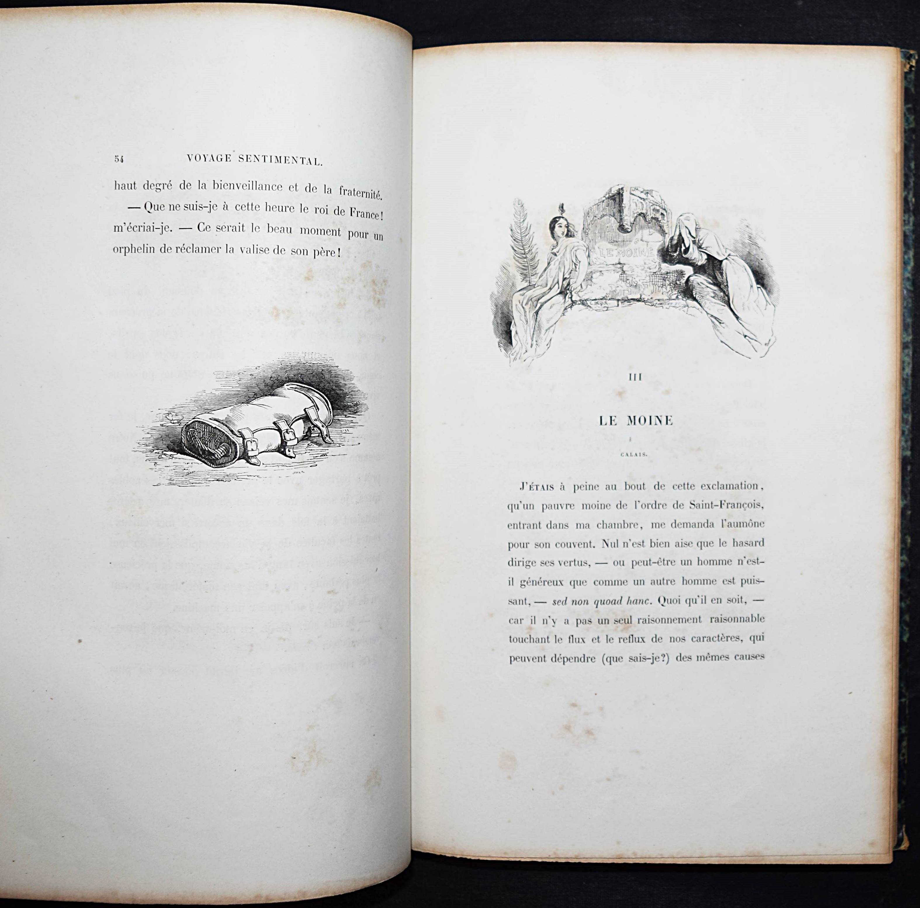Sterne, L(aurence). Voyage sentimental. Traduction nouvelle précédé d’un essai sur la vie et les ouvrages de Sterne, par M. J(ules-Gabriel) Janin. Édition illustrée par Tony Johannot et (Charles Émile) Jacque. Paris, Ernest Bourdin o. J. (1841). Gr.-8°. 360 S.mit Frontisp. in Holzstich, Titelvignette, 11 Holzstich-Tafeln u. zahlr. Holzstich-Illustrationen im Text. Hldr. d. Zt. mit goldgepr. Rückentitel. Einband etwas berieben, stockfl., sonst gutes Exemplar.