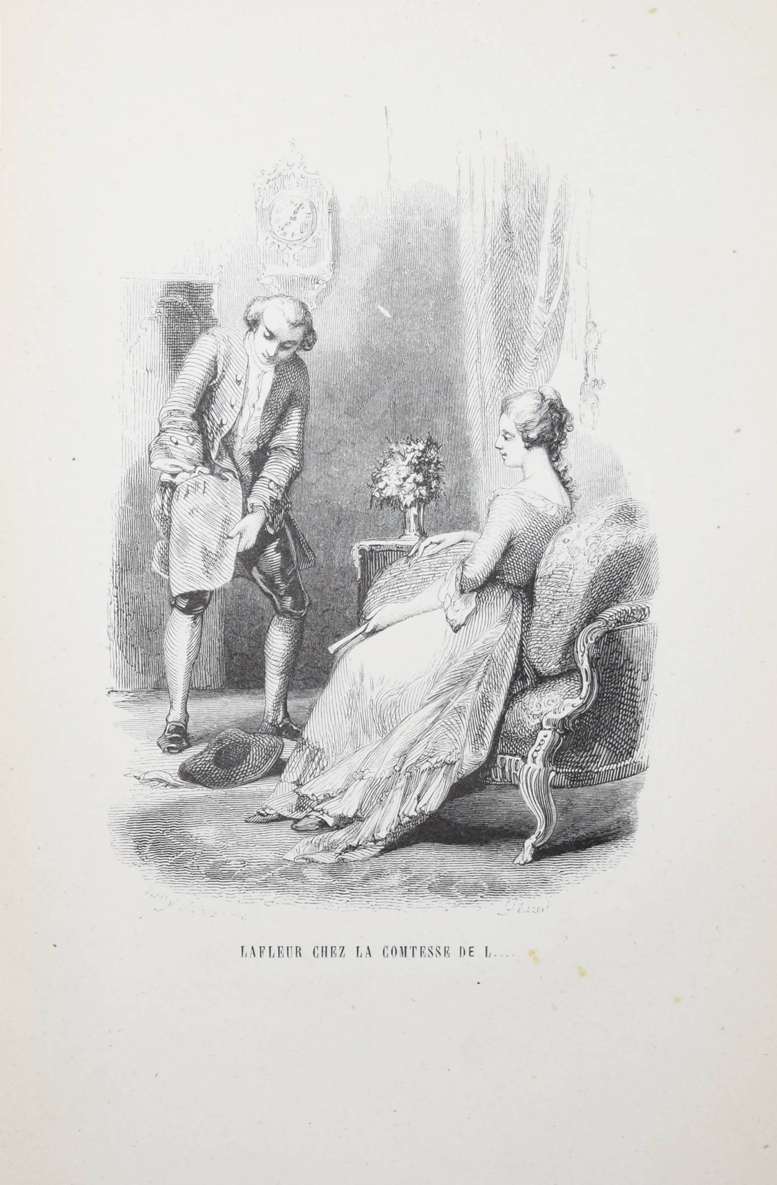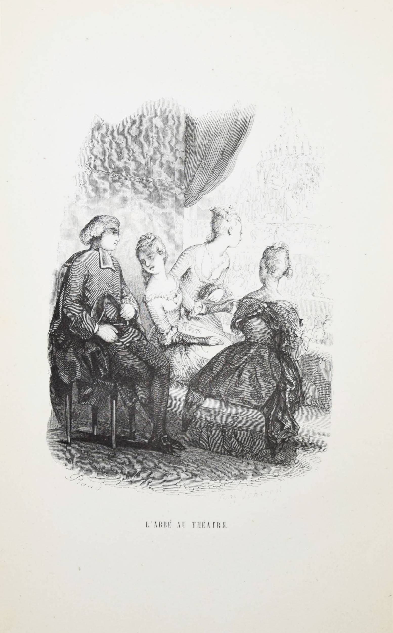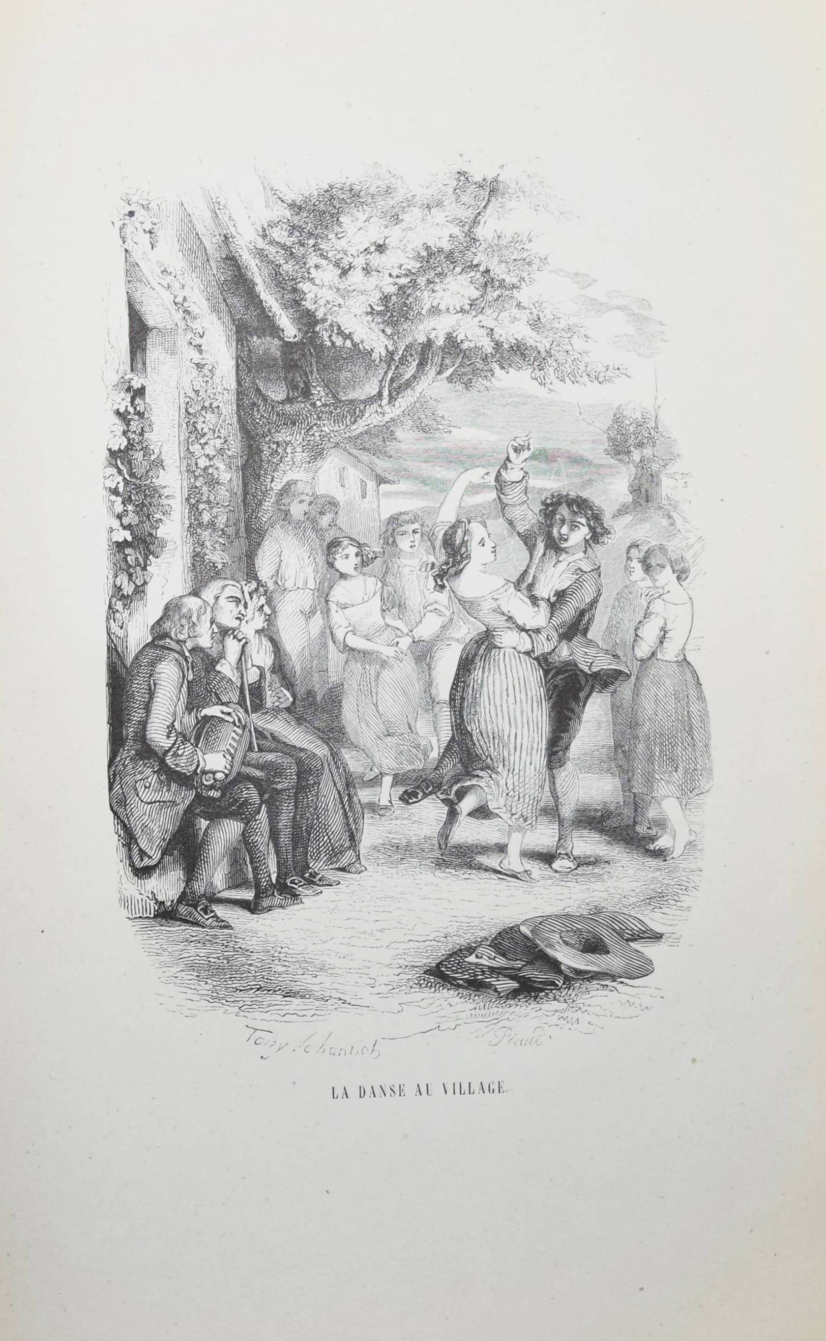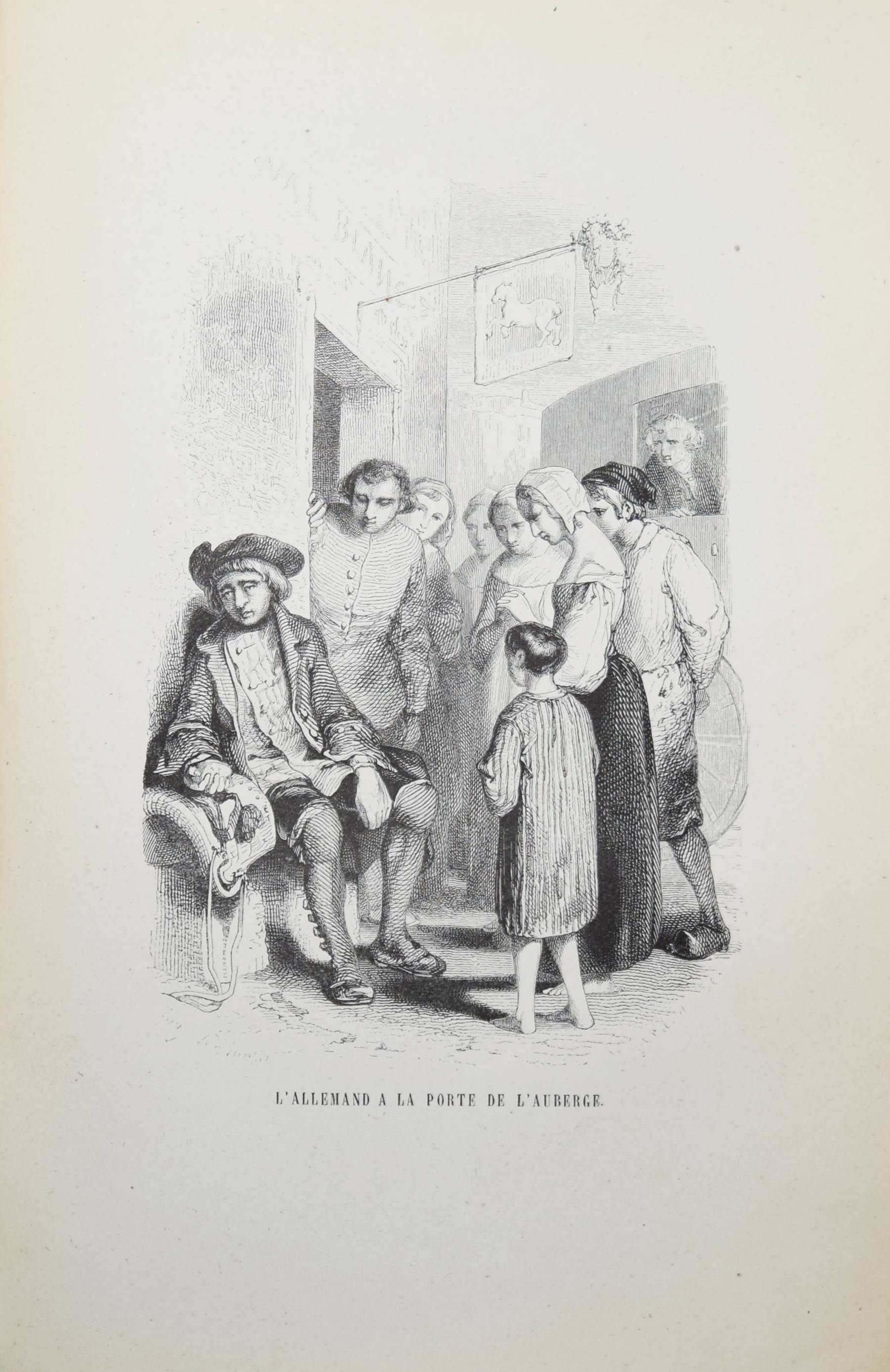 Sterne, L(aurence). Voyage sentimental. Traduction nouvelle précédé d’un essai sur la vie et les ouvrages de Sterne, par M. J(ules-Gabriel) Janin. Édition illustrée par Tony Johannot et (Charles Émile) Jacque. Paris, Ernest Bourdin o. J. (1841). Gr.-8°. 360 S.mit Frontisp. in Holzstich, Titelvignette, 11 Holzstich-Tafeln u. zahlr. Holzstich-Illustrationen im Text. Hldr. d. Zt. mit goldgepr. Rückentitel. Einband etwas berieben, stockfl., sonst gutes Exemplar.