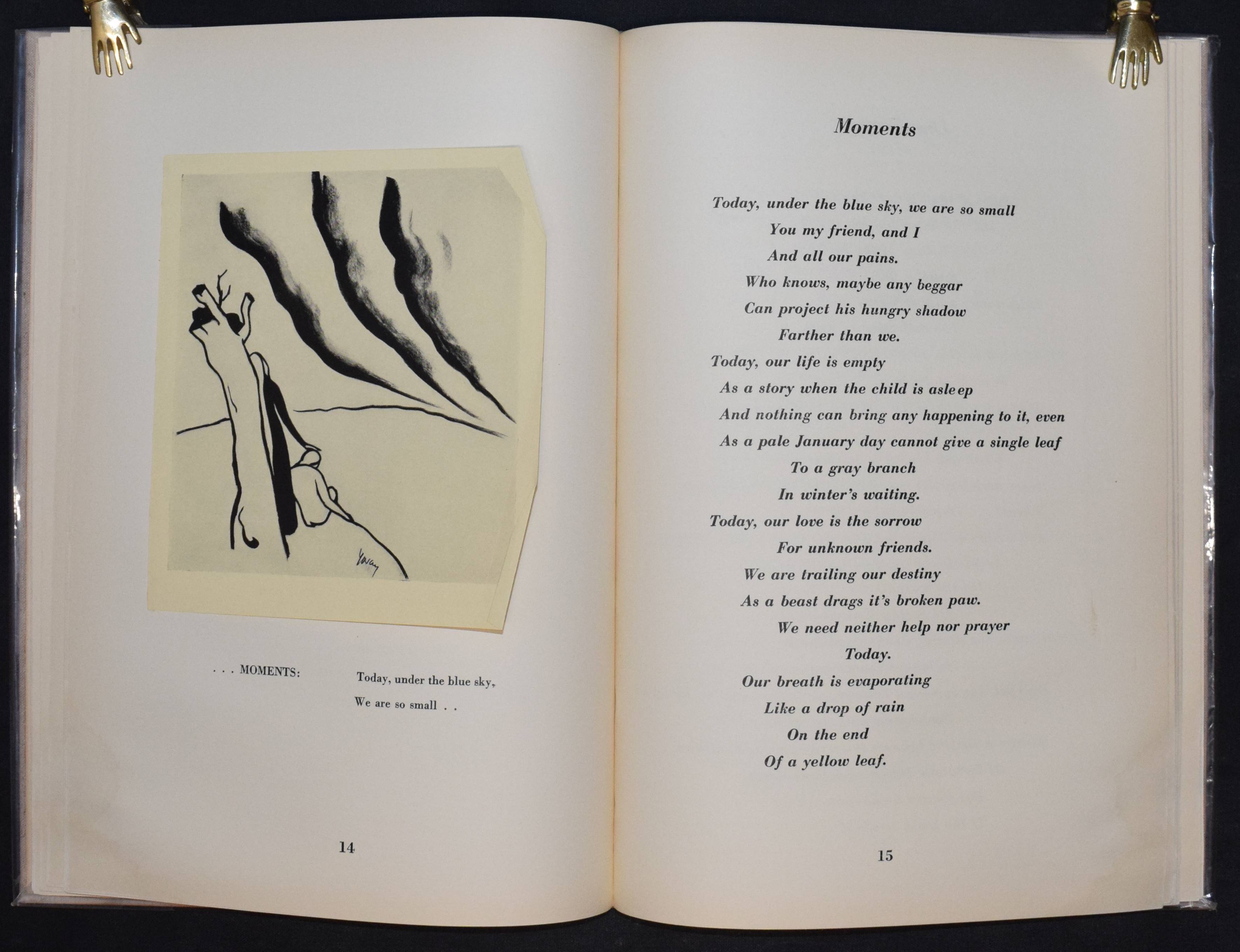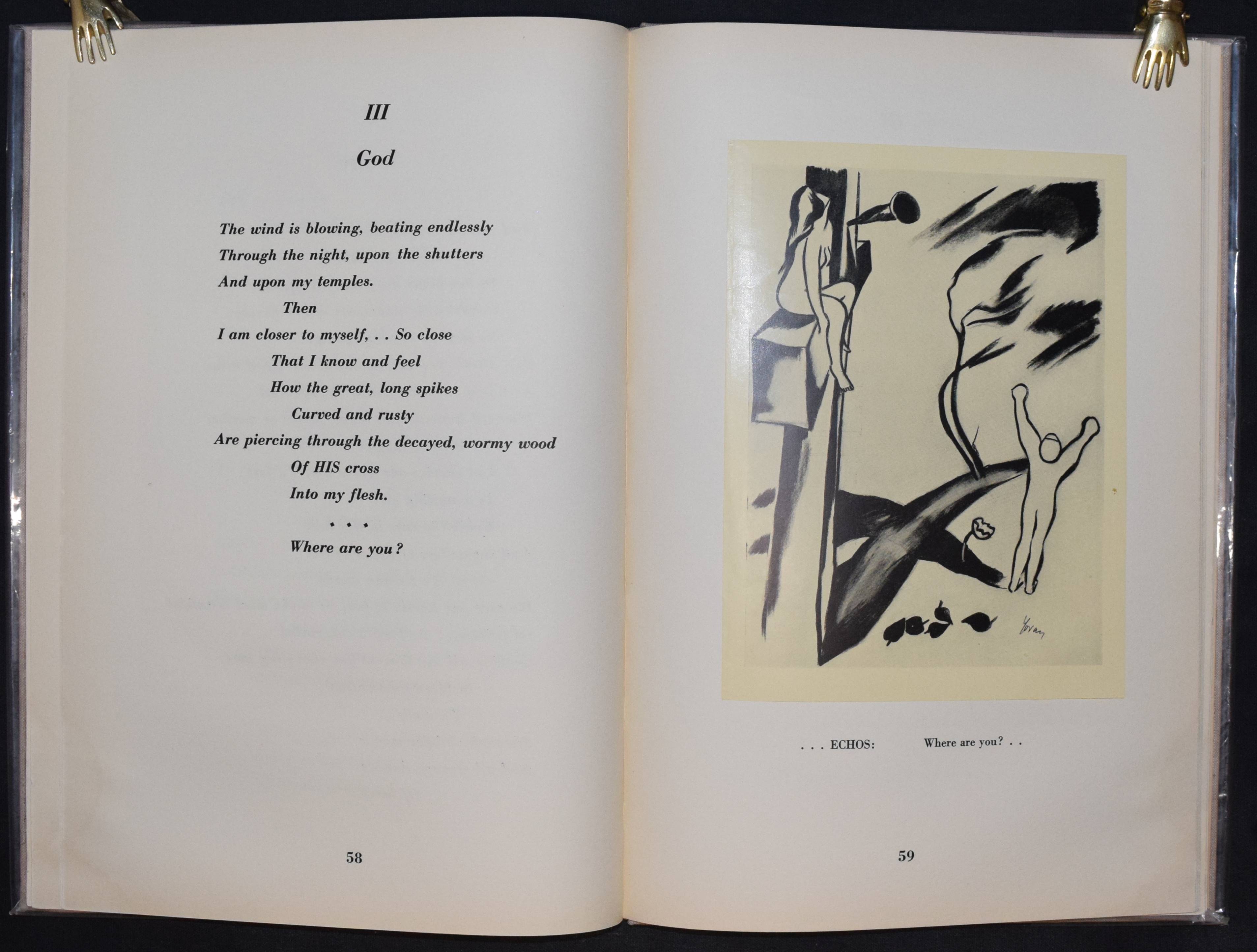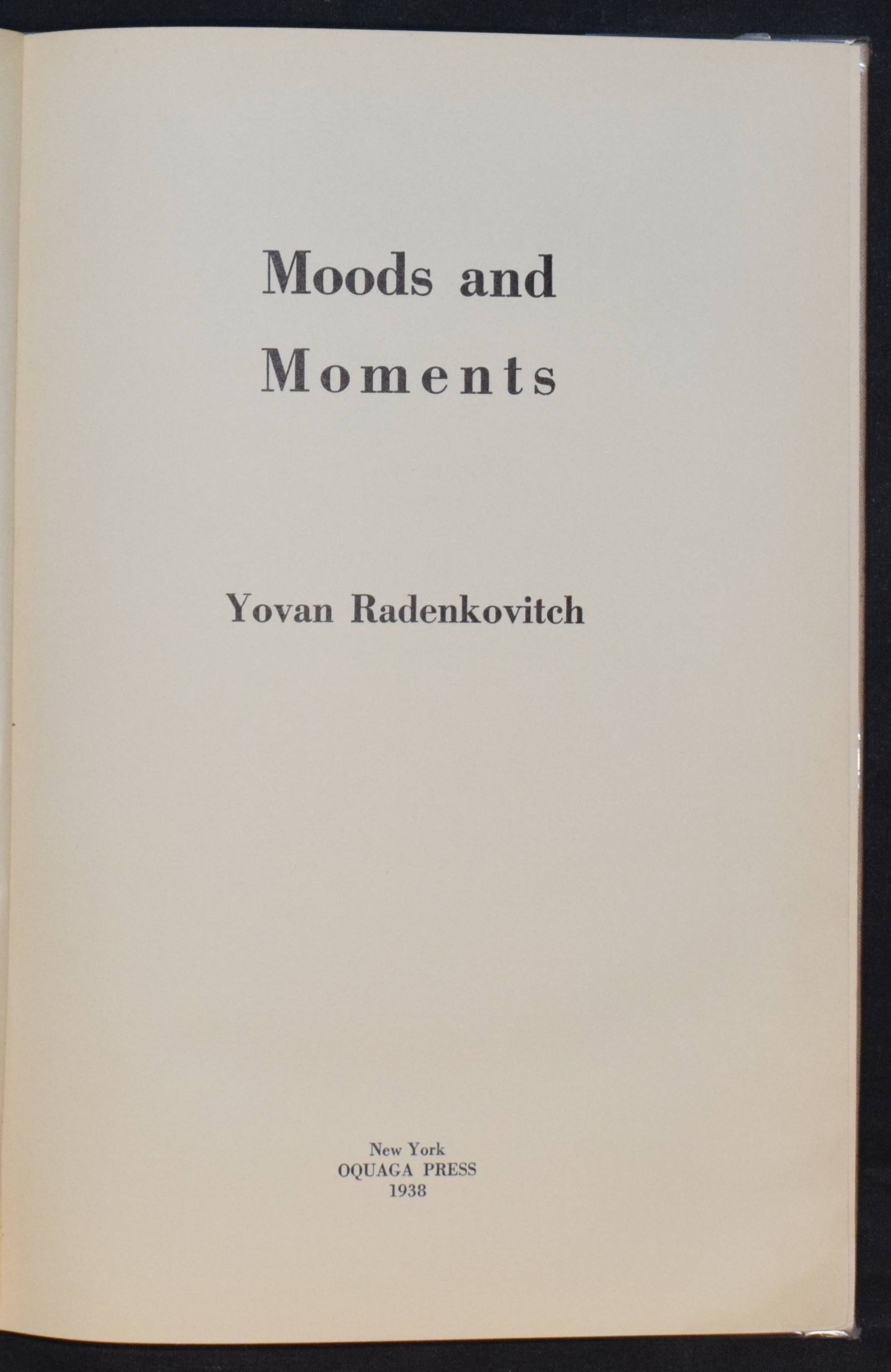 Radenkovitch, Yovan. Moods and Moments. New York, Oquaga 1938. 4°. 76 S. mit 7 mont. illustr. Tafeln. OLn. mit Klarsichtfolienschutzumschlag ( nicht verklebt!). 1/ 500 Ex.Mit eigendhändiger dat. Widmung vom Autor. – Die Tafeln teils mit leichten Knickspuren,sonst gutes Exemplar.