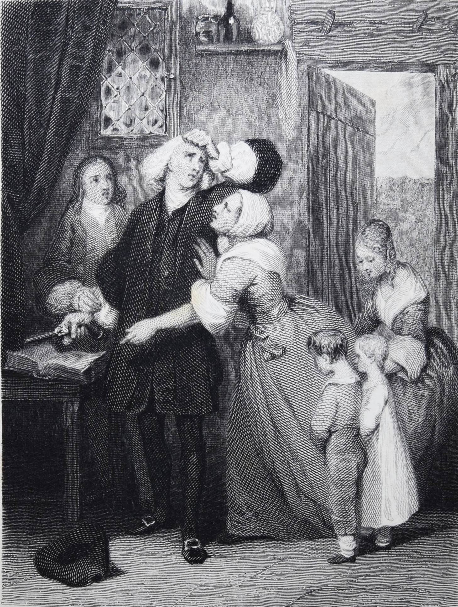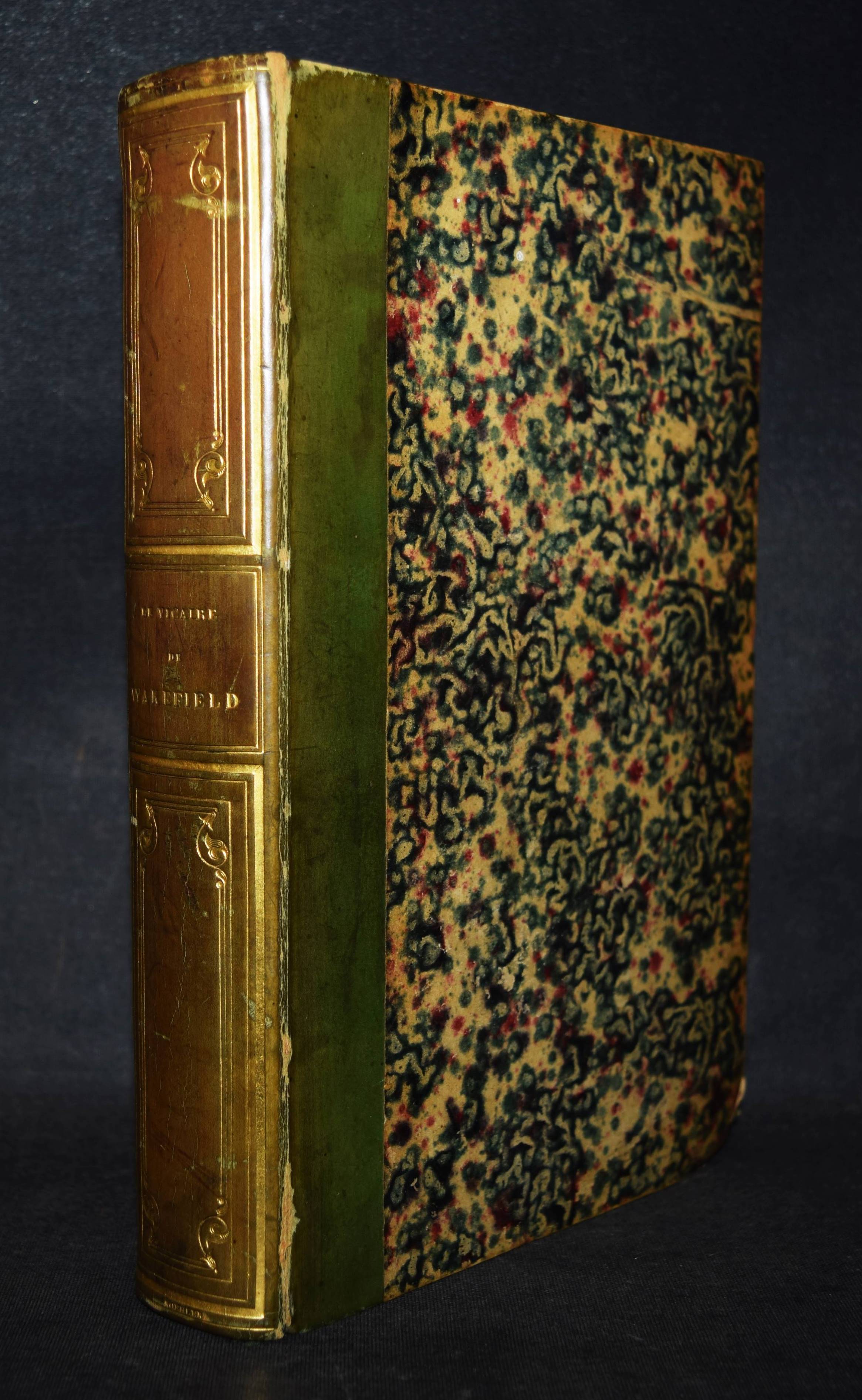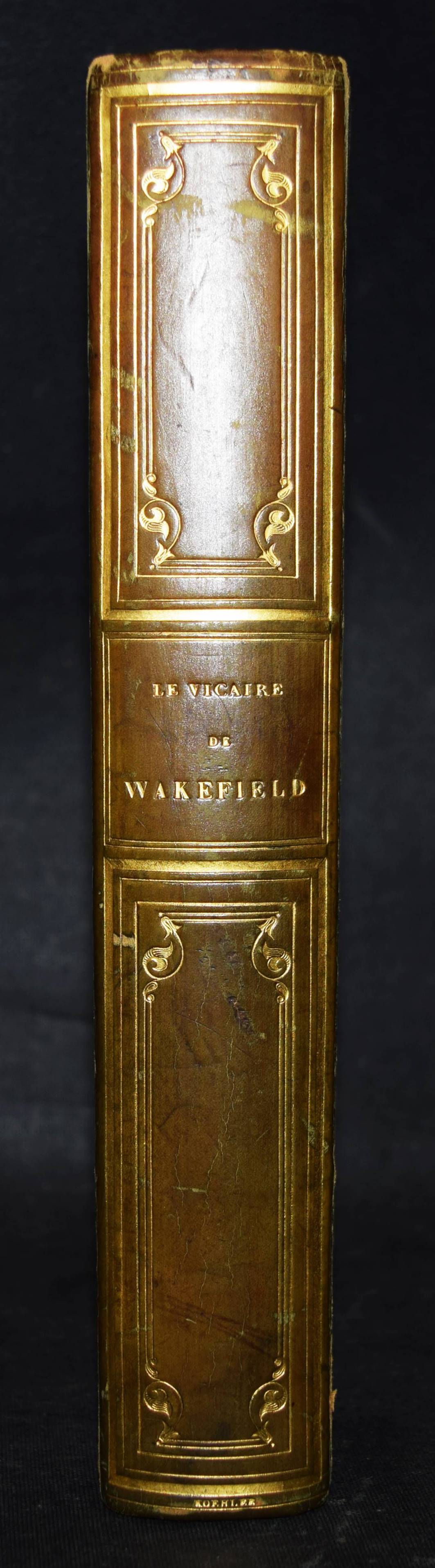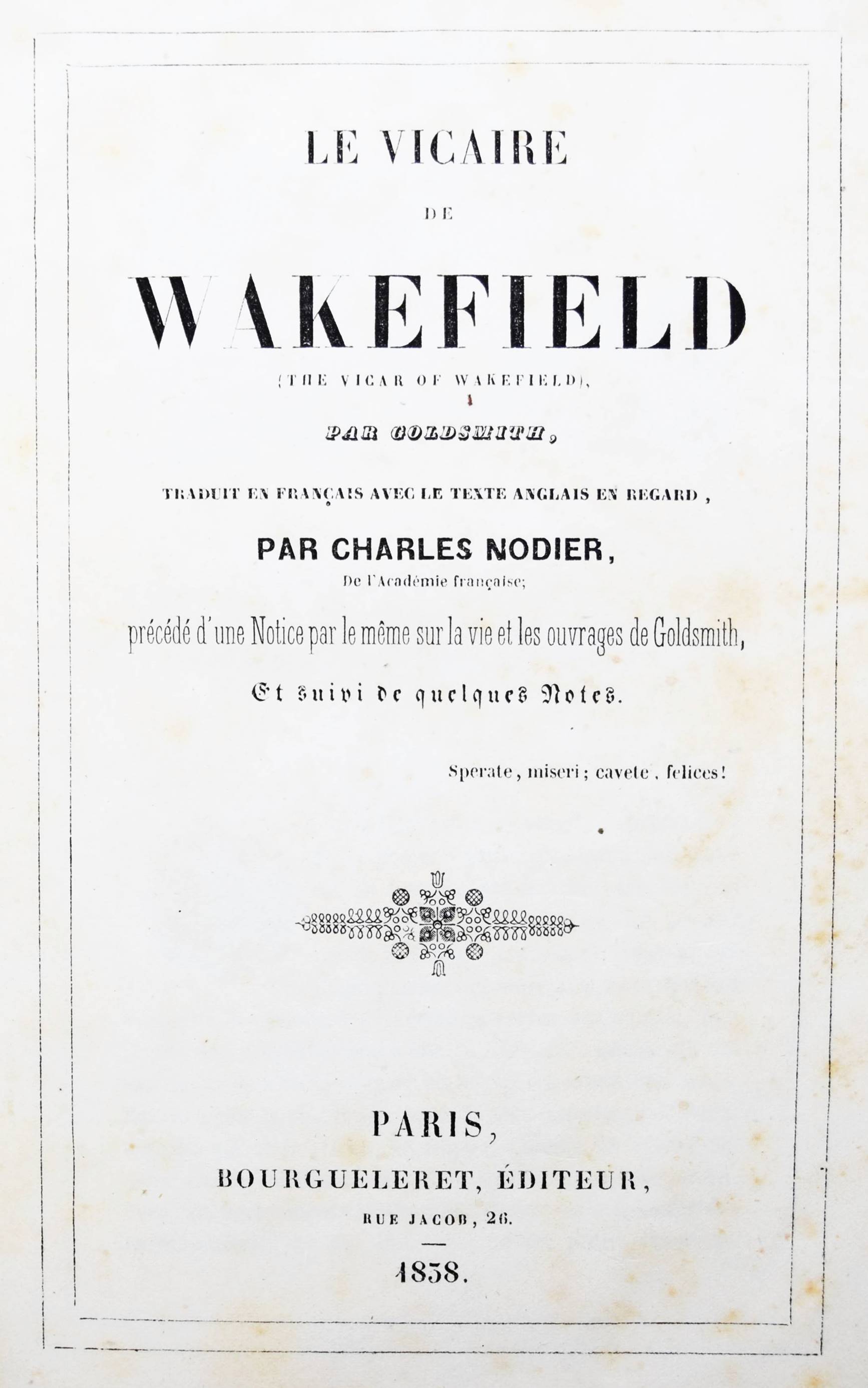 Goldsmith, (Oliver). Le vicaire de Wakefield. Traduit en francais avec le texte anglais en regard, par Charles Nodier, de l’ Académie francaise. Précédé d’une notice par la même sur la vie et les ouvrages de Goldsmith, et suivie de quelques notes. Paris, Bourgueleret 1838. Gr.-8°. XXVII, 581 S., 1 Bl. mit zahlr. Holzstichillustrationen im Text und 11 Holzstichvignetten von T(ony) Johannot. Grüner Hldr. d. Zt. mit goldgepr. Rückentitel und dekorativer Rückenvergoldung (signiert Koehler). Erste Ausgabe mit diesen Illustrationen. – Einband etwas berieben, stockfl., sonst schön dekorativ gebundenes Exemplar.