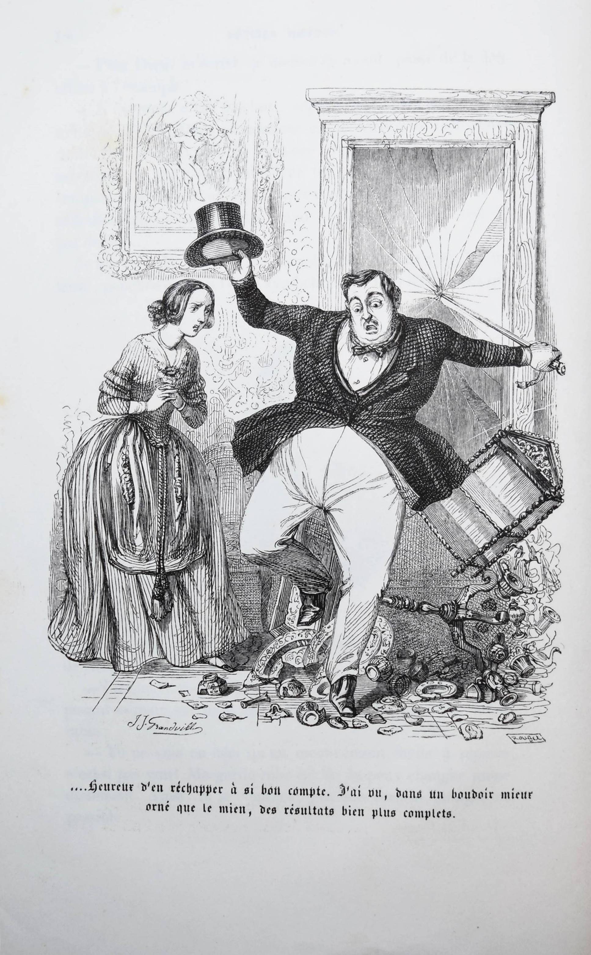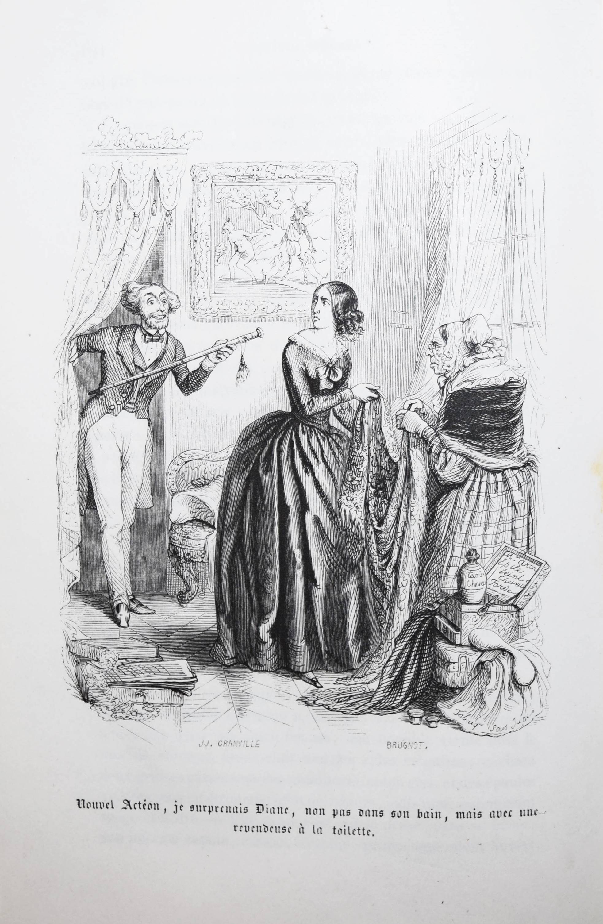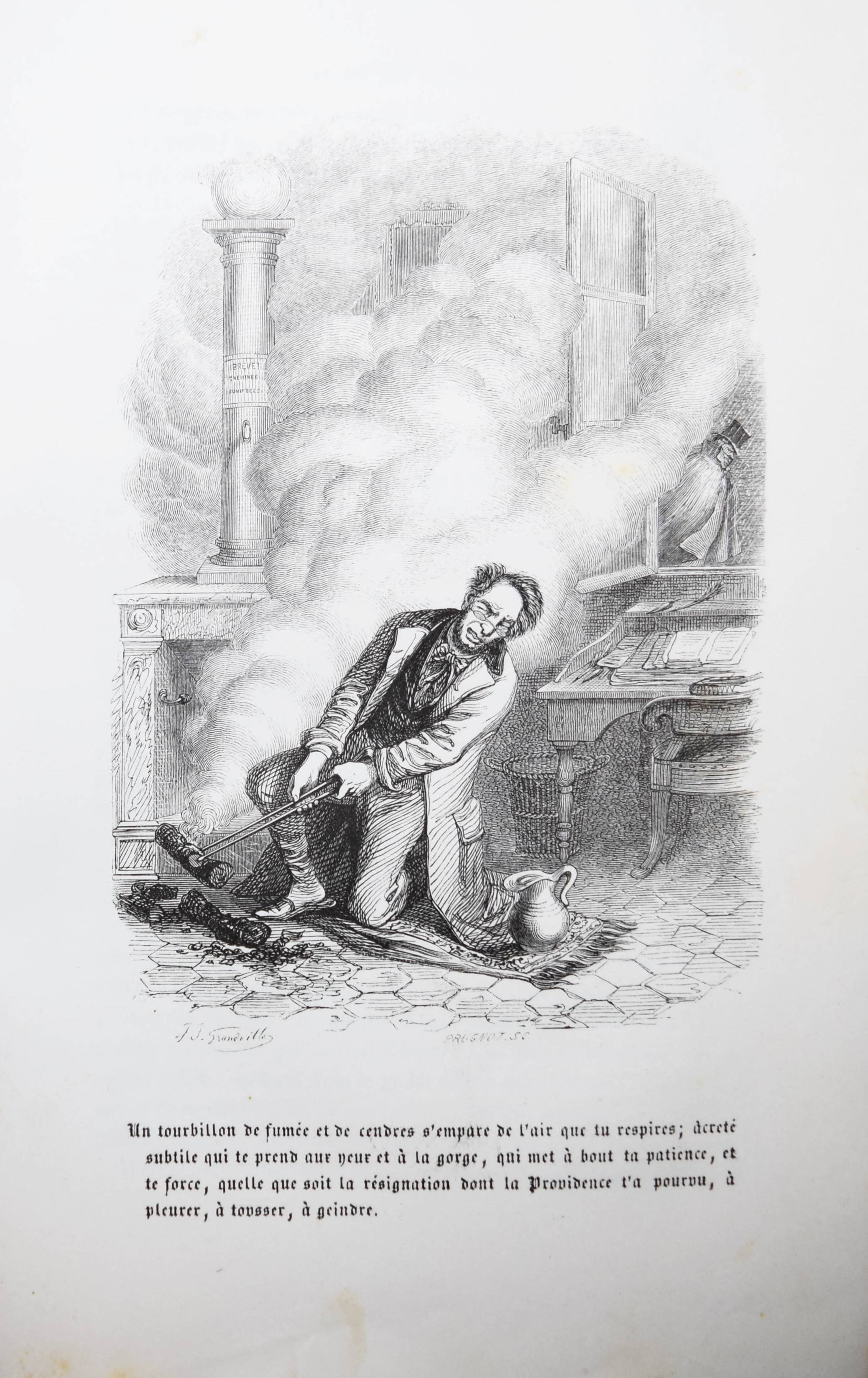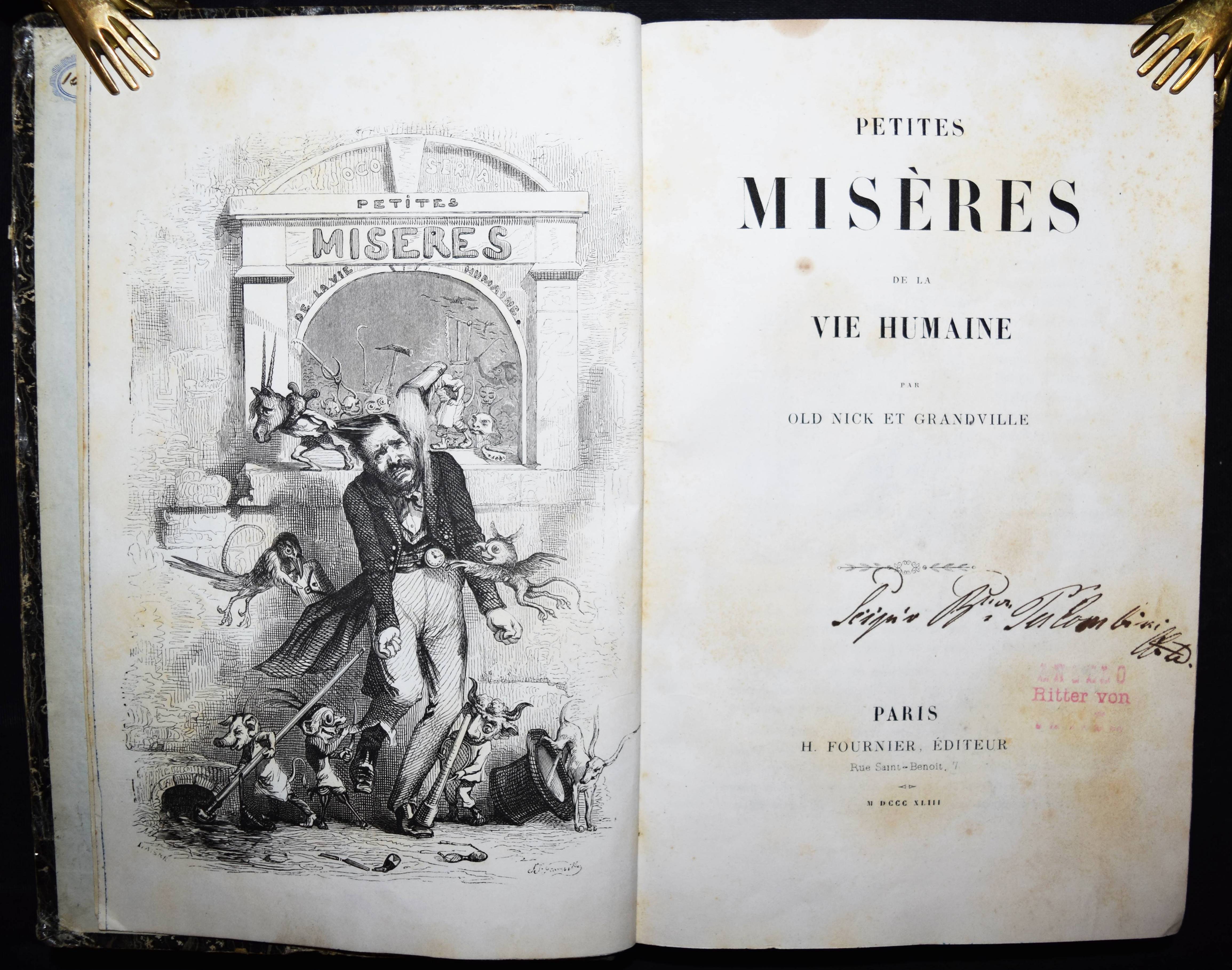 Old Nick (d.i. Émile Daurand Forgues) et Grandville (d.i Jean Ignace Isidore Gérard). Petites misères de la vie humaine. Paris, H. Fournier 1843. 8°. VIII, 390 S., 2 Bl. mit zahlr. Holzstichen im Text, 2 Frontispiz und 48 Holzstich-Tafeln. Hln d. Zt. mit goldgepr. Rückentitel. Sander 542. – Erste Ausgabe. – Einband etwas berieben, leicht stockfl., sonst gutes Exemplar.