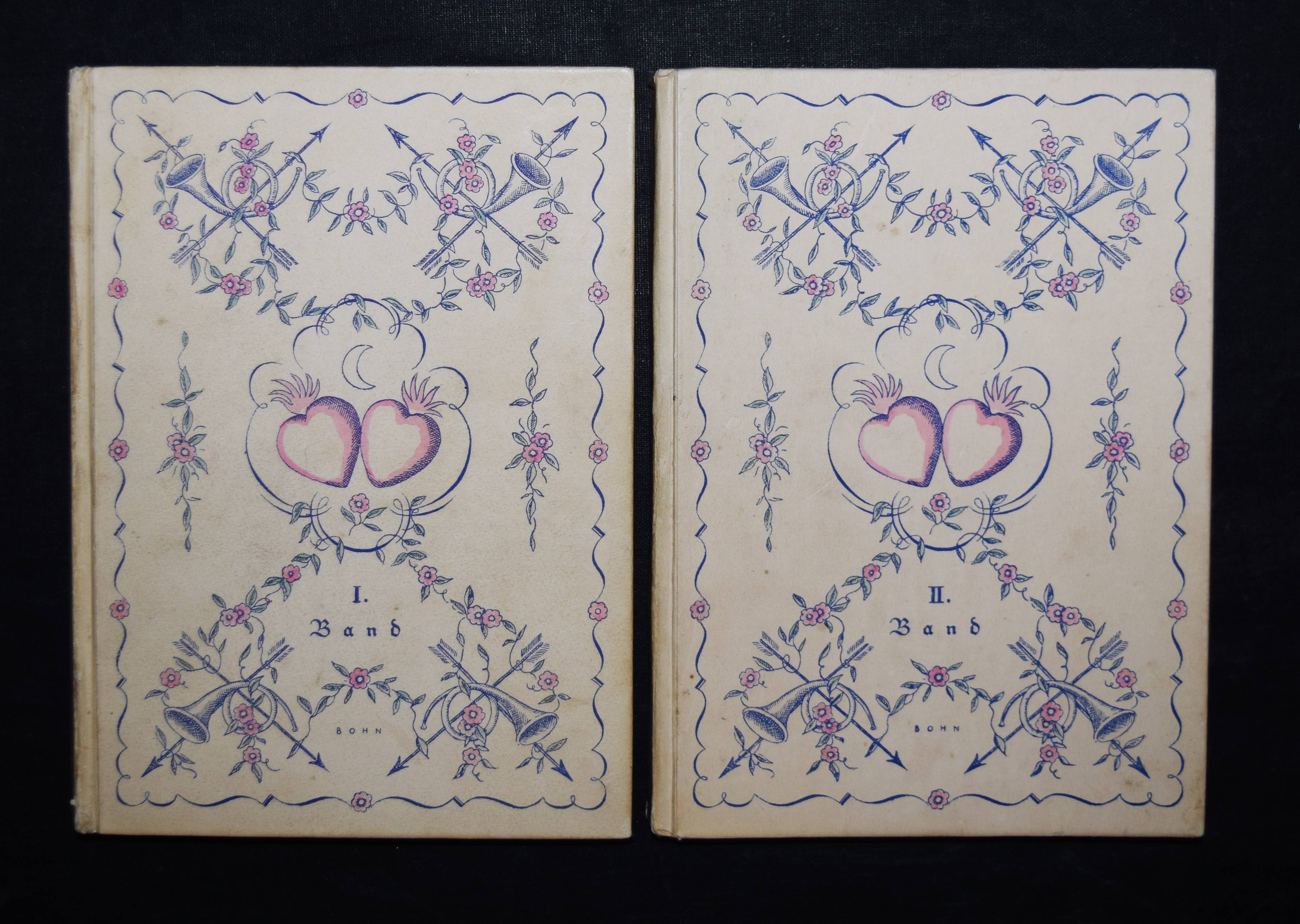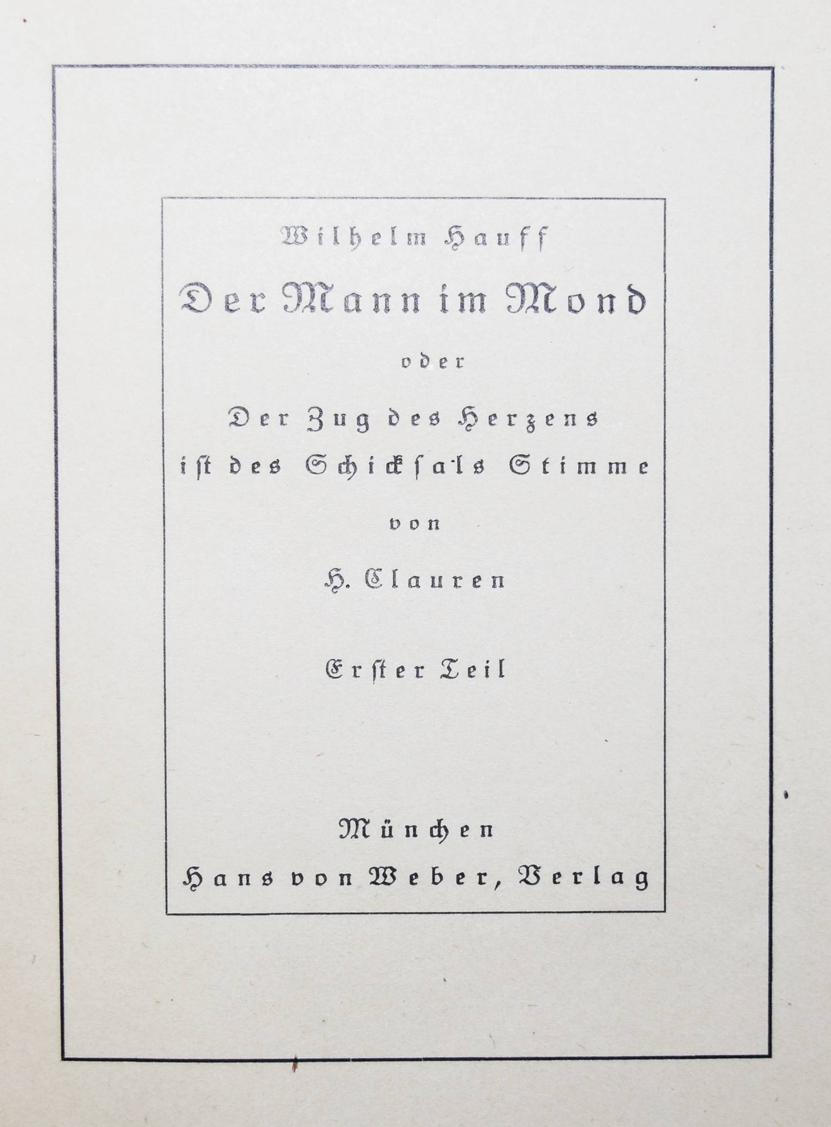 Hauff, Wilhelm. Der Mann im Mond od. Der Zug des Herzens ist des Schicksals Stimme von H. Clauren. (Mit eingedruckten Ursteindrucken von Hans Bohn). 2 Bände. München, Hans von Weber 1922. 8°. 189 S.; 142 S. mit zahlr. Illustr. Farbig illustr. OPbde. (Dreiangeldruck, Band 7). Einbände etwas berieben, Rücken leicht nachgedunkelt, sonst gutes Exemplar.