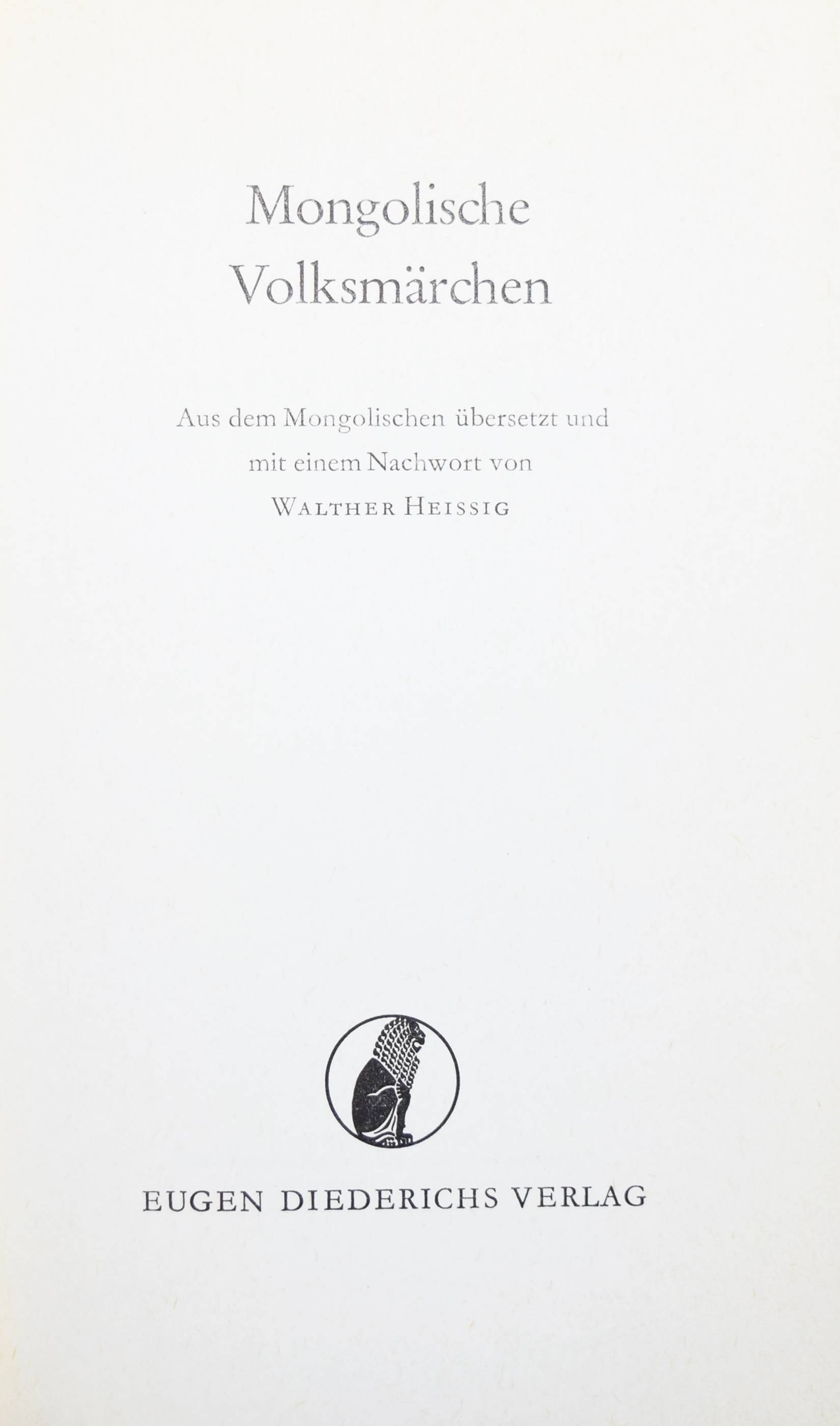 Mongolische Volksmärchen. Aus dem Mongolischen übersetzt und mit einem Nachwort von Walther Heissig. 1. – 5. Tsd. Düsseldorf, Köln, Diederichs 1963. 8°. 265 S., 1 Bl. OLdr. mit goldgepr. Rückentitel, Kopfgoldschnitt. (Die Märchen der Weltliteratur). Ganzlederausgabe. – Sehr gutes und sauberes Exemplar.