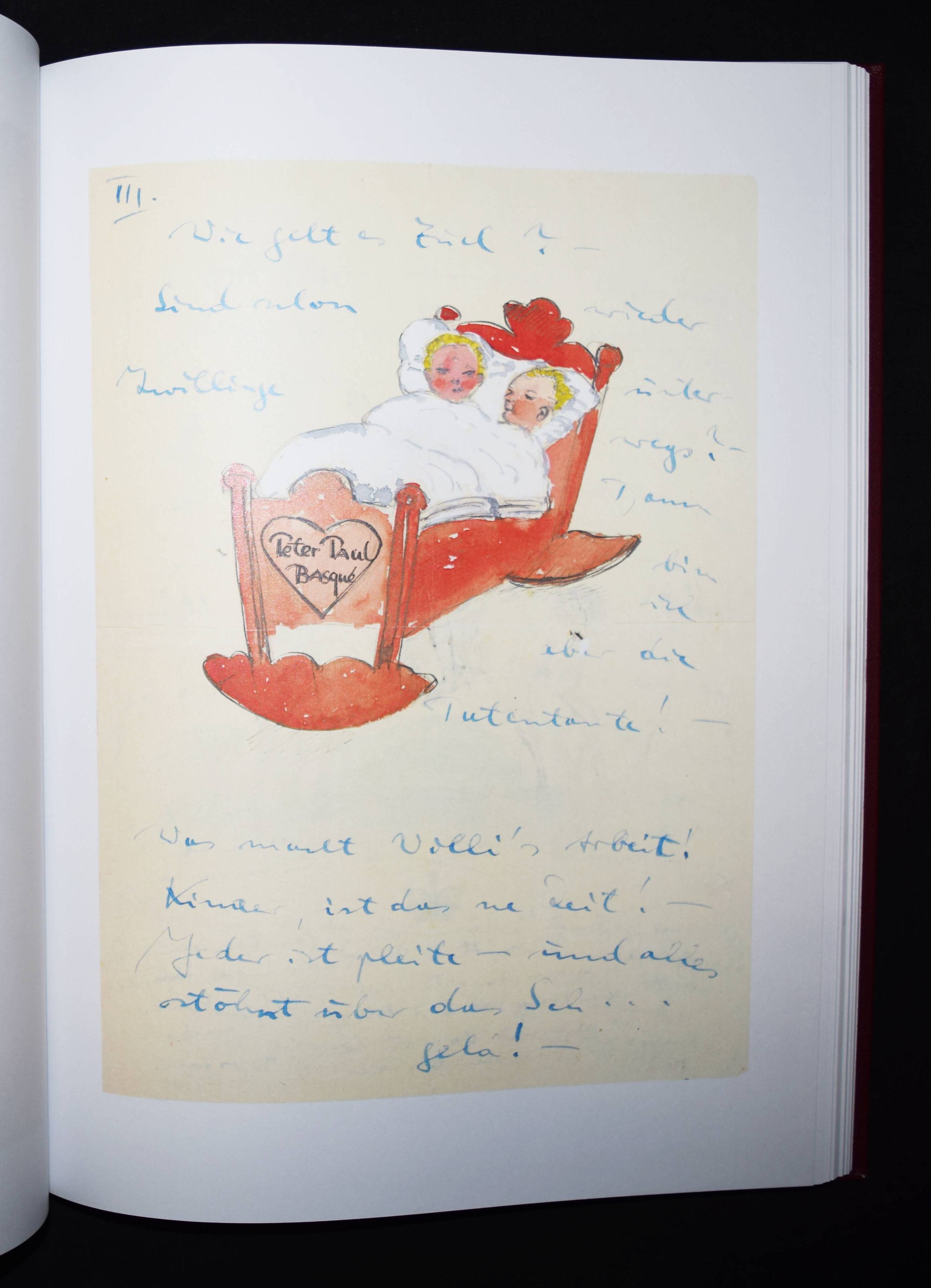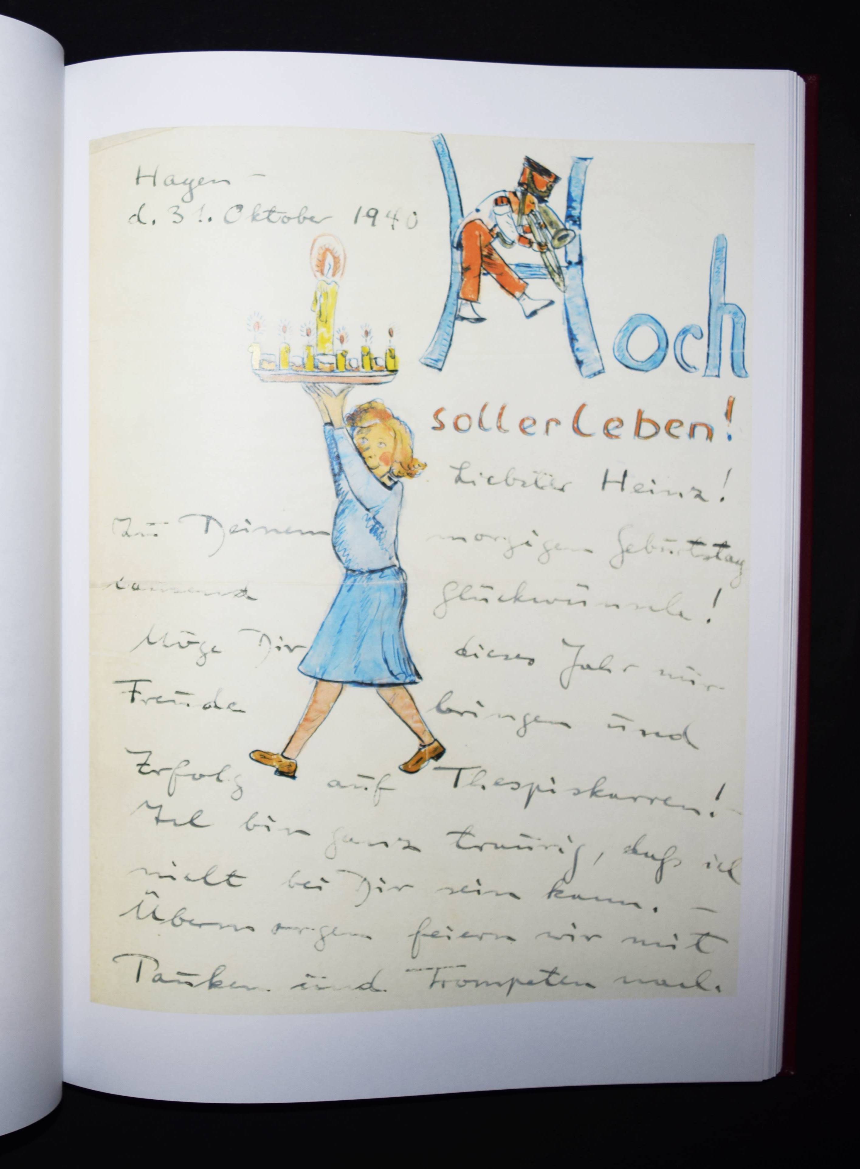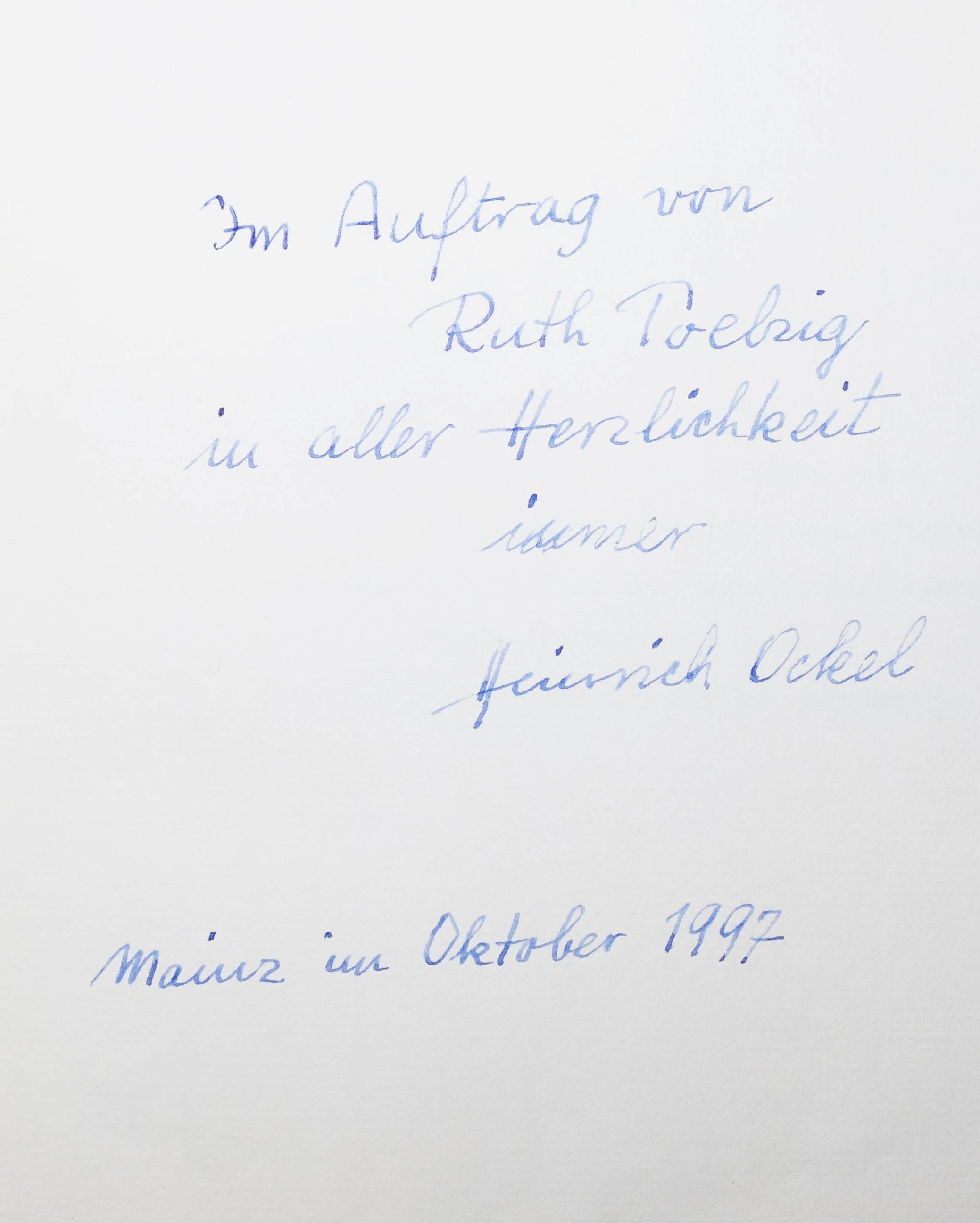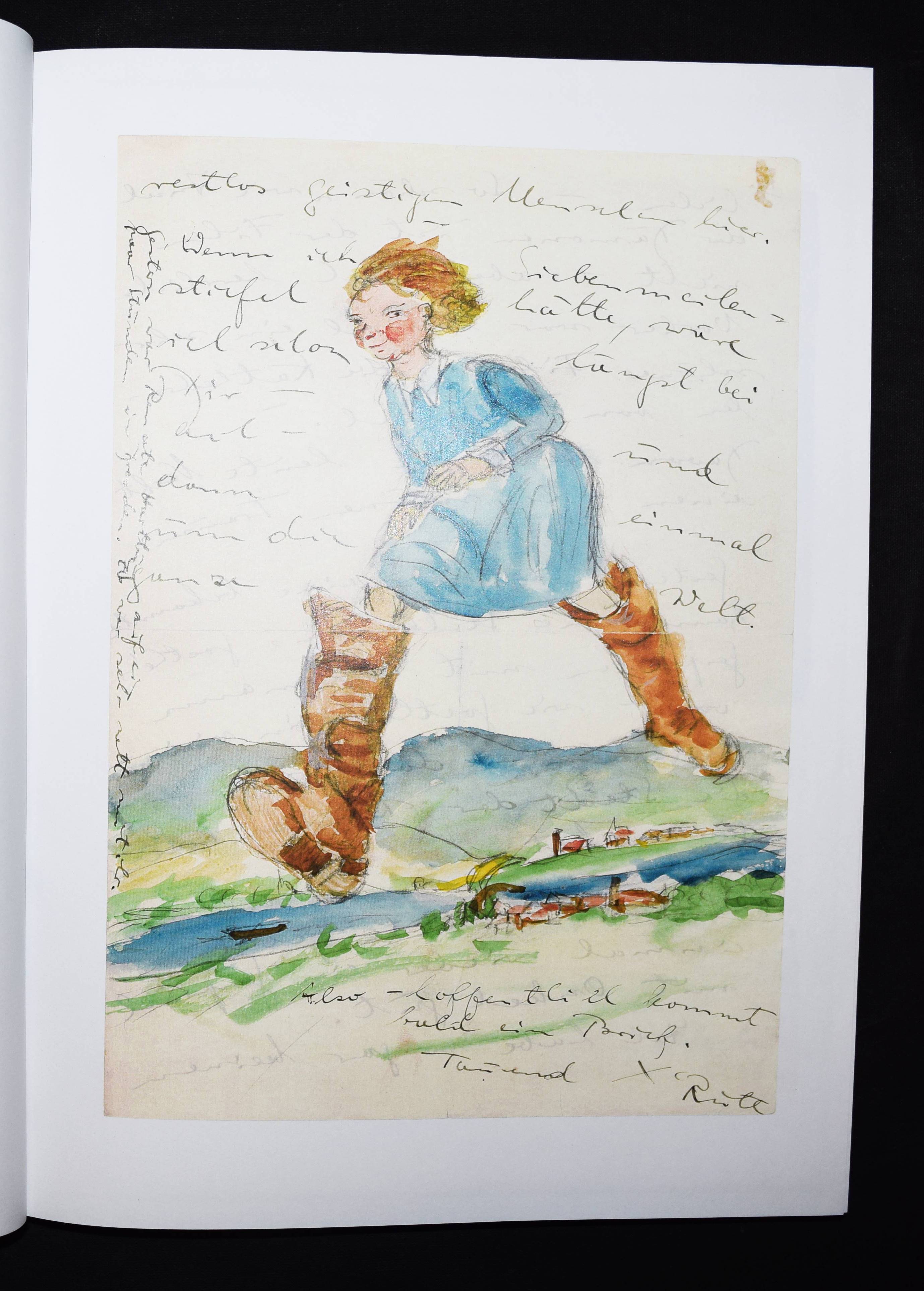 Poelzig, Ruth. Meine Malbriefe 1919-1979. Herausgegeben von Heinrich Ockel. Mainz, Selbstverlag 1997. 4°. Unpaginert mit farbigen Brief-Faksimiles. OLn. mit goldgepr. Rücken- und Deckeltitel. Mit einer Widmung von Ihrem Ehemann Heinrich Ockel. – Ruth Poelzig (1904-1996), war eine deutsche Schauspielerin und die Tochter des berühmten Architekten Hans Poelzig. – Sehr gutes und sauberes Exemplar.