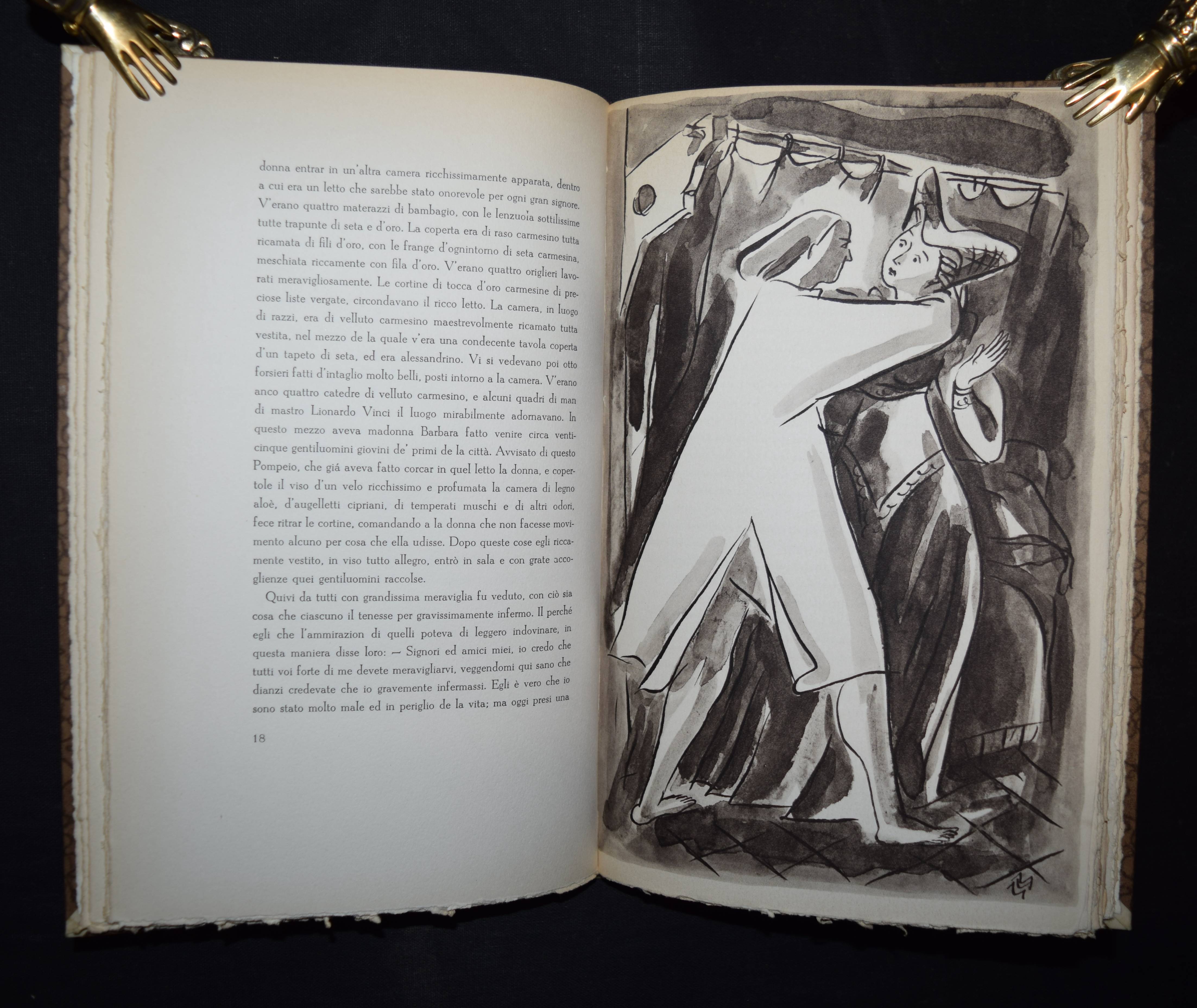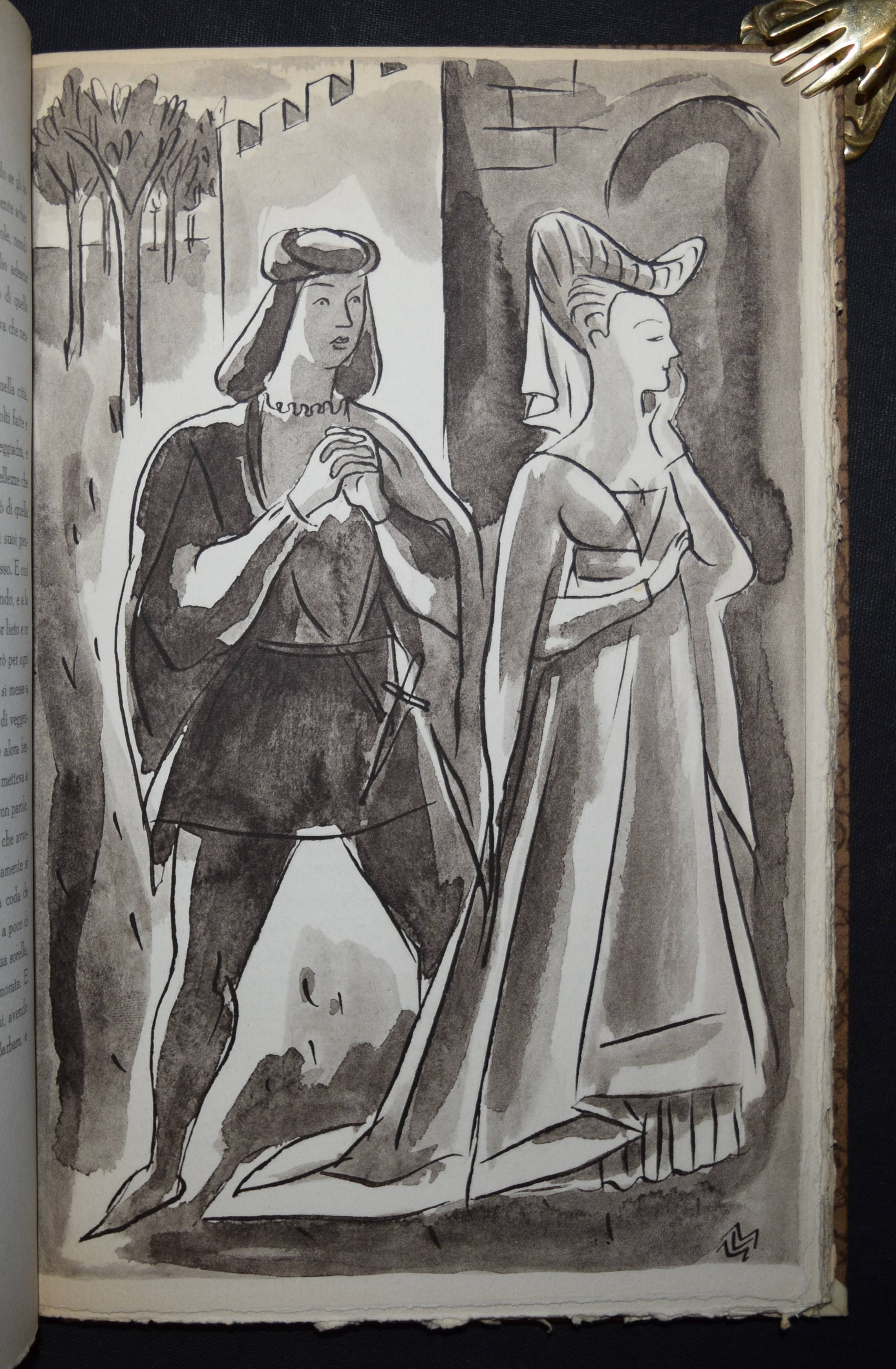 Bandello, Matteo. Novella. Zürich, Fretz 1948. Gr.-8°. 43 S. mit Illustrationen von M. Vellani-Marchi. OHprg. Eines von 100 Exemplaren auf Montgolfier Bütten. – Text in italienisch und deutsch. – Sehr gutes Exemplar.