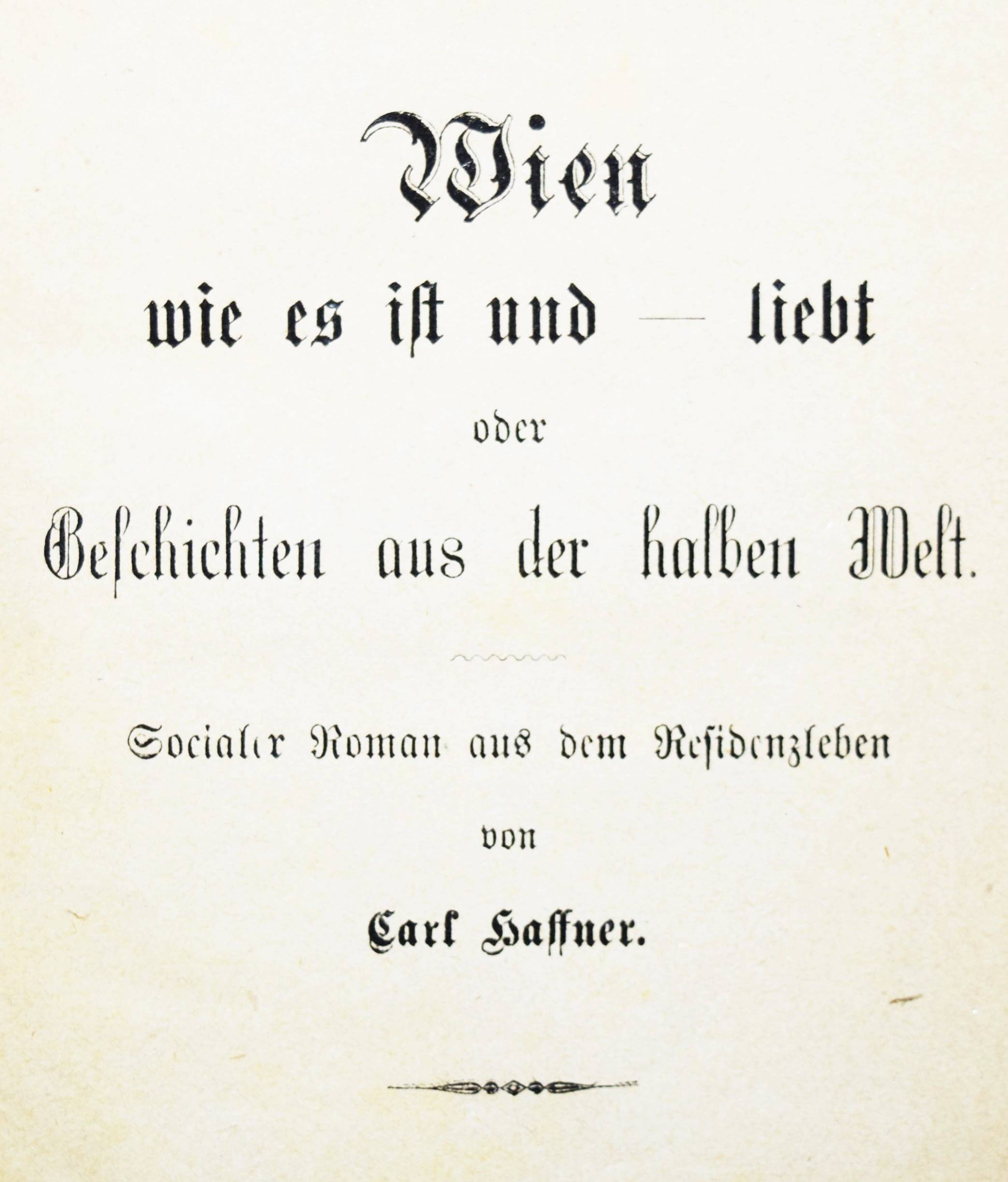 Haffner, Carl (d. i. Carl Schlachter). Wien wie es ist und – Liebt oder Geschichten aus der halben Welt. Socialer Roman aus dem Residenzleben. Wien, Kuhn 1871. Kl.-8°. 580 S. OHln. (Roman-Bibliothek. Kreuzer-Romane. 4. Roman, Heft 18). Brümmer I, 78 f. (verzeichnet vorliegenden Titel nicht). – Erste Ausgabe, sehr selten. – Einband fleckig und etwas berieben, Innengelenke angeplatzt, daher Bindung gelockert, Exlibris, papierbedingt etwas gebräunt.