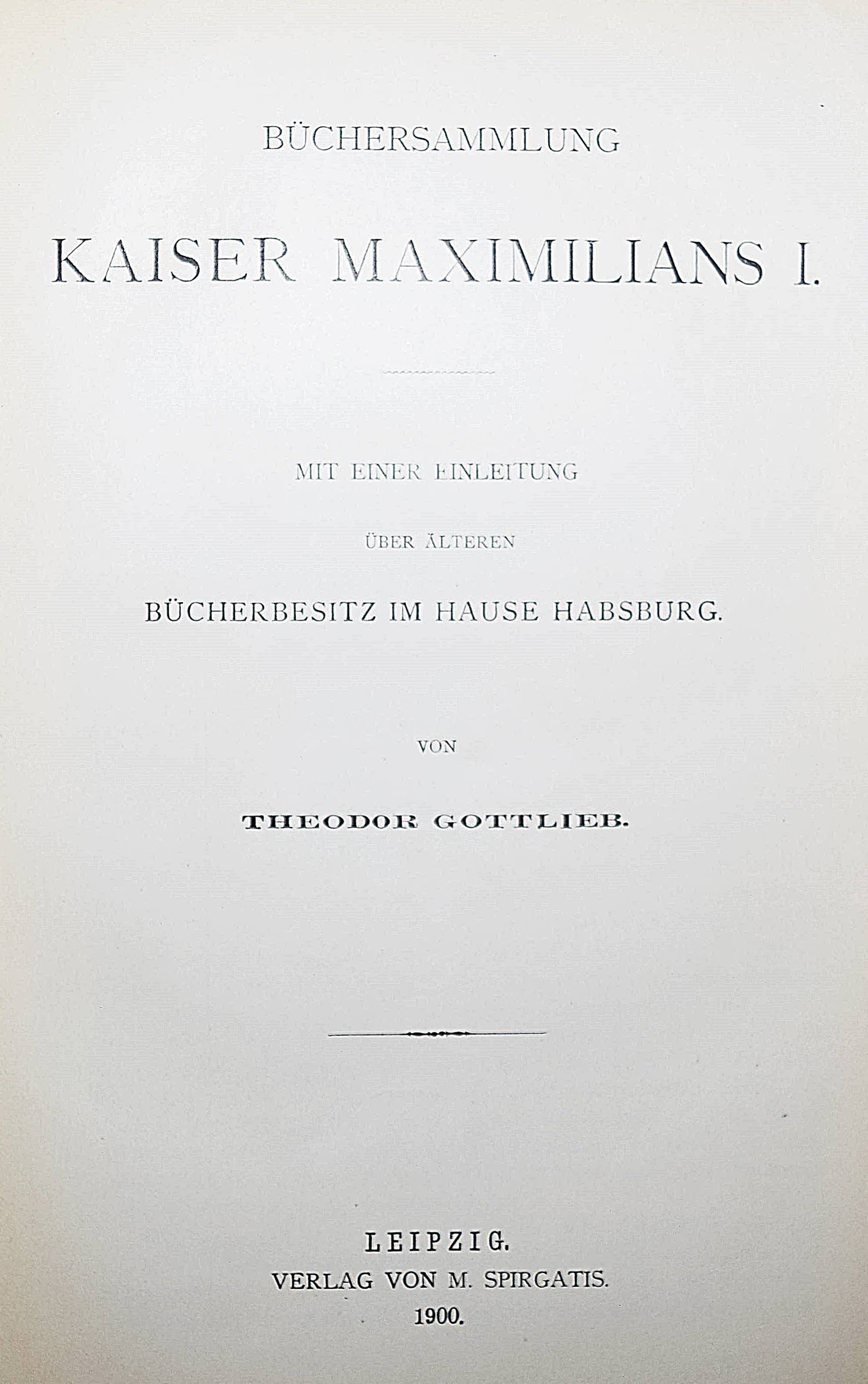 Gottlieb, Theodor. Büchersammlung Kaiser Maximilians I. Mit einer Einleitung über älteren Bücherbesitz im Hause Habsburg. Leipzig, Spirgatis 1900. 8°. VI, 172 S. Hln. d. Zt. mit goldgepr. Rückenschild. (Die Ambraser Handschriften, I). Rücken leicht aufgehellt, Rückenschild mit Randläsuren, gutes Exemplar.