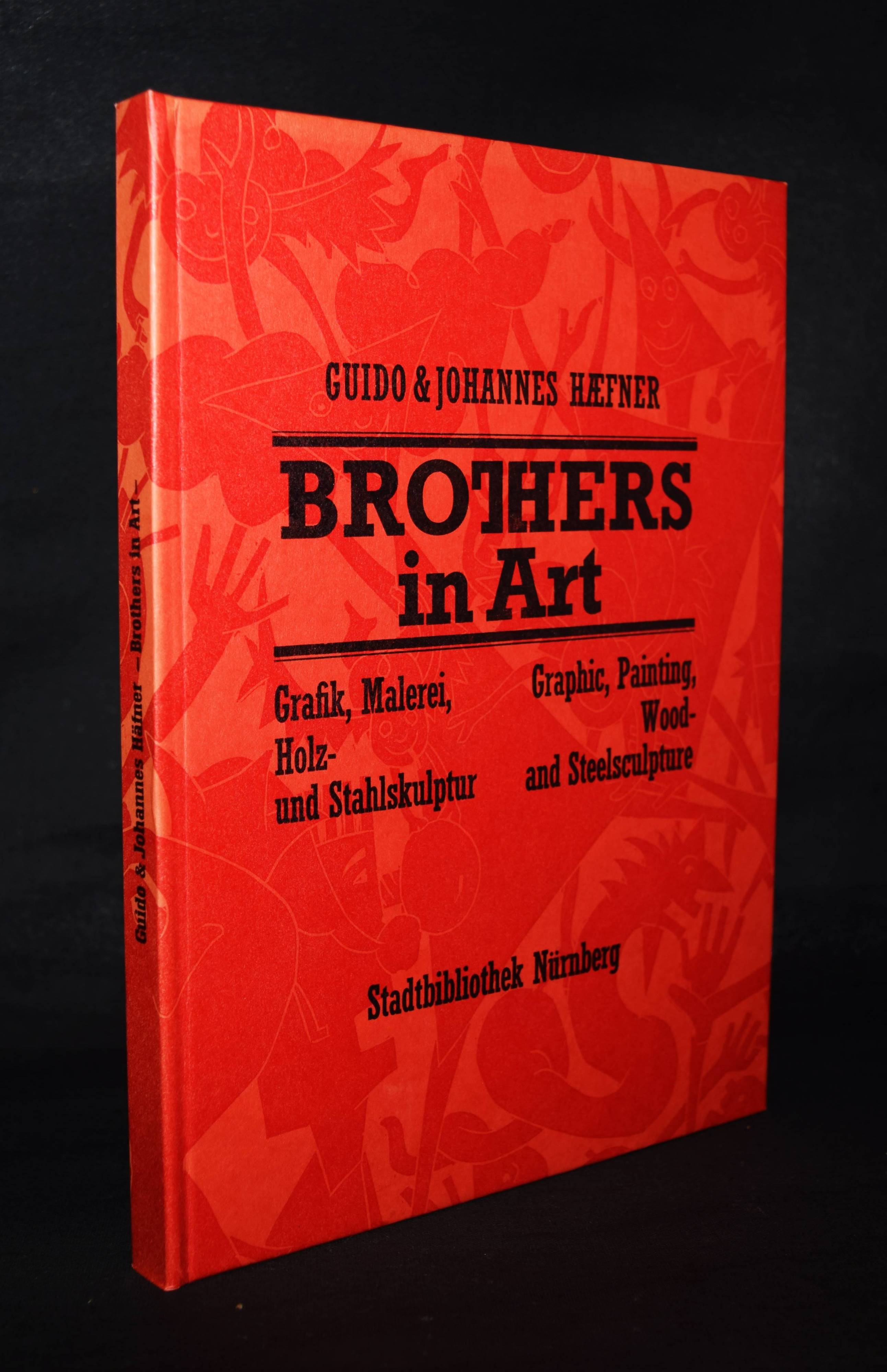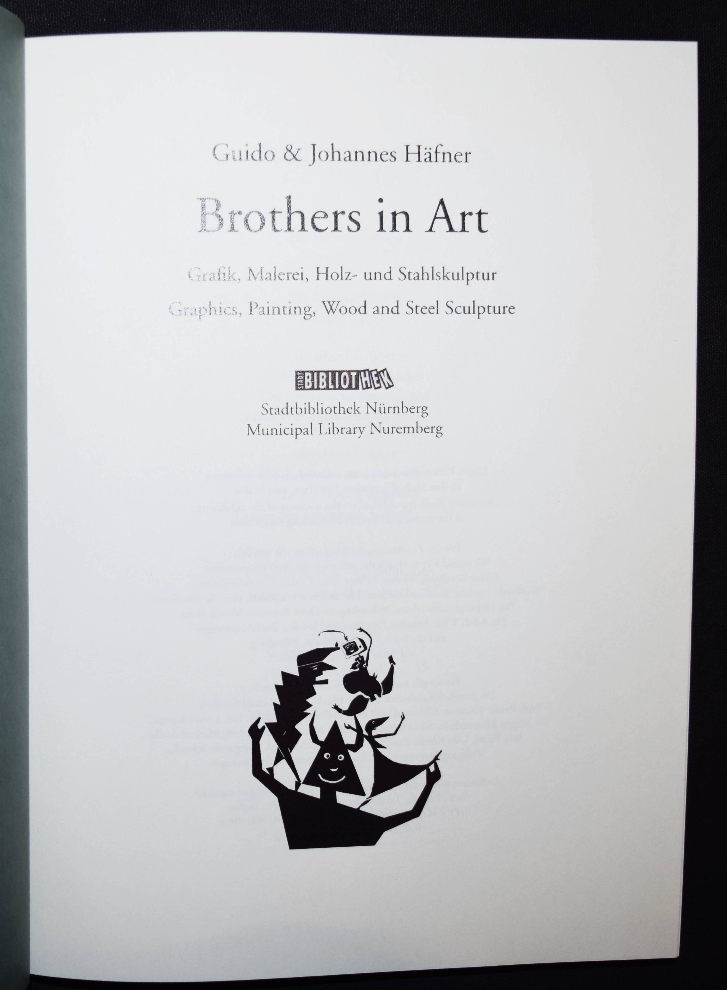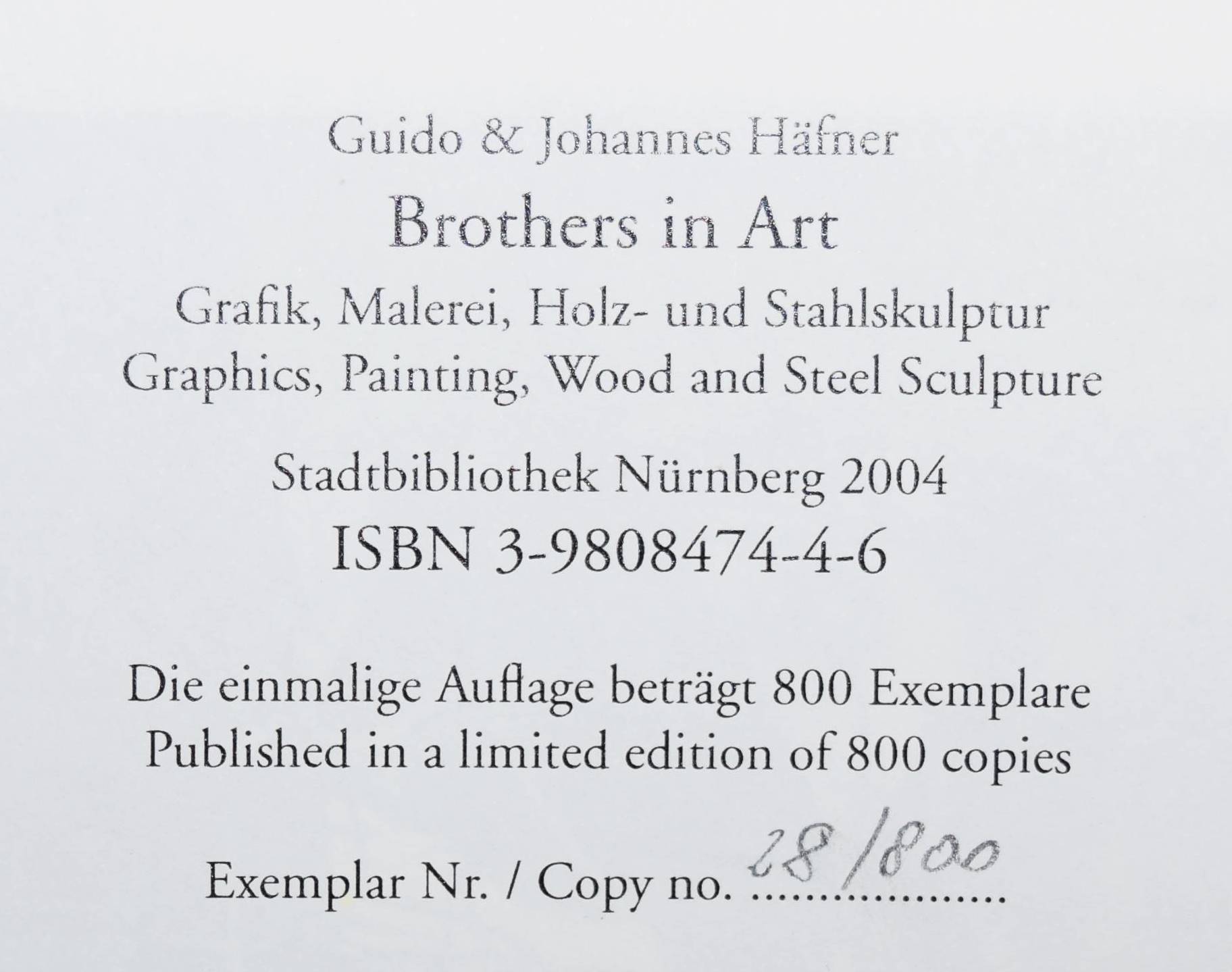 Häfner, Guido & Johannes. Brothers in art. Grafik, Malerei, Holz- und Stahlskulptur. Nürnberg, Stadtbibliothek 2004. Gr.-8°. 139 S. mit zahrl. teils farb. Abb. u. 2 Leporellos mit jeweils 3 Linolschnitten. OPbd. Nr. 28 von 800 Exemplaren. – Linolschnitt vom Künstler signiert und nummeriert – Text in englisch u. deutsch. – Tadelloses Exemplar.