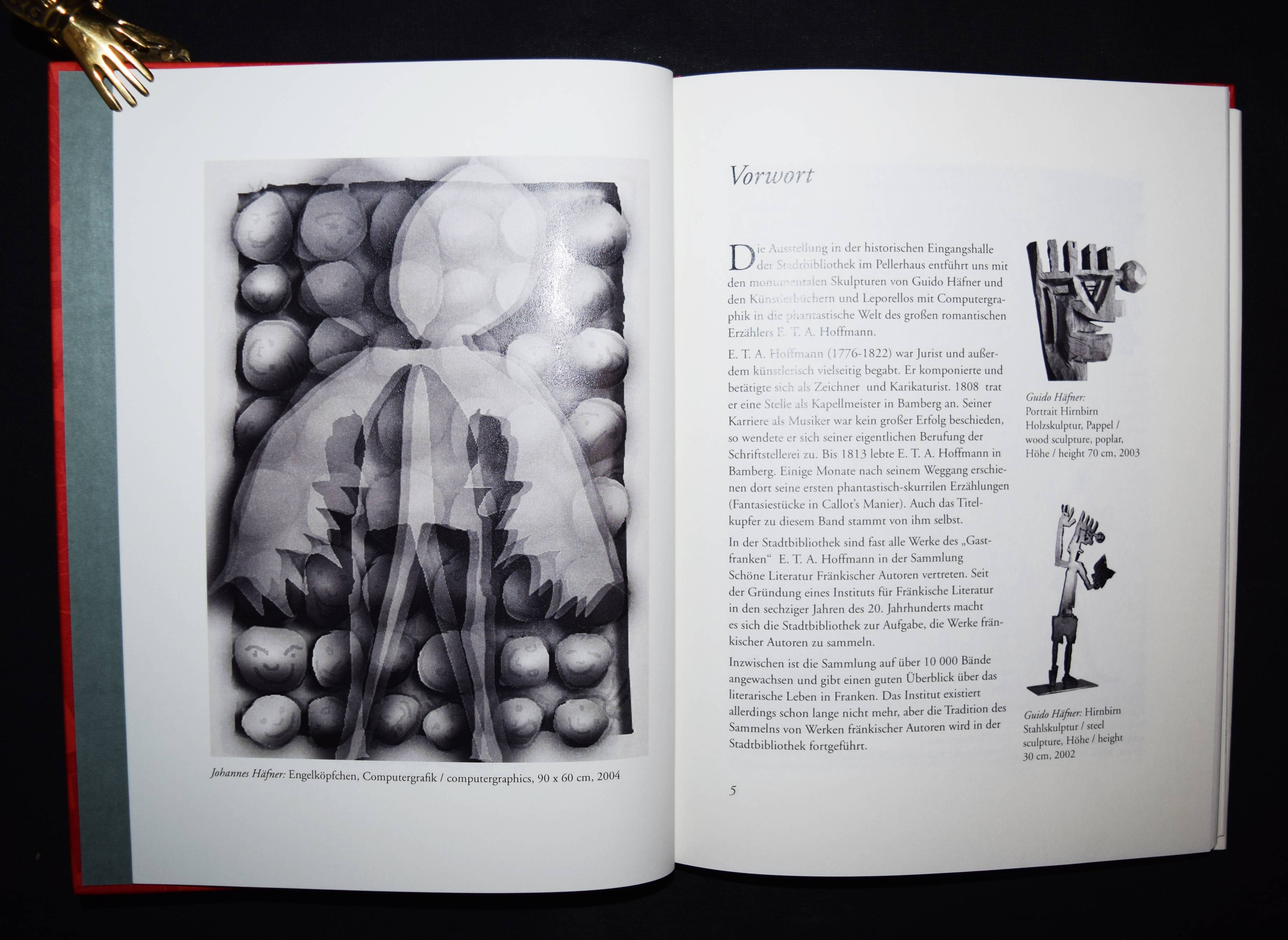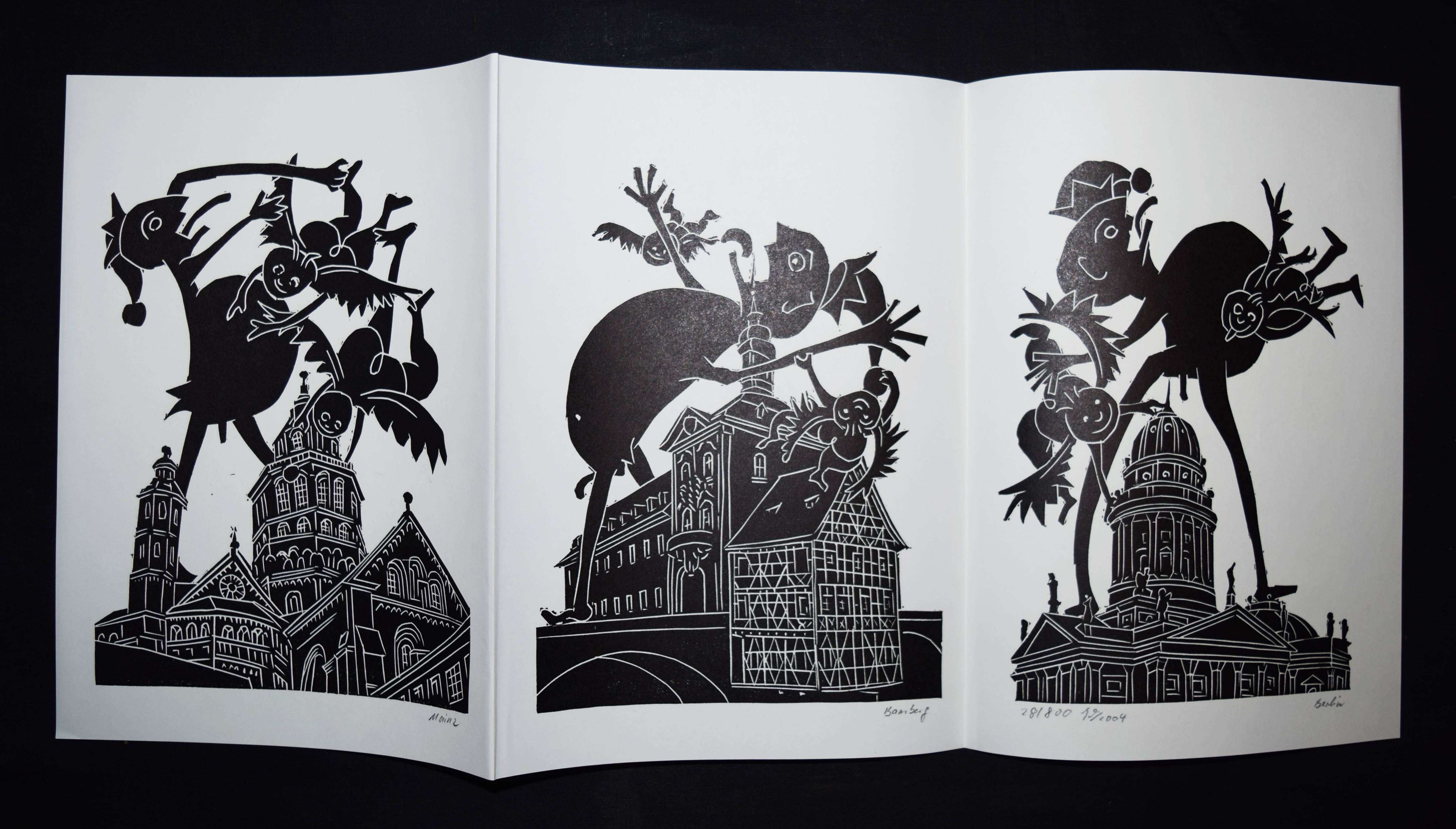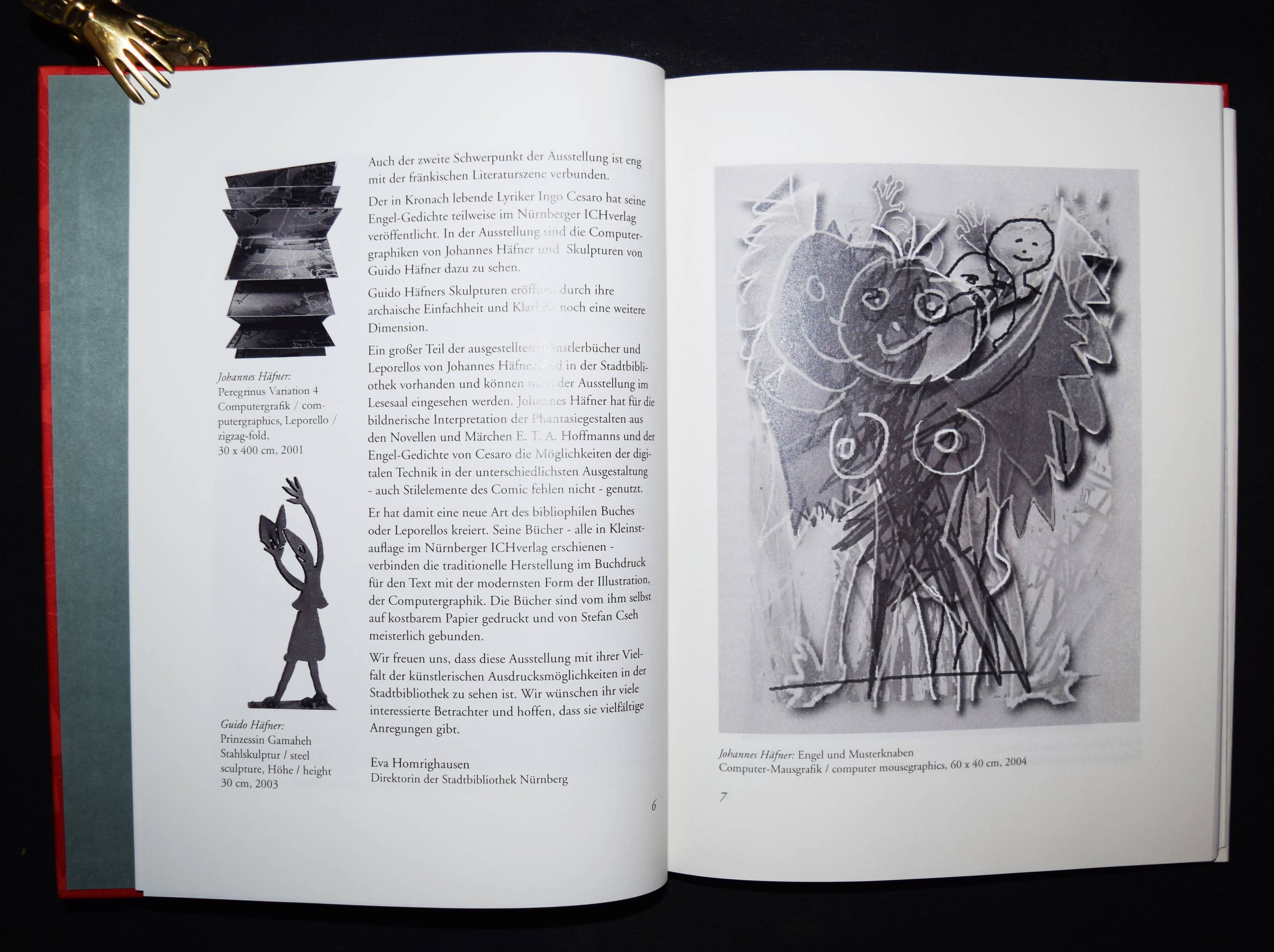 Häfner, Guido & Johannes. Brothers in art. Grafik, Malerei, Holz- und Stahlskulptur. Nürnberg, Stadtbibliothek 2004. Gr.-8°. 139 S. mit zahrl. teils farb. Abb. u. 2 Leporellos mit jeweils 3 Linolschnitten. OPbd. Nr. 28 von 800 Exemplaren. – Linolschnitt vom Künstler signiert und nummeriert – Text in englisch u. deutsch. – Tadelloses Exemplar.