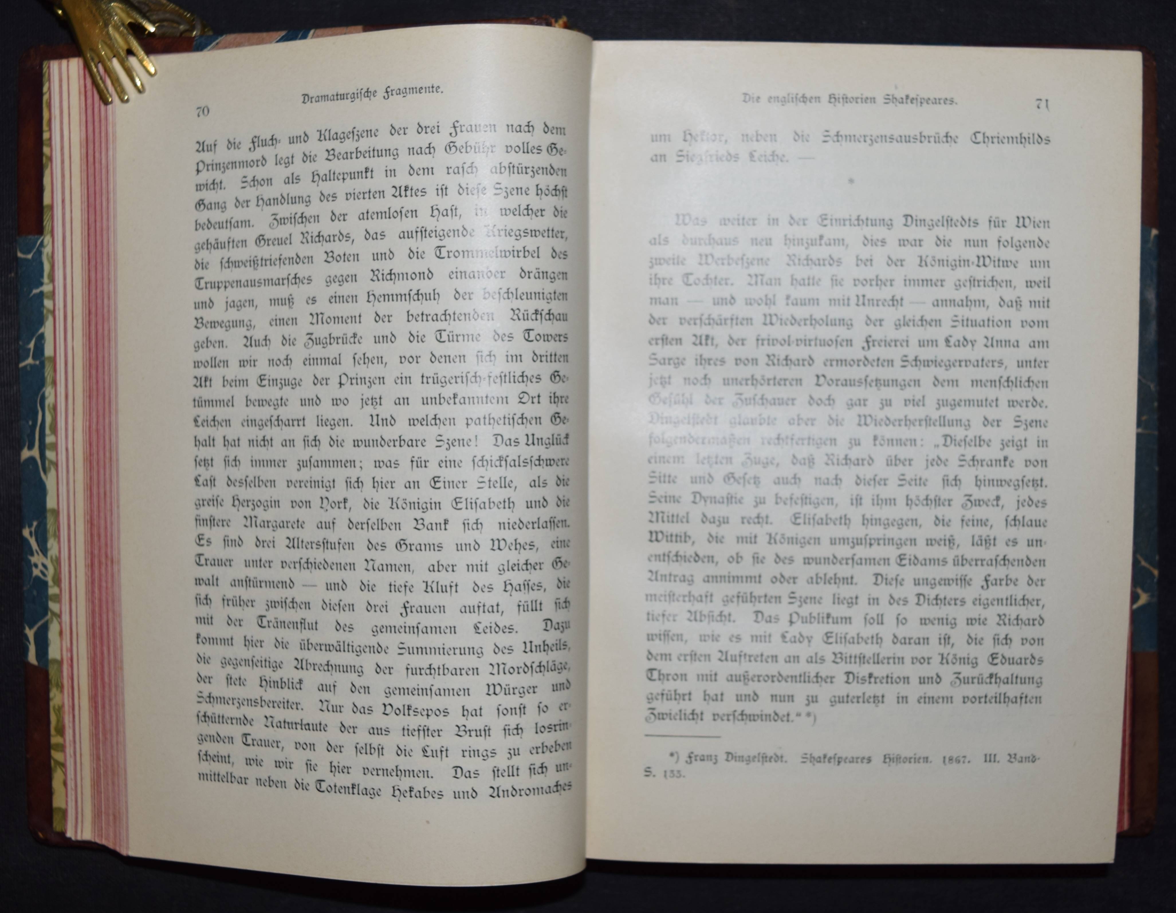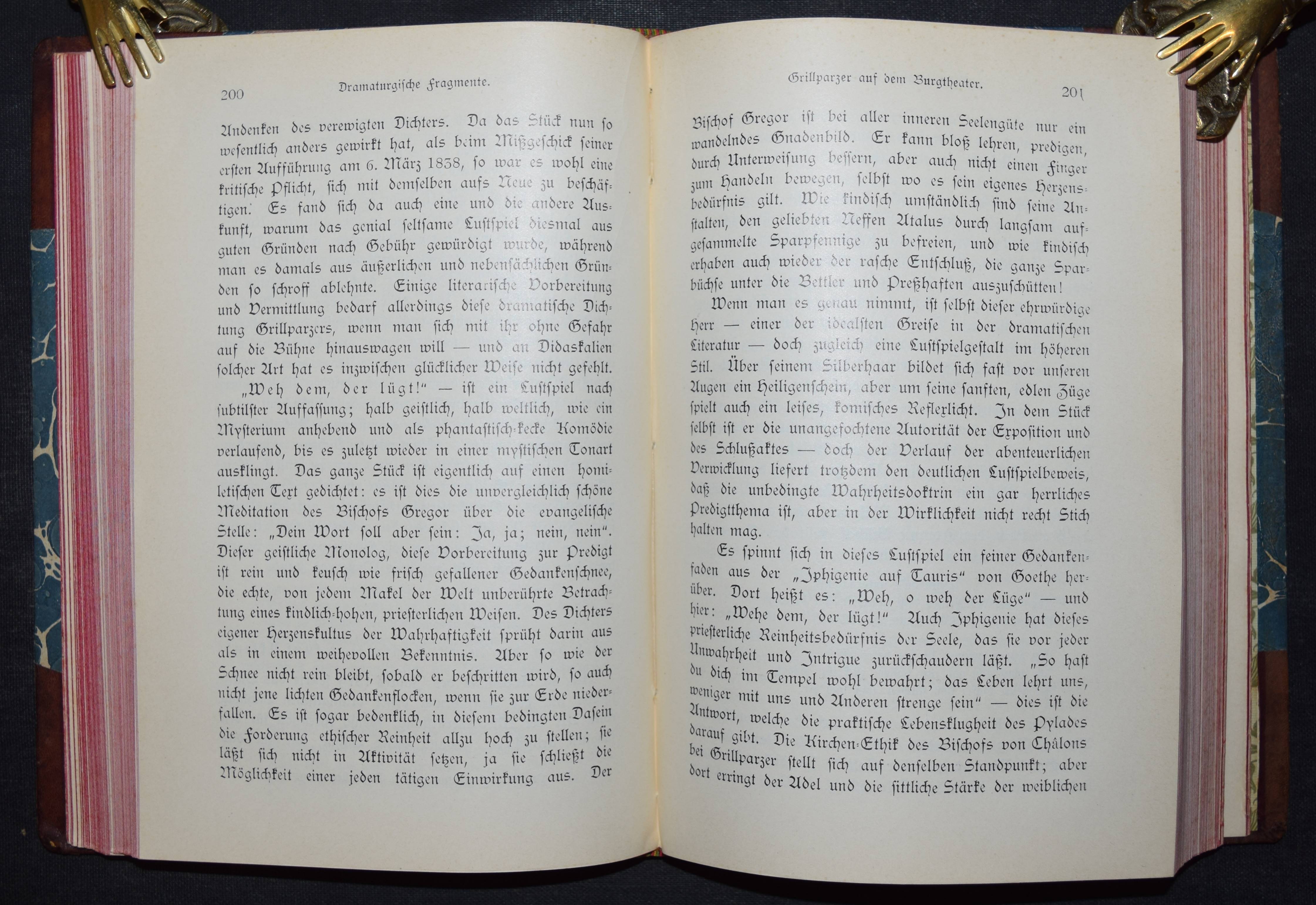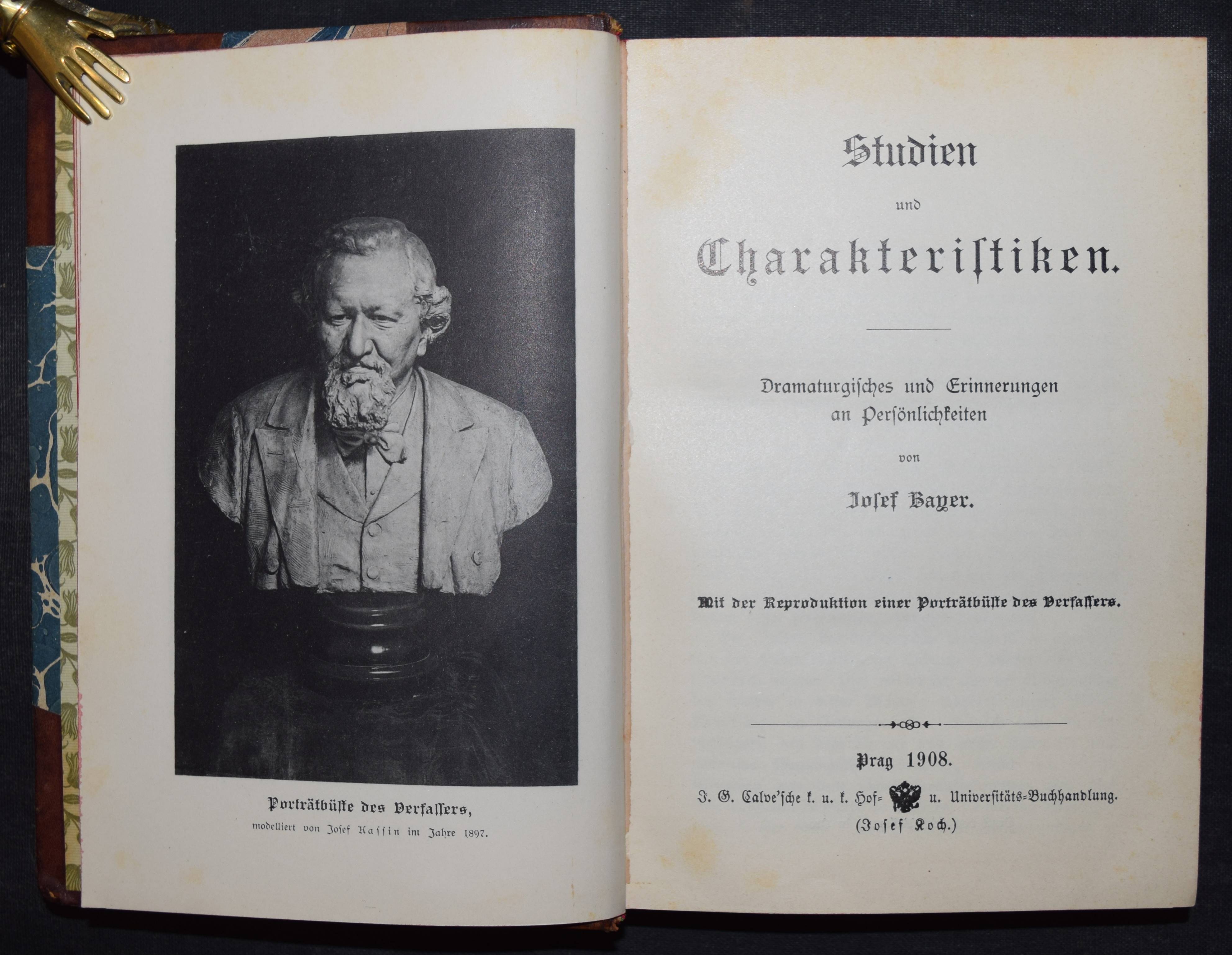 Bayer, Josef. Studien und Charakteristiken. Dramaturgisches und Erinnerungen an Persönlichkeiten. Prag, Calve 1908. 8°. 498 S. mit Abb. einer Porträtbüste des Verfassers. OHldr. mit goldgepr. Rückensch. u. Rückenverg. (Bibliothek deutscher Schriftsteller aus Böhmen, Mähren und Schlesien, Band 20). Erste Ausgabe. – Rücken etwas augehellt, gutes Exemplar.