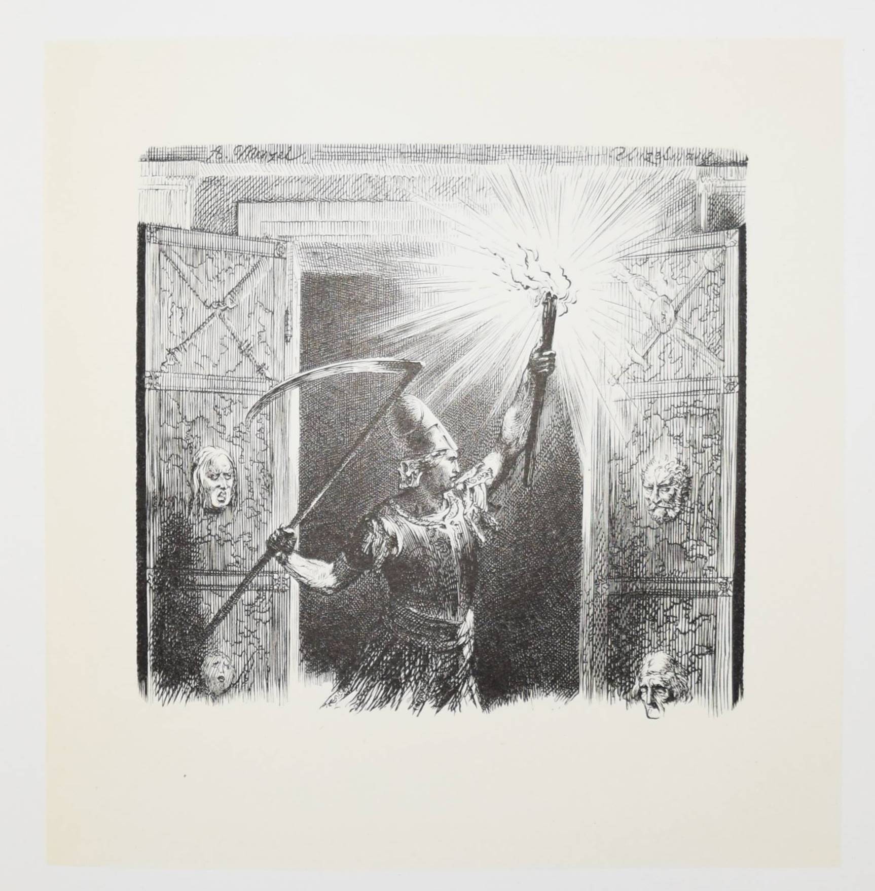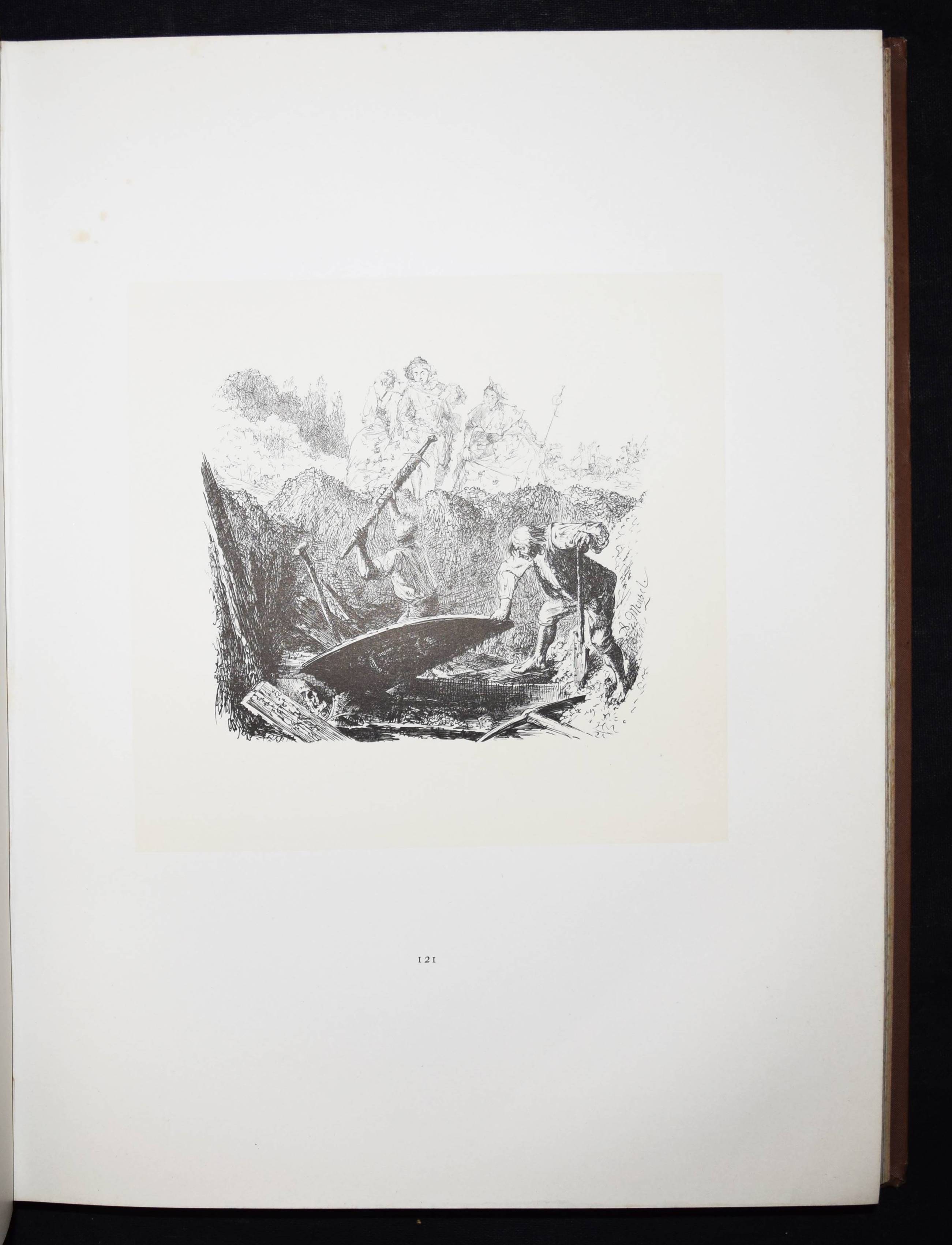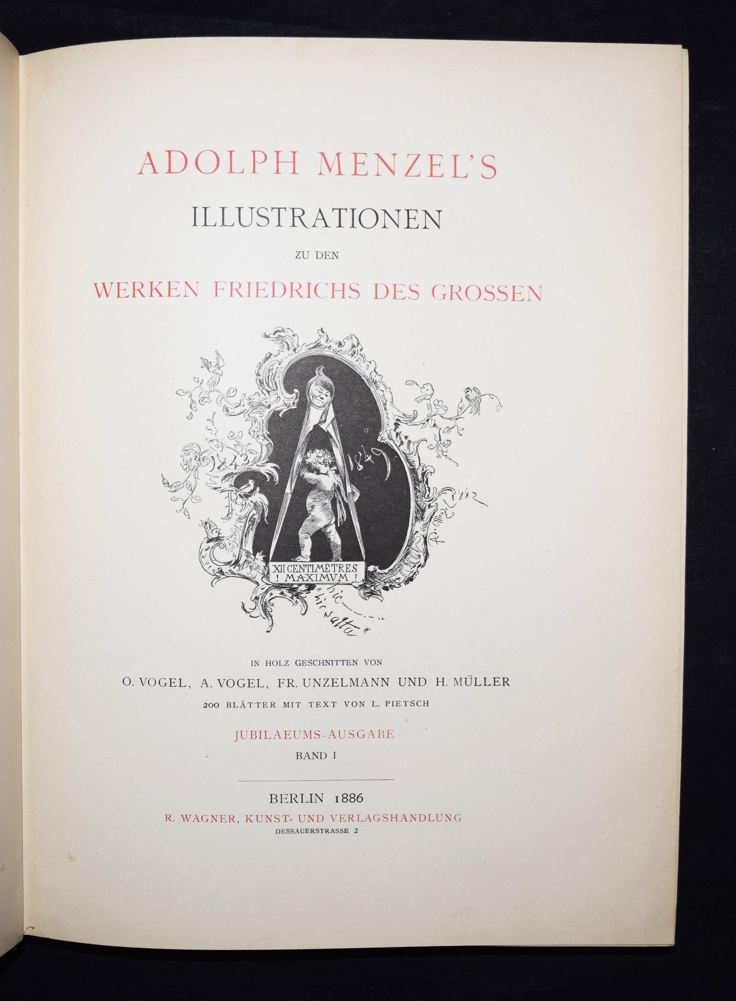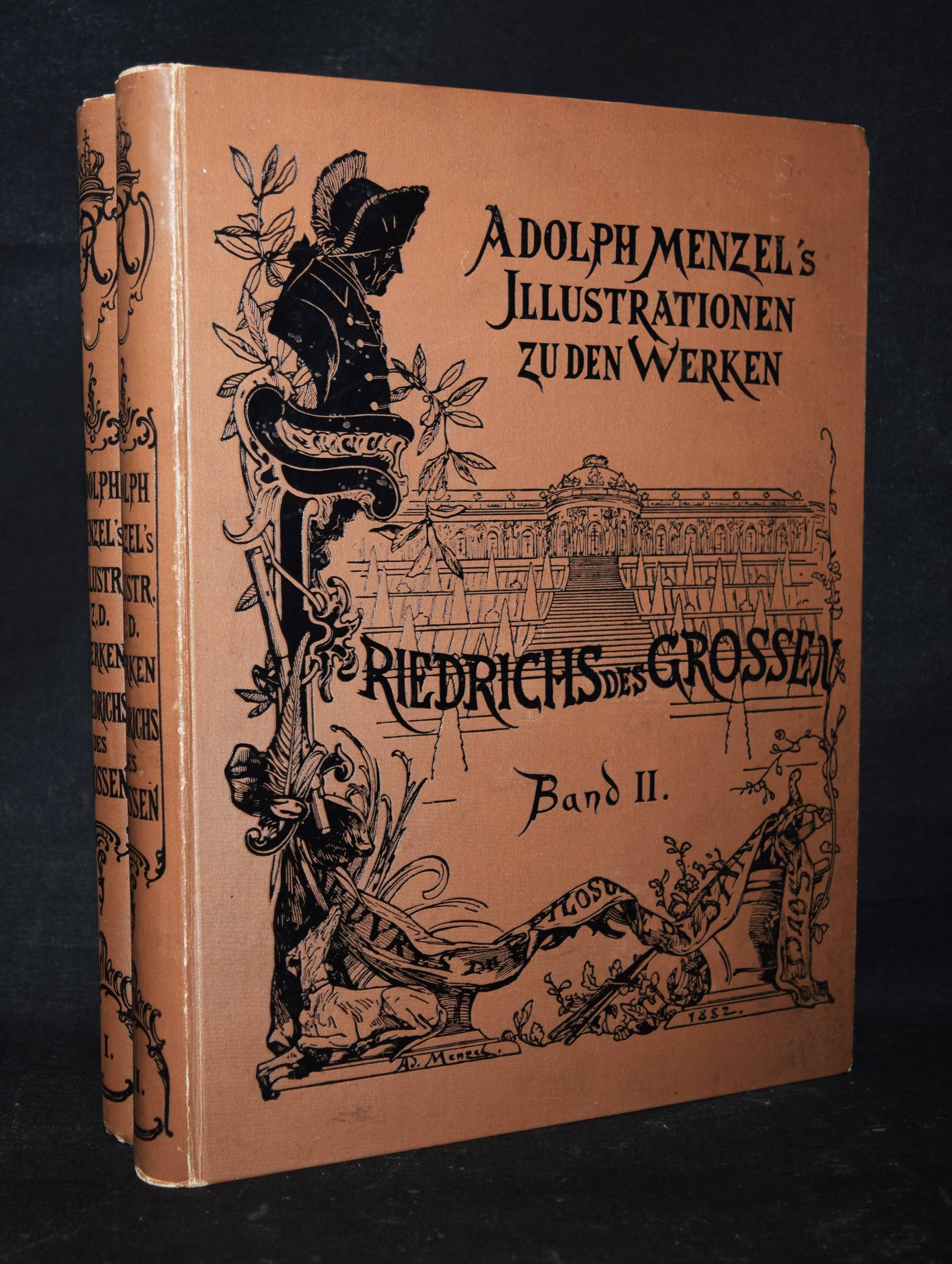 Menzel, Adolph. Illustrationen zu den Werken Friedrichs des Großen. In Holz geschnitten von O. Vogel, A. Vogel, Fr. Unzelmann u. H. Müller. 200 Blätter mit Text von L. Pietsch. Jubiläumsausgabe. 2 Bände. Berlin, Wagner 1886. 4°. 53 S. 1 Bl., 100 Bl. mit 100 Holzschnitt-Illustrationen; 49 S., 1 Bl. 101-199 Bl. mit 99 Holzschnitt-Illustrationen, 8 S. Register. Illustr. OLn. Einband minimal berieben, leicht stockfl., sonst sehr gut erhalten.