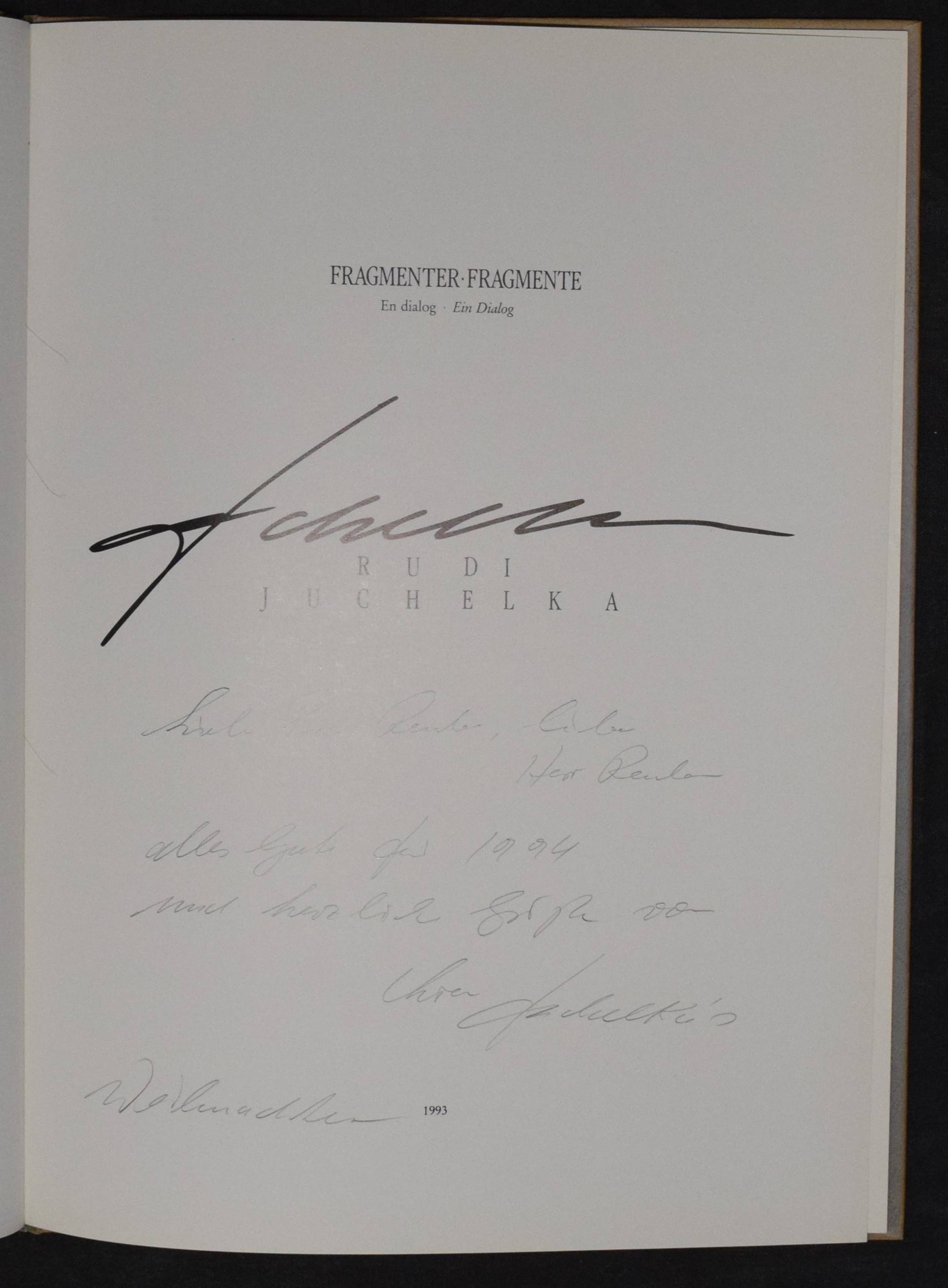Juchelka, Rudi. Fragmenter. En dialog. S. l., 1993. 4°. 30 S. mit zahlr. Abb. OPbd. Mit eigenhändiger Widmung von R. Juchelka auf dem Titel. – Sehr gutes Exemplar.