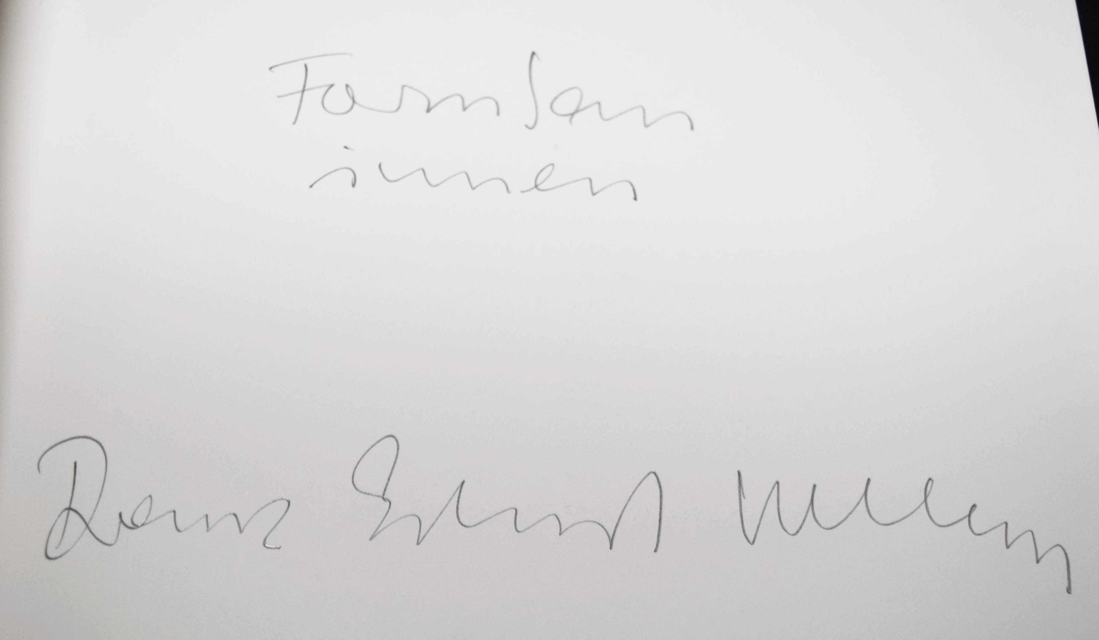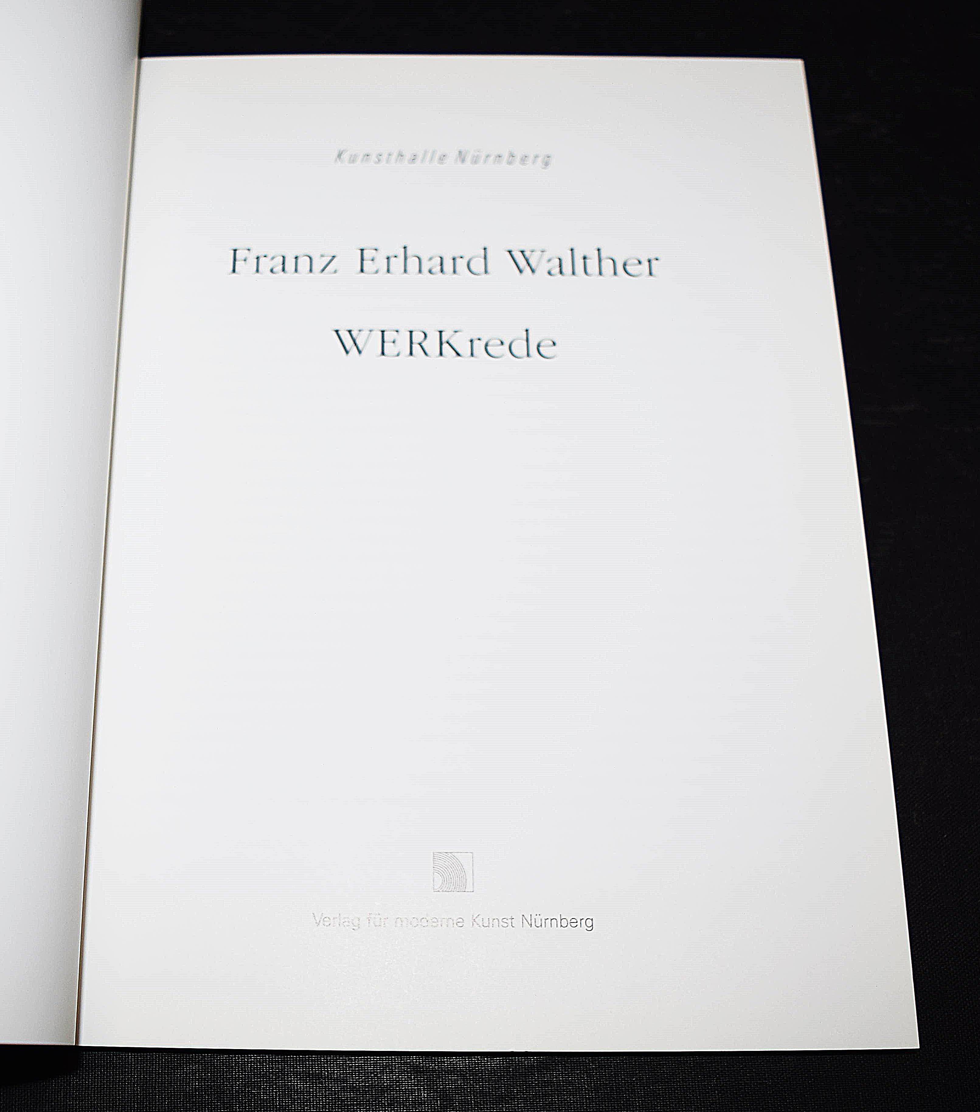 Walther, Franz Erhard. WERKrede. (Aus Anlaß der gleichnamigen Ausstellung vom 4. Juni – 23. August 1992). Nürnberg, Verlag für Moderne Kunst 1992. 4°. 72 S. mit überw. teils farb. Abb. Farbig illustr. OKart. Mit eigenhändiger Widmung von Franz Erhard Walther. – Sehr gutes Exemplar.