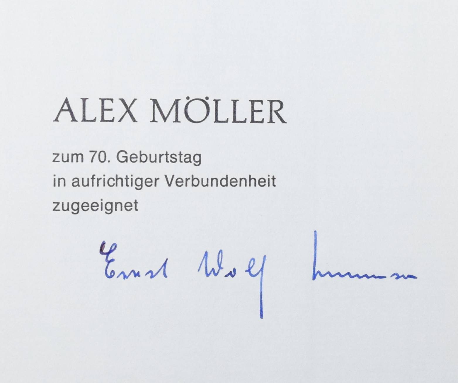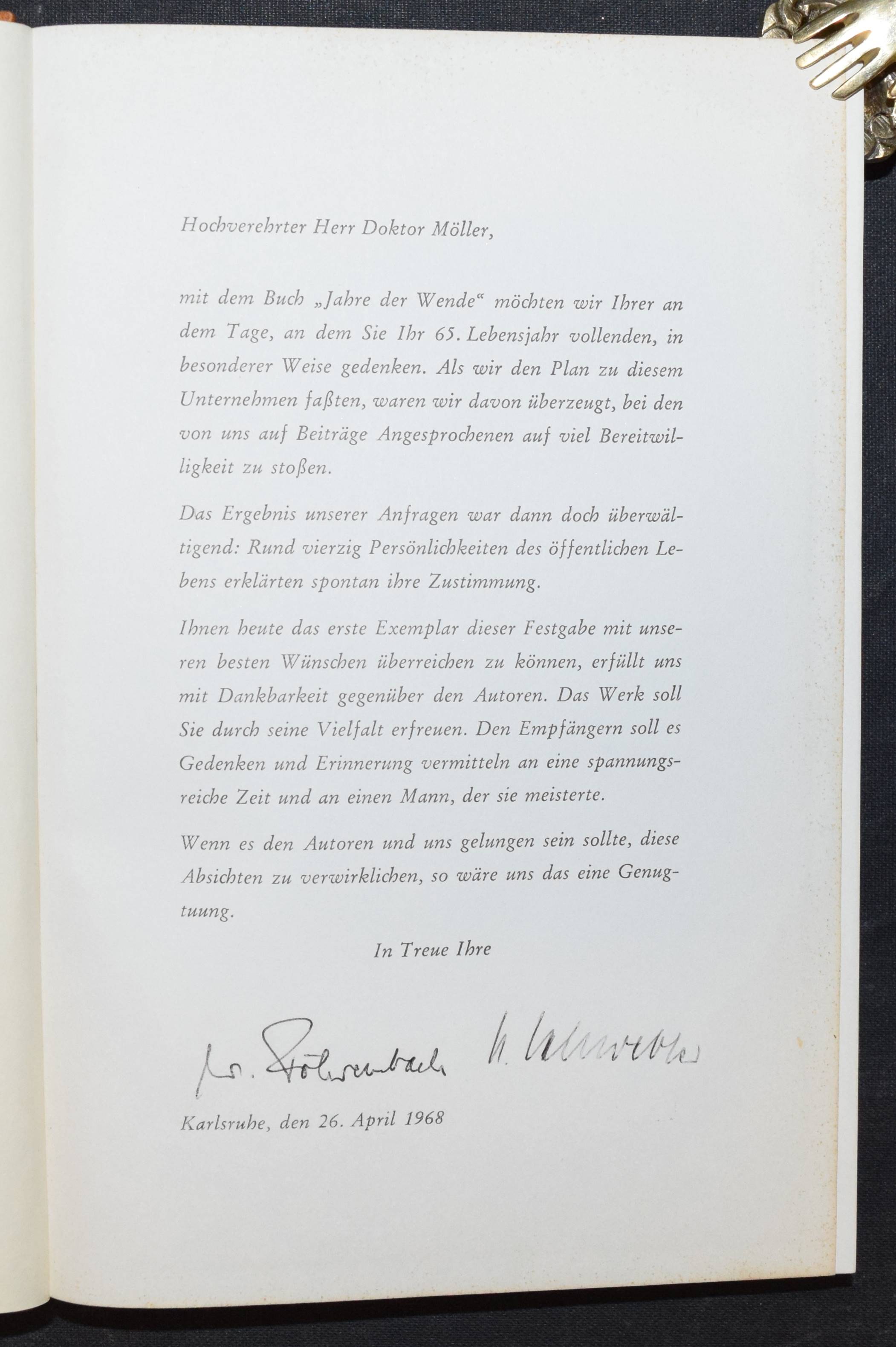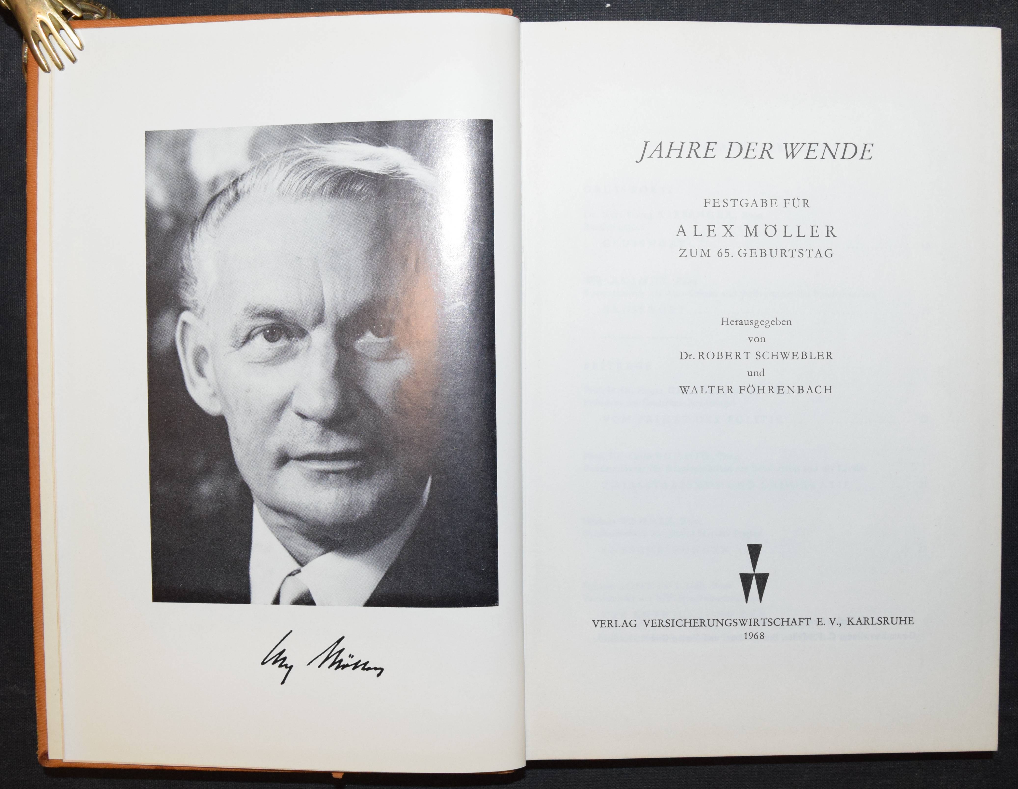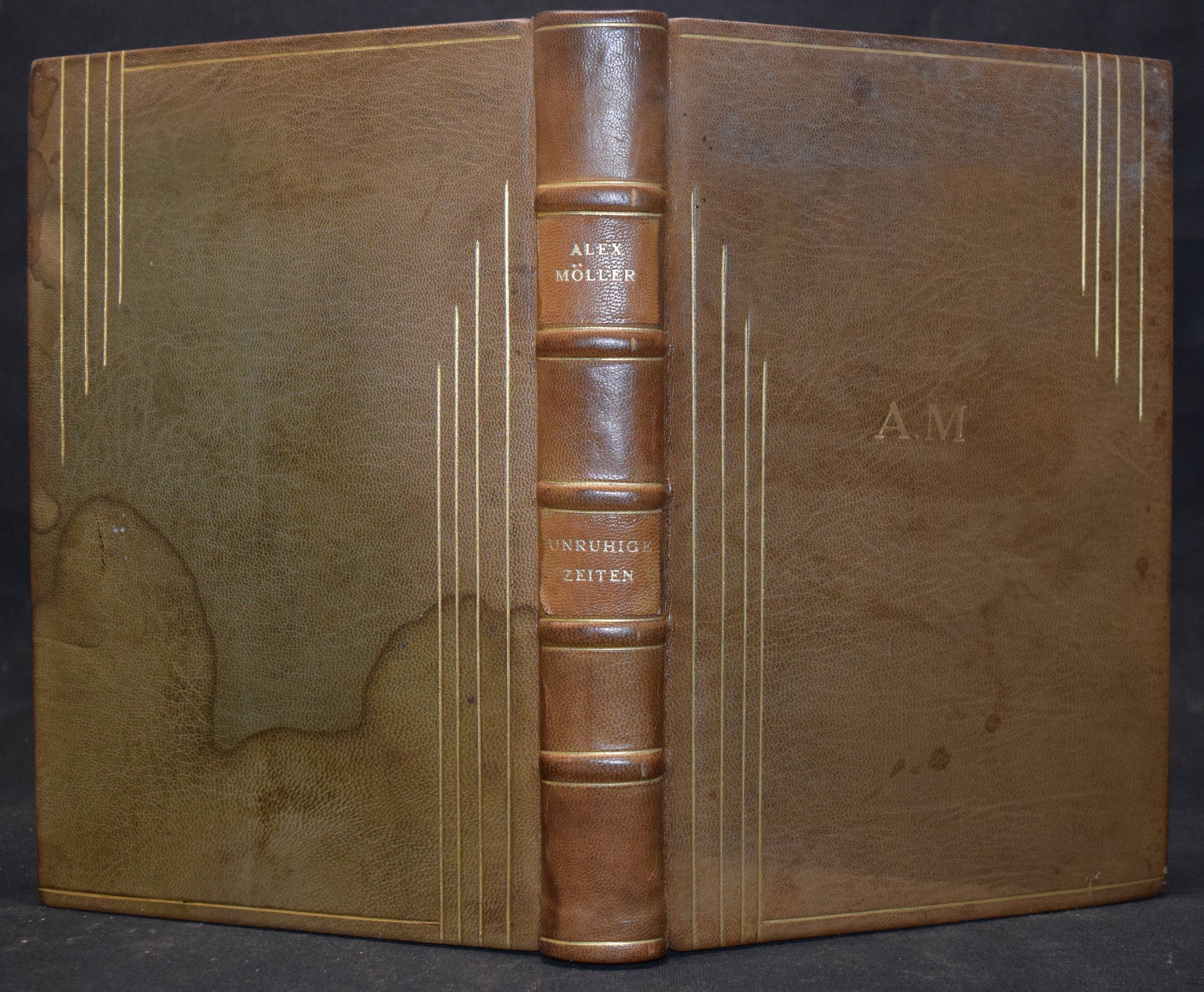 Möller, Alex(ander). Unruhige Zeiten. Reden und Aufsätze. Karlsruhe, C. F. Müller 1963. 8°. 339 S., 1 Bl. Hellbrauner Ganzledereinband d. Zt. mit 2 goldgepr. Rückensch., Linienverg., goldgepr. Deckelmonogramm u. Goldschnitt (sign. Meta Schwarz). Erste Ausgabe. – Sehr schönes Exemplar in einem Meistereinband aus der Bibliothek des Verfassers. – Dazu: Schwebler, Robert u. Walter Föhrenbach (Hrsg.). Jahre der Wende. Festgabe für Alex Möller zum 65. Geburtstag. Karlsruhe, Verlag Versicherungswirtschaft 1968. 297 S. mit 1 Porträt. Ldr. d. Zt. mit goldgepr. Rücken- u. Deckeltitel, sowie Kopfgoldschnitt. – Dazu: Alex Möller. Unternehmer und Politiker. Alex Möller zum 70. Geburtstag in aufrichtiger Verbundenheit zugeeignet Ernst Wolf Mommsen. (Karlsruhe, Selbstverlag 1973). 4°. 32 S. Ldr. d. Zt. mit goldgepr. Deckeltitel. Von E. W. Mommsen signiert. – Alex Möller (1903-1985) „1919-1923 Tätigkeit als Bahnangestellter und nebenberuflicher Redakteur des „Dortmunder Tageblatts“, 1922 Eintritt in die SPD, 1928 Mitglied des Preußischen Landtags, nach 1933 Tätigkeit als Versicherungsvertreter für die Wiener Lebensversicherungsgesellschaft Phoenix, ab 1936 für die Karlsruher Lebensversicherungs AG, dort 1943 Prokurist und Abteilungsleiter und 1944 stellvertretendes Vorstandsmitglied, 1945-1969 Vorsitzender des Vorstands, 1946-1969 MdL Württemberg-Baden bzw. ab 1952 Baden-Württemberg (SPD), 1950-1961 Fraktionsvorsitzender, 1961-1976 MdB, dort 1964-1969 und 1972-1976 stellvertretender Fraktionsvorsitzender, 1962-1966 Landesvorsitzender der SPD in Baden-Württemberg, 1969-1971 Bundesminister der Finanzen, 1973-1979 Vorsitzender der Kontrollkommission der SPD“ (Bundesgeneralarchiv).