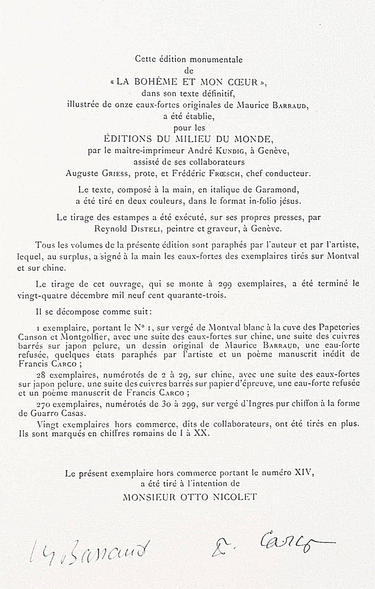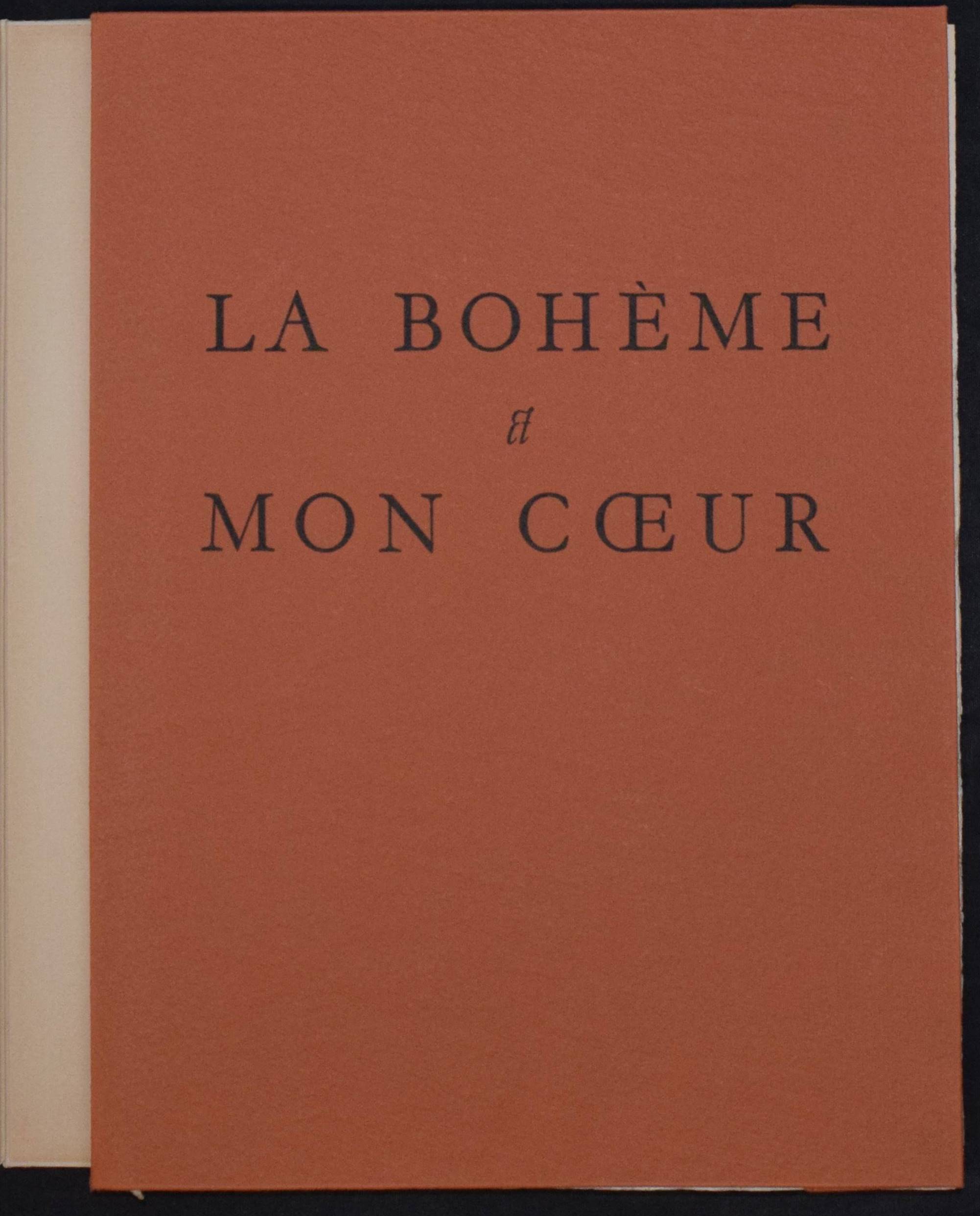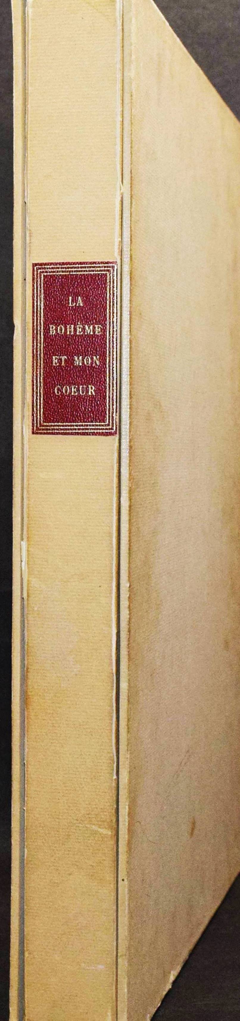 Carco, Francis. La Bohème et mon coeur. Poèmes. Eaux-Fortes de Maurice Barraud. Genf, Kundig o. J. (1943). Folio. 187 p., avec 11 eaux-fortes originales. OKart. (Chemise) mit OU. u. Pappumschlag mit goldgepr. Rückensch. in Orig.-Pappschuber. Cailler/Darel 235-246. Monod 2269. – Nr. XIV von XX Exemplaren „hors commerce“ (GA 270 Ex.). Im Druckvermerk von F. Carco und M. Barraud signiert. – Mit hervorragenden Radierungen des „schweiz. Matisse“ (François Fosca) M. Baurraud (Genf 1889-1954). – Rücken des Pappumschlags gebräunt, Pappschuber etwas fleckig und mit Gebrauchsspuren, sonst sehr gutes sauberes Exemplar.