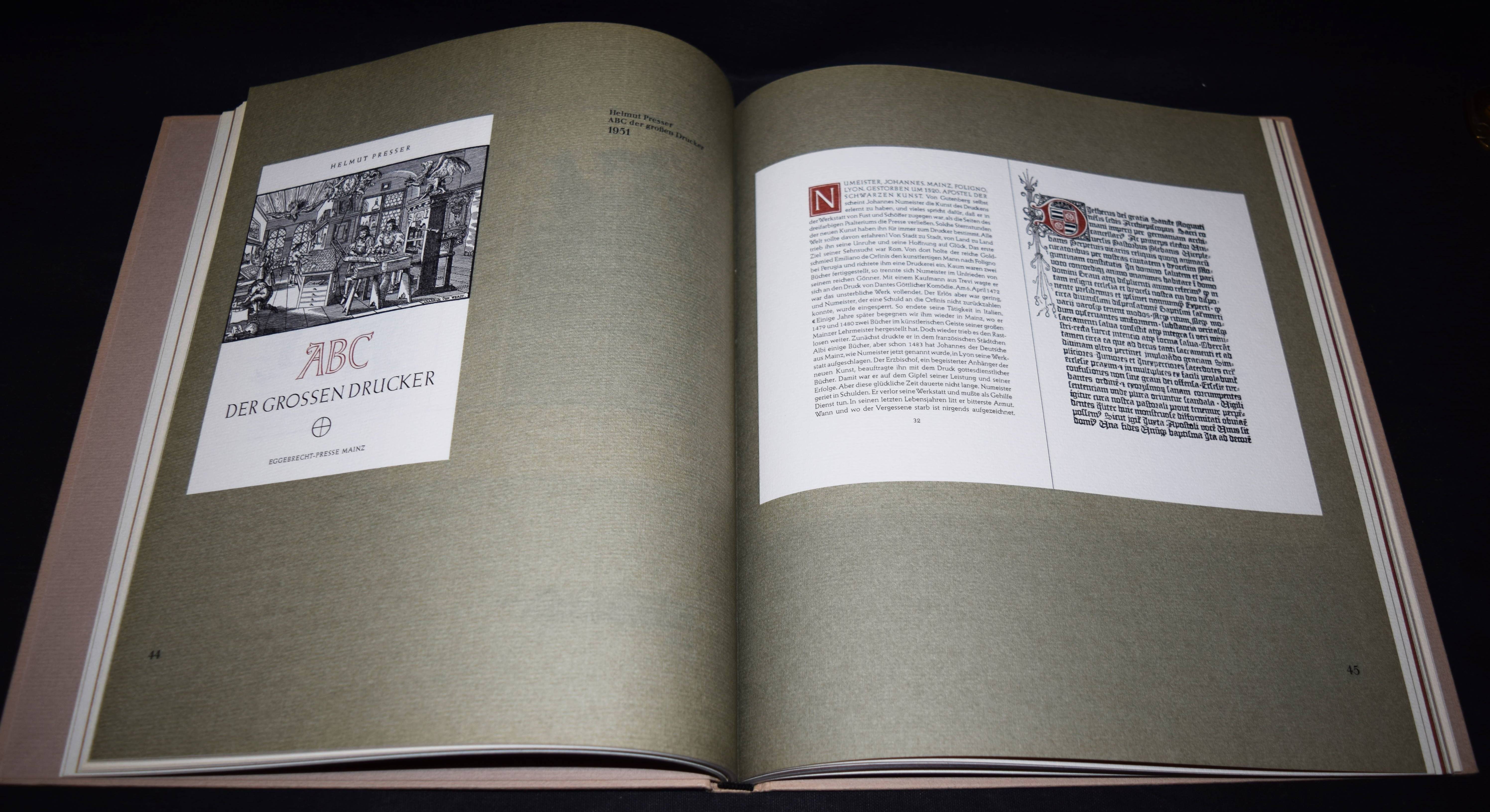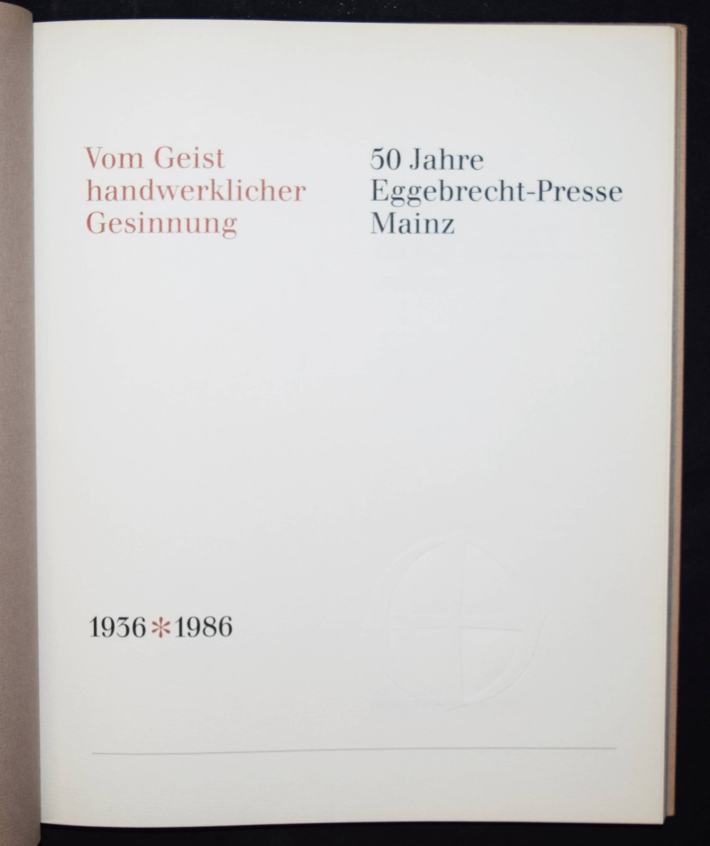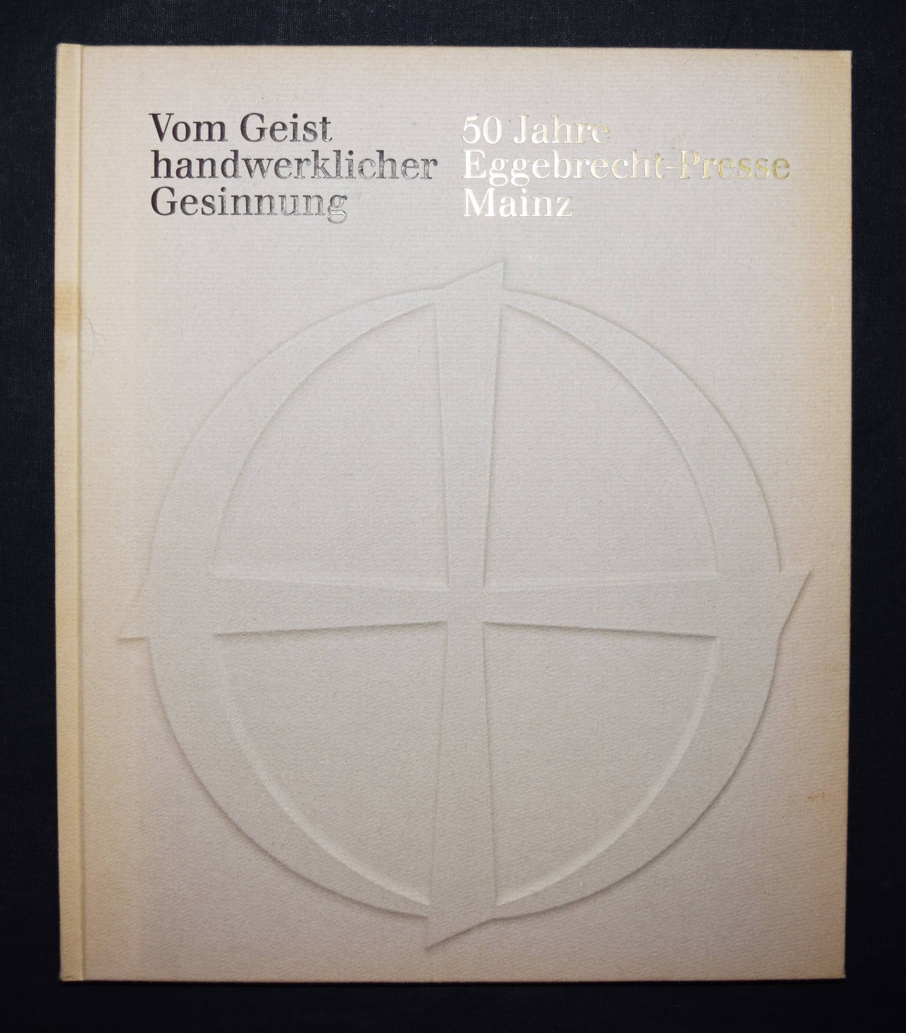 Halbey, Hans Adolf. Vom Geist handwerklicher Gesinnung. 50 Jahre Eggebrecht-Presse Mainz. 1936 – 1986. Mainz, Eggebrecht-Presse 1987. 4°. 31 S. zahlr. teils farb. Abb. OPbd. Eines von 500 Exemplare. – Sehr gutes Exemplar.