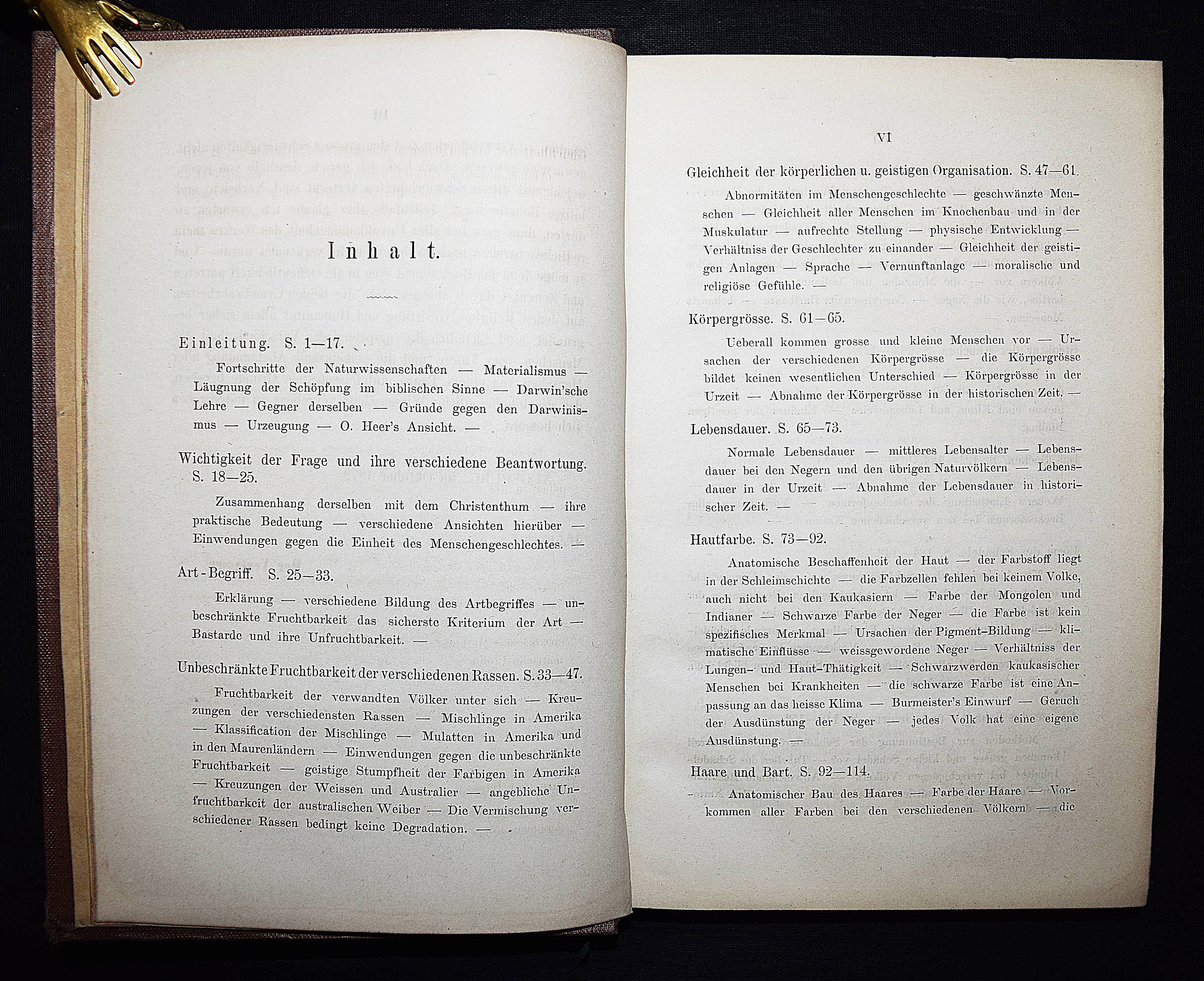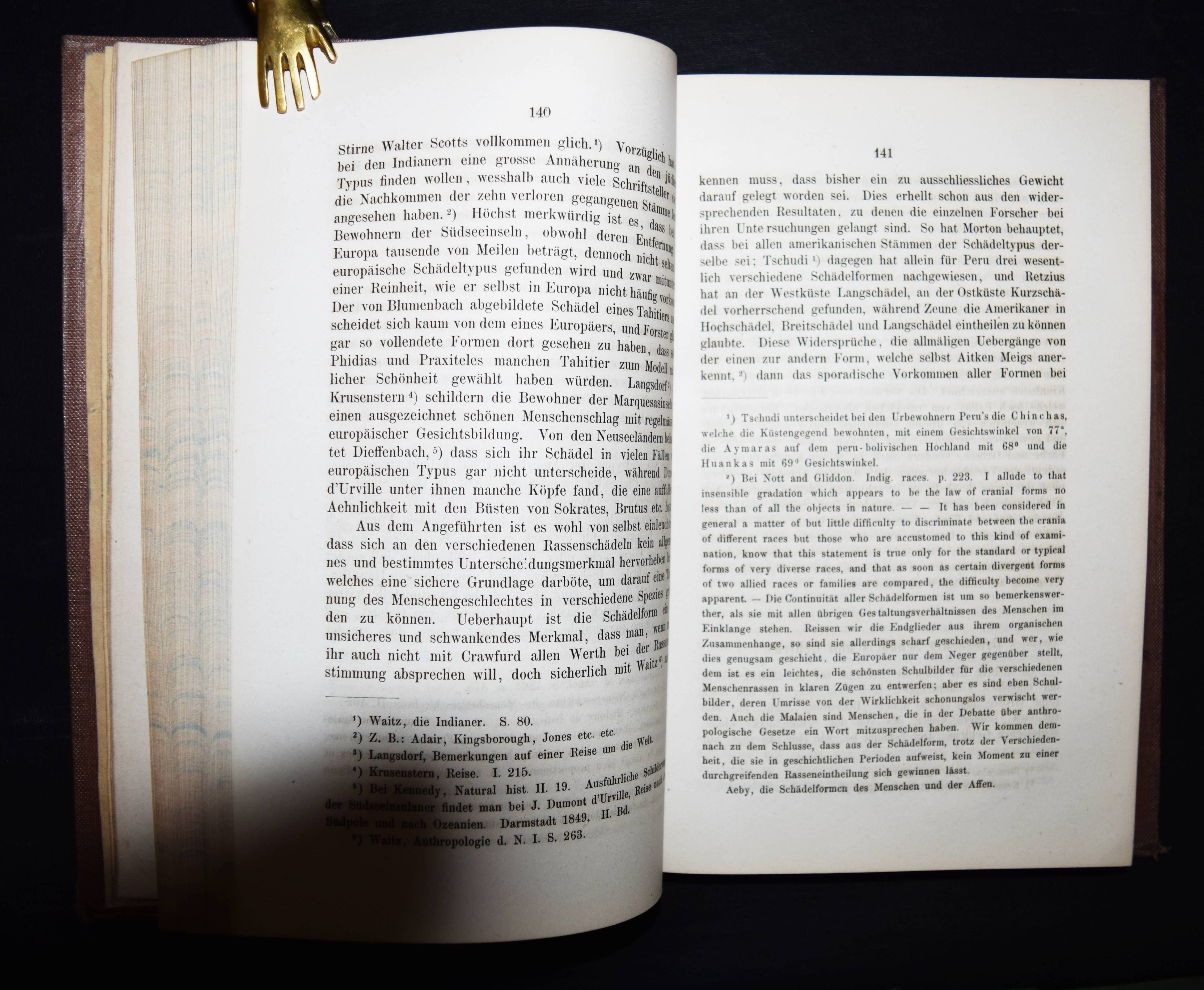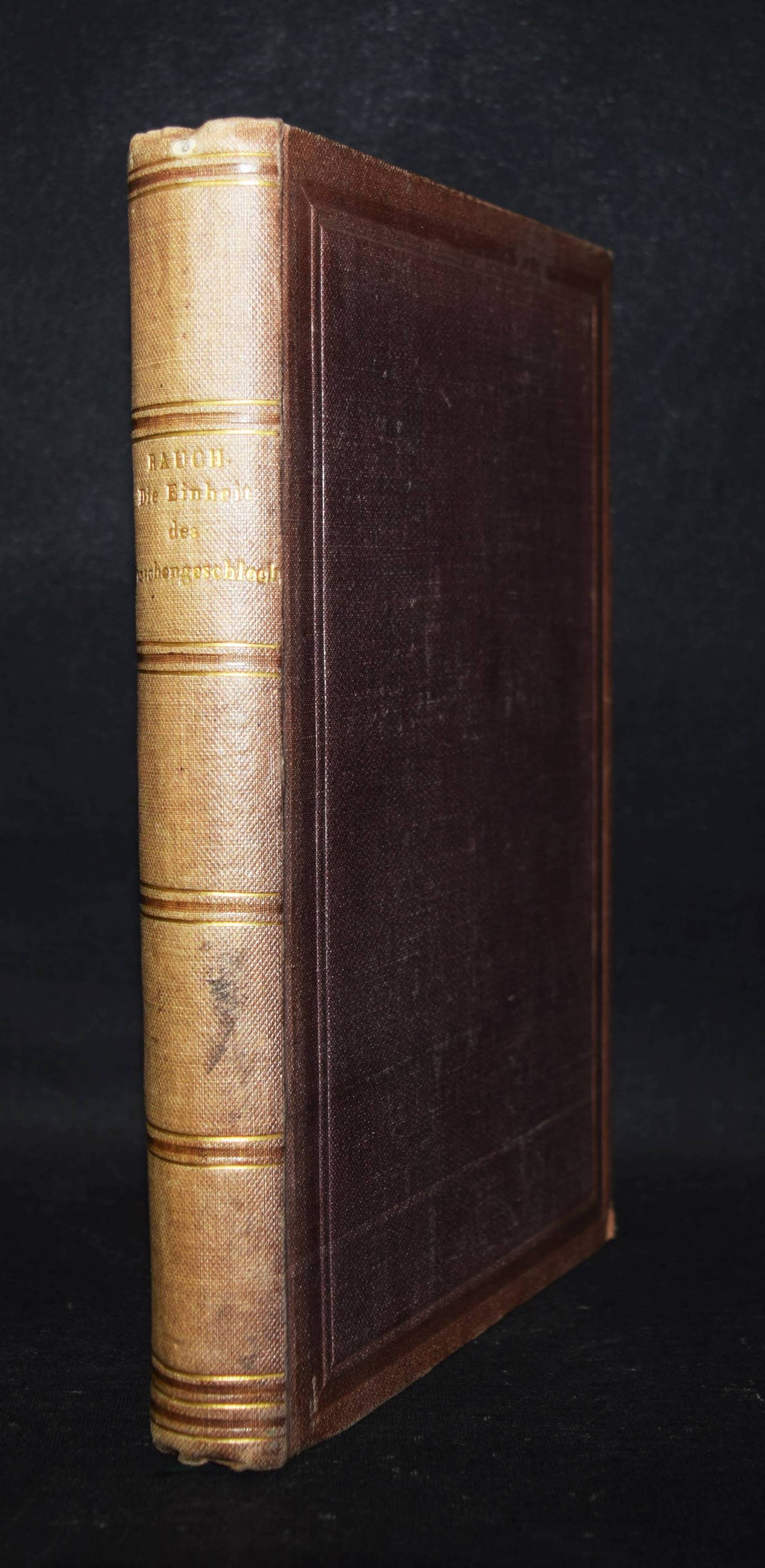 Rauch, Matthäus. Die Einheit des Menschengeschlechtes. Anthropologische Studien. Augsburg, F. Butsch Sohn 1873. Gr.-8°. XI, 428 S. mit 1 lithogr. Tafel. OLn. mit goldgepr. Rückentitel u. Linienverg. ADB XXVII, 391. – Erste Ausgabe. – Der Anthropologe M. Rauch (1814-1876) war Professor in Augsburg, „Seine „Anthropologischen Studien“ fanden Beifall und Anerkennung bei den Fachmännern“ (L. Hörmann von Hörbach in ADB). – Rücken etwas aufgehellt, sonst sehr gut erhalten.