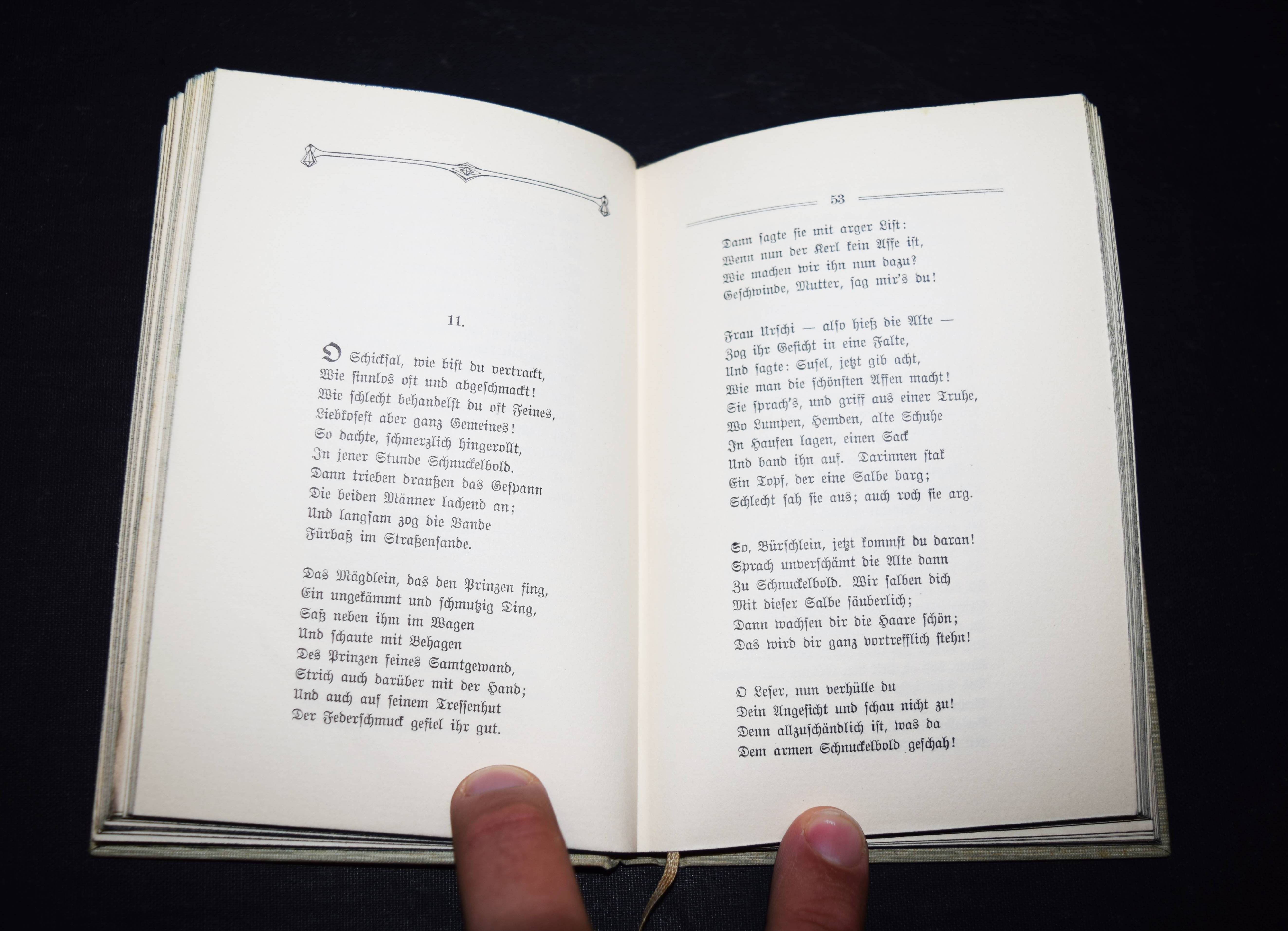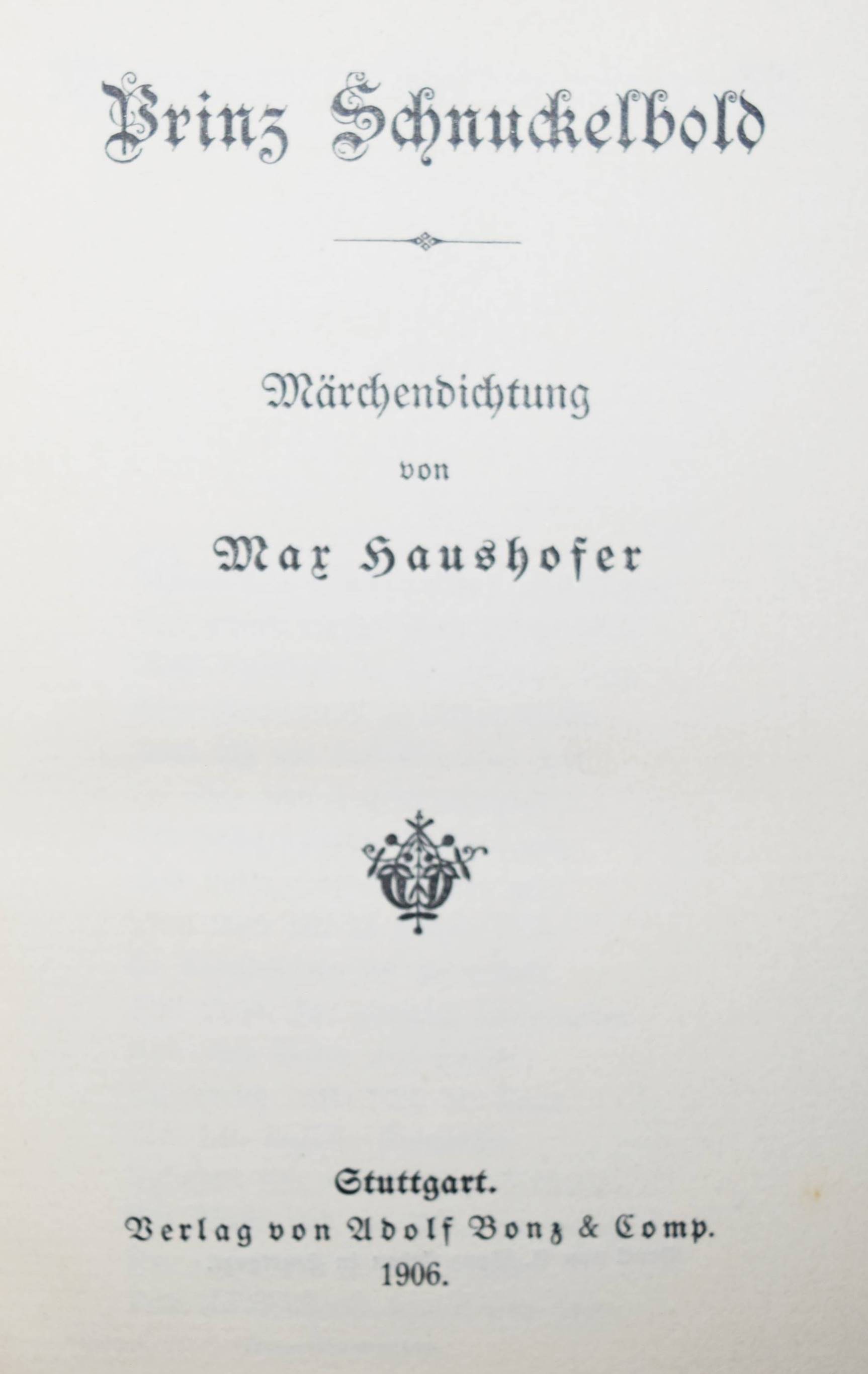 Haushofer (Jr.), Max. Prinz Schnuckelbold. Märchendichtung. Stuttgart, Adolf Bonz & Comp. 1906. Kl.-8°. 168 S. OLn. mit goldgepr. Rücken- u. Deckeltitel. (Allerhand Blätter). Selten. – Max Haushofer Jr. (1840-1907) war ein deutscher Nationalökonom, Politiker und Schriftsteller. Er war der Sohn des Landschaftsmalers Max Haushofer (1811-1866) und der Vater des bedeutenden Geographen und Theoretiker der Geopolitik, Karl Haushofer (1869-1946). – Sehr gutes Exemplar.