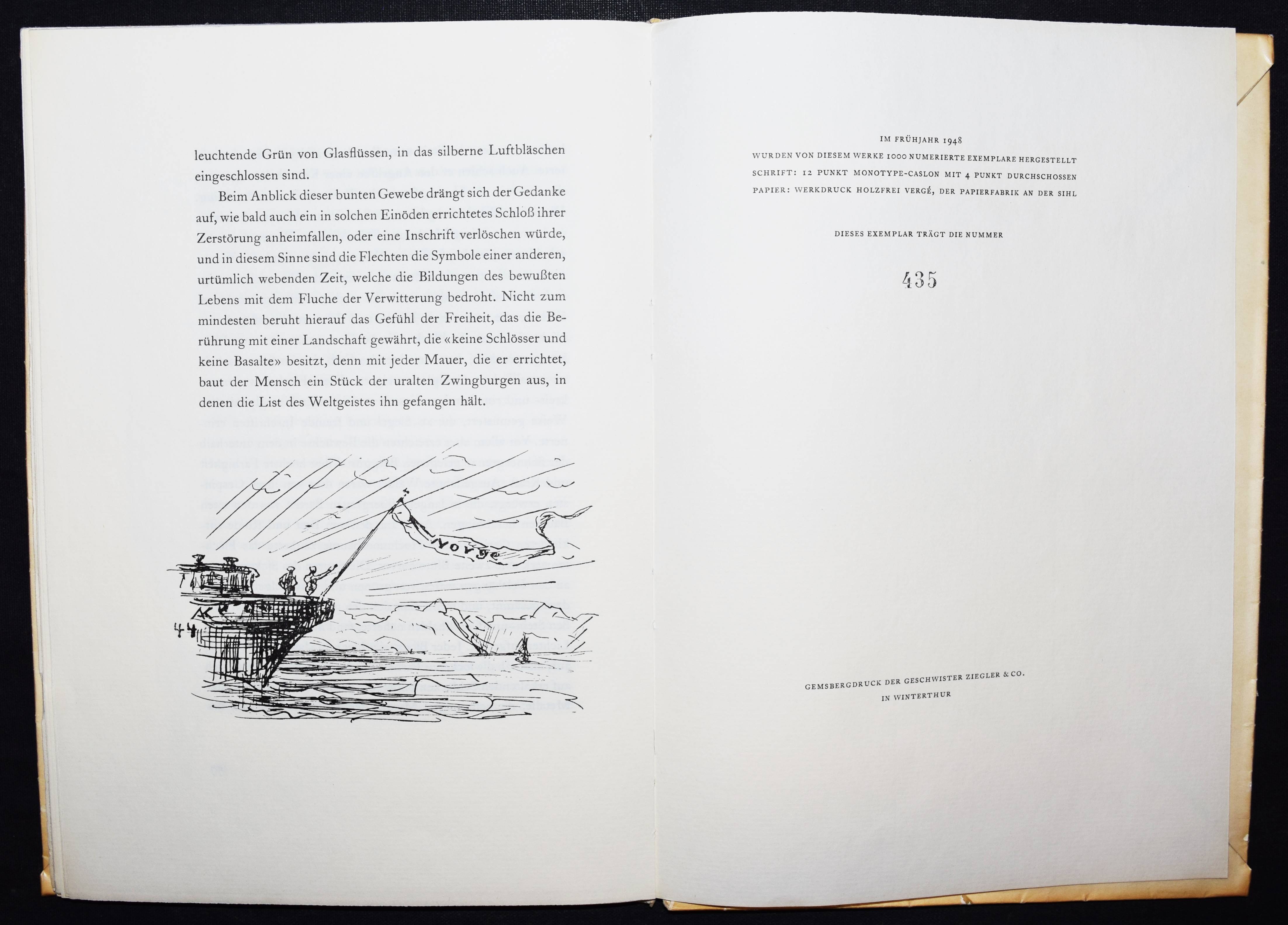Jünger, Ernst. Myrdun. Briefe aus Norwegen. Mit Zeichnungen von Alfred Kubin. Zürich, Verlag der Arche (1948). 4°. 77 S. mit 14 Illustrationen von Alfred Kubin. OKart. mit Japanpapier-Schutzumschlag. (Argonauten-Drucke der Arche). Des Courdes/Mühleisen B 14 b. Raabe 672. – Erste Ausgabe mit diesen Illustrationen. – Eines von 1000 num. Exemplaren. – Umschlag altersbedingt gebräunt, gutes Exemplar.