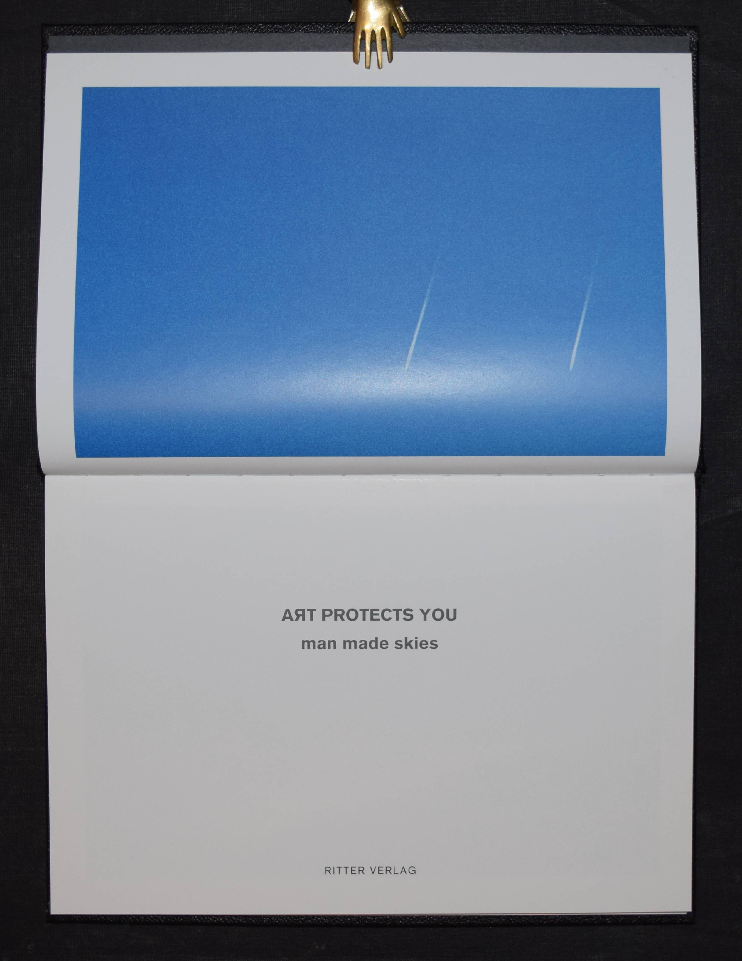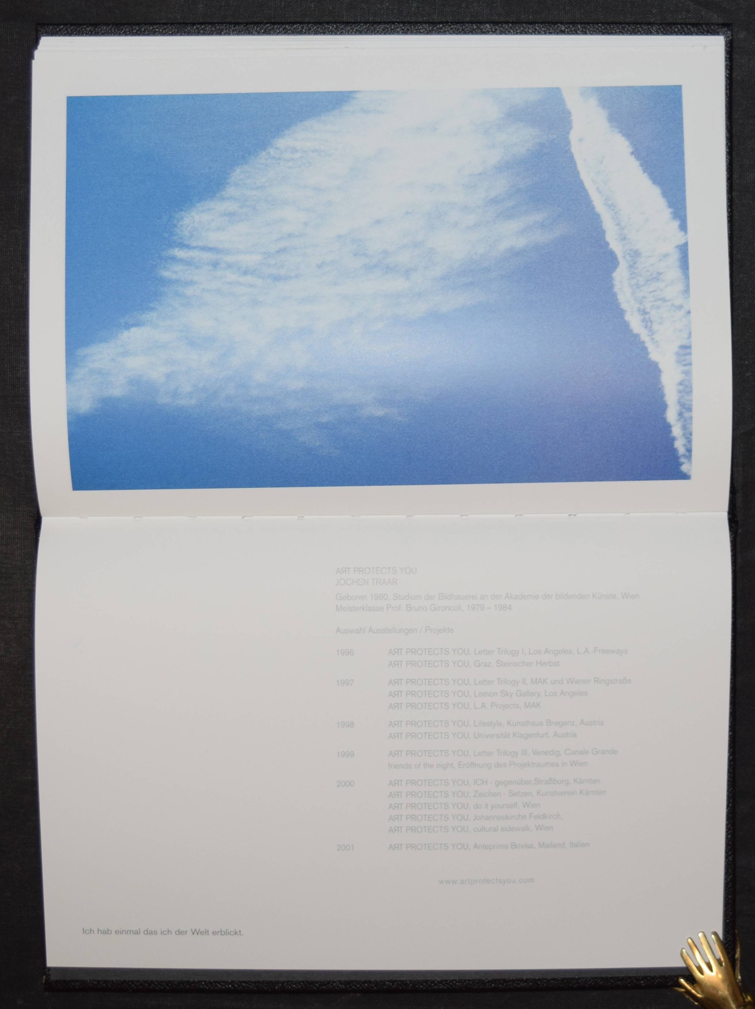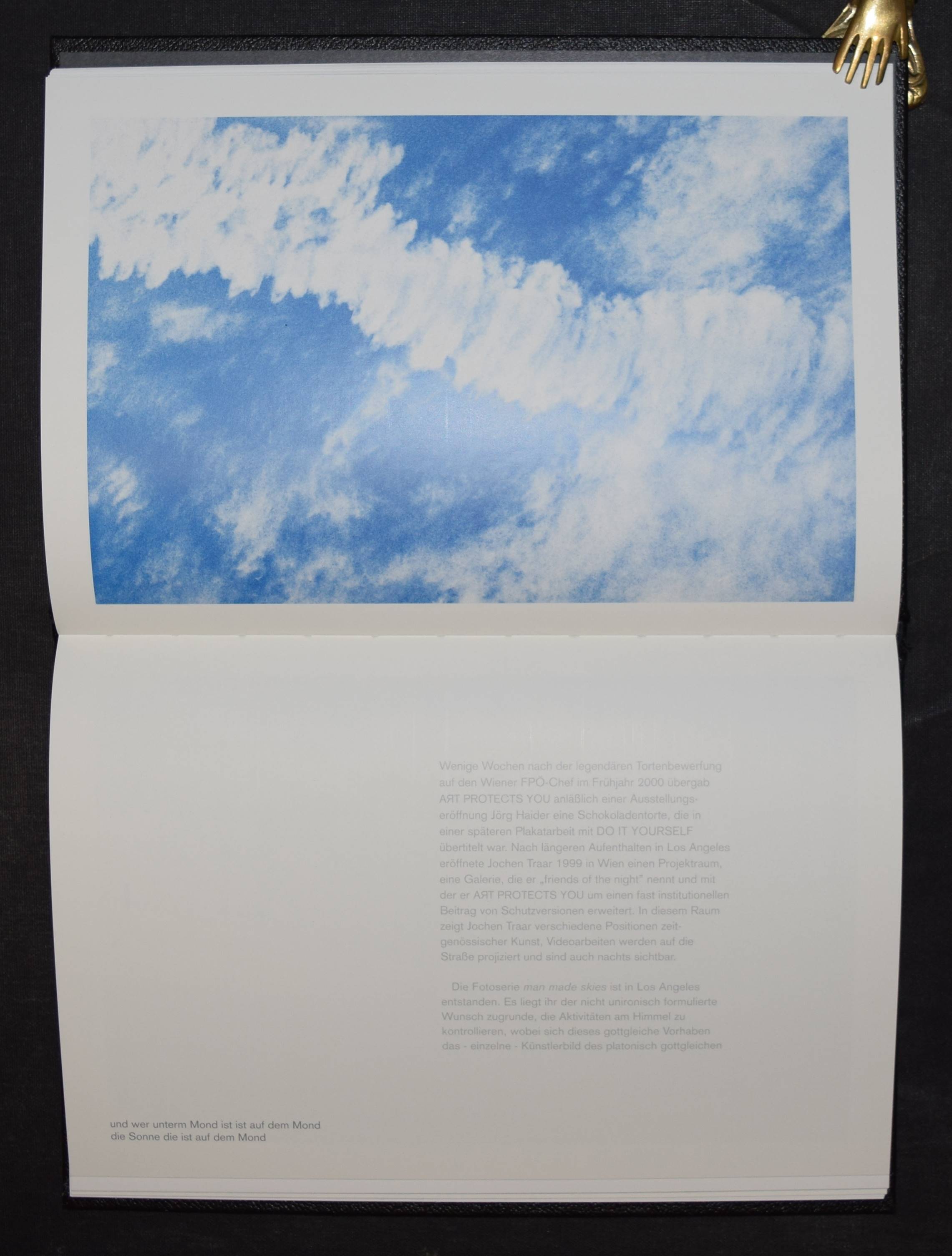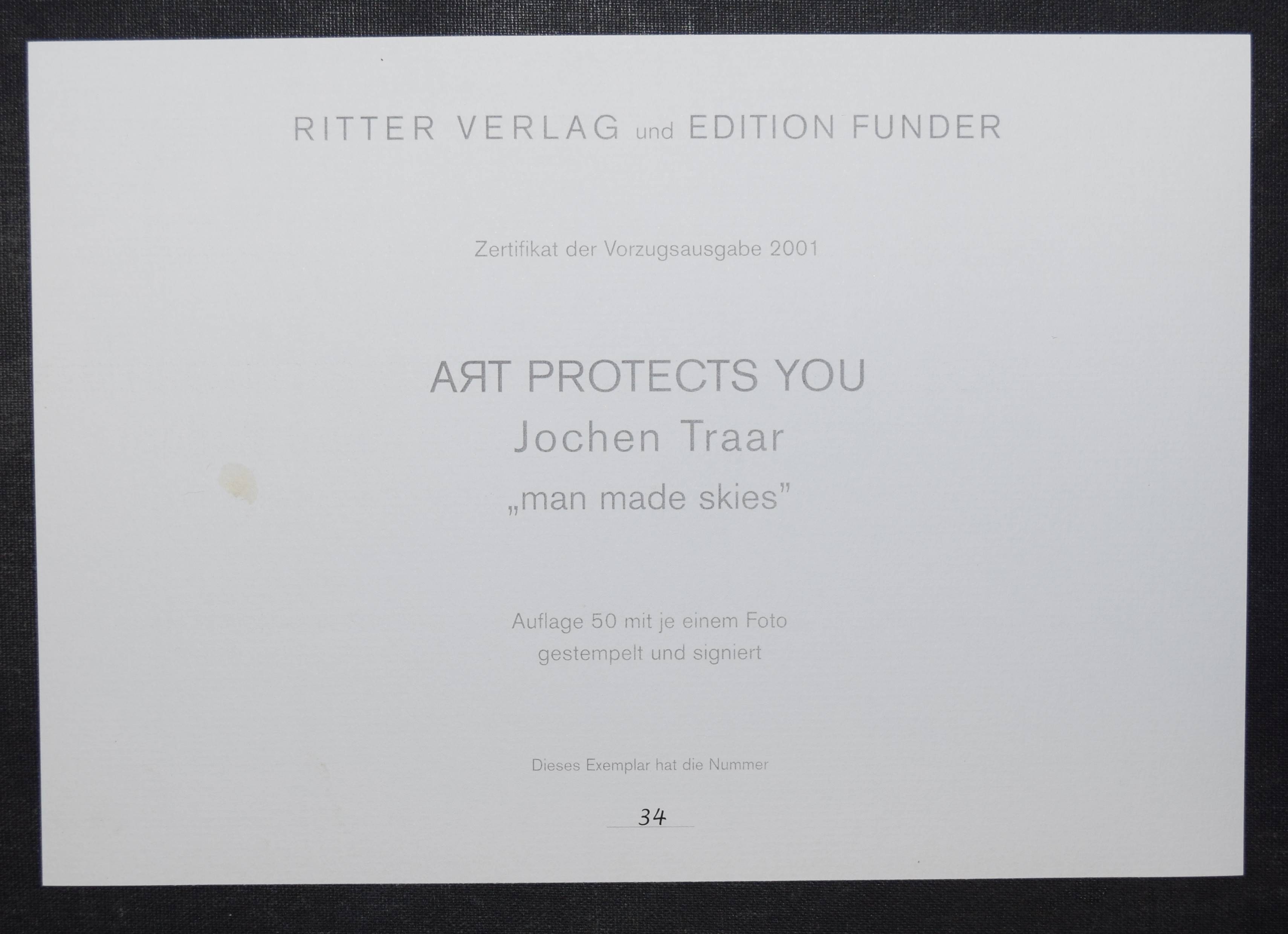 Traar, Jochen. Art protects you – man made skies. Klagenfurt, Wien, Ritter u. Edition Funder 2001. Quer-8°. [38] Bl. mit 37 ganzs. farb. Abb. u. 1 gestempelten u. signierten Orig.-Farbphotographie. OLdr. mit blindgepr. Deckeltitel in Orig.-Leinenkassette mit blindgepr. Deckeltitel. Nr. 34 von 50 num. Exemplaren der Vorzugsausgabe mit signierter Orig.-Farbphotographie. – Jochen Traar, geboren 1960 in Essen. Studium 1979-1984 an der Akademie der bildenden Künste Wien bei Prof. Bruno Gironcoli, lebt in Wien. Gruppenausstellungen: u.a. Australian Cultural Institute New York; Director’s Guide Los Angeles; Mulinex, Wiener Secession 1992. Stipendien: u.a. Artist in residence biem Schindler Stipendiatenprogramm in LA 1995, Artist in residence bei UMAS, Durham, Ontario, Canada 1993; Auslandsstipendium des BMUK in Rom. – Tadellos.