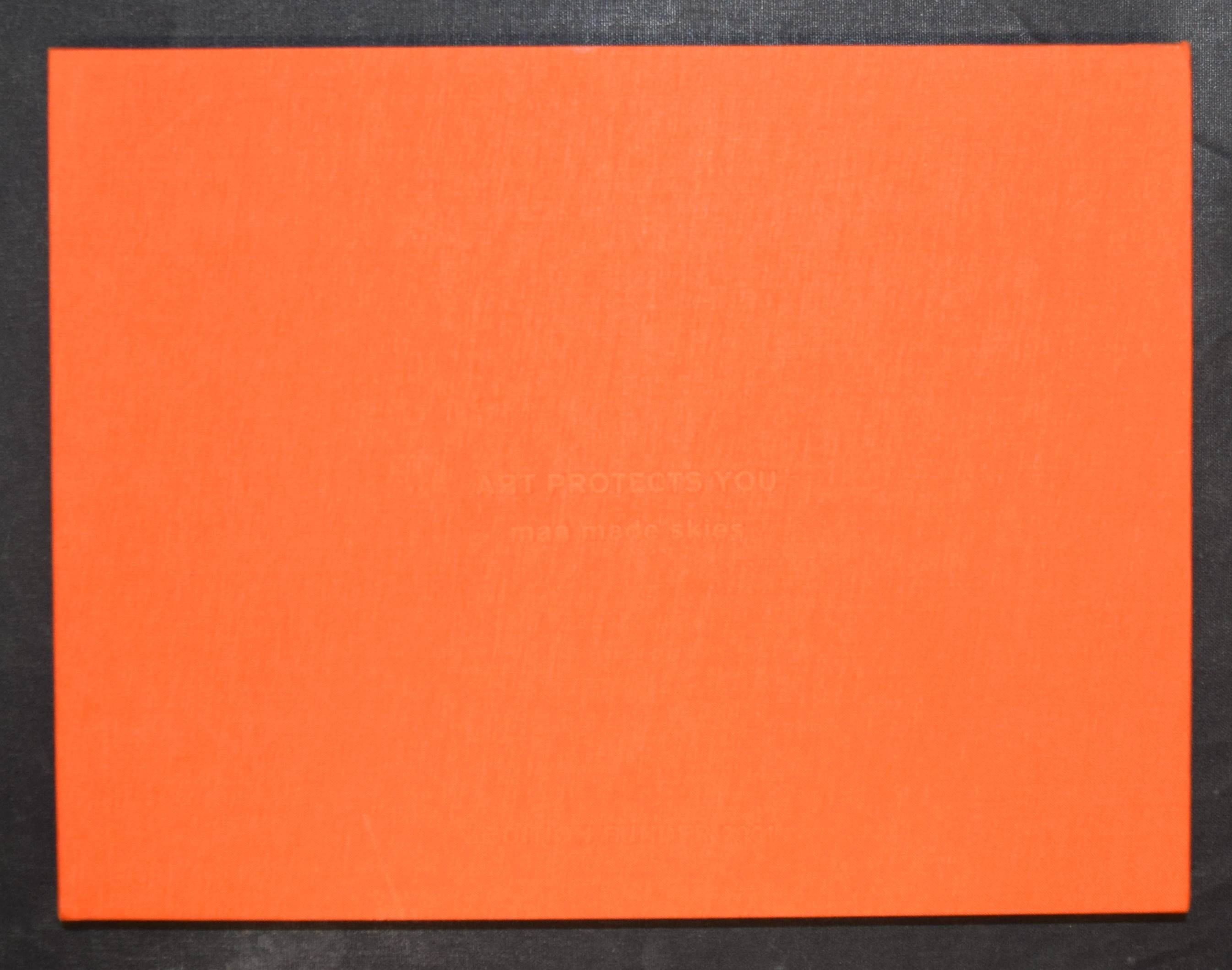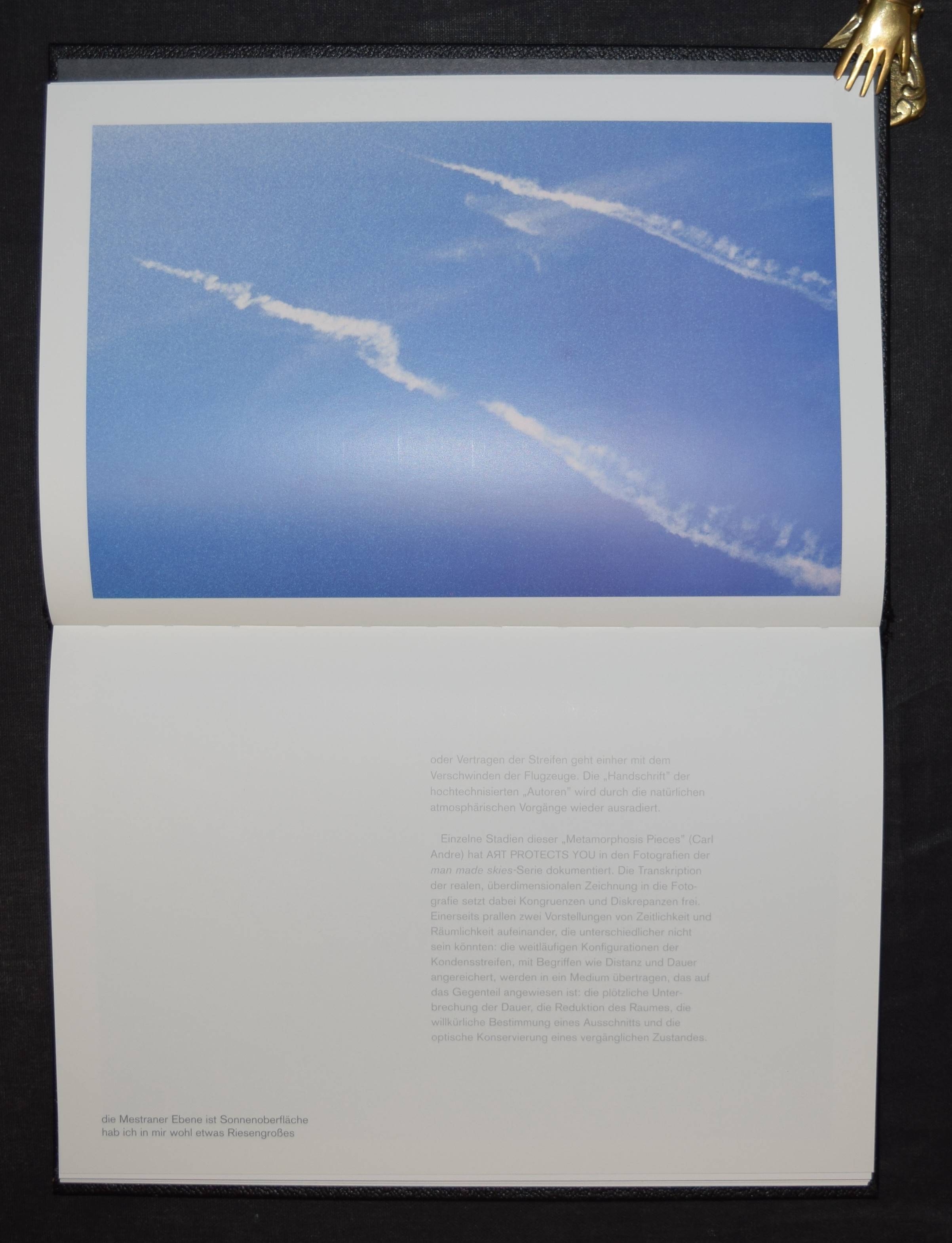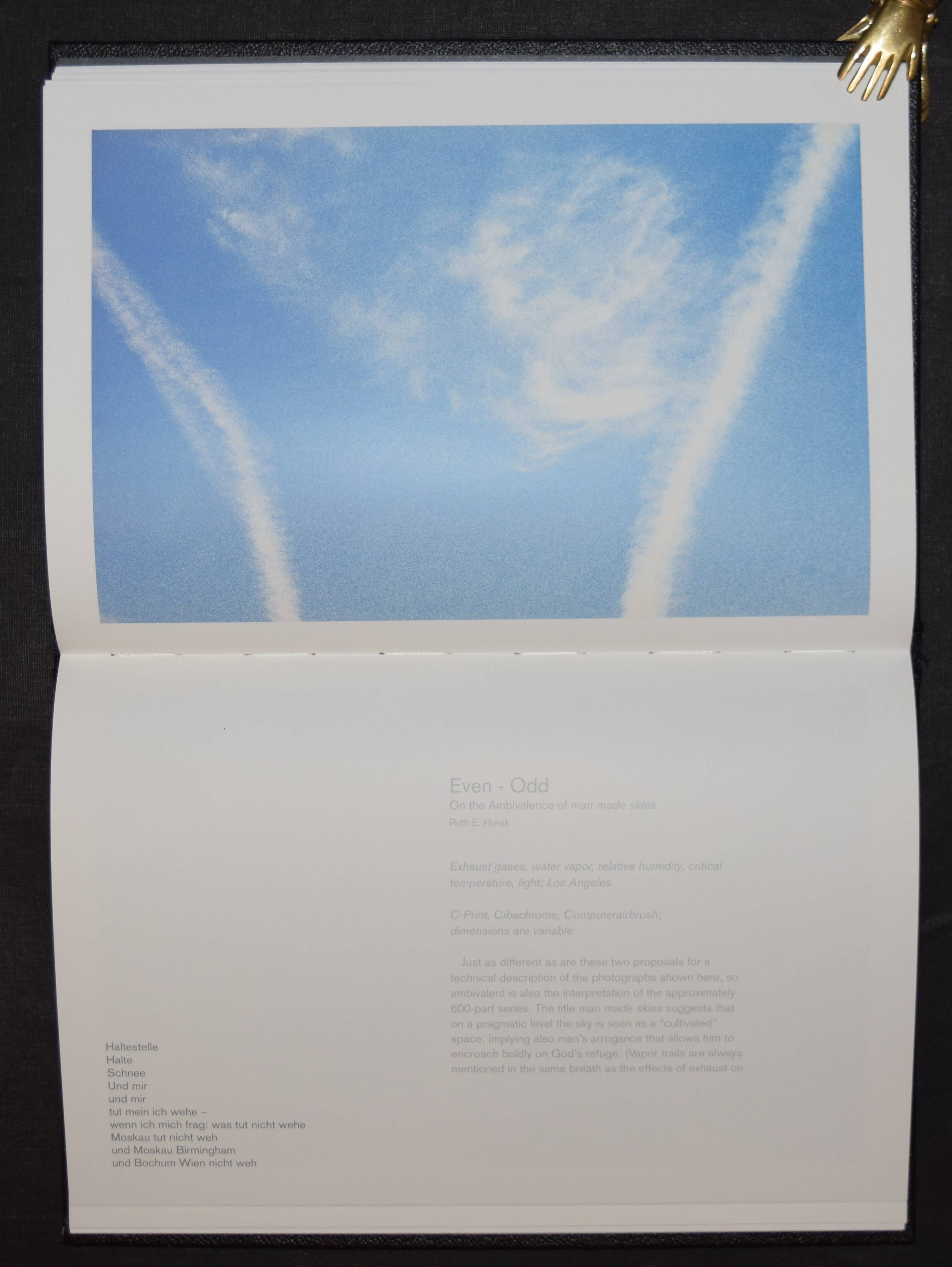 Traar, Jochen. Art protects you – man made skies. Klagenfurt, Wien, Ritter u. Edition Funder 2001. Quer-8°. [38] Bl. mit 37 ganzs. farb. Abb. u. 1 gestempelten u. signierten Orig.-Farbphotographie. OLdr. mit blindgepr. Deckeltitel in Orig.-Leinenkassette mit blindgepr. Deckeltitel. Nr. 34 von 50 num. Exemplaren der Vorzugsausgabe mit signierter Orig.-Farbphotographie. – Jochen Traar, geboren 1960 in Essen. Studium 1979-1984 an der Akademie der bildenden Künste Wien bei Prof. Bruno Gironcoli, lebt in Wien. Gruppenausstellungen: u.a. Australian Cultural Institute New York; Director’s Guide Los Angeles; Mulinex, Wiener Secession 1992. Stipendien: u.a. Artist in residence biem Schindler Stipendiatenprogramm in LA 1995, Artist in residence bei UMAS, Durham, Ontario, Canada 1993; Auslandsstipendium des BMUK in Rom. – Tadellos.