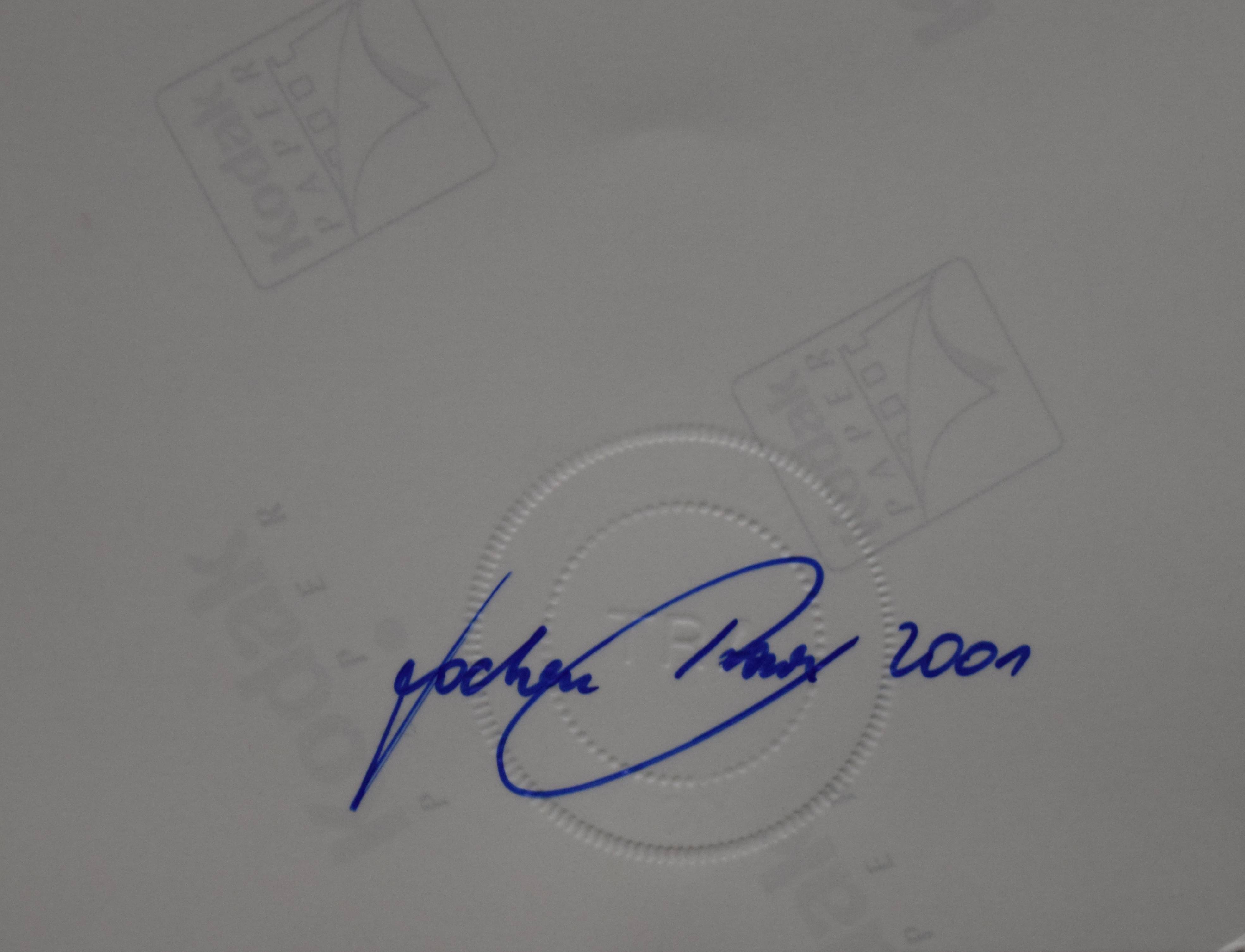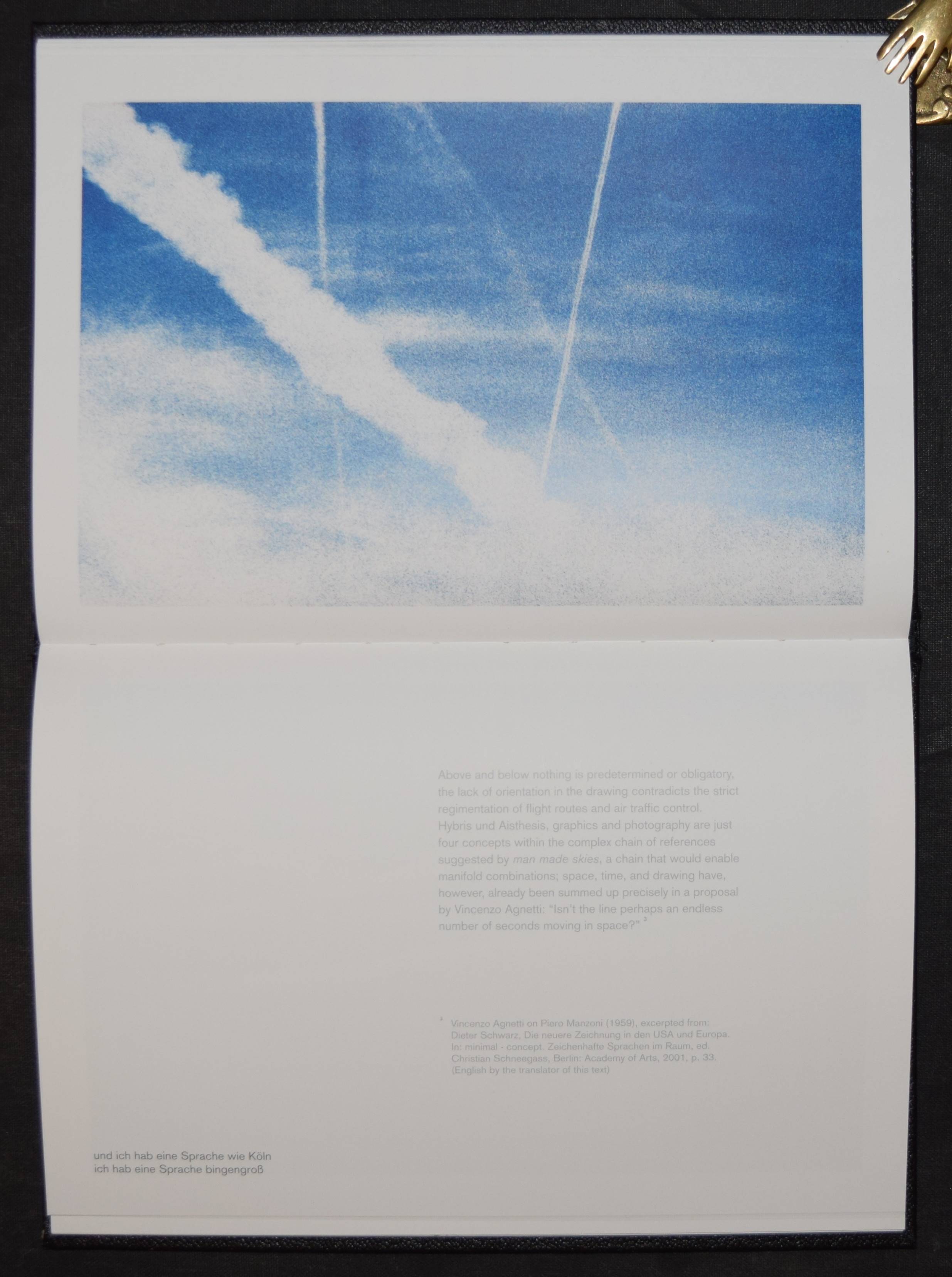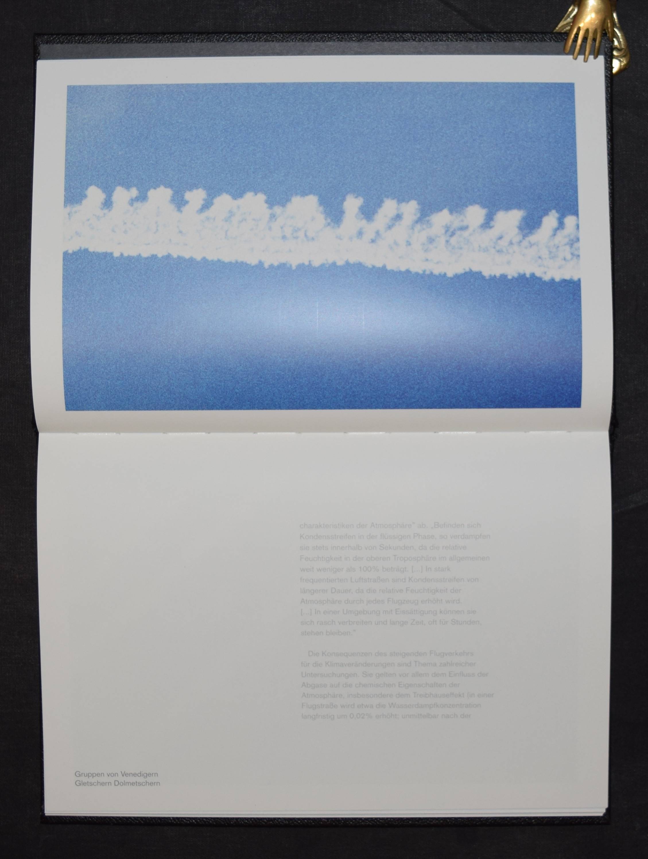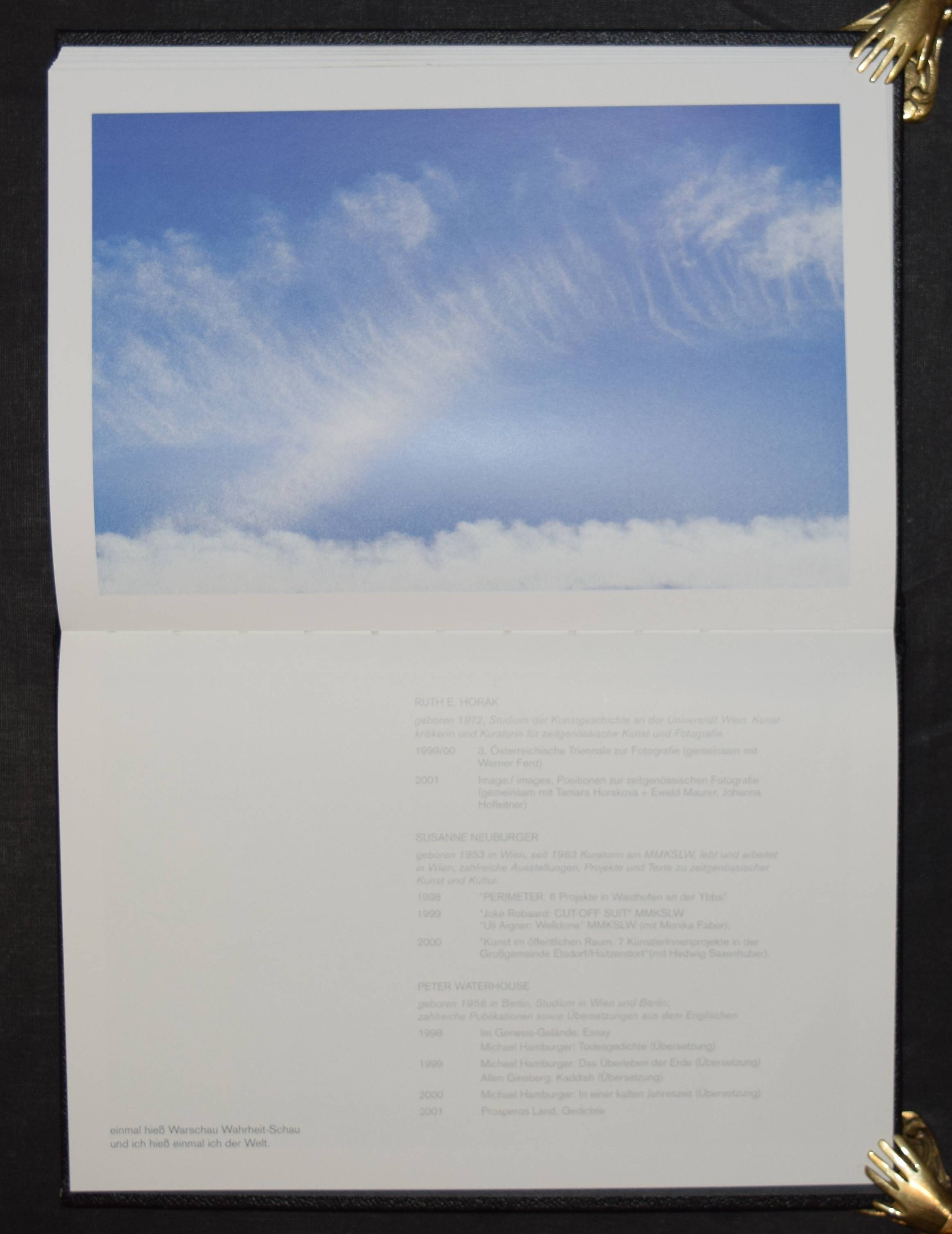 Traar, Jochen. Art protects you – man made skies. Klagenfurt, Wien, Ritter u. Edition Funder 2001. Quer-8°. [38] Bl. mit 37 ganzs. farb. Abb. u. 1 gestempelten u. signierten Orig.-Farbphotographie. OLdr. mit blindgepr. Deckeltitel in Orig.-Leinenkassette mit blindgepr. Deckeltitel. Nr. 34 von 50 num. Exemplaren der Vorzugsausgabe mit signierter Orig.-Farbphotographie. – Jochen Traar, geboren 1960 in Essen. Studium 1979-1984 an der Akademie der bildenden Künste Wien bei Prof. Bruno Gironcoli, lebt in Wien. Gruppenausstellungen: u.a. Australian Cultural Institute New York; Director’s Guide Los Angeles; Mulinex, Wiener Secession 1992. Stipendien: u.a. Artist in residence biem Schindler Stipendiatenprogramm in LA 1995, Artist in residence bei UMAS, Durham, Ontario, Canada 1993; Auslandsstipendium des BMUK in Rom. – Tadellos.