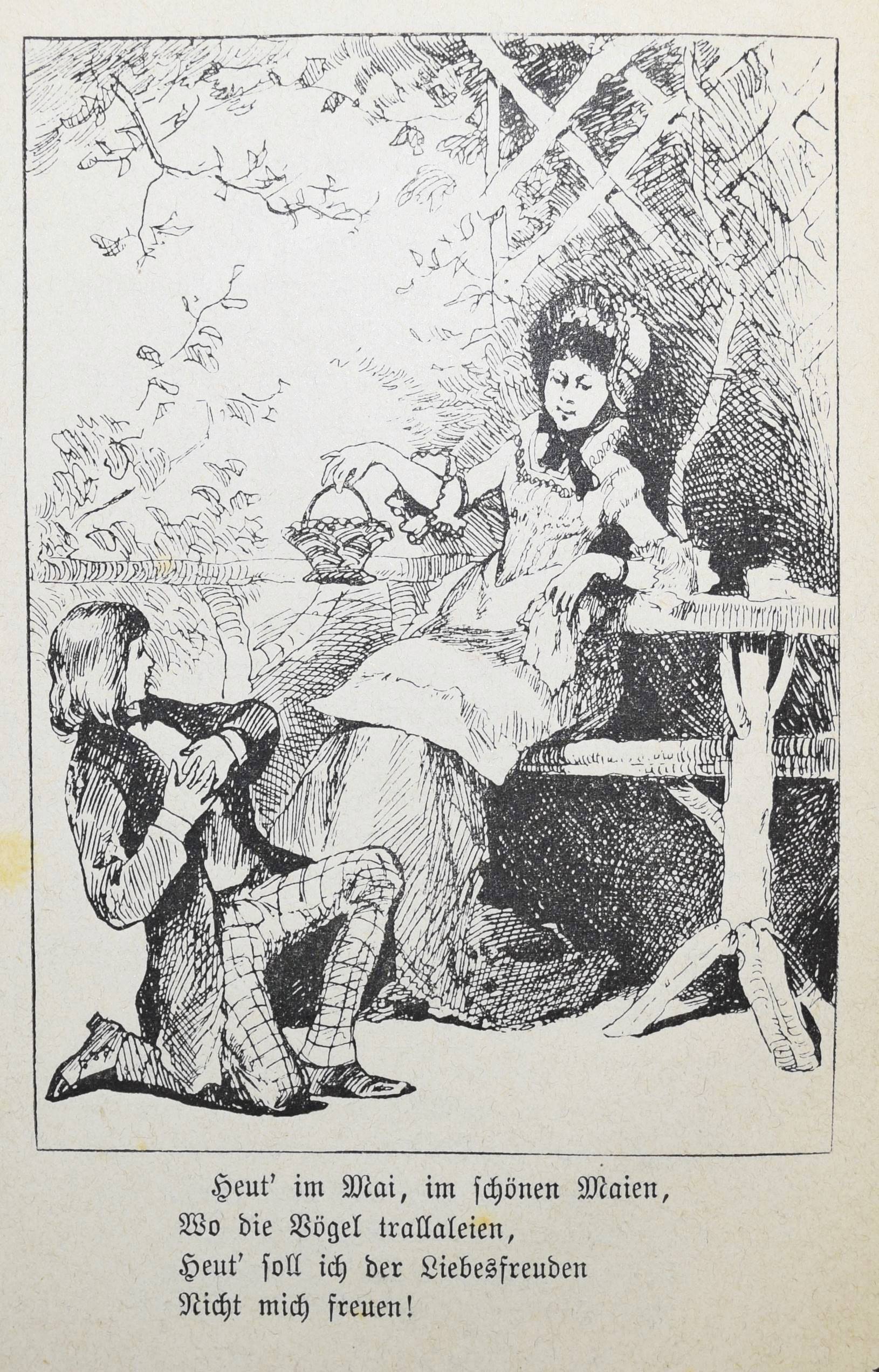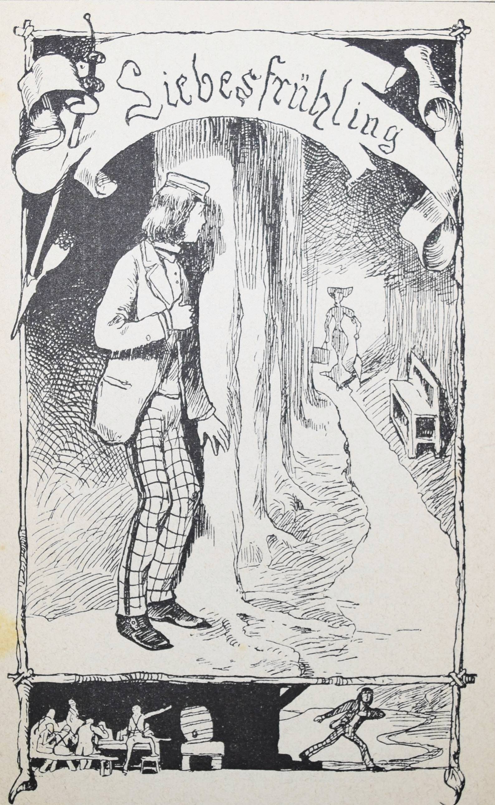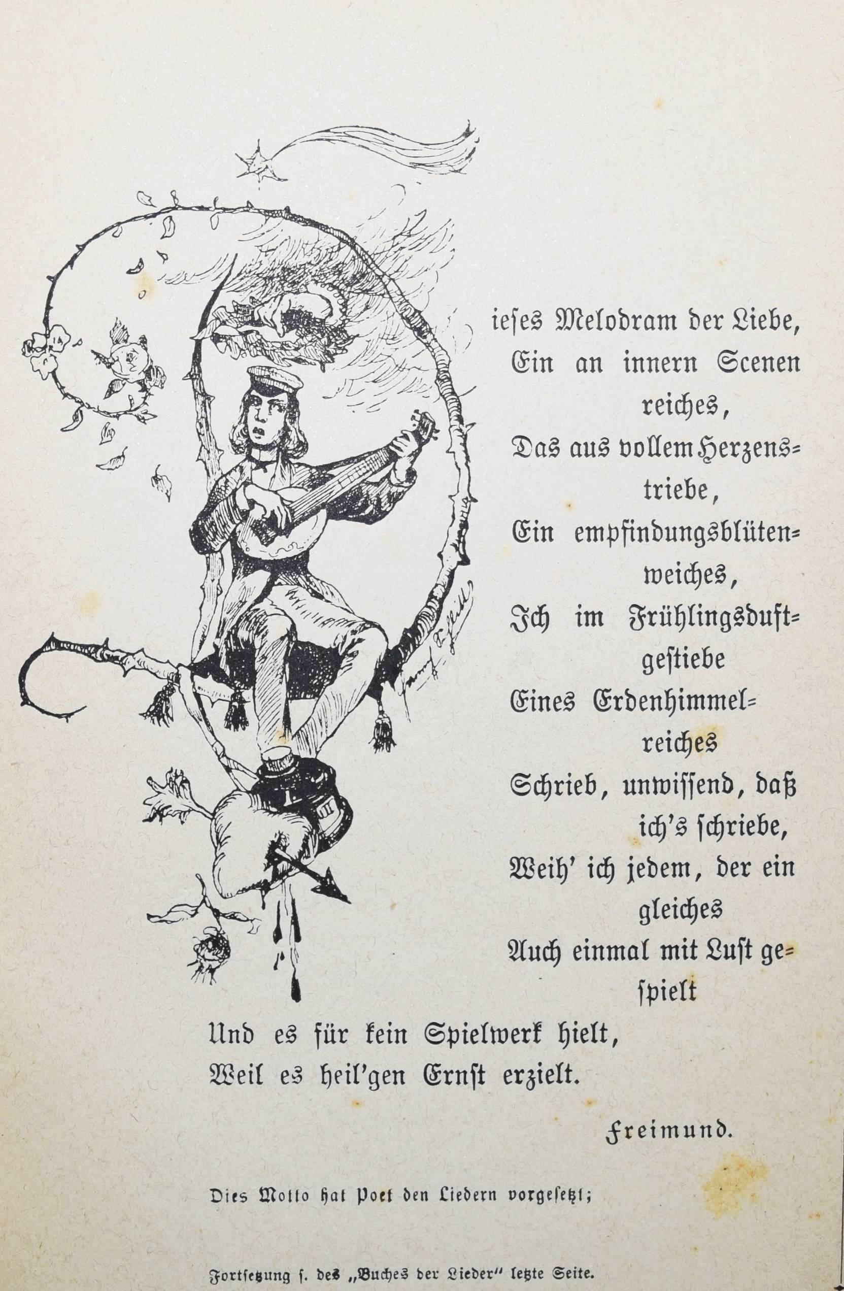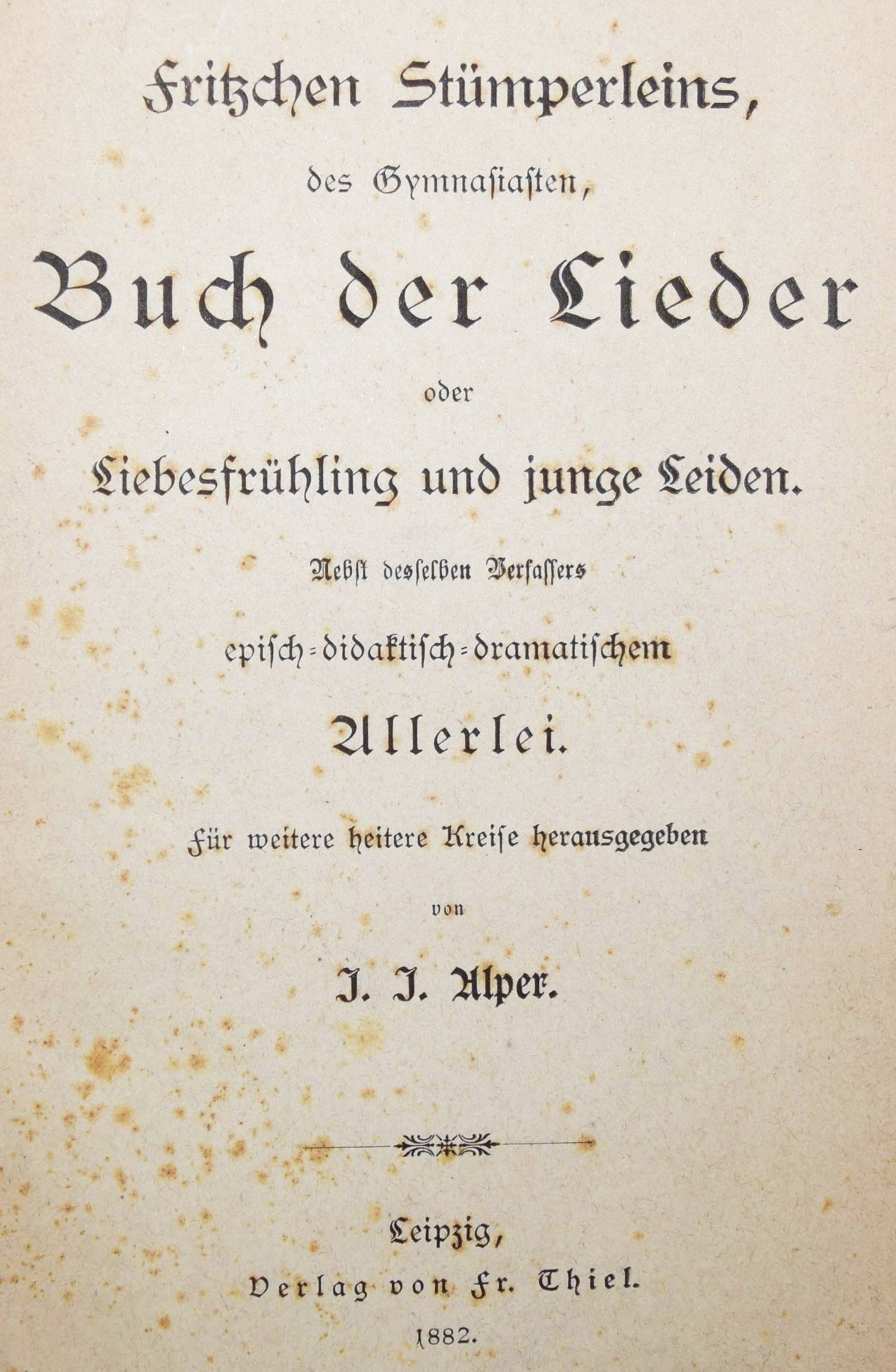 (Zipper, Albert). Fritzchen Stümperleins, des Gymnasiasten, Buch der Lieder oder Liebesfrühling u. junge Leiden. Nebst des Verfassers episch-didaktisch-dramatischem Allerlei. Für weitere heitere Kreise herausgegeben von J. J. Alper (d. i. Albert Zipper). Leipzig, F. Thiel 1882. 8°. 79 S. mit einigen Illustrationen. Br. d. Zt. Brümmer II, 422. Holzmann-Bohatta, Pseud. S. 9. – Seltene erste Ausgabe. – Rücken gebräunt und mit Fehlstellen, Heftung stellenw. gelockert, durchg. gebräunt u. etwas stockfl.