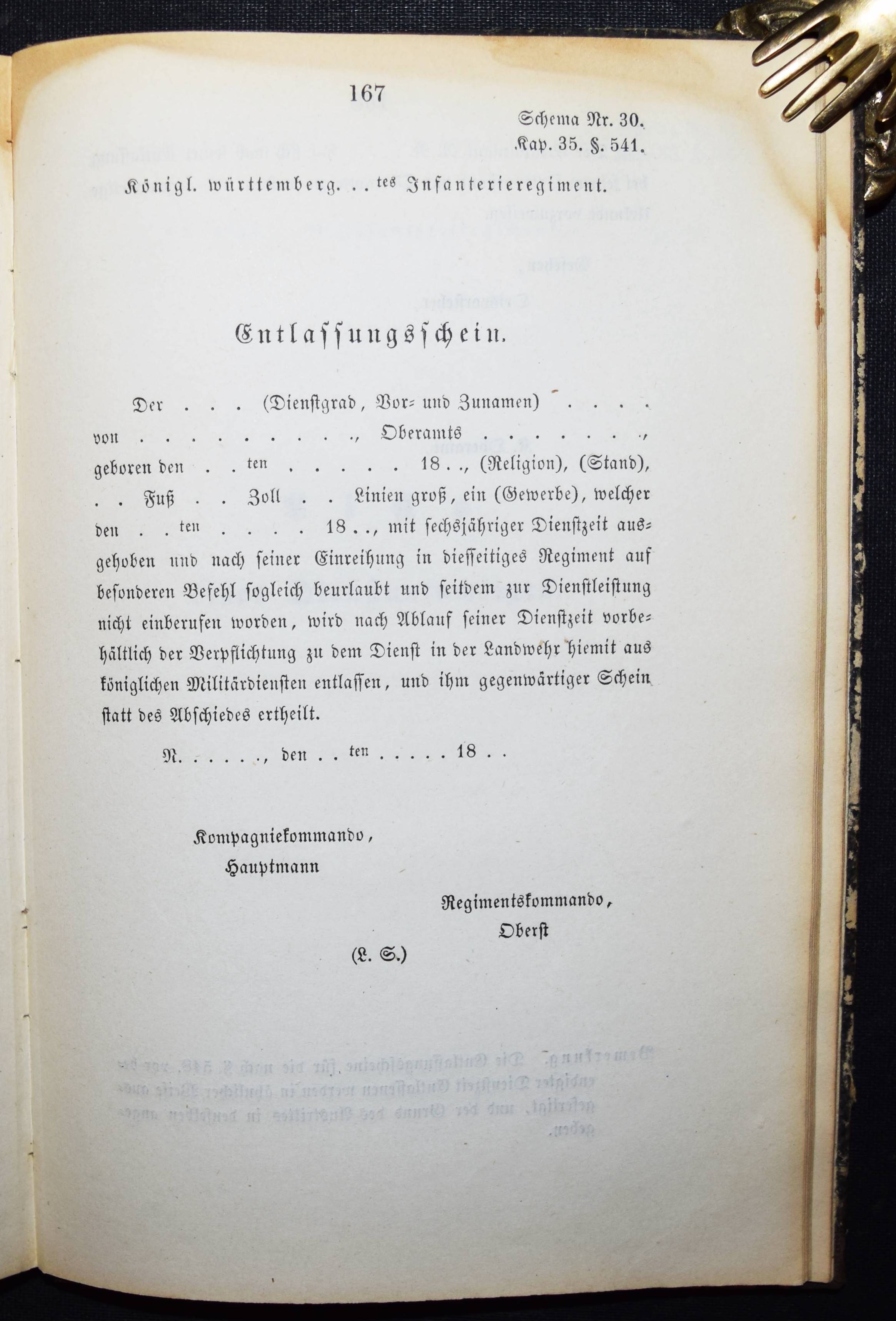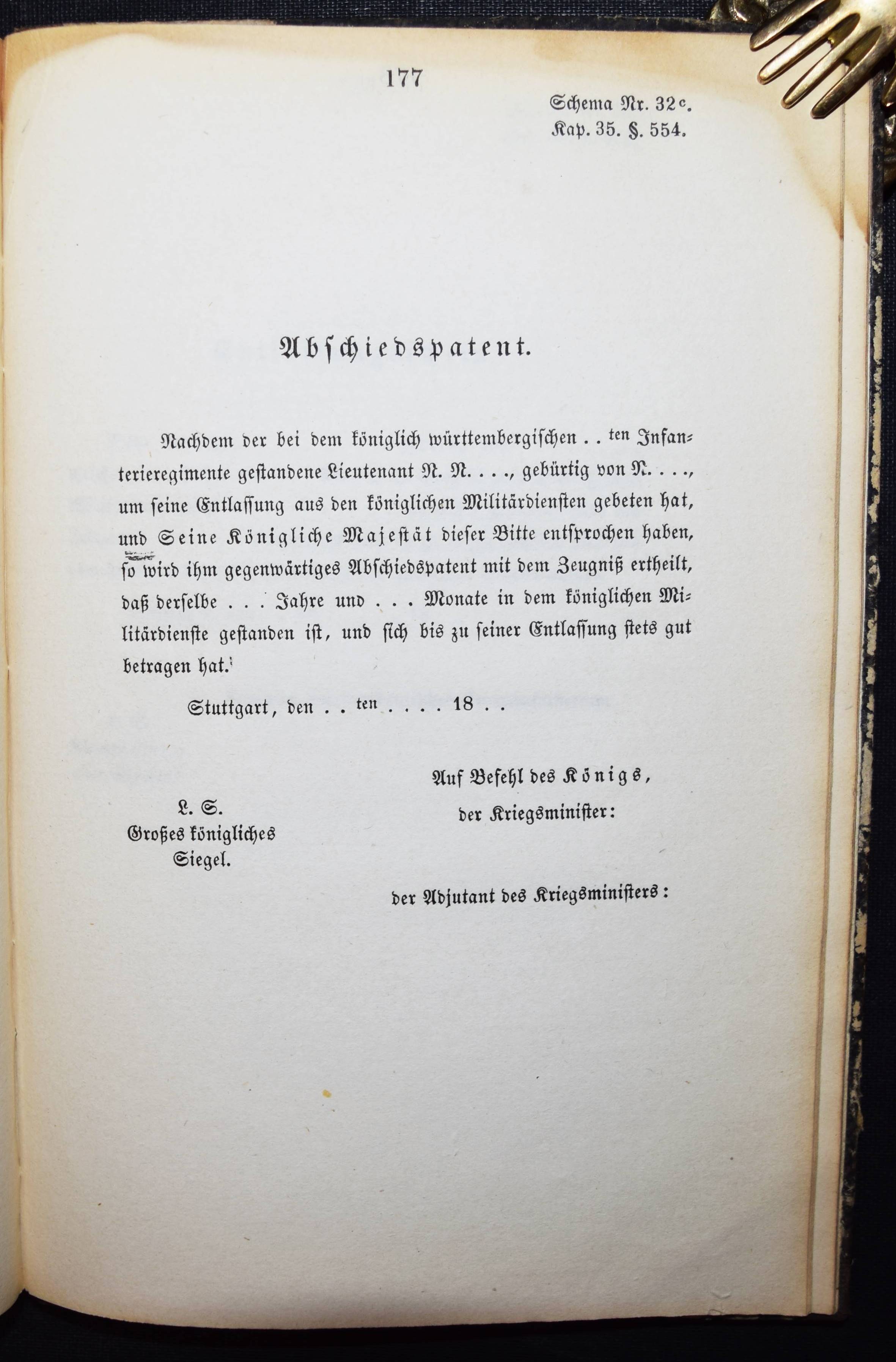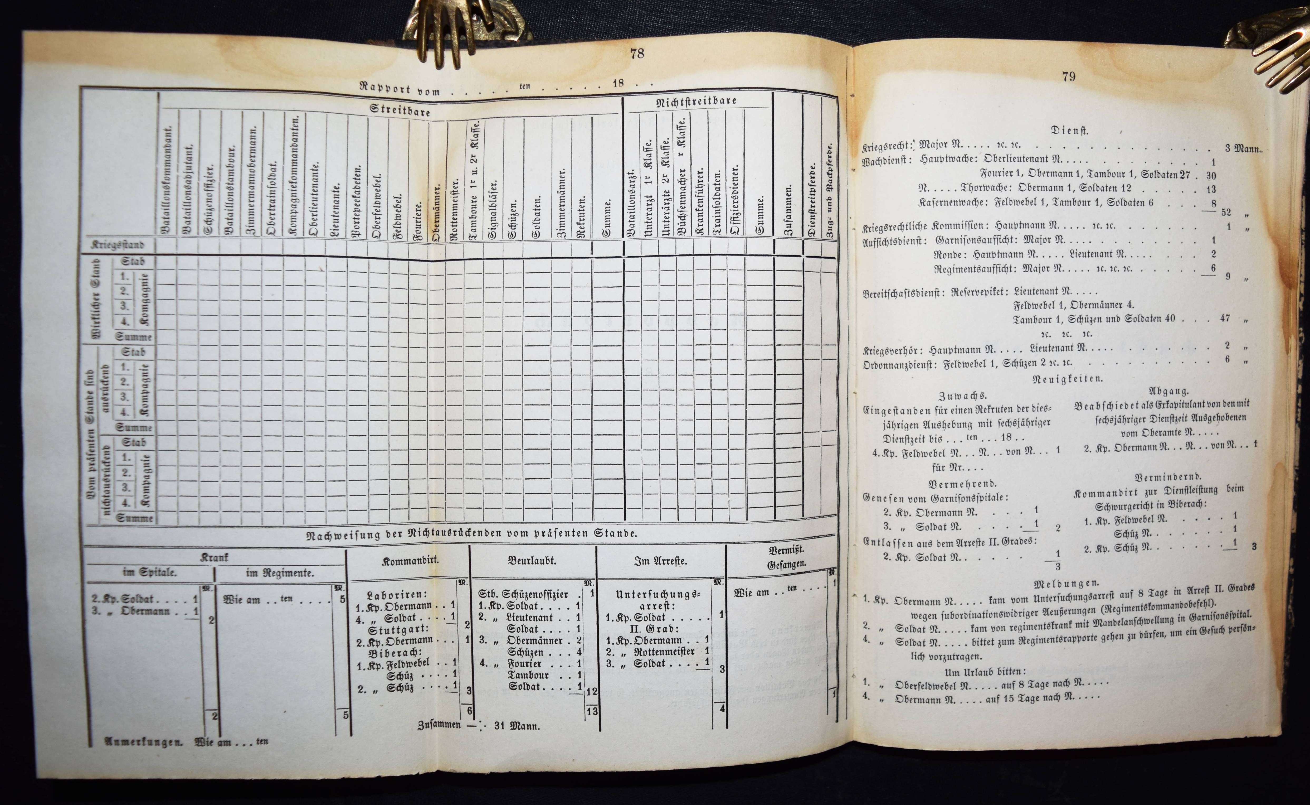 Schemas zum ersten Bande der allgemeine Kriegsdienstordnung für die Königlich Württembergischen Truppen. Stuttgart, Metzler 1858. 8°. V, 1 Bl, 196 S. mit Tabellen, davon 3 gefaltet. Hln. d. Zt. Einband berieben, durchgehend stark wasserrandig.