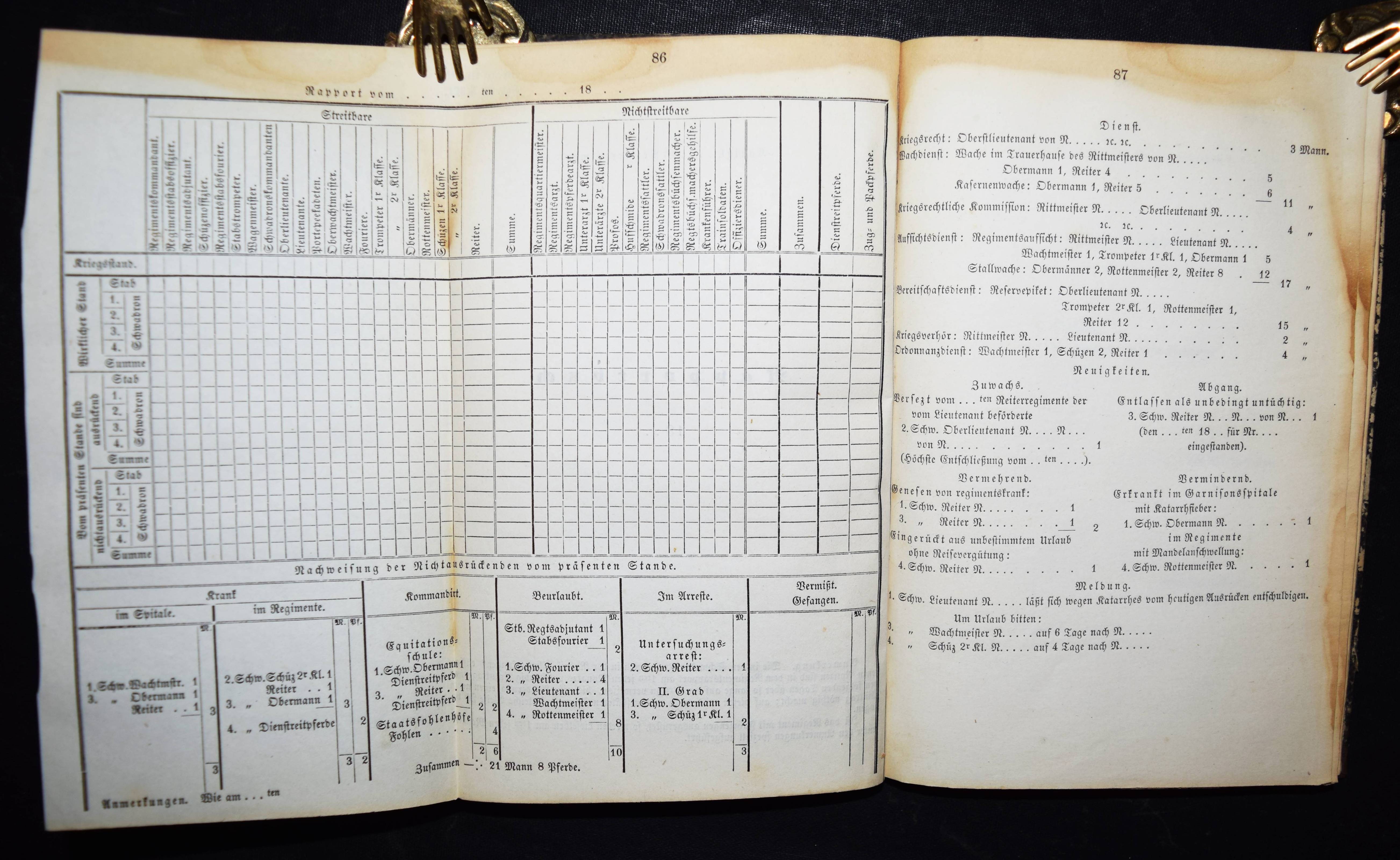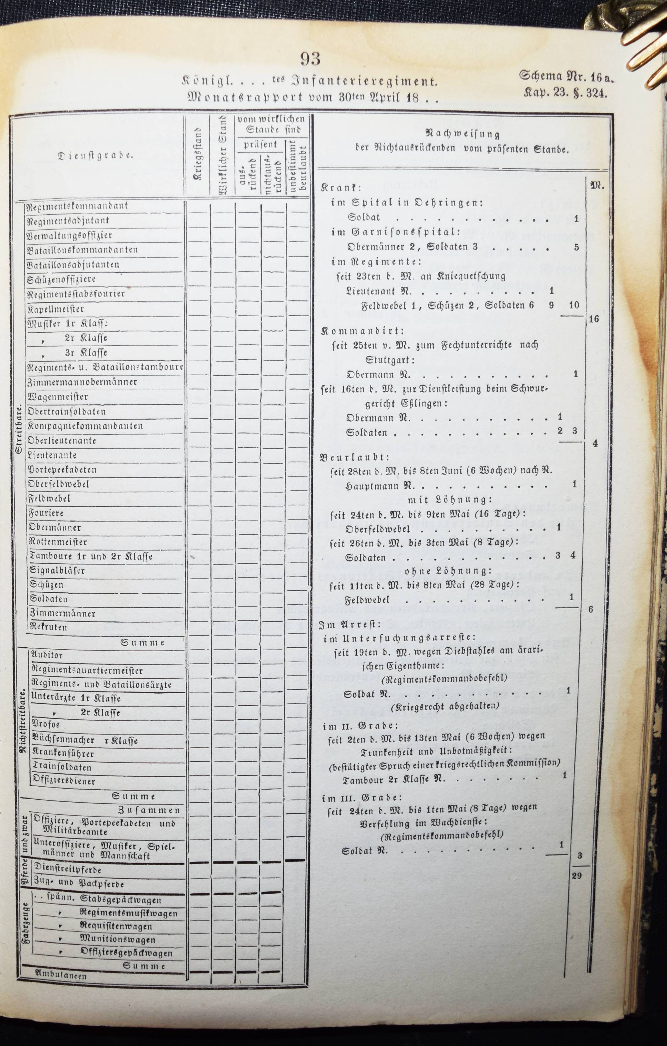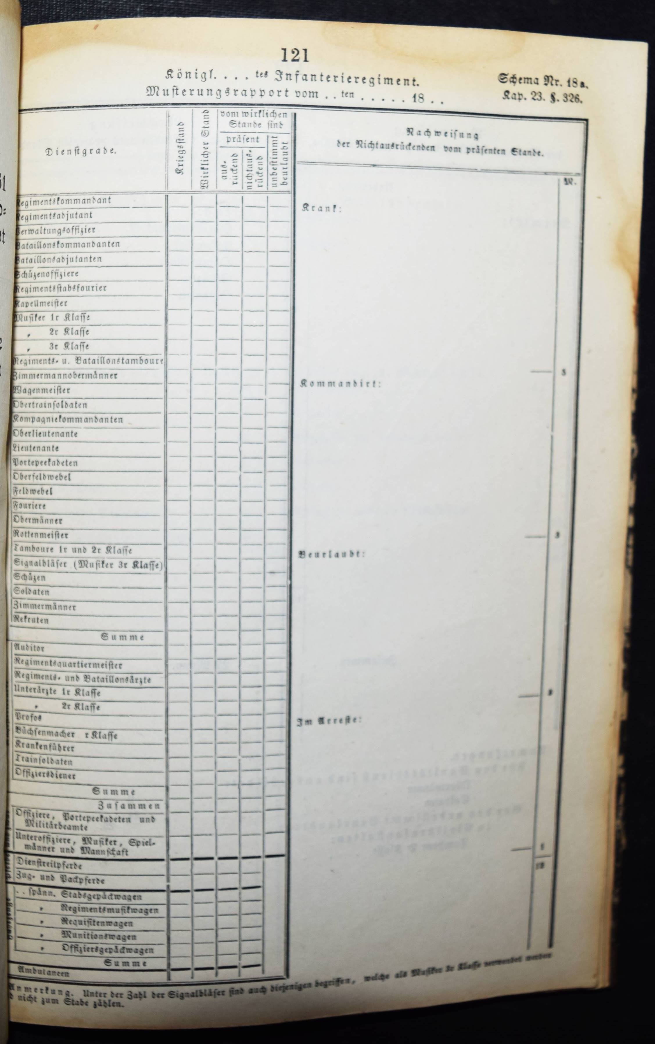 Schemas zum ersten Bande der allgemeine Kriegsdienstordnung für die Königlich Württembergischen Truppen. Stuttgart, Metzler 1858. 8°. V, 1 Bl, 196 S. mit Tabellen, davon 3 gefaltet. Hln. d. Zt. Einband berieben, durchgehend stark wasserrandig.