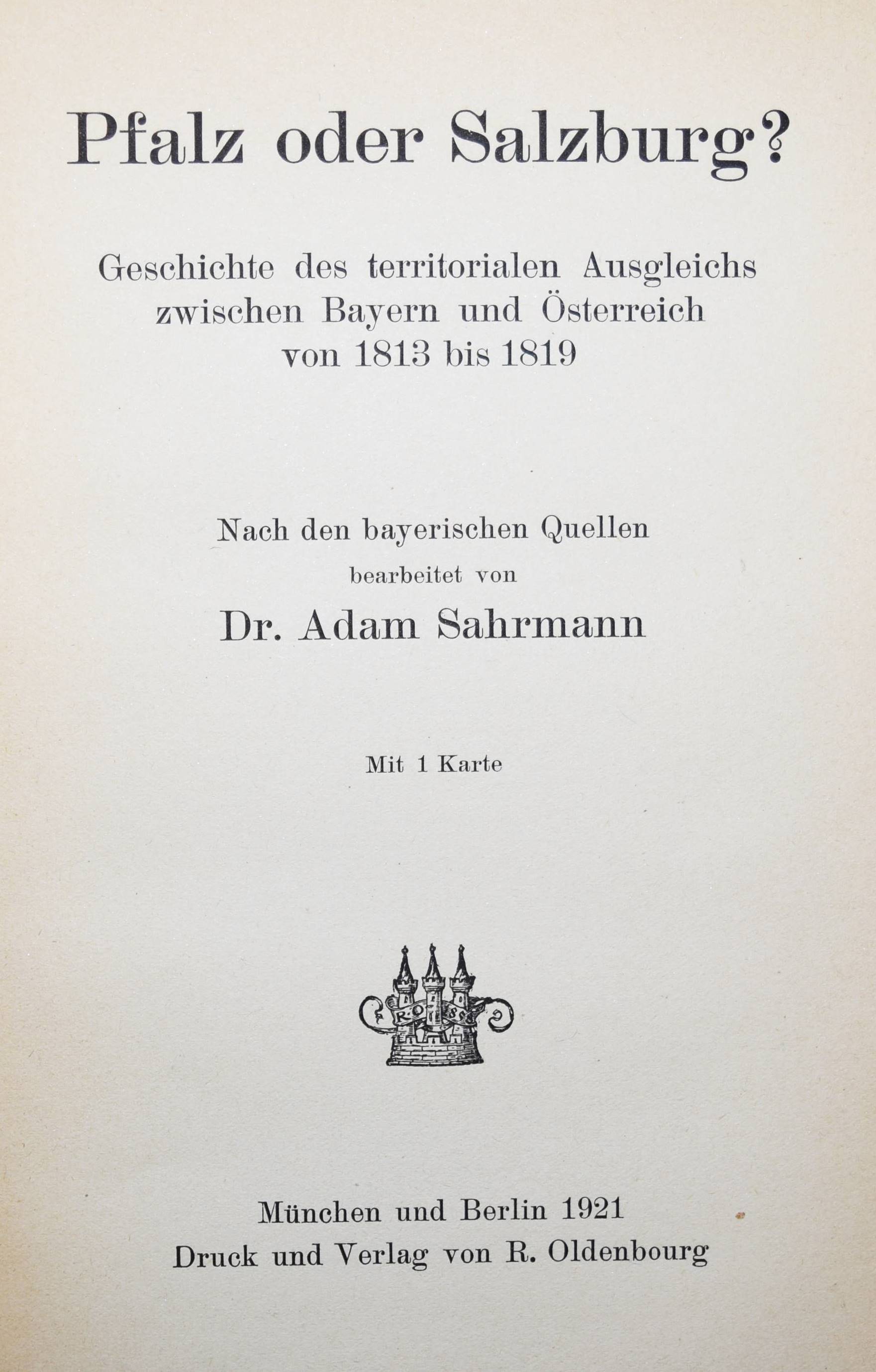 Sahrmann, Adam. Pfalz oder Salzburg? Geschichte des territorialen Ausgleichs zwischen Bayern und Österreich von 1813 bis 1819. München, Berlin, Oldenbourg 1921. Gr.-8°. 96 S., 2 Bl. mit 1 Karte. (Historische Bibliothek, Band 47). Gutes Exemplar.