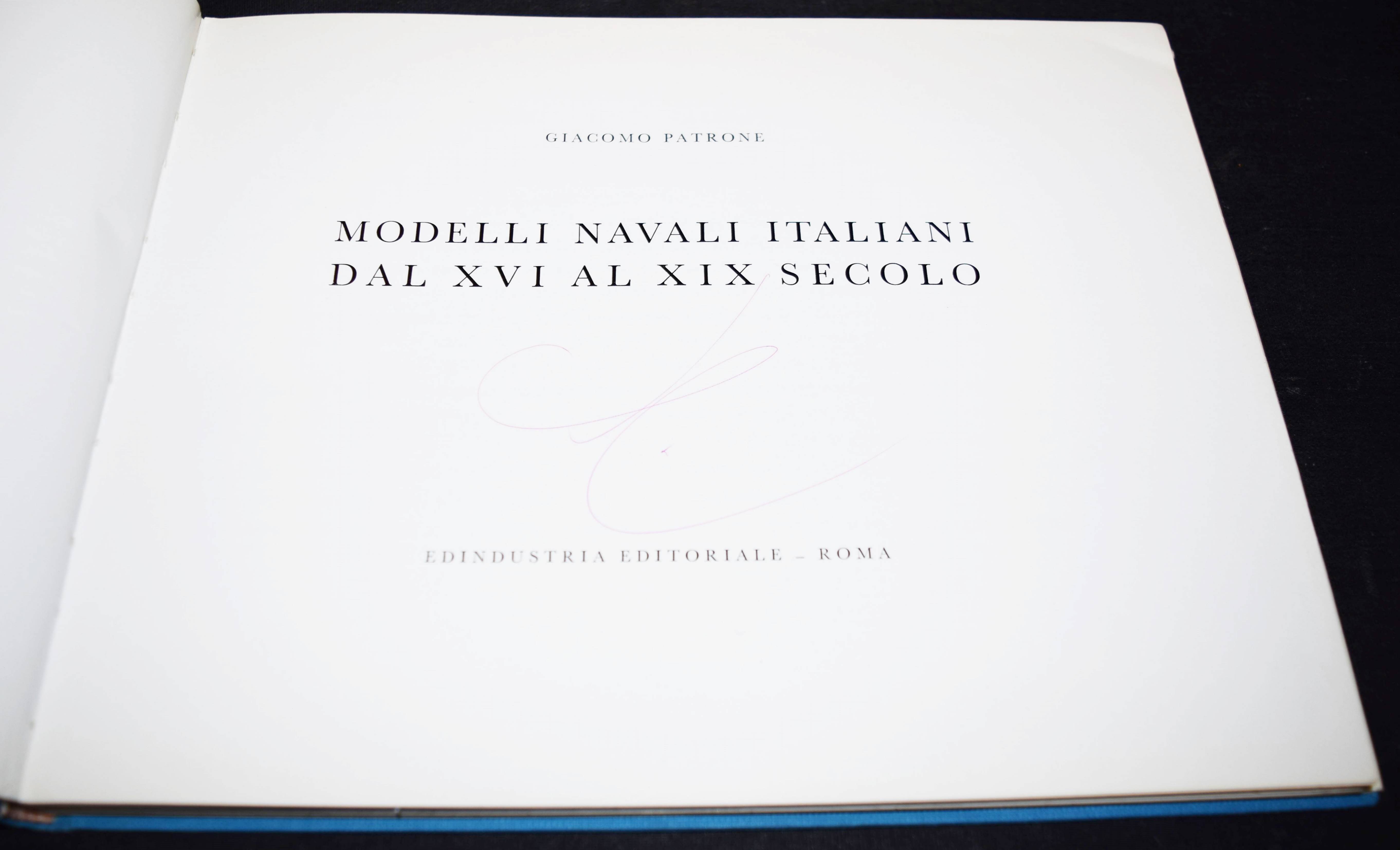 Patrone, Giacomo. Modelli navali italiani dal XVI al XIX secolo. Roma, Edindustria editoriale 1962. Quer-8°. 56 S. und 52 Tafeln. OLn. mit farbig illustr. OU. Von Giacomo Patrone auf dem Titel signiert. – Schutzumschlag oben am Gelenk mit einriss, sonst gutes Exemplar.