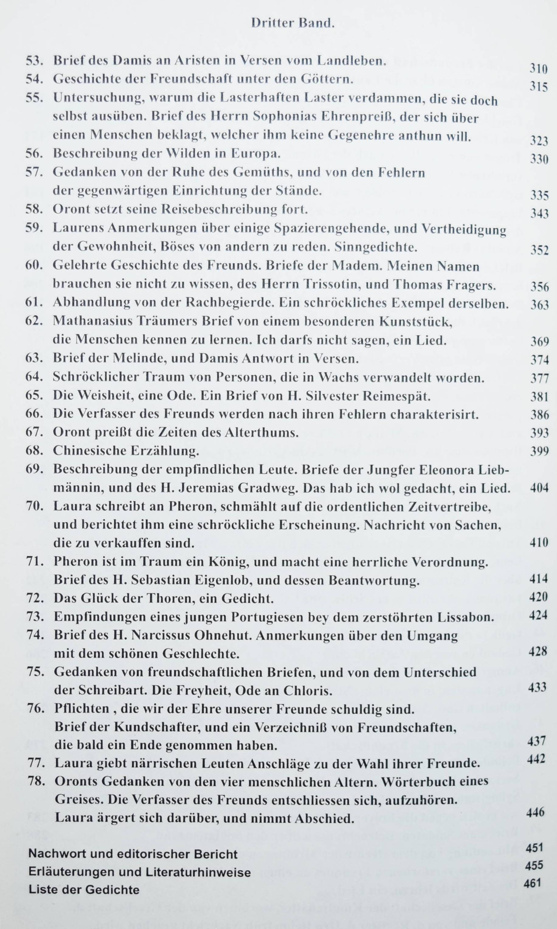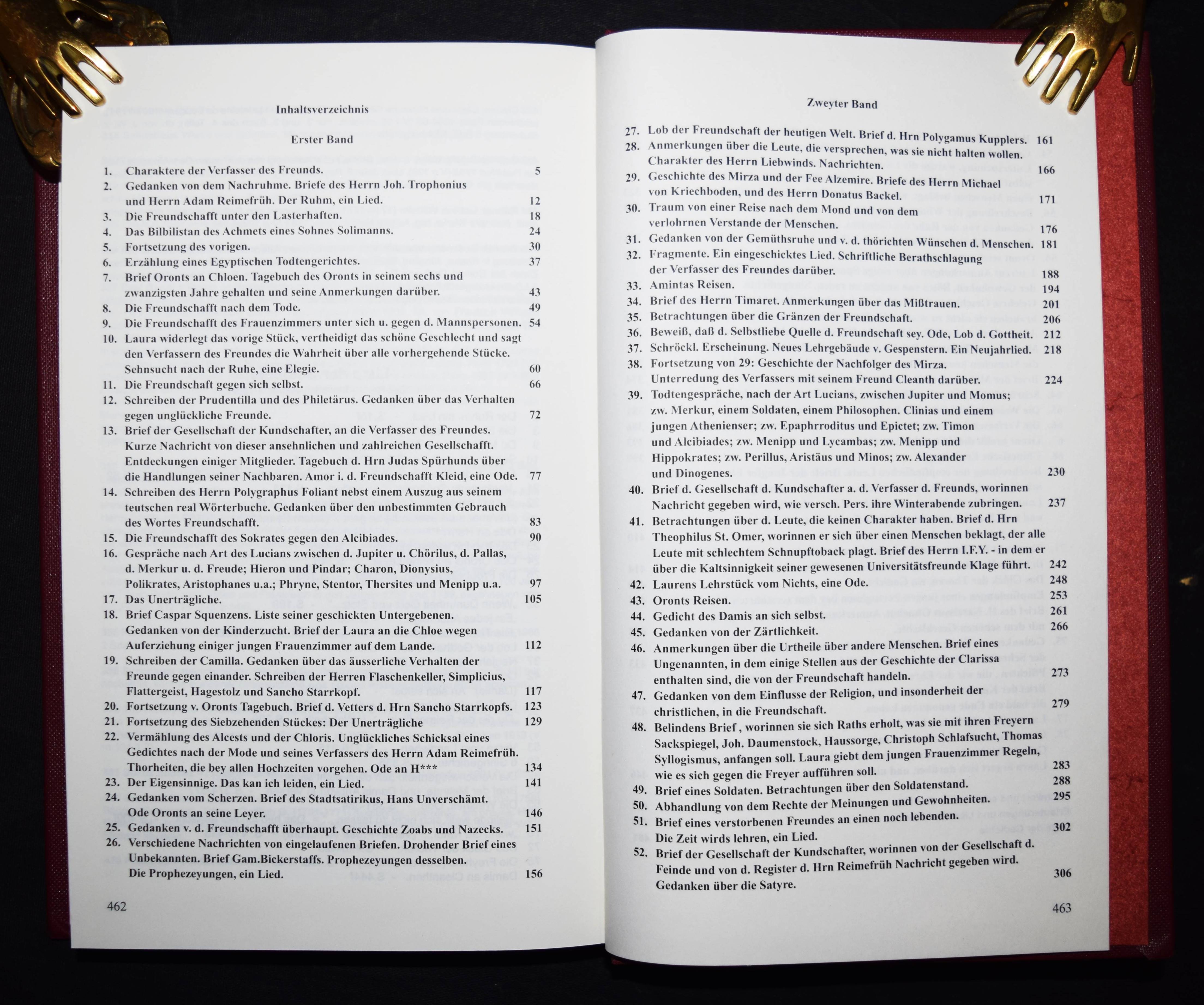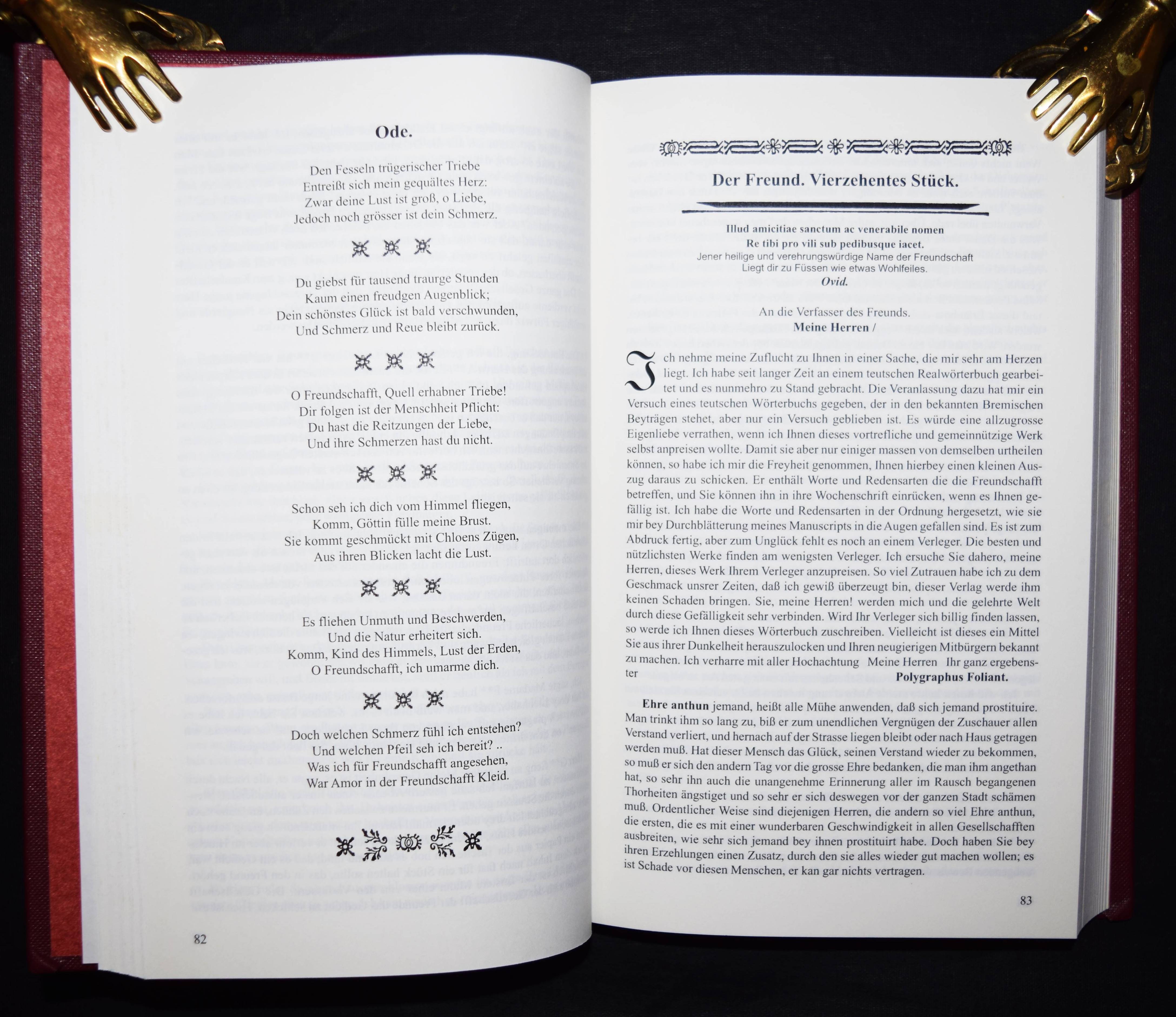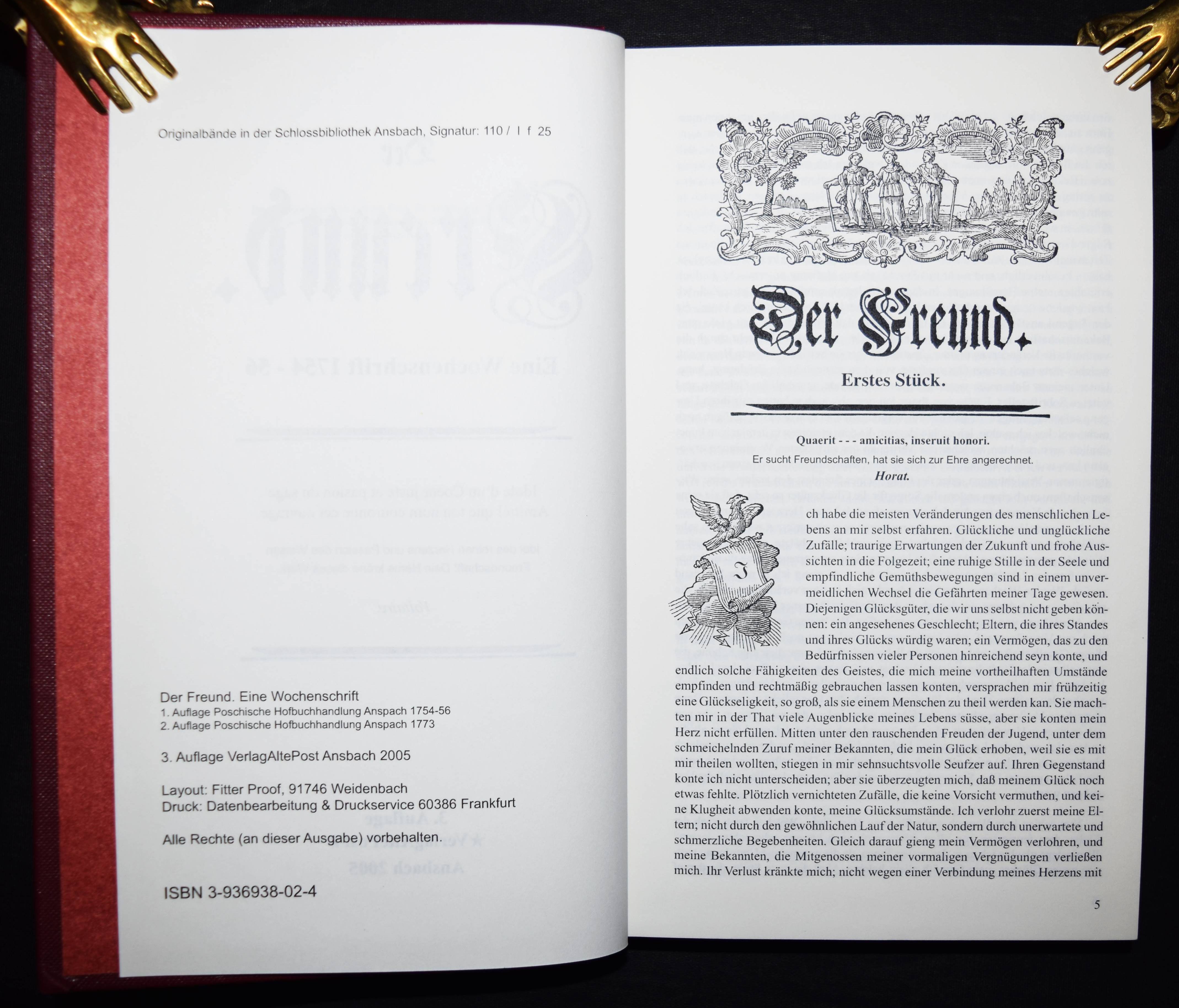 Der Freund. Eine Wochenschrift 1754-56. 3. Auflage. Ansbach, Verlag Alte Post 2005. 4°. 464 S. OLn. mit goldgepr. Rückentitel. Sehr gutes Exemplar.
