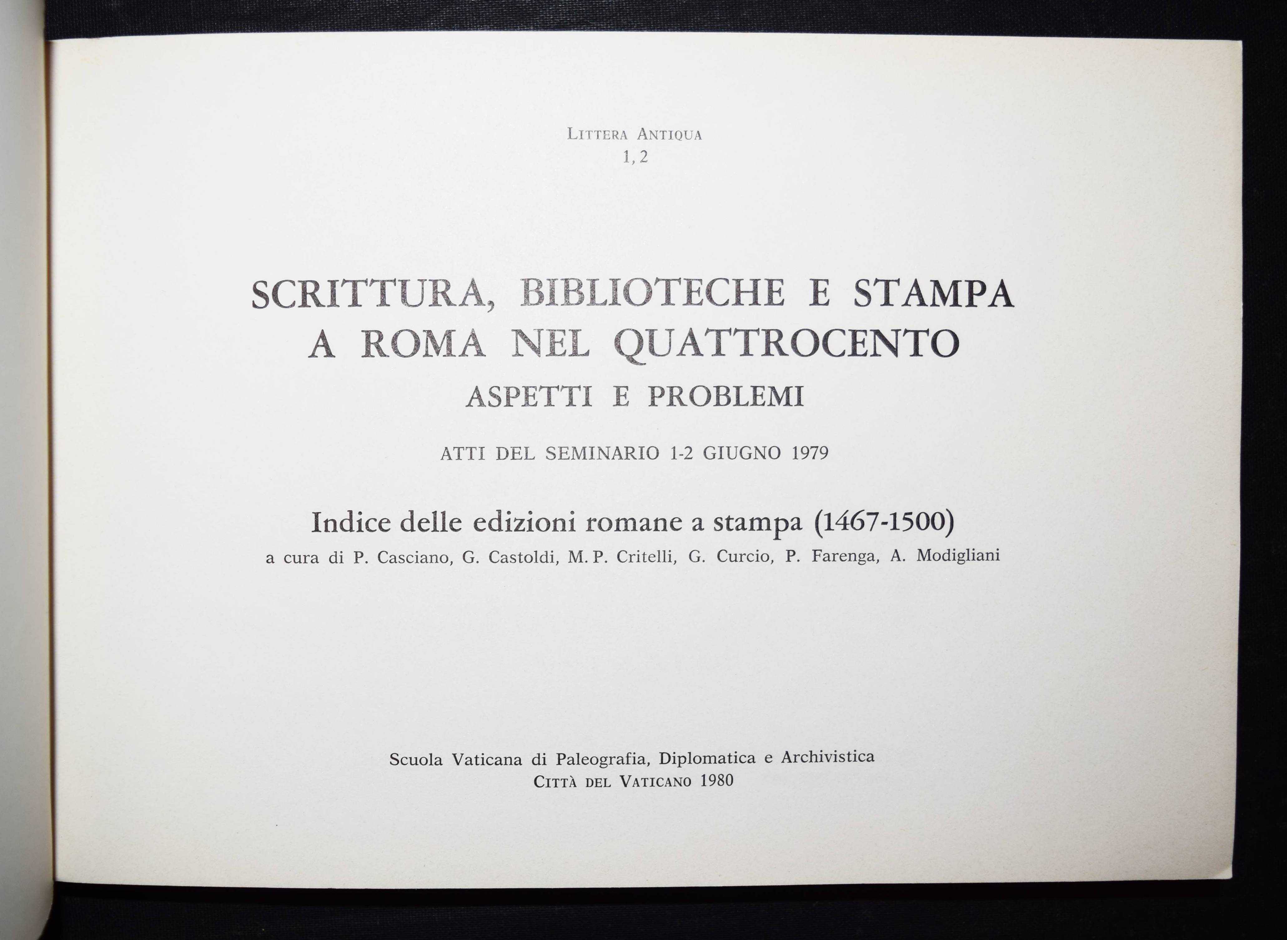 Casciano P. u.a. Scrittura, biblioteche e stampa a Roma nel quattrocento. Aspetti e problemi. Atti del seminario 1-2 giugno 1979. Indice delle edizioni romane a stampa (1467 – 1500). Città del Vaticano, Scuola Vaticana di Paleografia, Diplomatica e Archivistica 1980. Quer.-Kl.-8°. XVI, 286 S. OKart. (Littera antiqua 1,2). Sehr gutes Exemplar.