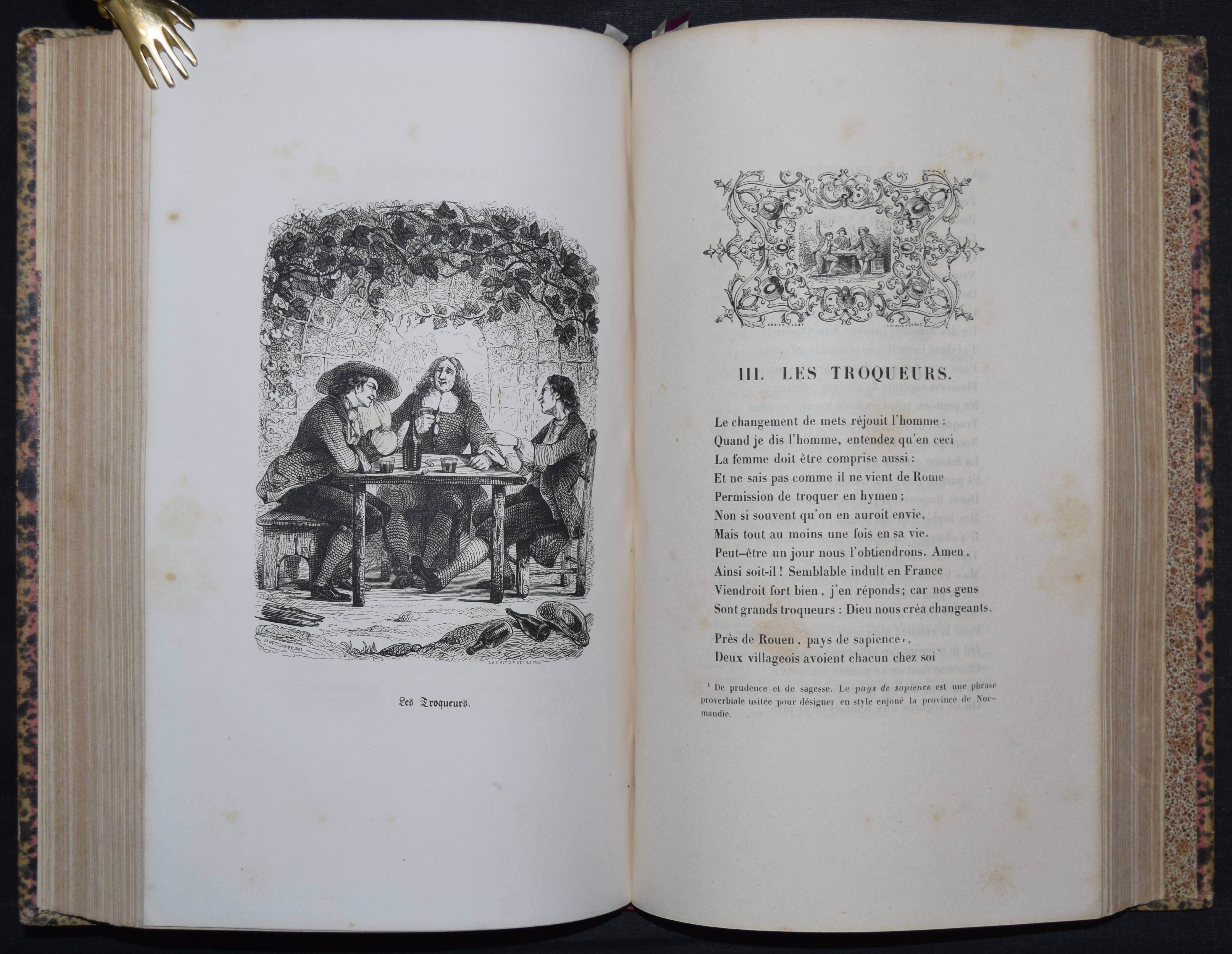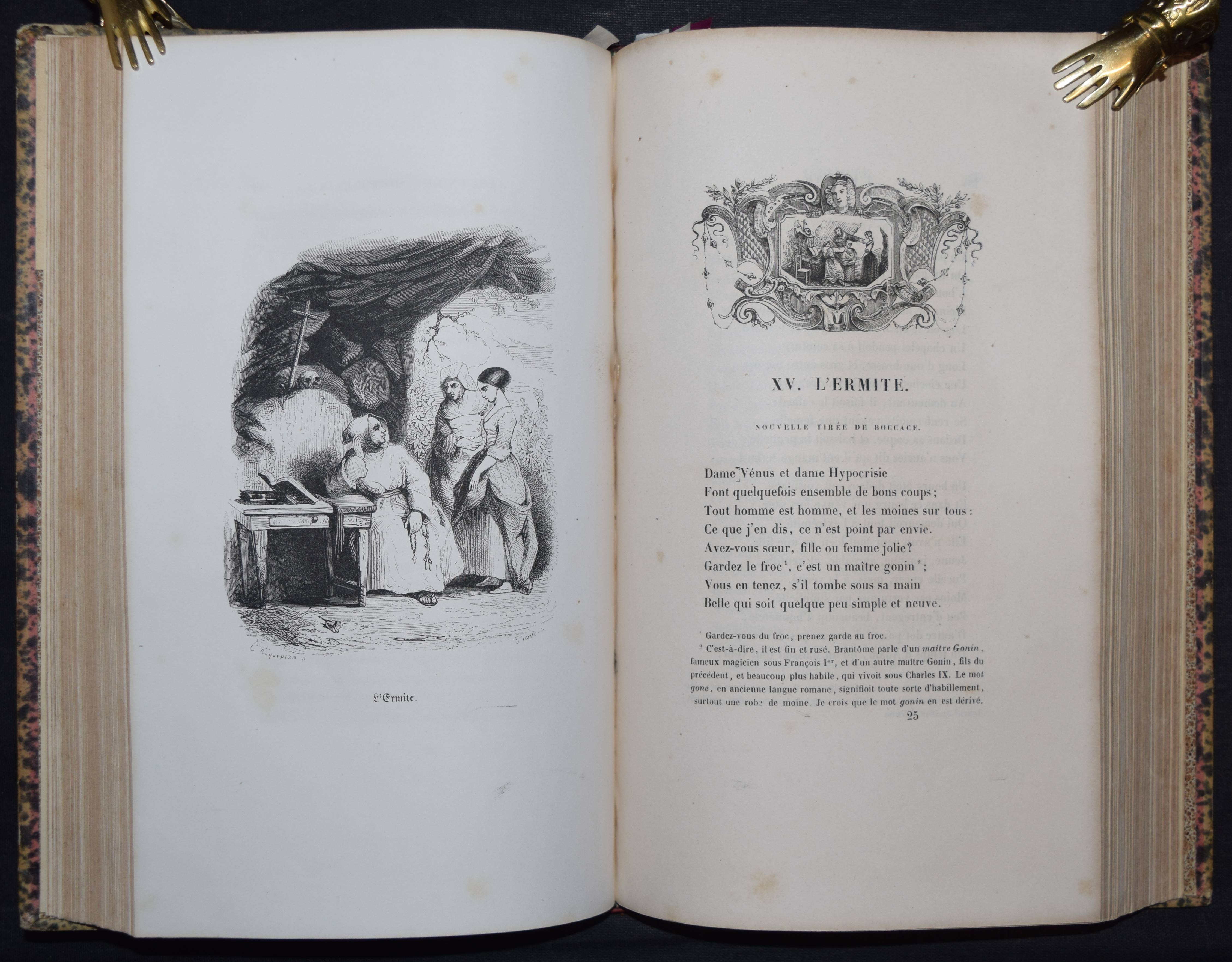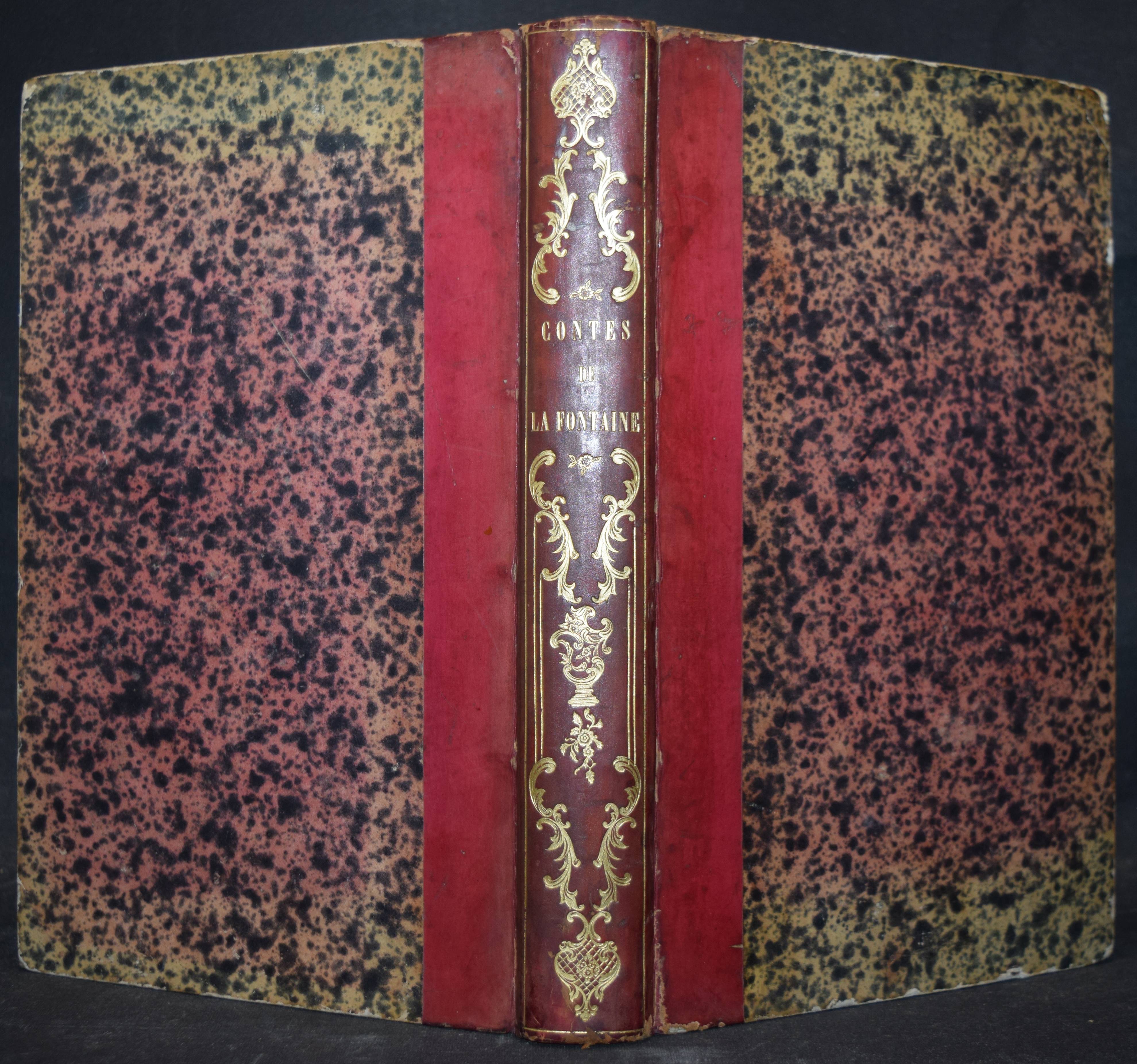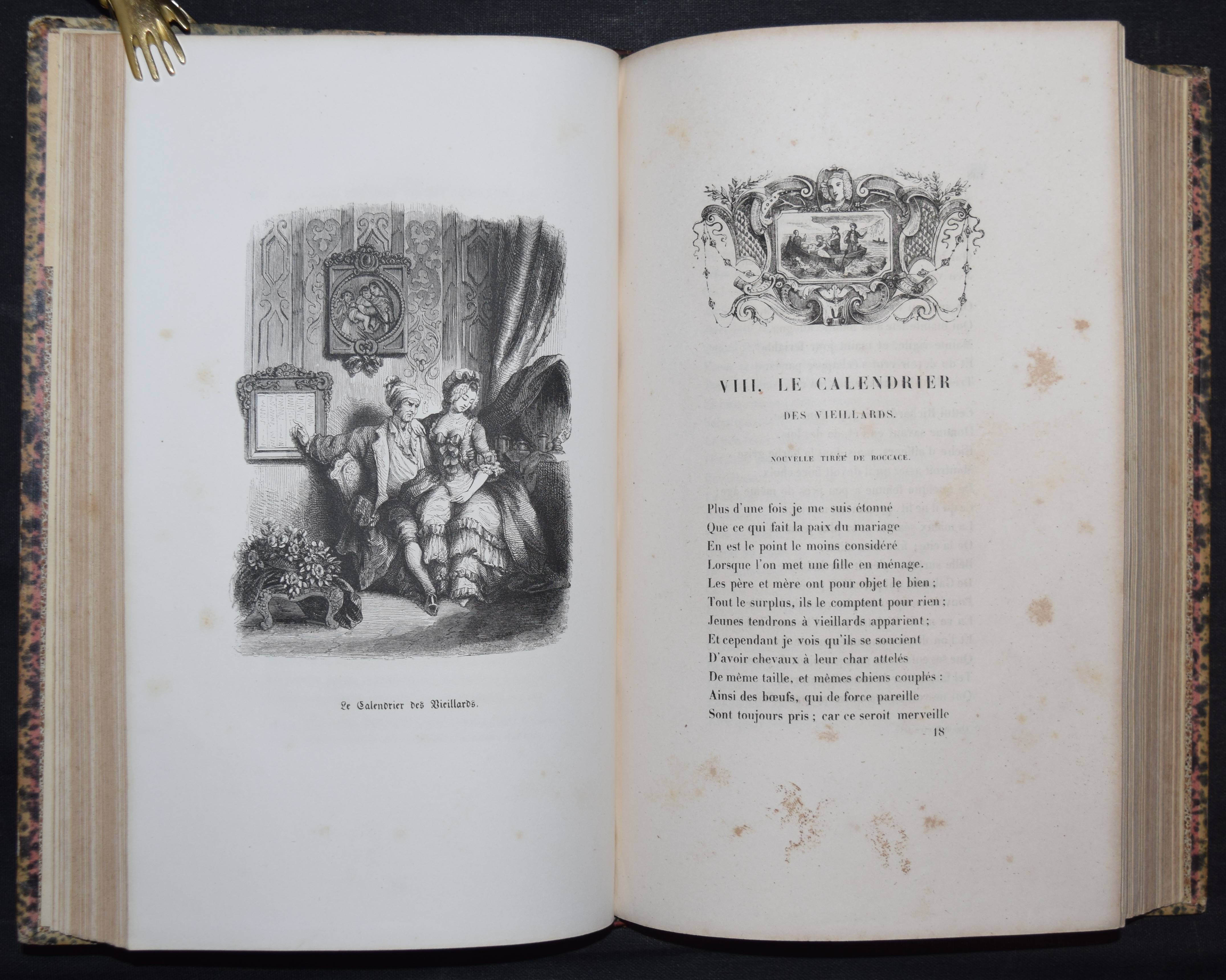 La Fontaine, (Jean de). Contes et nouvelles, (en vers). Édition illustrée. Paris, Bourdin et Cie. s. d. (1839). Gr.-8°. VIII, 534 S. mit 5 illustr. Zwischentiteln, 31 Holzstichtafeln und zahlreiche Textillustr. u. Vignetten von Tony Johannot, C.A.M, Roqueplan, Déveria, C. Boulanger, Fragonard père, Janet-Lange, Francais, Laville, Ed. Vattier u. Adrien Féart. Hldr. d. Zt. mit goldgepr. Rückentitel u. Romantikerverg. Sander 401. – Gelenke u. Kanten etwas berieben, Exlibris (″Helene Freifrau v. Reitzenstein“), stellenweise stockfl.