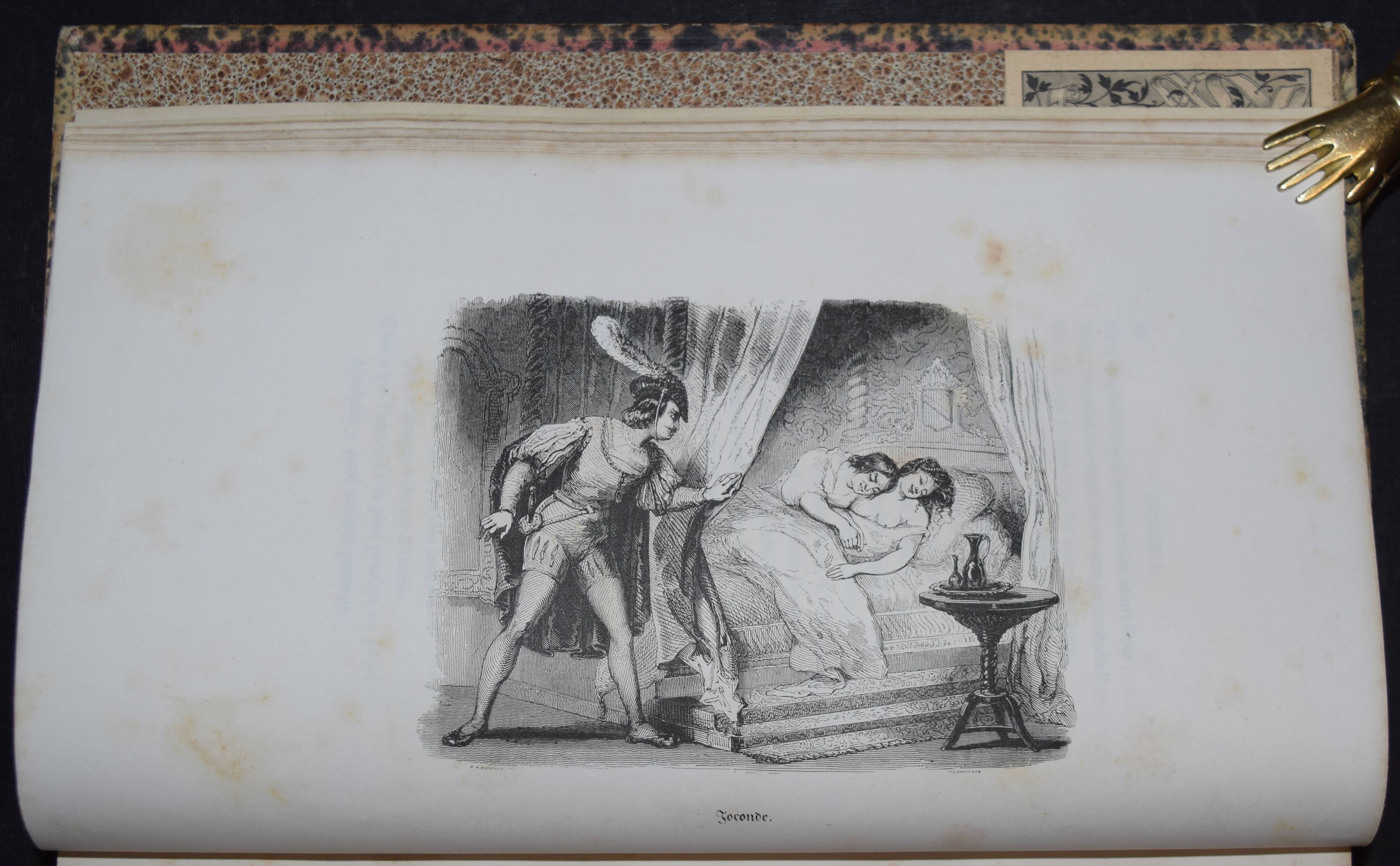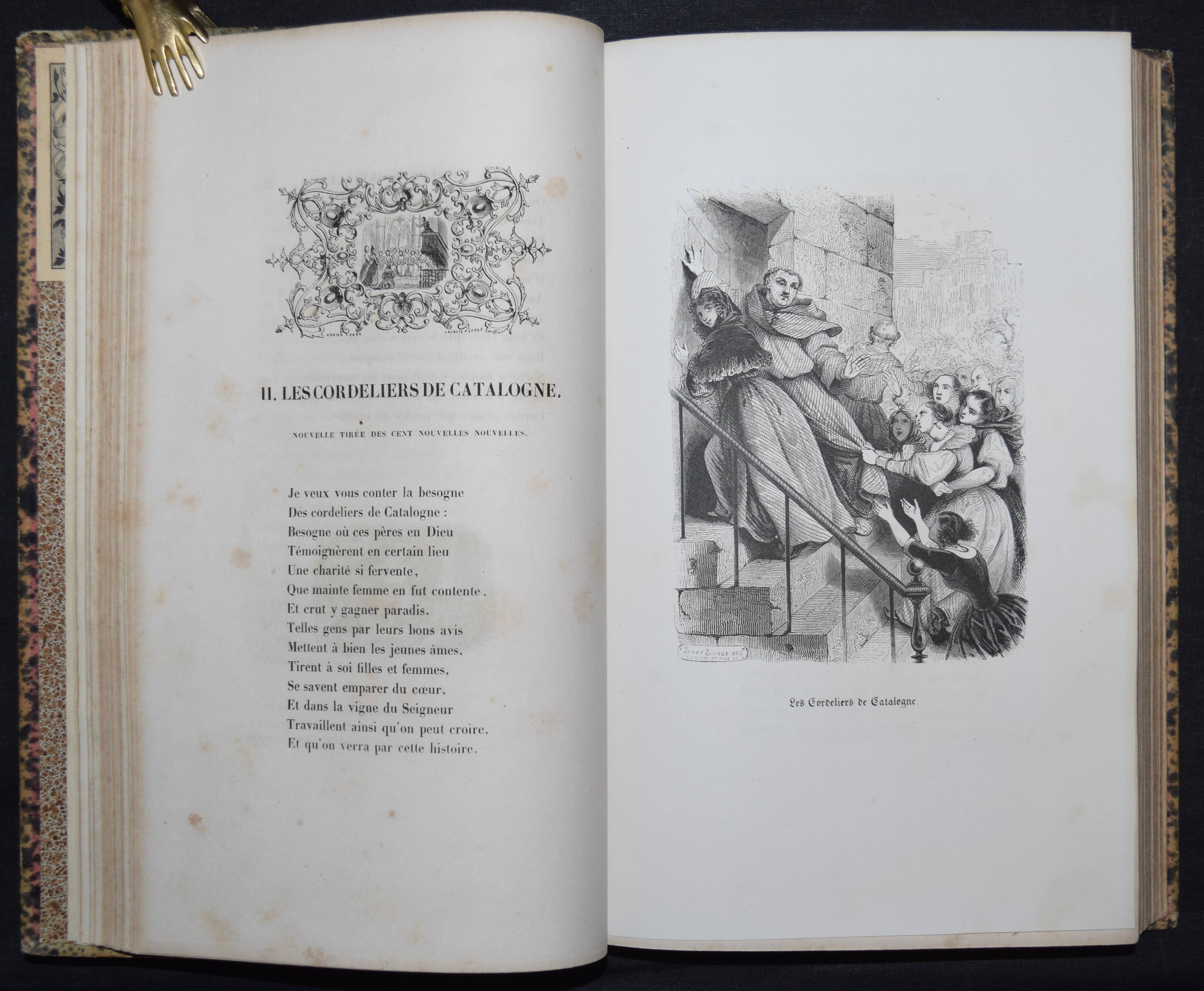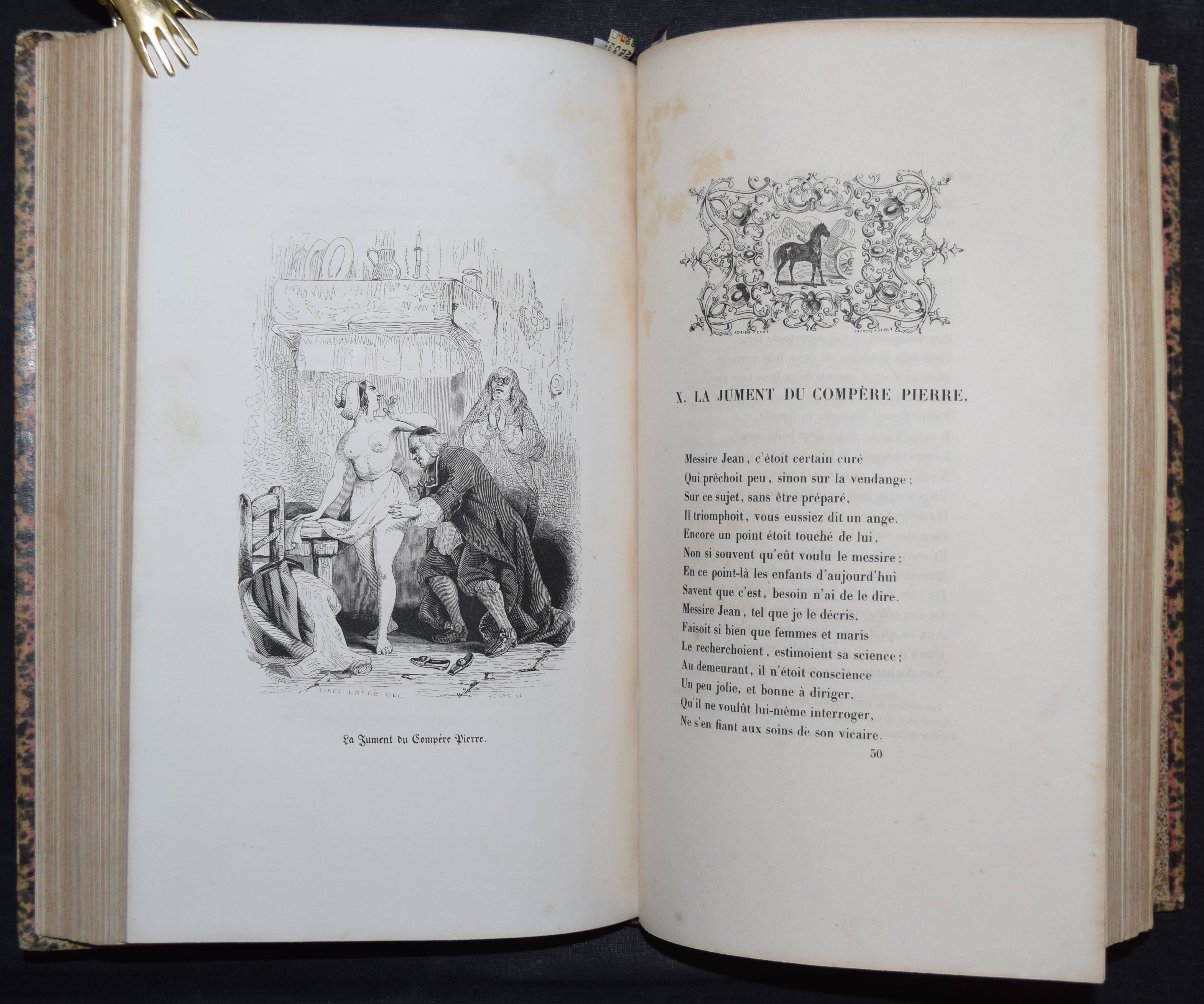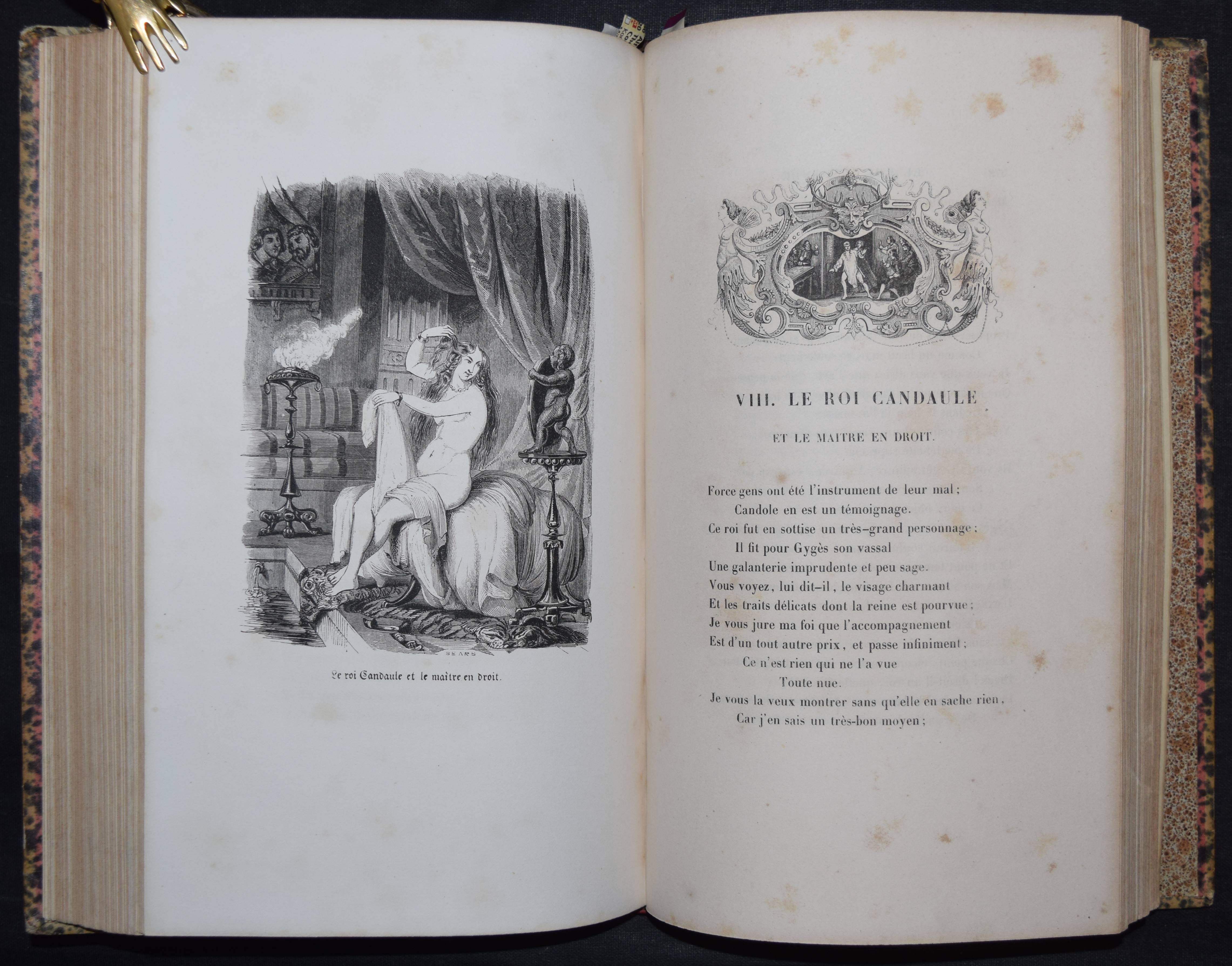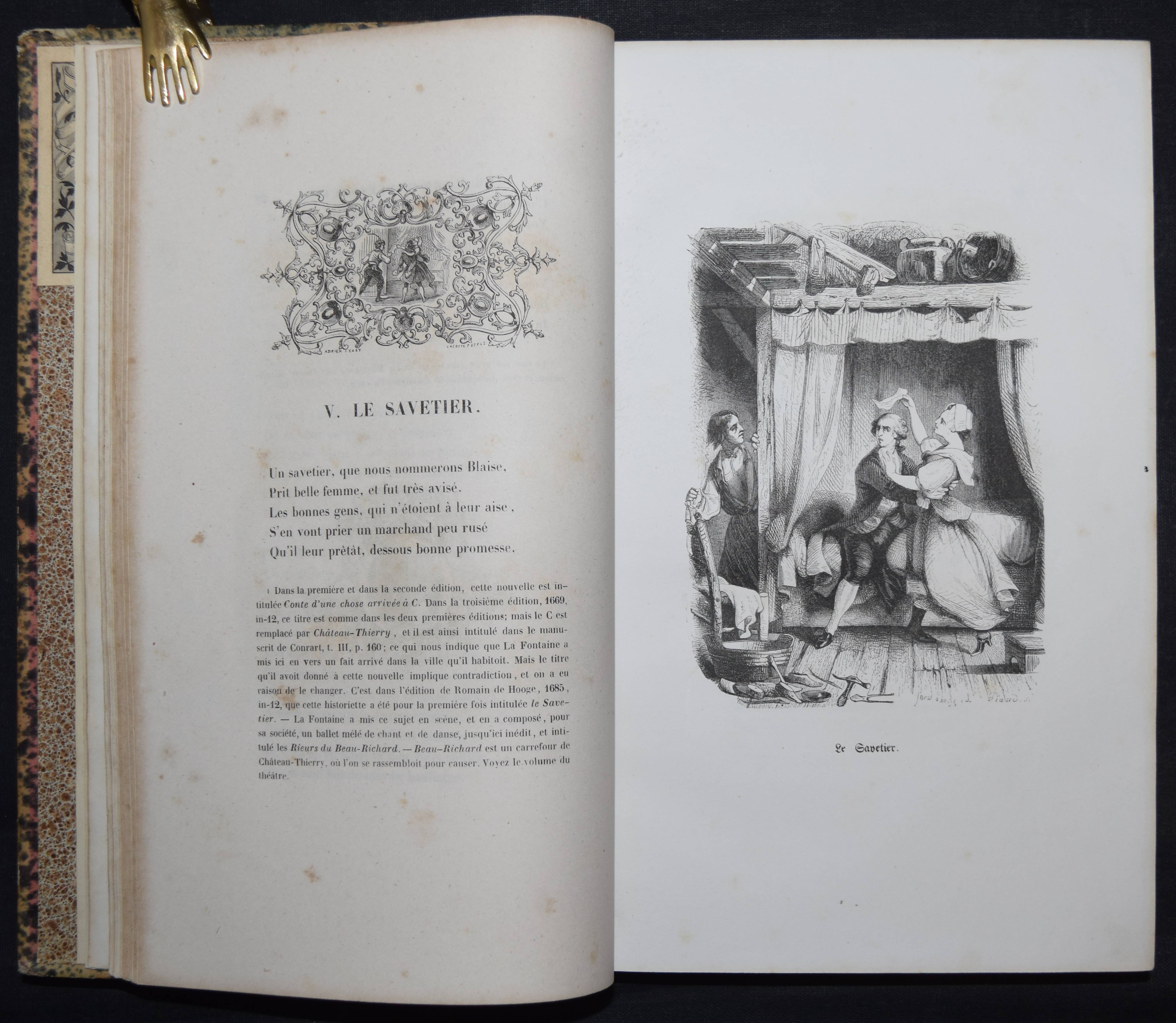 La Fontaine, (Jean de). Contes et nouvelles, (en vers). Édition illustrée. Paris, Bourdin et Cie. s. d. (1839). Gr.-8°. VIII, 534 S. mit 5 illustr. Zwischentiteln, 31 Holzstichtafeln und zahlreiche Textillustr. u. Vignetten von Tony Johannot, C.A.M, Roqueplan, Déveria, C. Boulanger, Fragonard père, Janet-Lange, Francais, Laville, Ed. Vattier u. Adrien Féart. Hldr. d. Zt. mit goldgepr. Rückentitel u. Romantikerverg. Sander 401. – Gelenke u. Kanten etwas berieben, Exlibris (″Helene Freifrau v. Reitzenstein“), stellenweise stockfl.