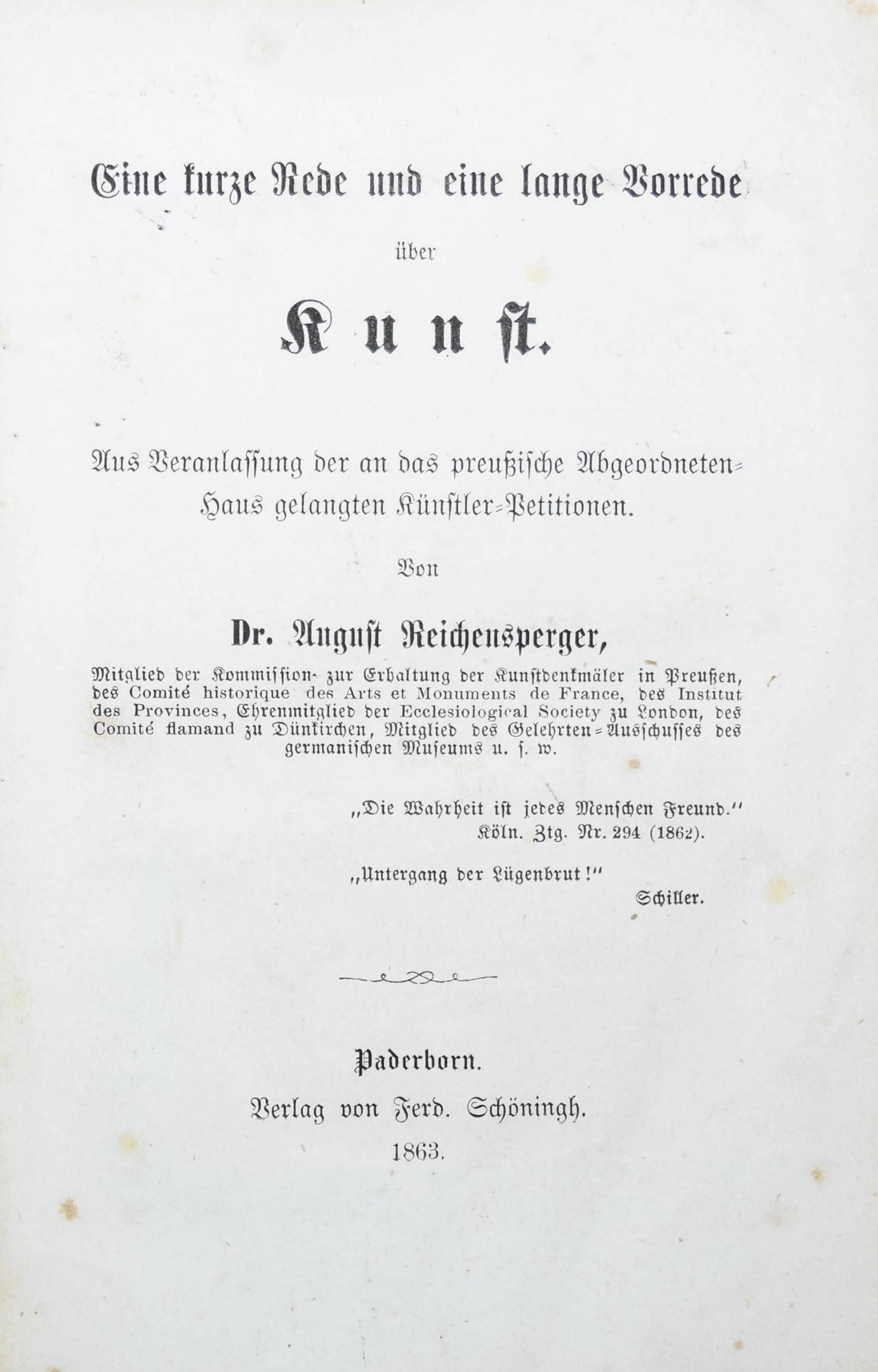 Reichensperger, August. Eine kurze Rede und eine lange Vorrede über Kunst. Aus Veranlassung der an das preußische Abgeordneten-Haus gelangten Künstler -Petitionen. Paderborn, Schöningh 1863. Kl.-8°. 128 S. OBr. Einband mit stärkeren Gebrauchsspuren, stockfl., gutes unbeschnittenes Exemplar.