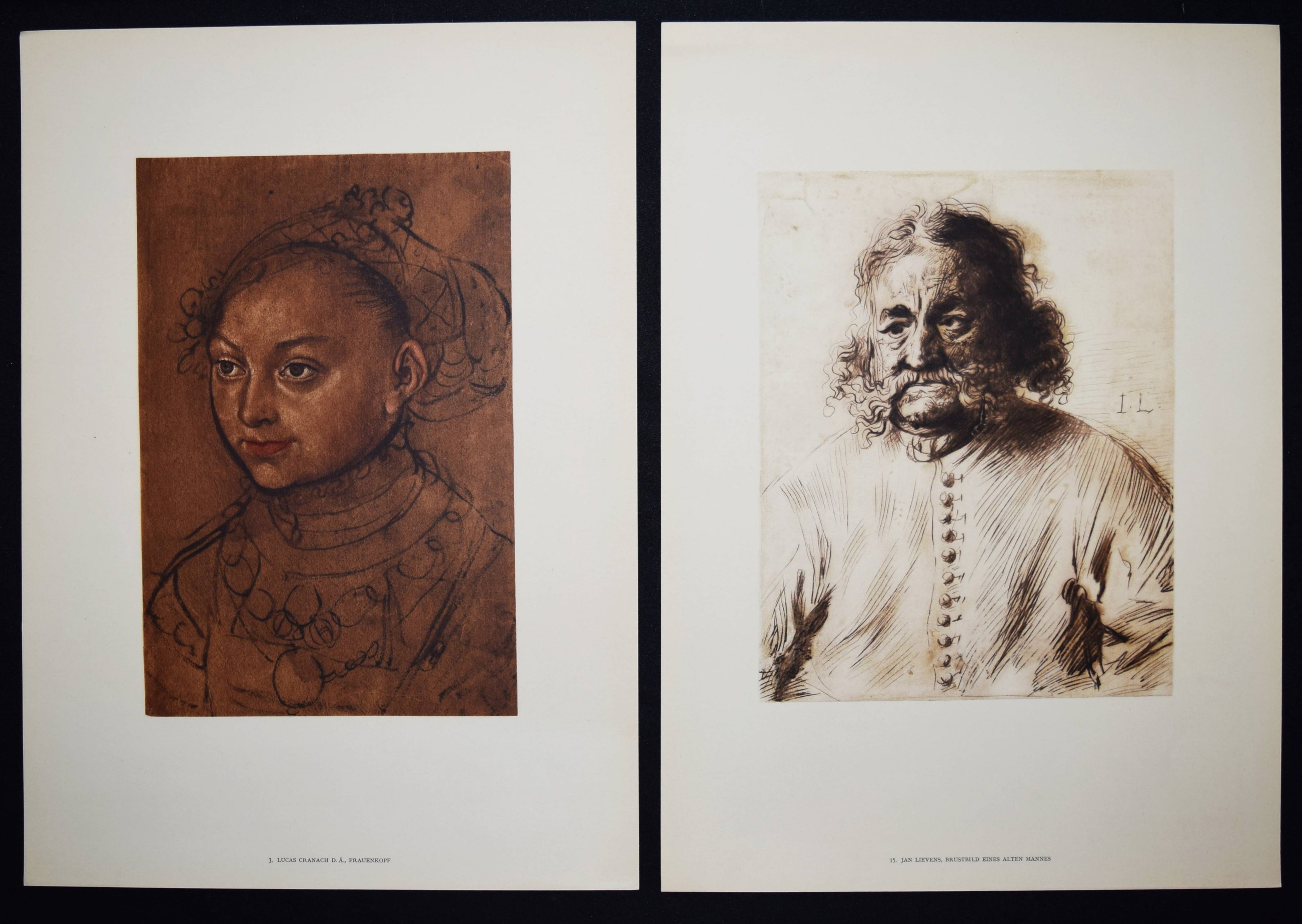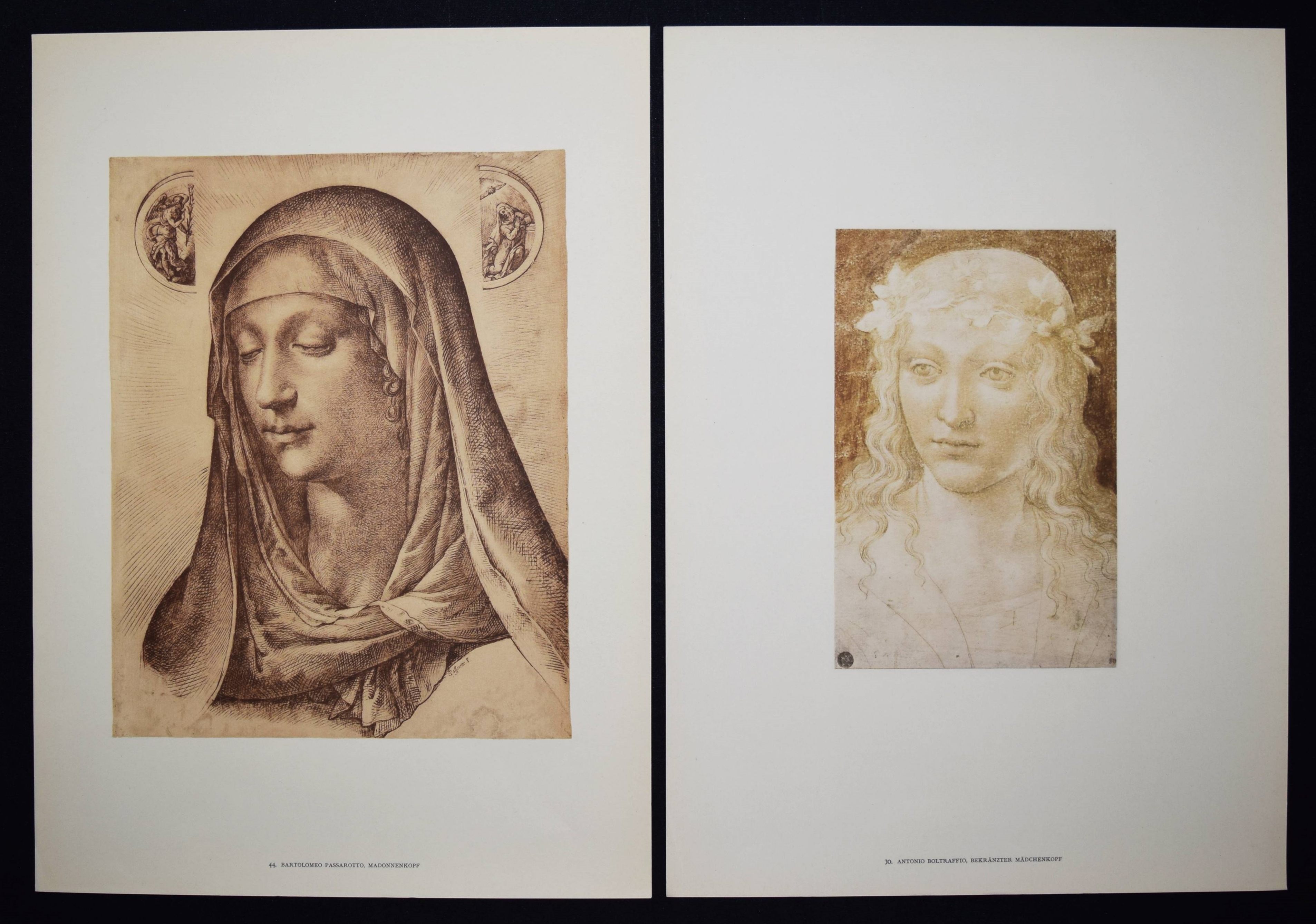 Becker, Felix (Hrsg.). Handzeichnungen alter Meister in Privatsammlungen. Fünfzig bisher nicht veröffentlichte Originalzeichnungen des XV. bis XVIII. Jahrhunderts. Leipzig, Tauchnitz 1922. Folio. 13 S., [48] lose Tafeln mit 50 Abb. nach Zeichnungen. OHprgt.-Flügelmappe mit goldgepr. Rücken- u. Deckeltitel. Eines von 500 Exemplaren. – Mappe mit Fleck am Kapital, ein Flügel etwas eingerissen, leichte Gebrauchsspuren, gutes Exemplar.