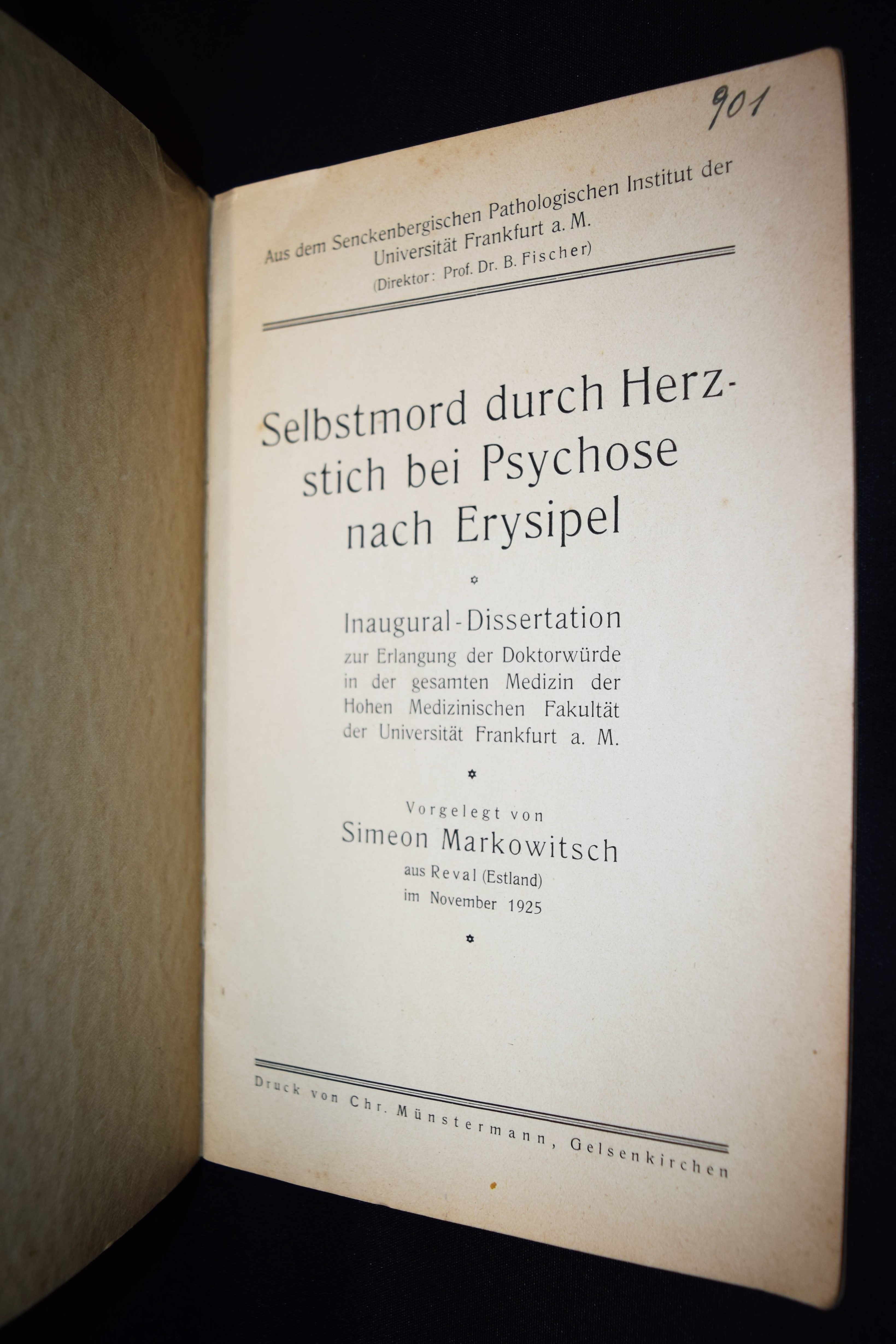 Markowitsch, Simeon. Selbstmord durch Herzstich bei Psychose nach Erysipel. Gelsenkirchen, Münstermann 1925. 8°. 24 S. OBr. Inaugural-Dissertation. – Umschlag mit leichten Gebrauchsspuren, gutes Exemplar.