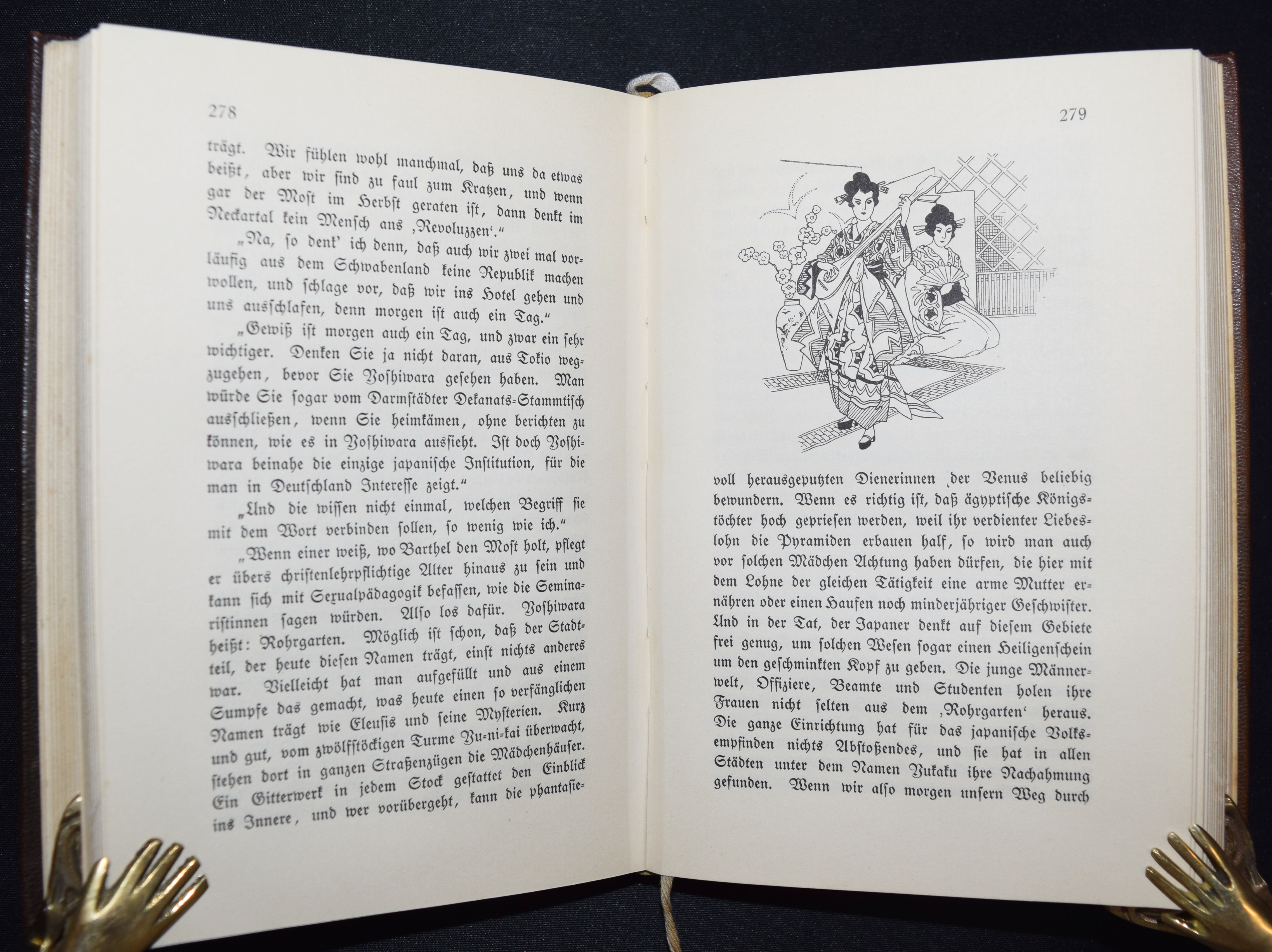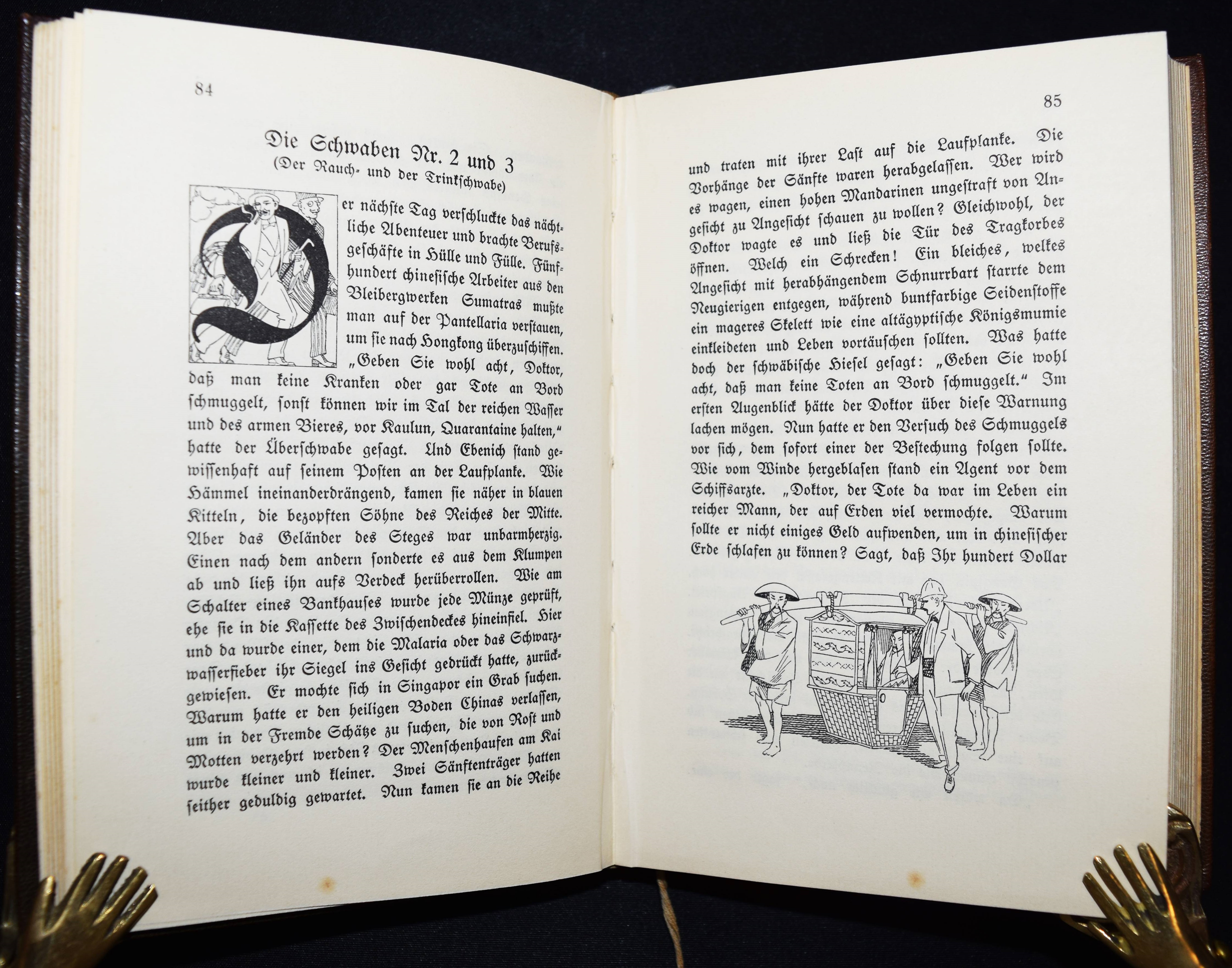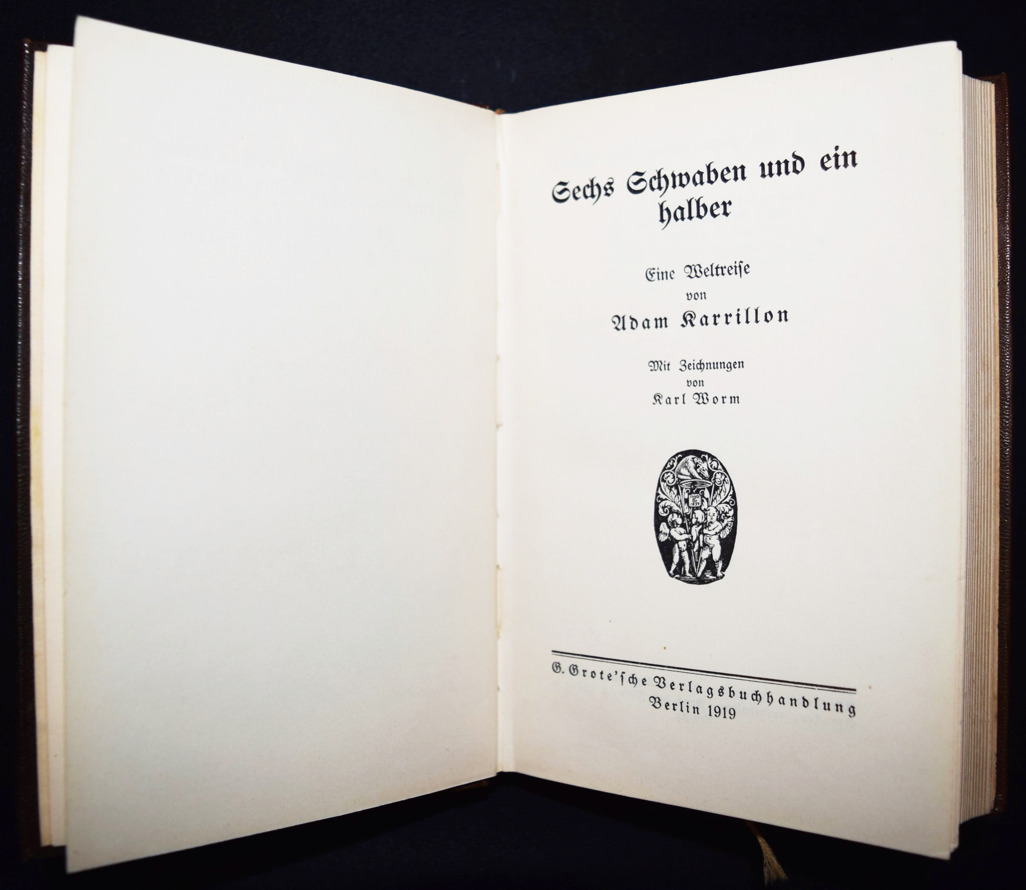 Karrillon, Adam. Sechs Schwaben und ein halber. Eine Weltreise. Mit Zeichnungen von Karl Worm. Berlin, Grote 1919. 8°. 461 S.; 5 Bl. mit einigen Illustrationen nach Zeichungen. Ldr. d. Zt. mit goldgepr. Deckelvignette, Rückentitel u. Rückenverg. (Grote’sche Sammlung von Werken zeitgenössischer Schriftsteller, 139). Erste Ausgabe. – Rücken augehellt, schönes Exemplar.