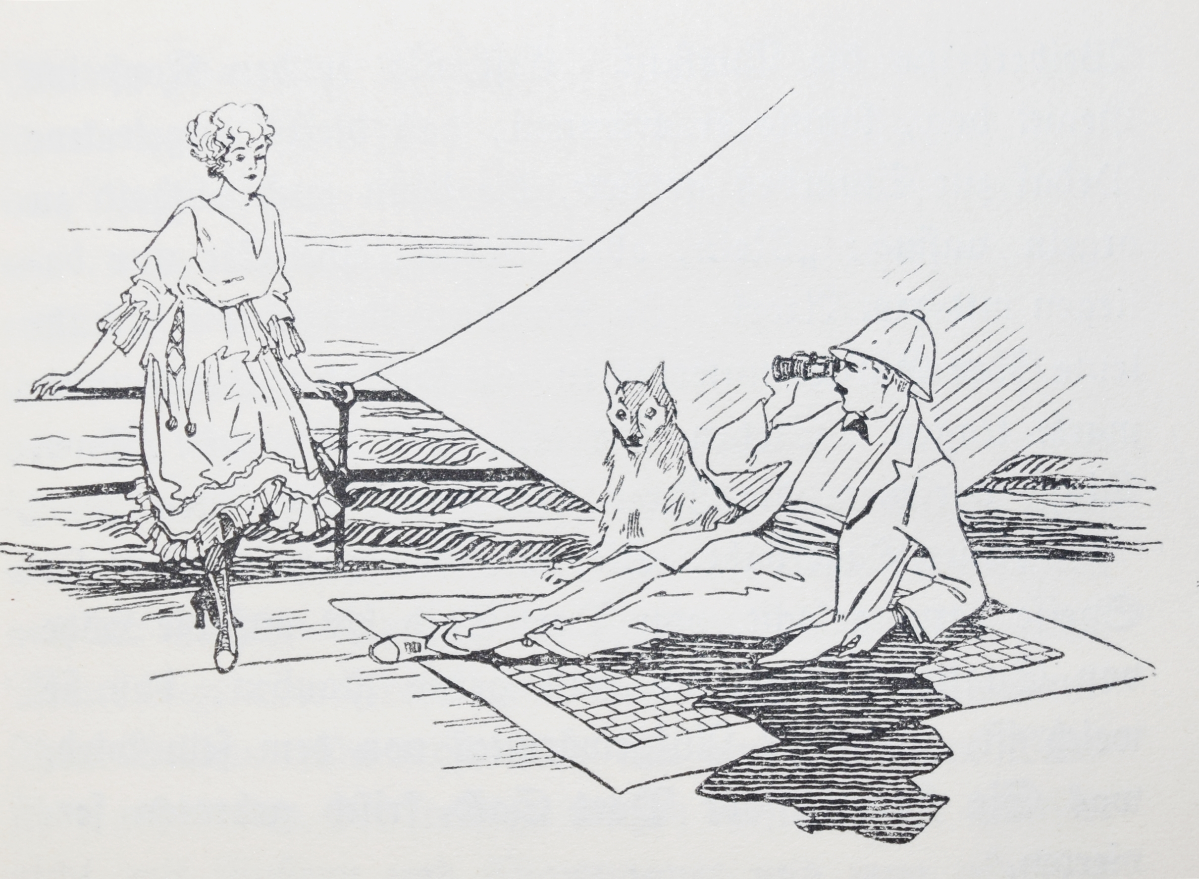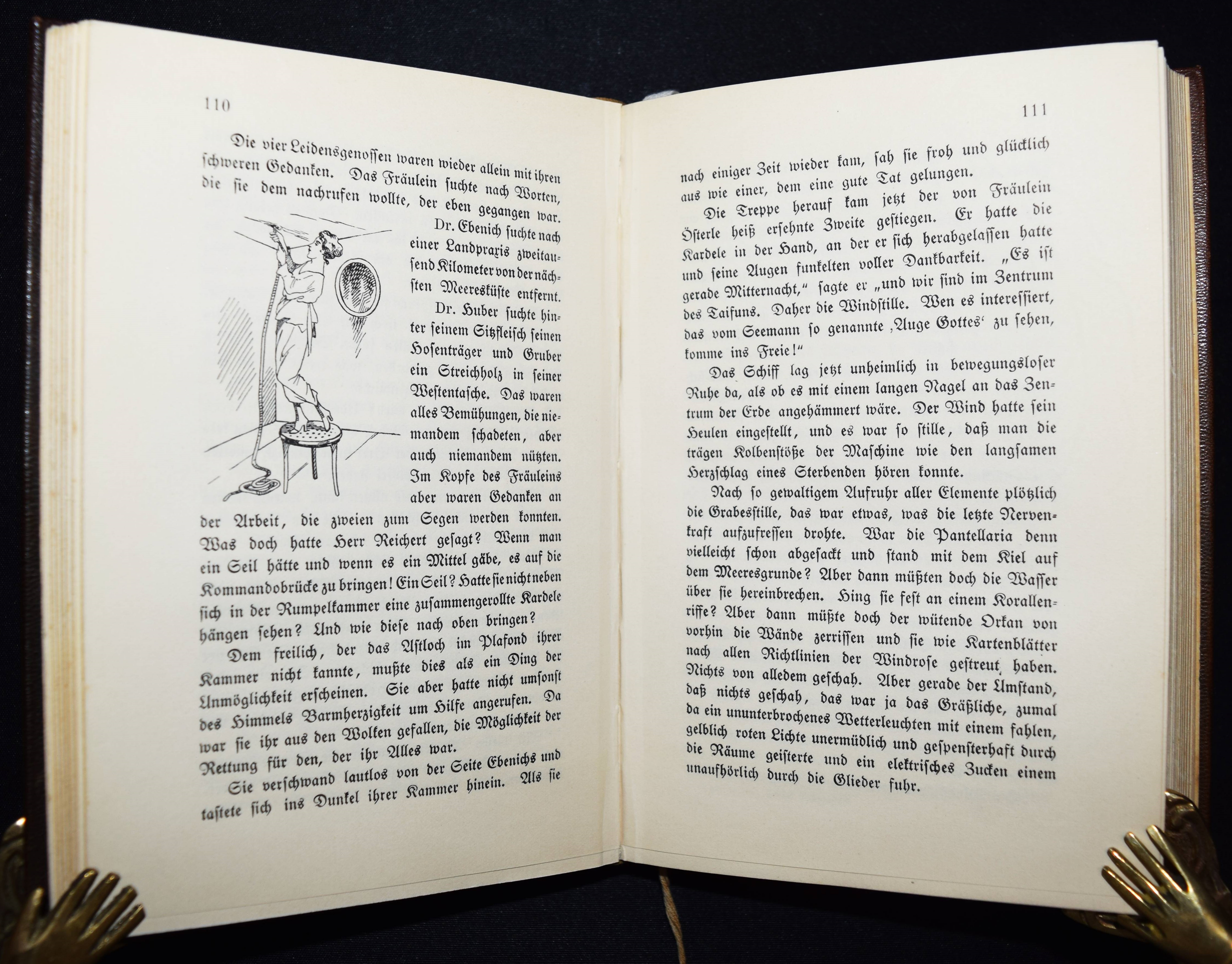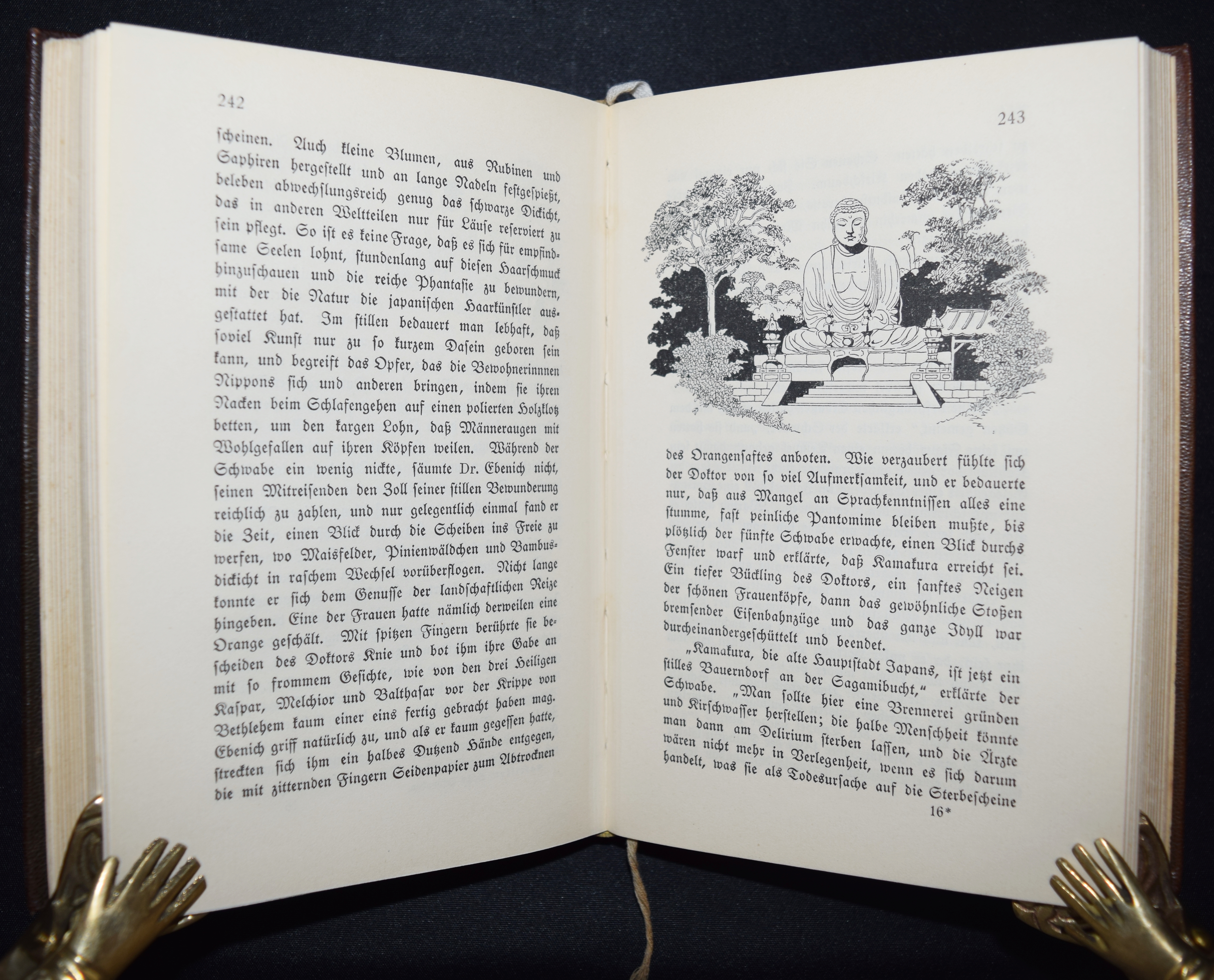 Karrillon, Adam. Sechs Schwaben und ein halber. Eine Weltreise. Mit Zeichnungen von Karl Worm. Berlin, Grote 1919. 8°. 461 S.; 5 Bl. mit einigen Illustrationen nach Zeichungen. Ldr. d. Zt. mit goldgepr. Deckelvignette, Rückentitel u. Rückenverg. (Grote’sche Sammlung von Werken zeitgenössischer Schriftsteller, 139). Erste Ausgabe. – Rücken augehellt, schönes Exemplar.