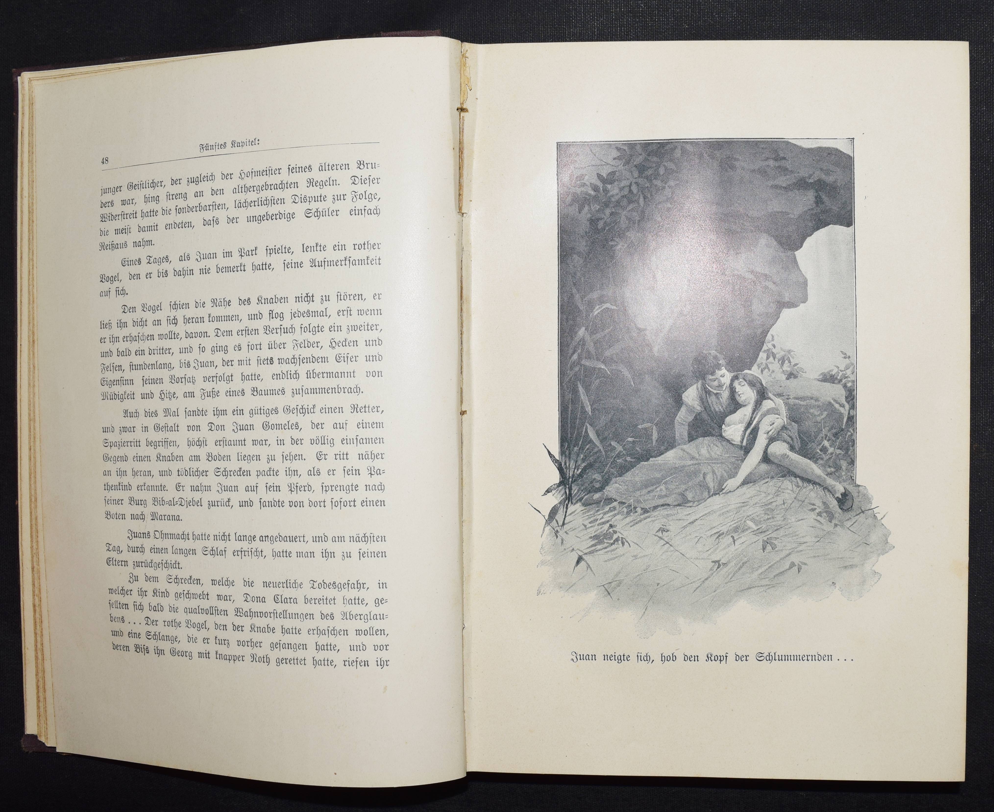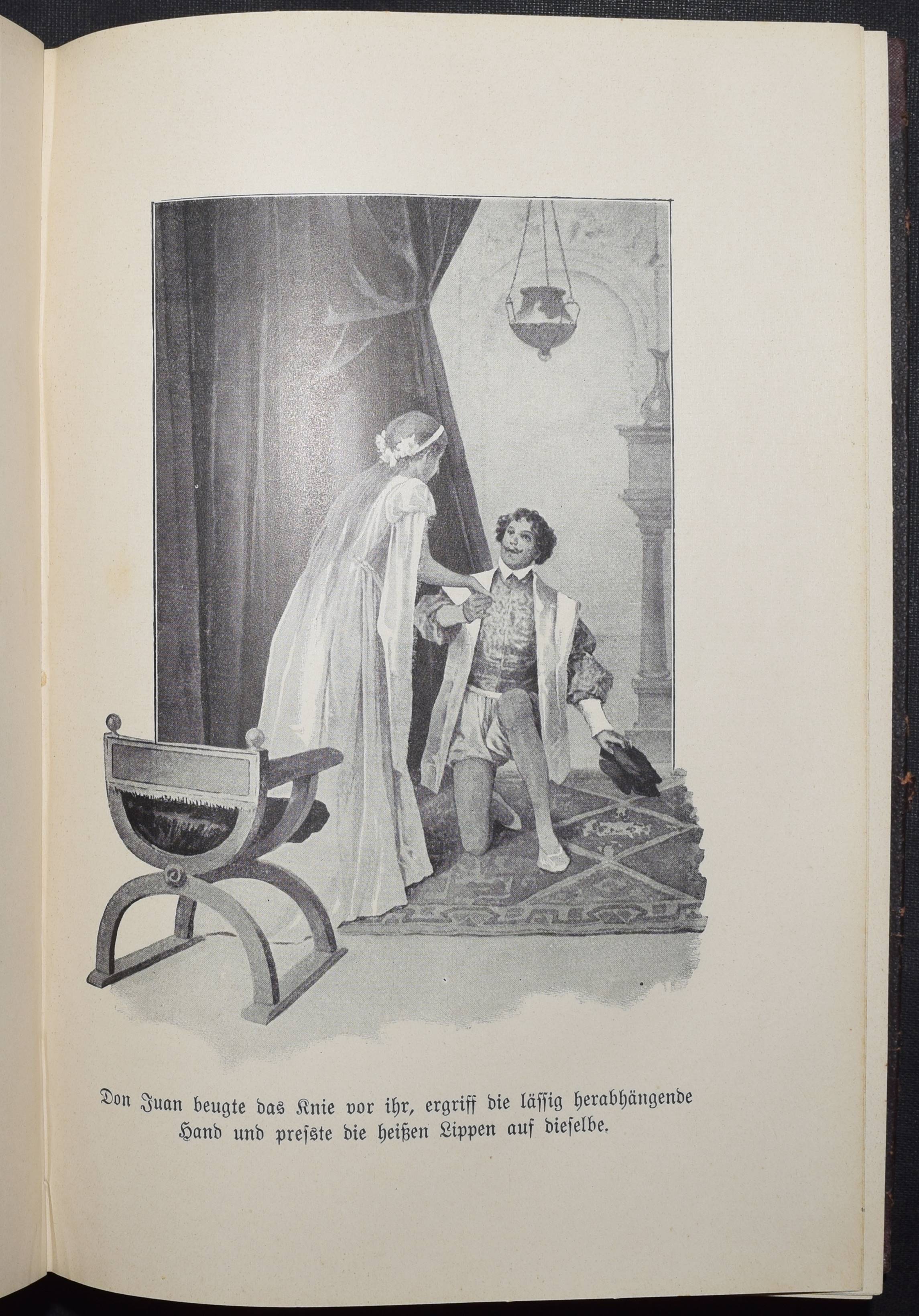 Mallefille, (Pierre Jean) Félicien. Die Memoiren des Don Juan. (Das sind die Memoiren des vieledlen Ritters Grafen von Marana, wie sie ein spanischer Mönch, Frater Augustinus in Sevilla, in fünfundzwanzig Jahren sammelte). Deutsche vollständige Ausgabe. Neu bearbeitet von G. v. Jonelli. 5 Bände. Leipzig, Prag, Wien, Hynek o. J. (1914-1915). 8°. Mit Illustrationen auf Tafeln von Coeurdame (d. i. Venceslav Cerny). Hln. d. Zt. mit goldgepr. Rückentitel. Erste Ausgabe dieser Übersetzung; erschien gleichzeitig auch in Tschechisch. – Die „Liebesabenteuer“ erschienen zuerst 1848 in deutscher Übersetzung. – Rücken etwas fleckig u. teils stärker berieben, vorderes Innengelenk von Band I angeplatzt, sonst gutes Exemplar der komplett seltenen Ausgabe.