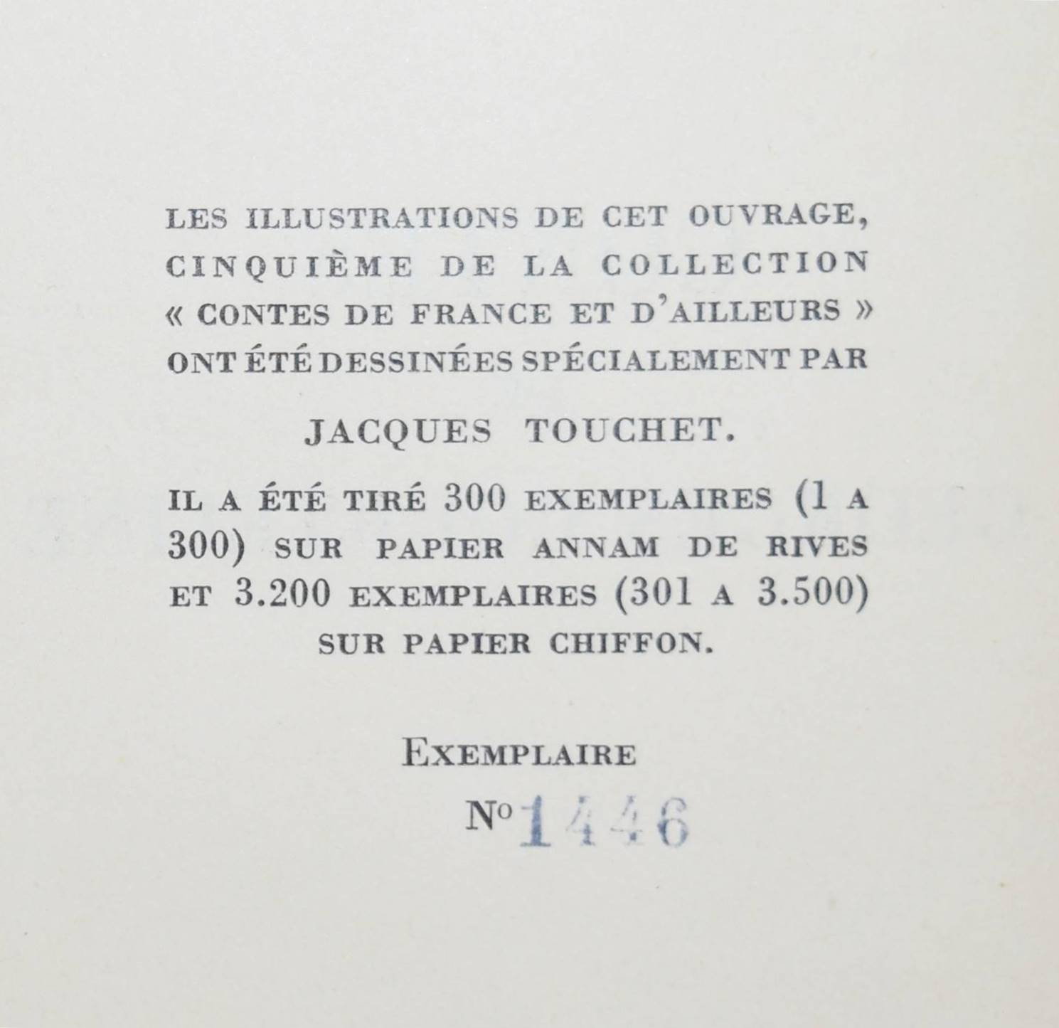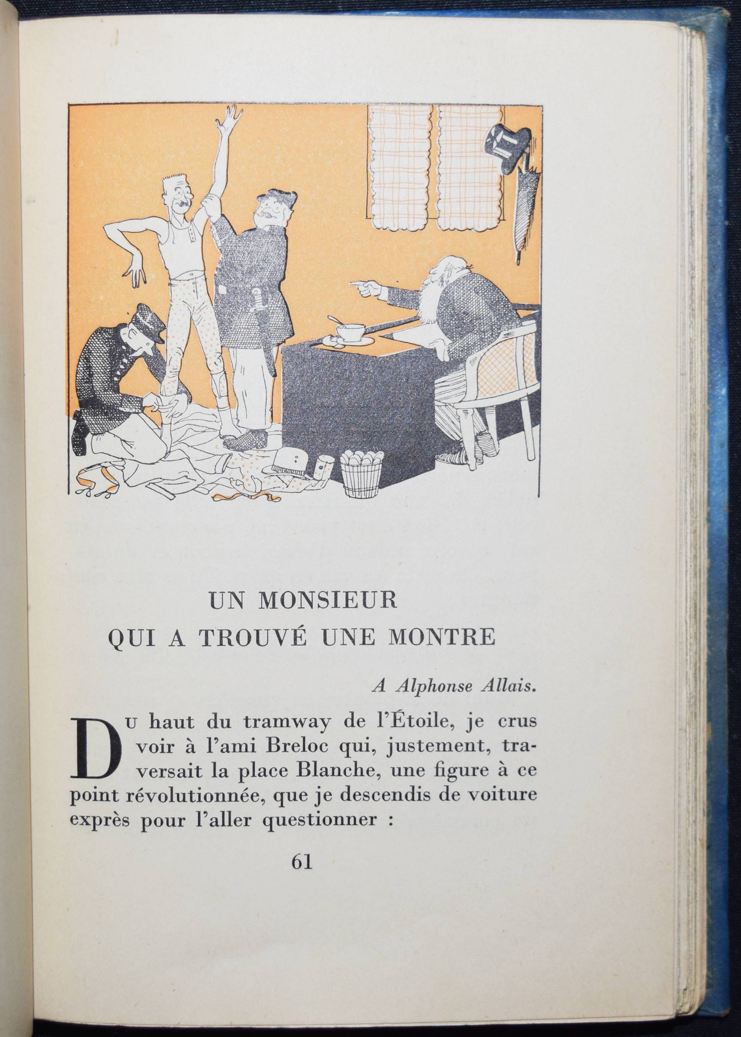 Courteline, Georges. Contes. Introduction d’Edmond Pilon. Paris, L’Édition d’Art H. Piazza 1931. 8°. 3 Bl. 292 S., 4 Bl. mit zahlr. teils farb. Illustrationen von Jacques Touchet. Dekorativer Hldr. d. Zt. mit goldgepr. Rückentitel u. Rückenvergoldung, Kopfgoldschnitt (vorderer farbig illust. Orig.-Umschlag beigbunden). Eines von 3200 num. Exemplaren auf Velinpapier. – Einband leicht berieben, Rücken etwas aufgehellt, Innengelenk angeplatzt, sonst schönes unbeschnittenes Exemplar.