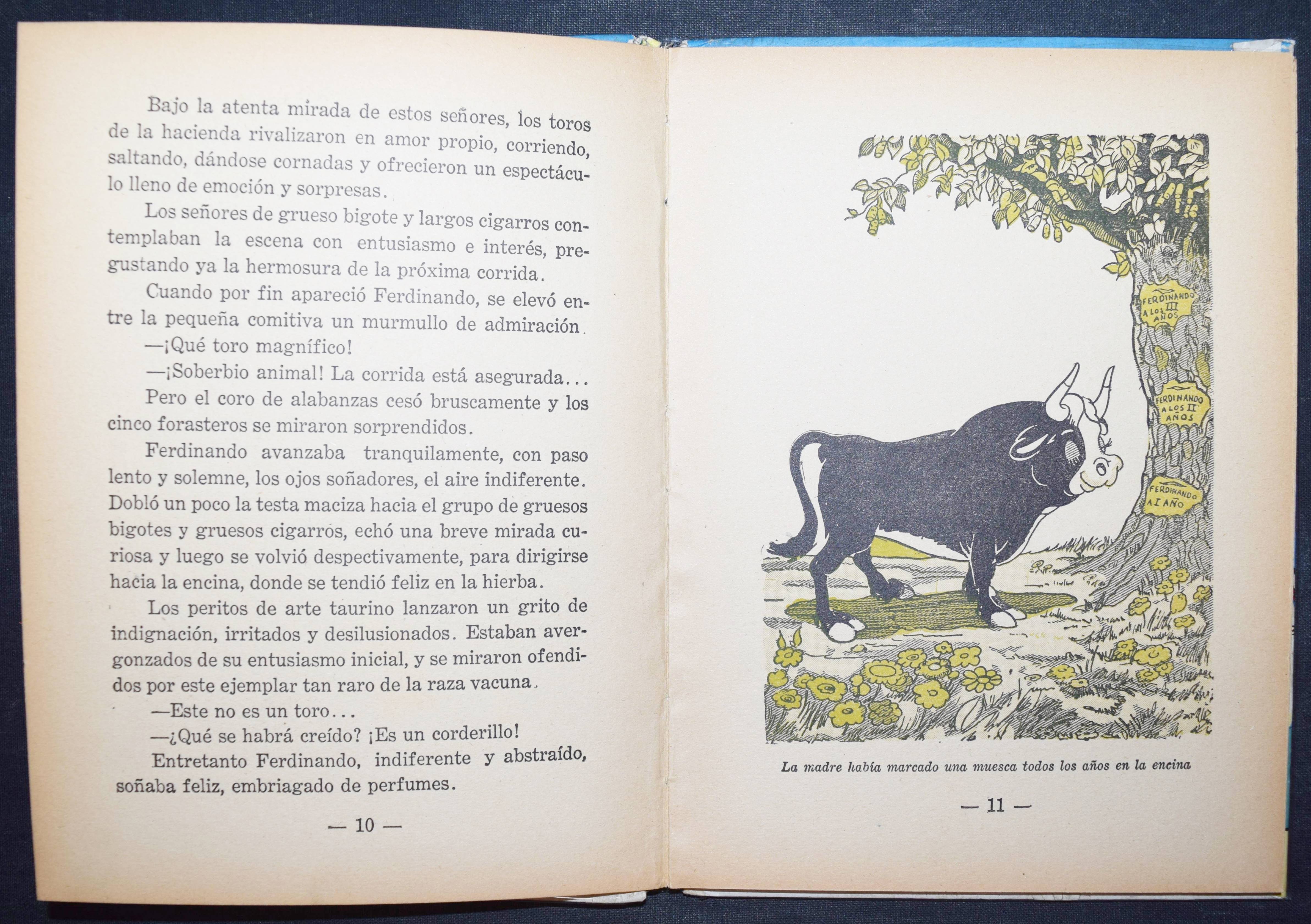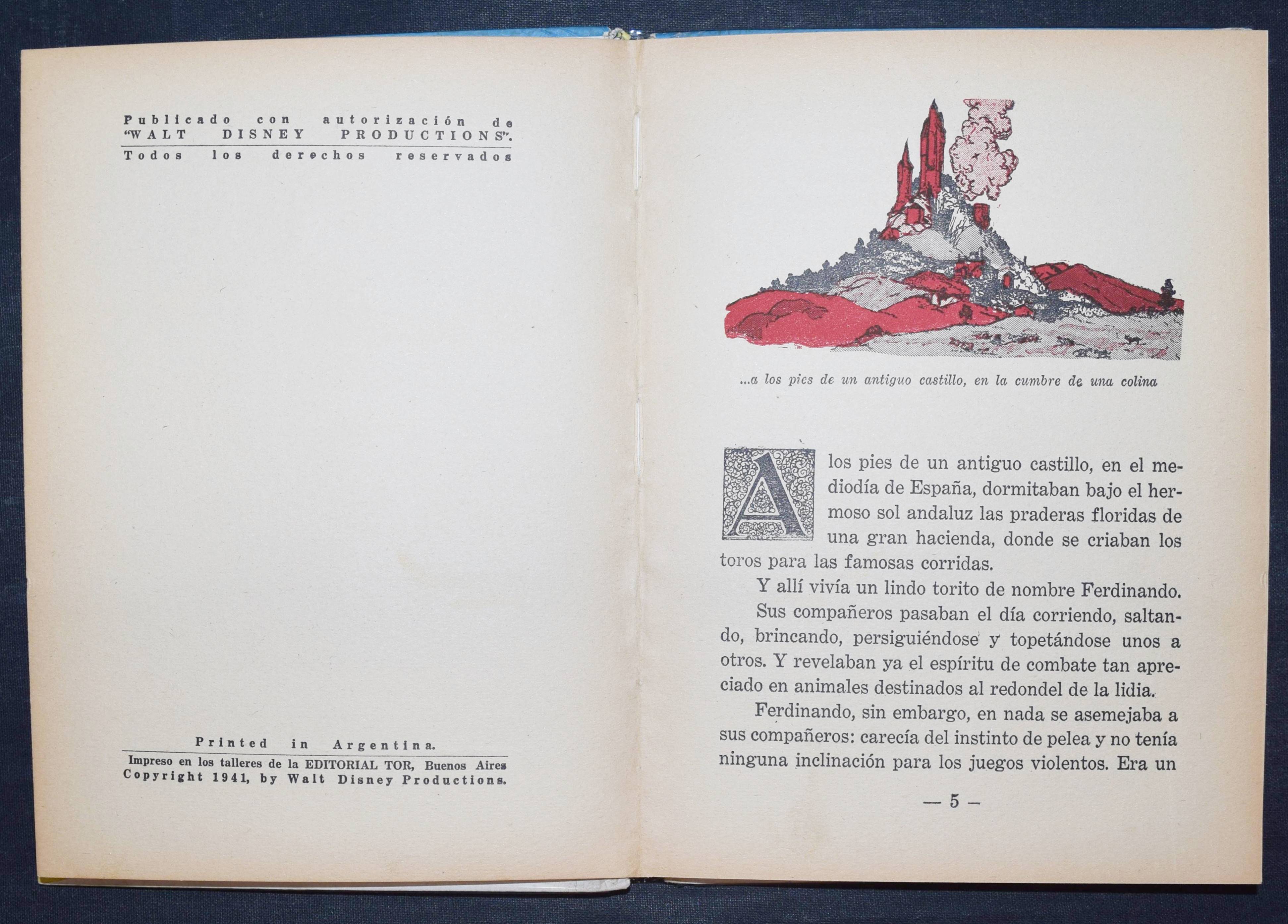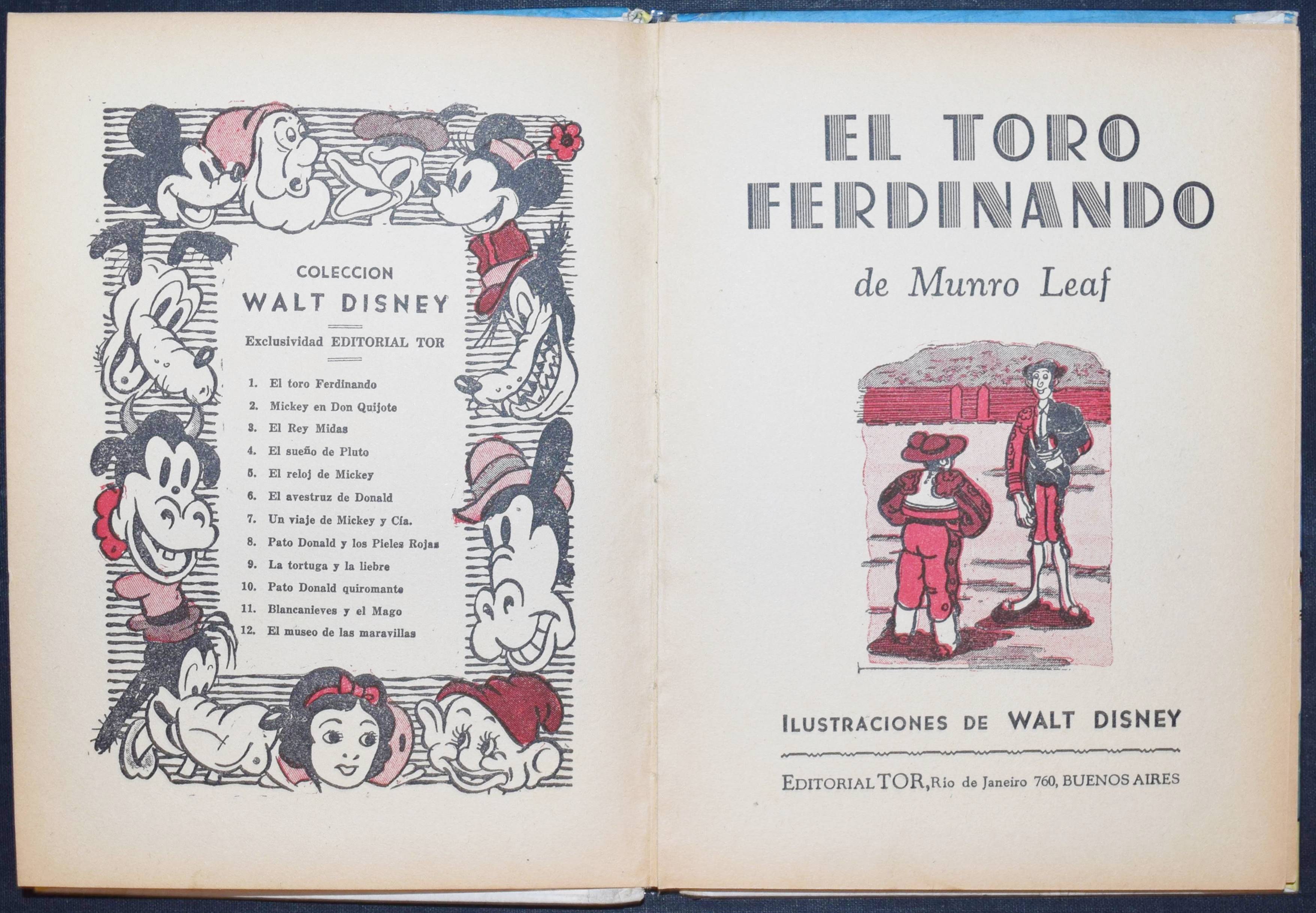 Leaf, Munro. El toro Ferdinando. Illustraciones de Walt Disney. Buenos Aires, Editorial Tor (1941). 4°. 32 S. mit 16 meist ganzs. farb. Illustrationen. Farbig illustr. OPbd. Erste spanische Ausgabe mit den Illustrationen von W. Disney. – Die amerikanische Originalausgabe erschien 1938 zusammen mit dem Zeichentrick-Film mit dem Titel „Ferdinand the Bull“ in Wisconsin. – Der Kinderbuch-Klassiker von M. Leaf (1905-1976) erschien zuerst 1936 mit Illustrationen von Robert Lawson. Leaf schrieb das Buch, das Mahatma Gandhi als sein Lieblingsbuch bezeichnete, nach eigenen Angaben in weniger als einer Stunde an einem Sonntagnachmittag im Jahr 1935. – Rücken am Kapital und Fuß etwas bestoßen, papierbedingt etwas gebräunt, sehr gutes Exemplar.