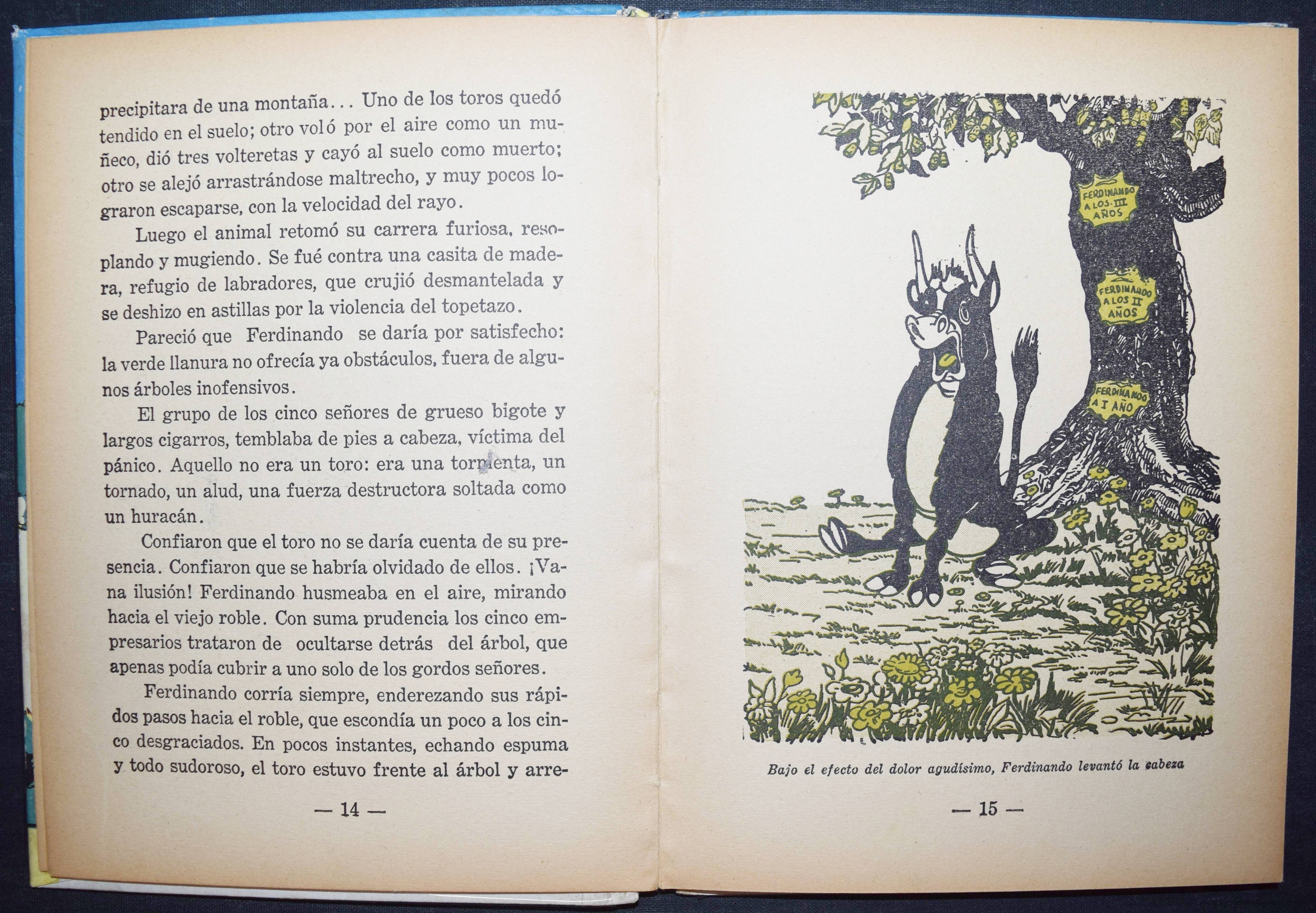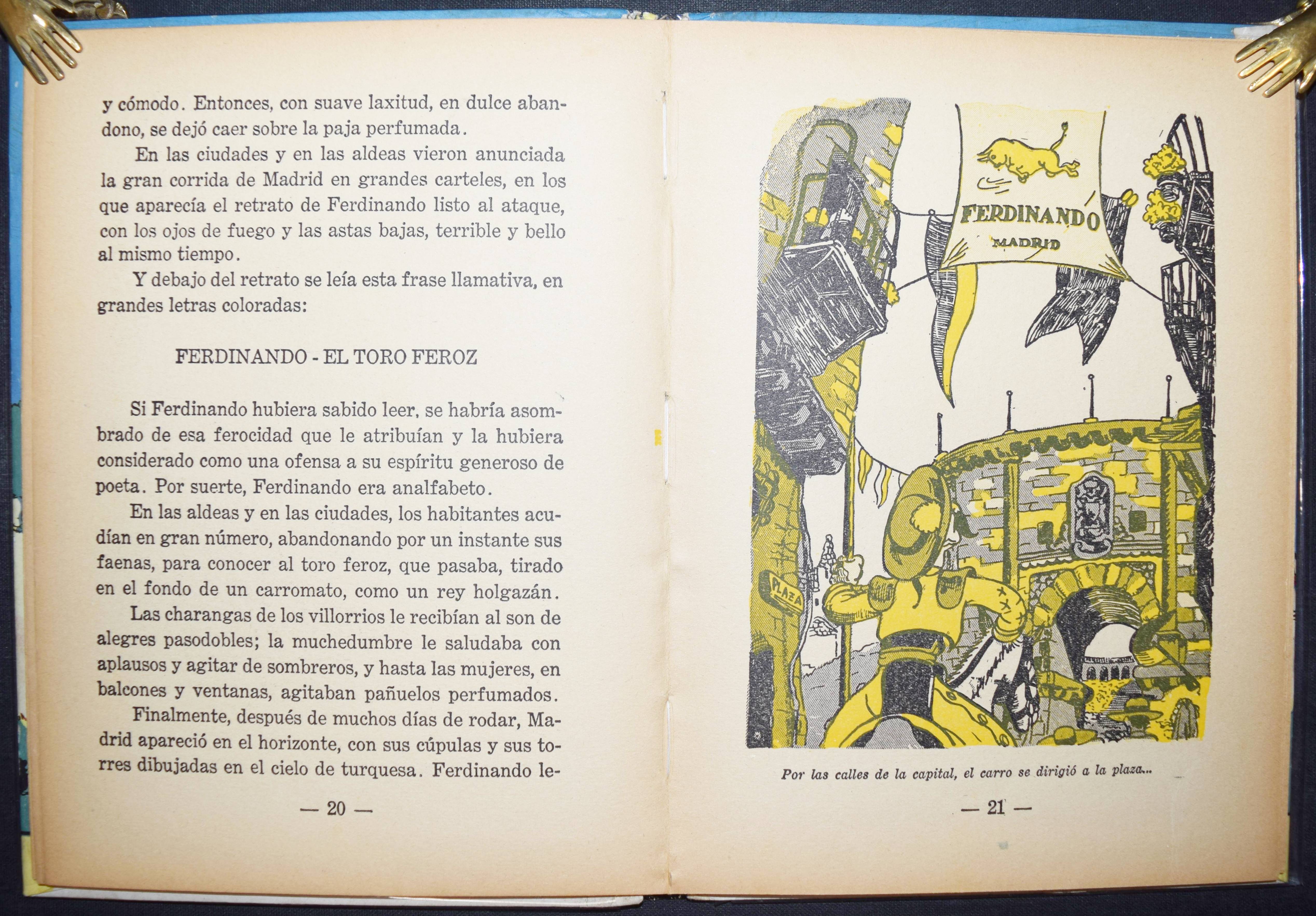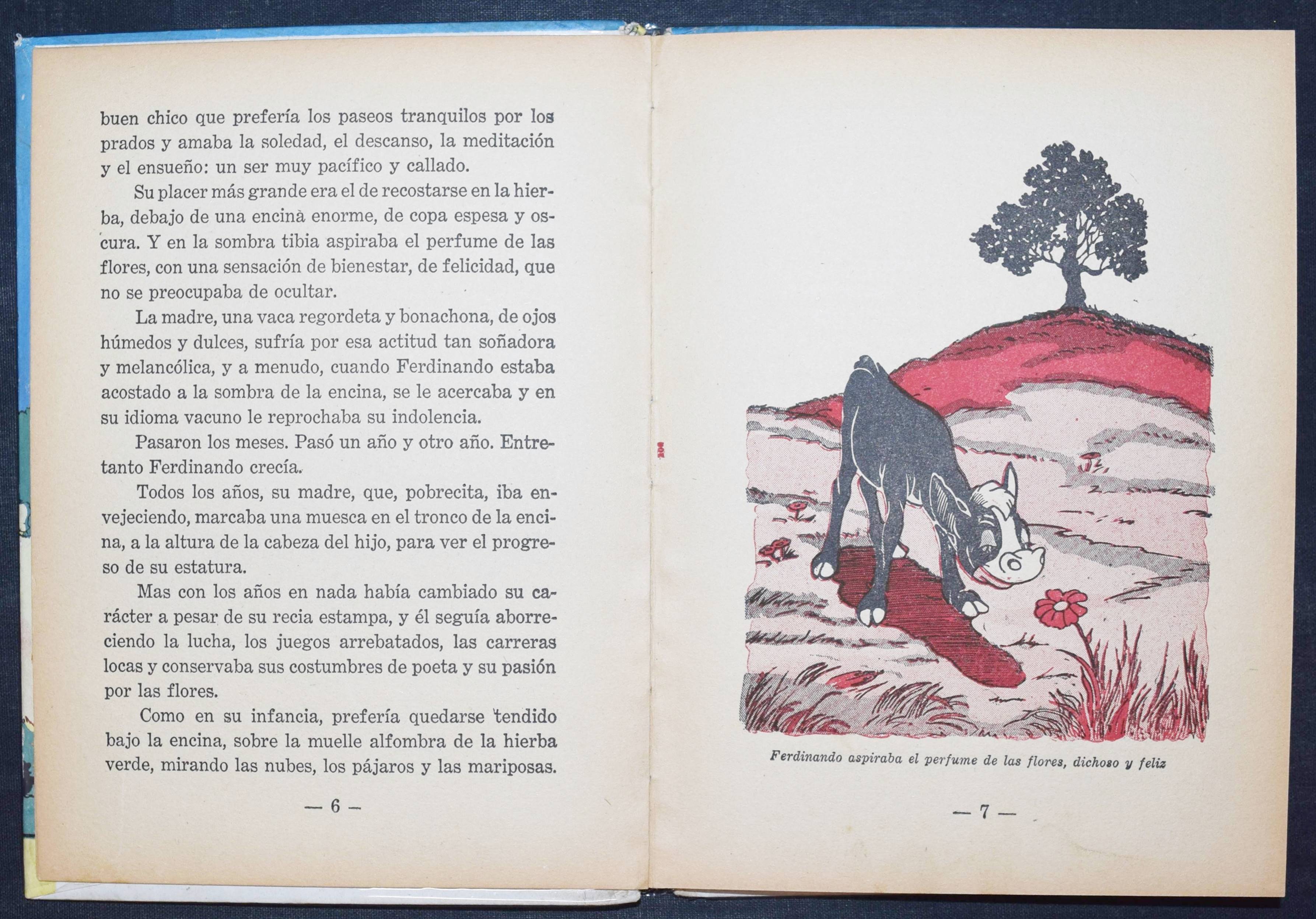 Leaf, Munro. El toro Ferdinando. Illustraciones de Walt Disney. Buenos Aires, Editorial Tor (1941). 4°. 32 S. mit 16 meist ganzs. farb. Illustrationen. Farbig illustr. OPbd. Erste spanische Ausgabe mit den Illustrationen von W. Disney. – Die amerikanische Originalausgabe erschien 1938 zusammen mit dem Zeichentrick-Film mit dem Titel „Ferdinand the Bull“ in Wisconsin. – Der Kinderbuch-Klassiker von M. Leaf (1905-1976) erschien zuerst 1936 mit Illustrationen von Robert Lawson. Leaf schrieb das Buch, das Mahatma Gandhi als sein Lieblingsbuch bezeichnete, nach eigenen Angaben in weniger als einer Stunde an einem Sonntagnachmittag im Jahr 1935. – Rücken am Kapital und Fuß etwas bestoßen, papierbedingt etwas gebräunt, sehr gutes Exemplar.