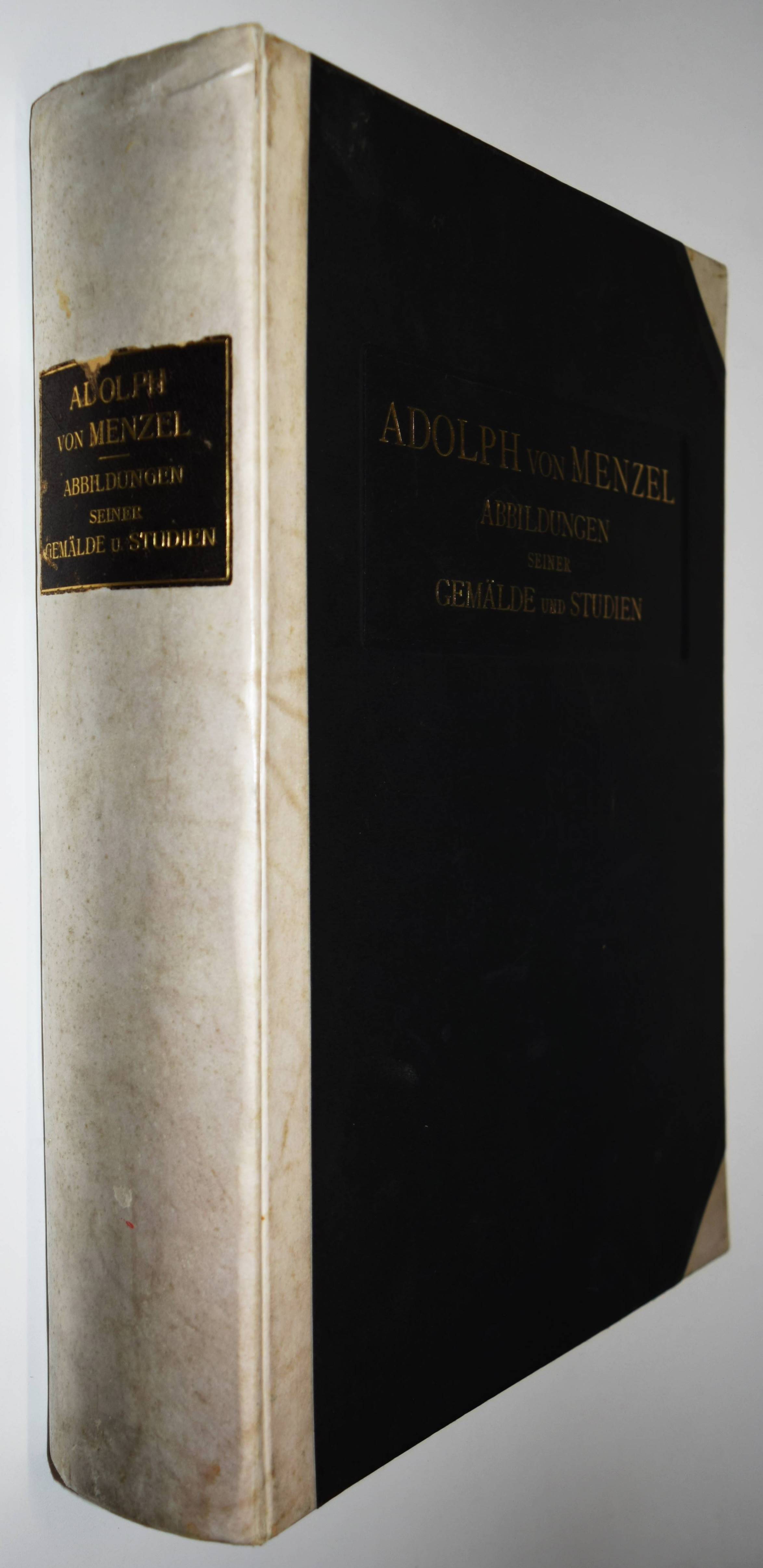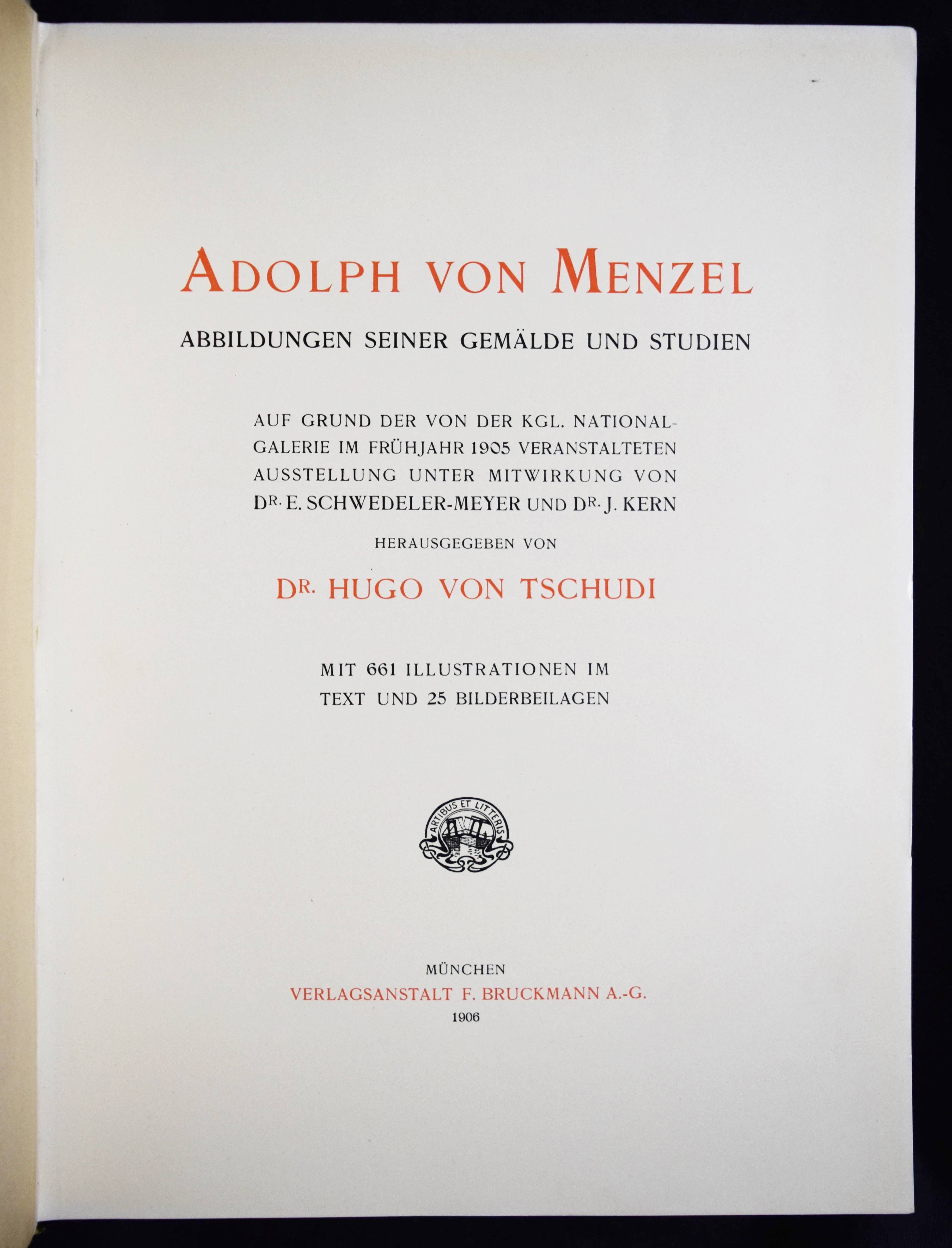 Menzel – Tschudi, Hugo von (Hrsg.). Adolph von Menzel. Abbildungen seiner Gemälde und Studien. München, Bruckmann 1906. 4°. XVI, 453 S. mit 661 Abb. im Text u. 25 Bilderbeilagen (Tafeln in Kupfertiefdruck). Orig.-HPrgt. mit goldgepr. Rückenschild u. Deckeltitel. u. Kopfgoldschnitt. Innengelenk stellenw. etwas angeplatzt, Rückenschild berieben, Einband mit Lager- u. Gebrauchsspuren, gutes Exemplar.