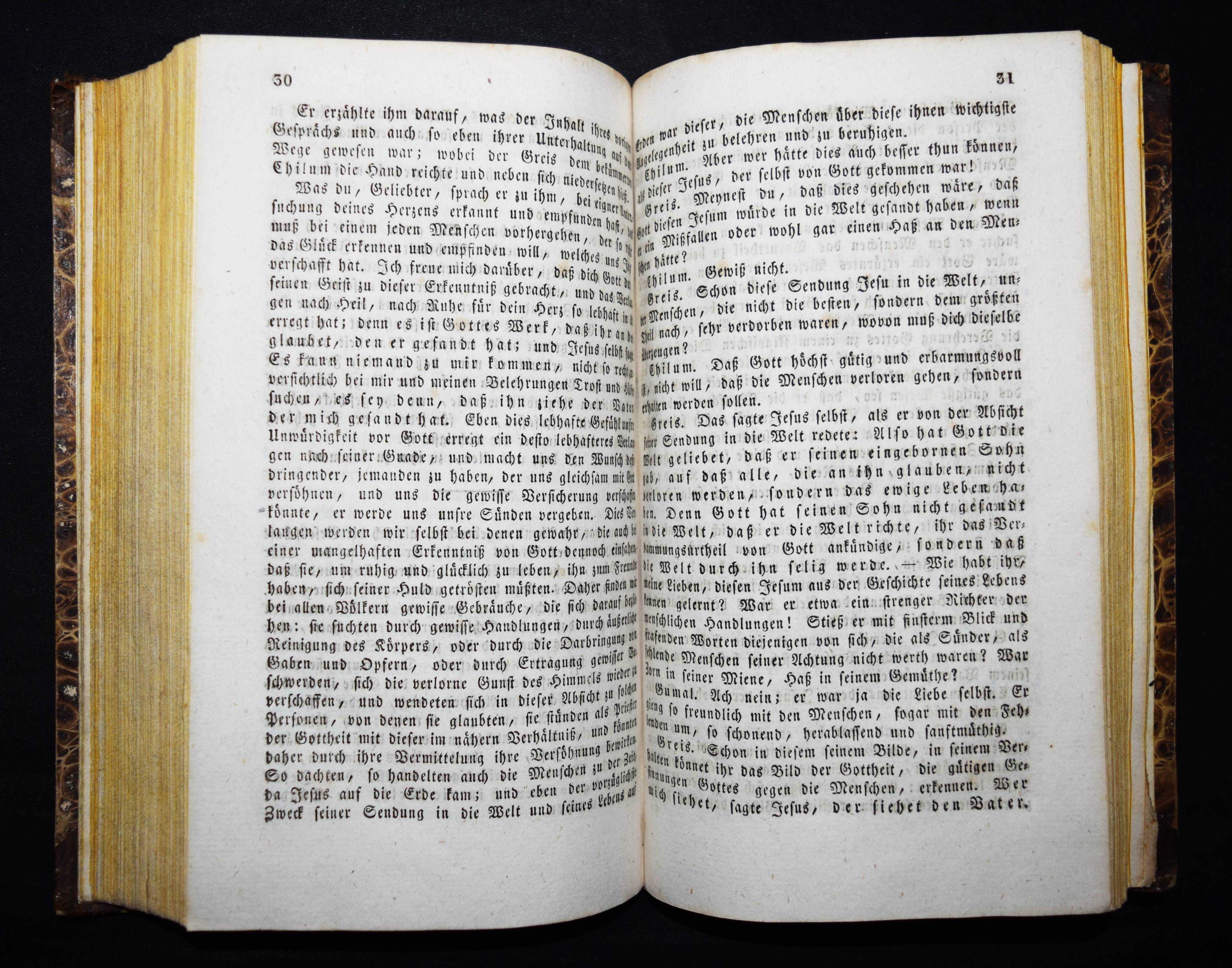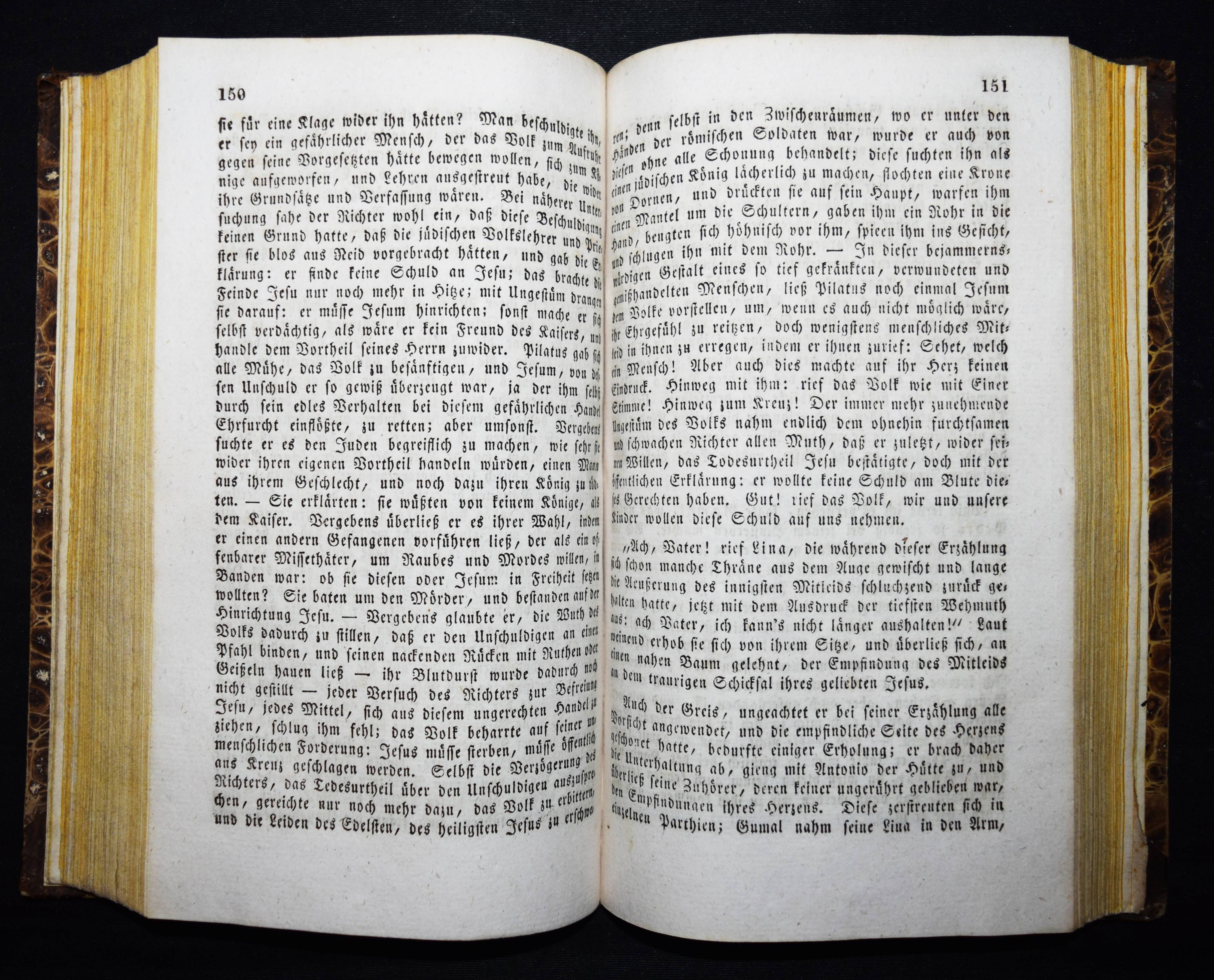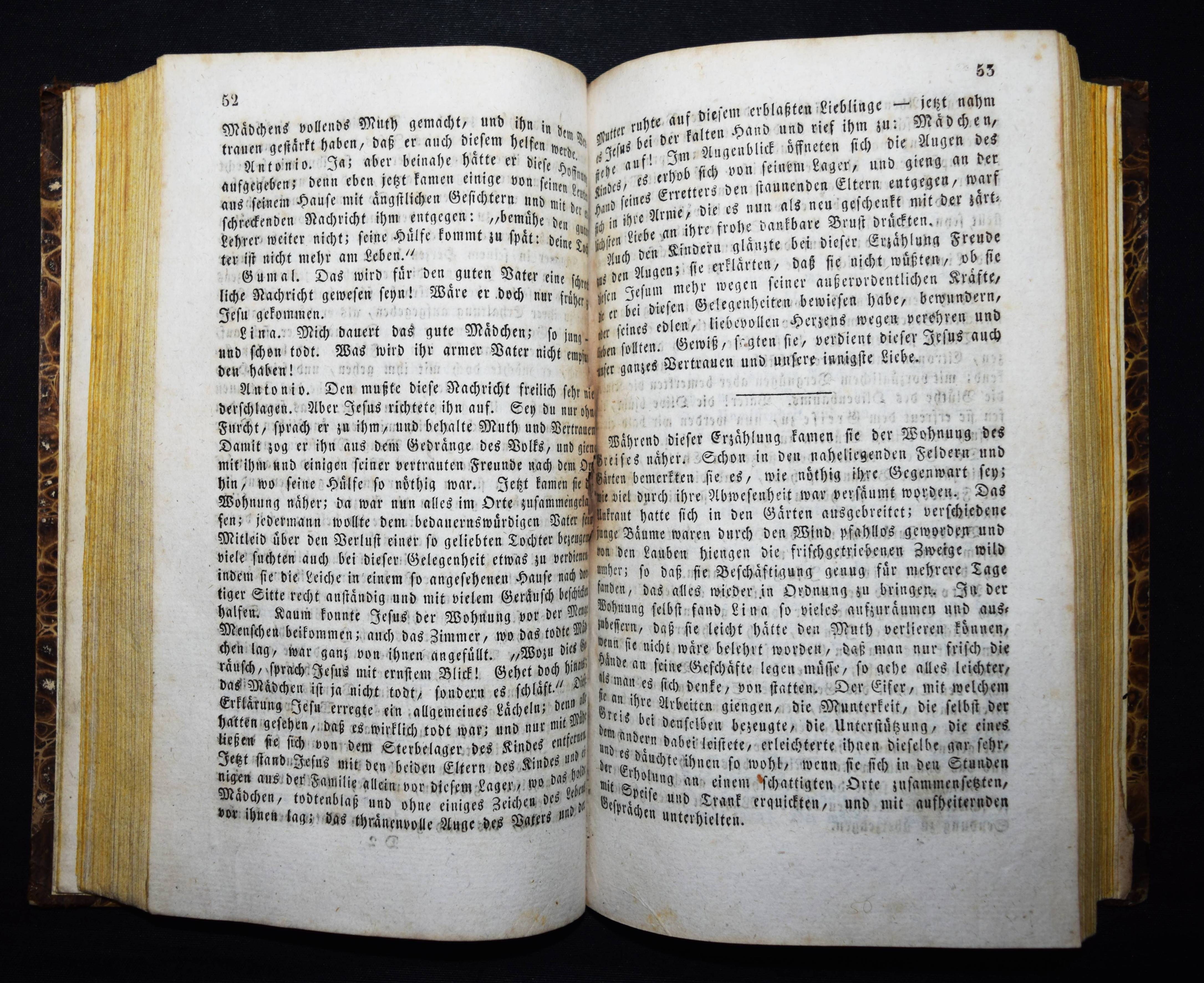 Lossius, Kaspar Friedrich. Gumal und Lina. Eine Geschichte für Kinder, zum Unterricht und Vergnügen, besonders um ihnen die ersten Religionsbegriffe beizubringen. Neue wohlfeilere Ausgabe. 3 Theile in 1 Band. Reutlingen, Fleischhauer und Spohn 1829. VIII, 152 S.; 168 S.; 152 S. Hldr. der Zeit. mit goldgepr. Rückenschild u. Rückenvergold. Wegehaupt I, 1326. – Einband berieben, Rückenschild mit Fehlstelle, einige Seiten mit Wasserfl., etwas stockfl.