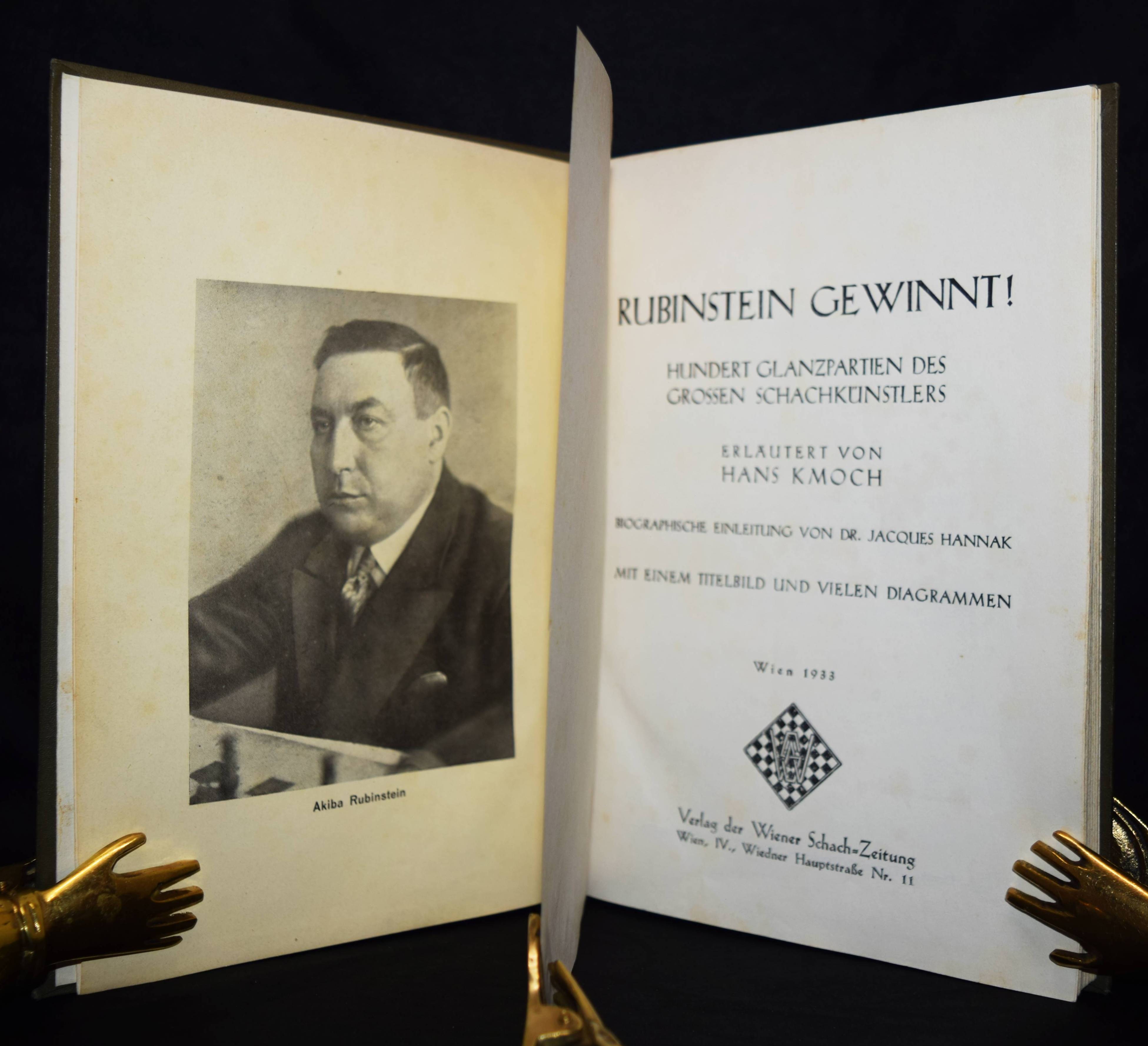 Rubinstein – Kmoch, Hans. Rubinstein gewinnt! 100 Glanzpartien der grossen Schachkünstlers. Wien, Verlag der Wiener Schachzeitung 1933. Gr.-8°. 151 S. mit zahlr. Abb. Orig.-Leinenband mit goldgepr. Deckeltitel. Einband etwas berieben und aufgehellt, schwach stockfl., gutes Exemplar.
