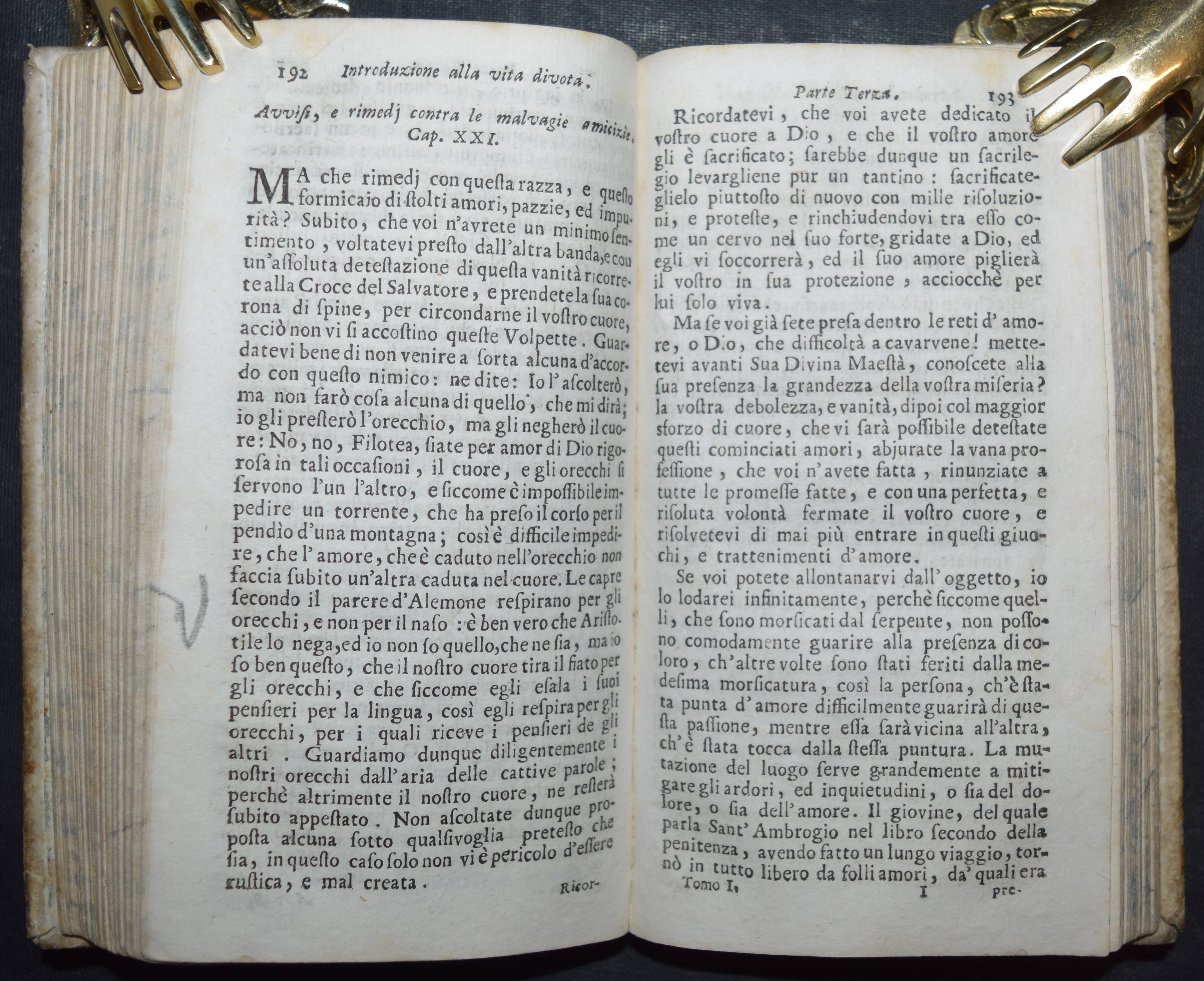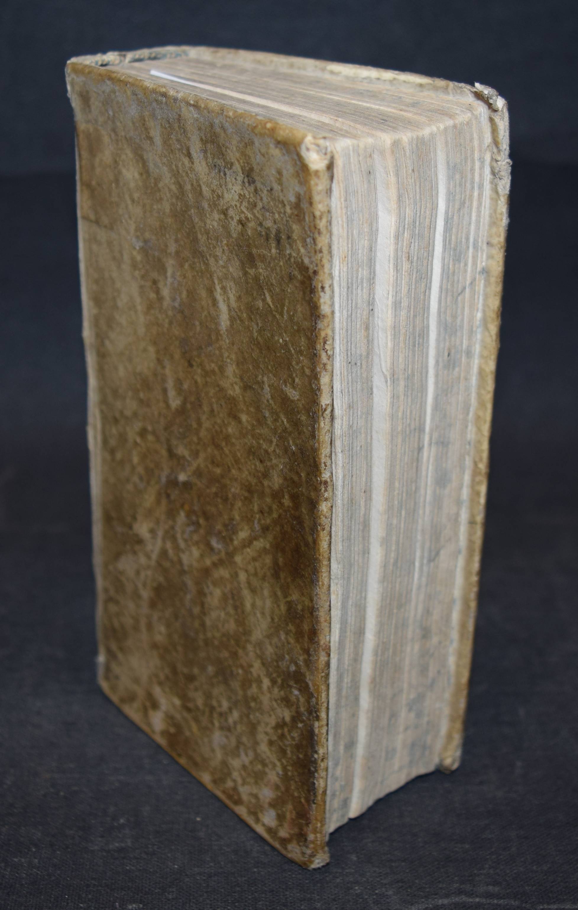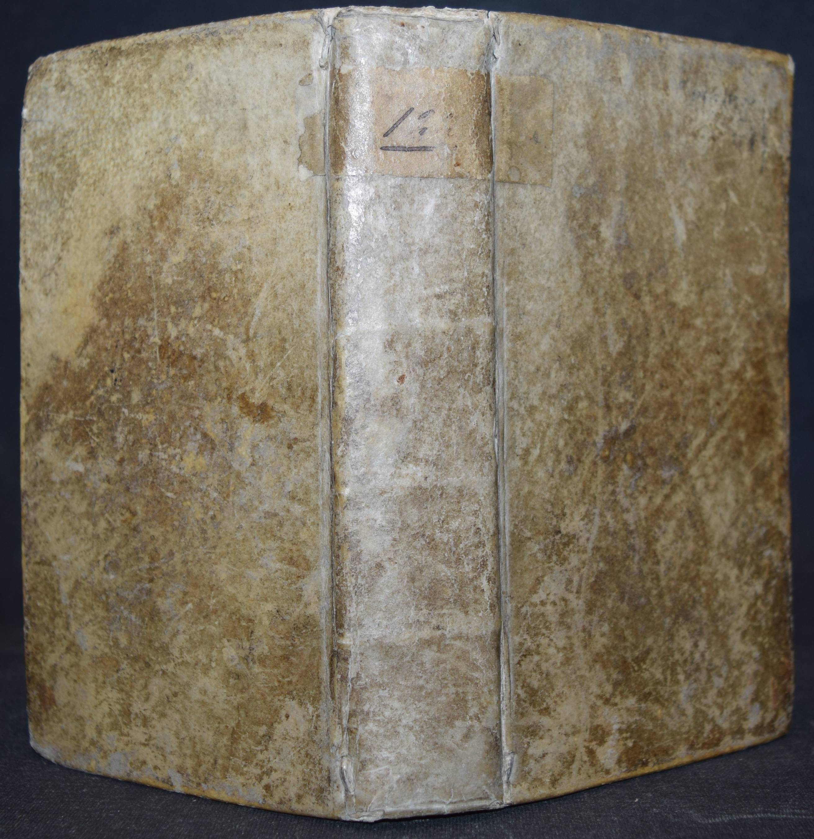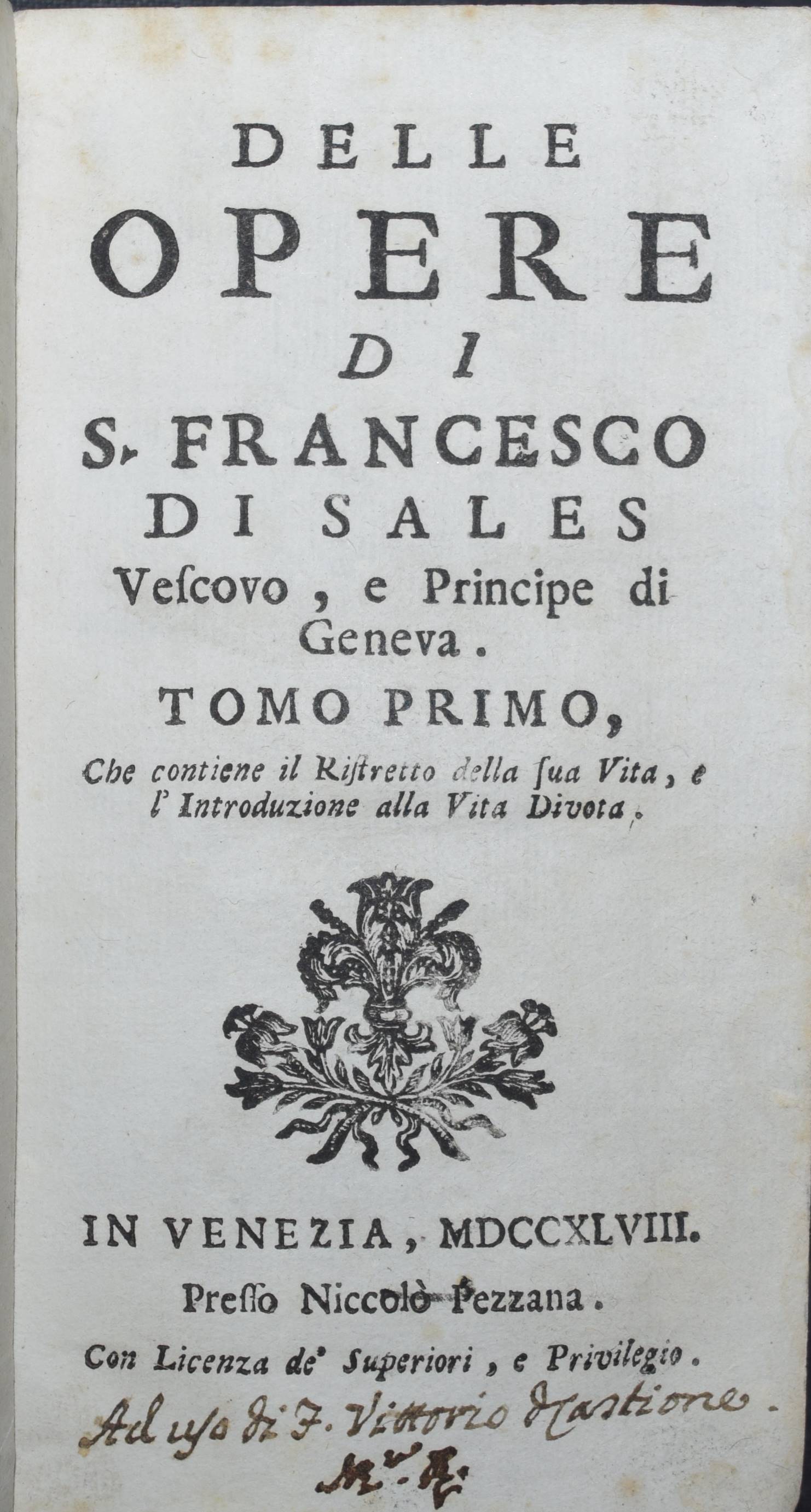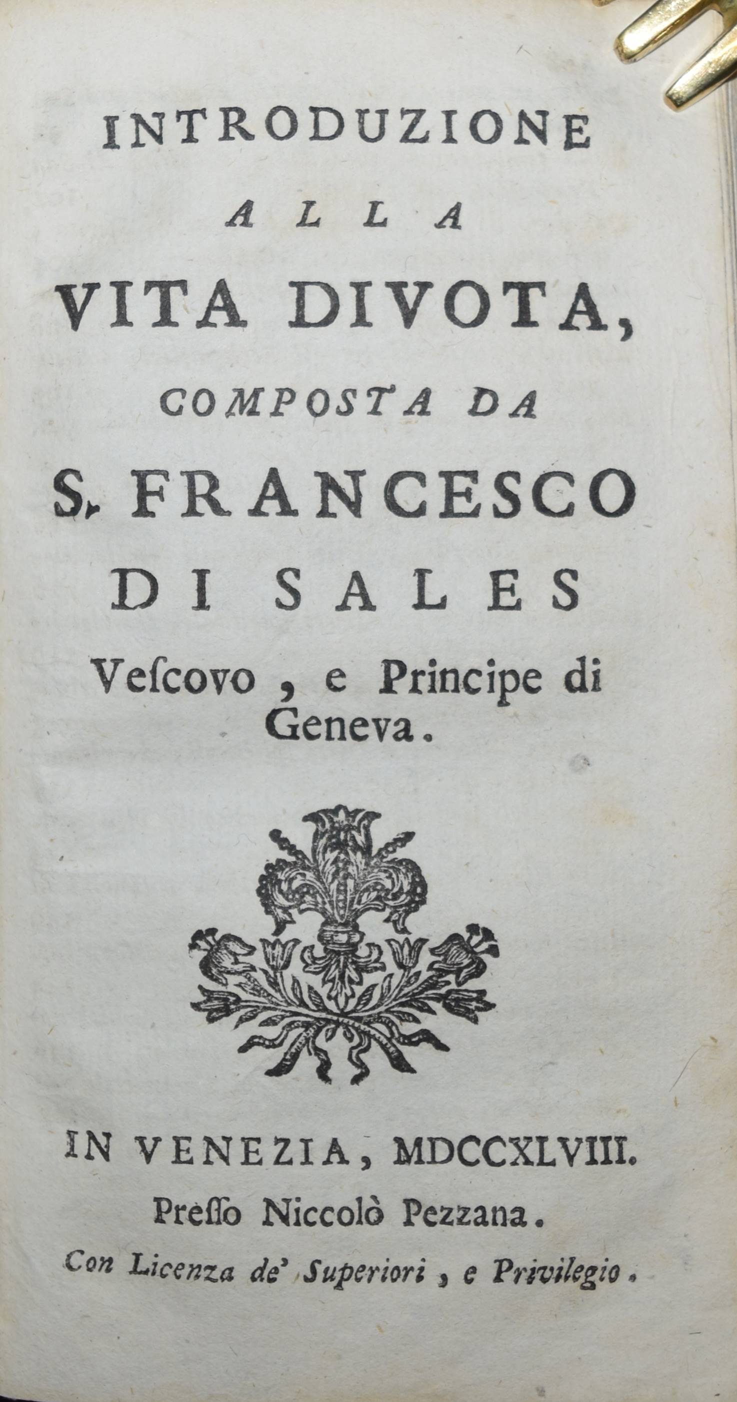 François de Sales. Delle opere di S. Francesco di Sales. 5 Teile in 1 Band. Venezia, Niccolò Pezzana 1738. Kl-8°. 168 S.; 341, (7) S. mit gestoch. Frontispiz. Prgt. d. Zt. Seltene italienische Ausgabe der Werke und einer Biographie des franz. Ordensgründer, Mystiker und Kirchenlehrer F. v. Sales (1567-1622), Schutzpatron der Schriftsteller, Journalisten, der Gehörlosen und der Städte Genf, Annecy und Chambéry. – Einband angestaubt, zeitgenöss. besitzvermerk a. V., gutes Exemplar.